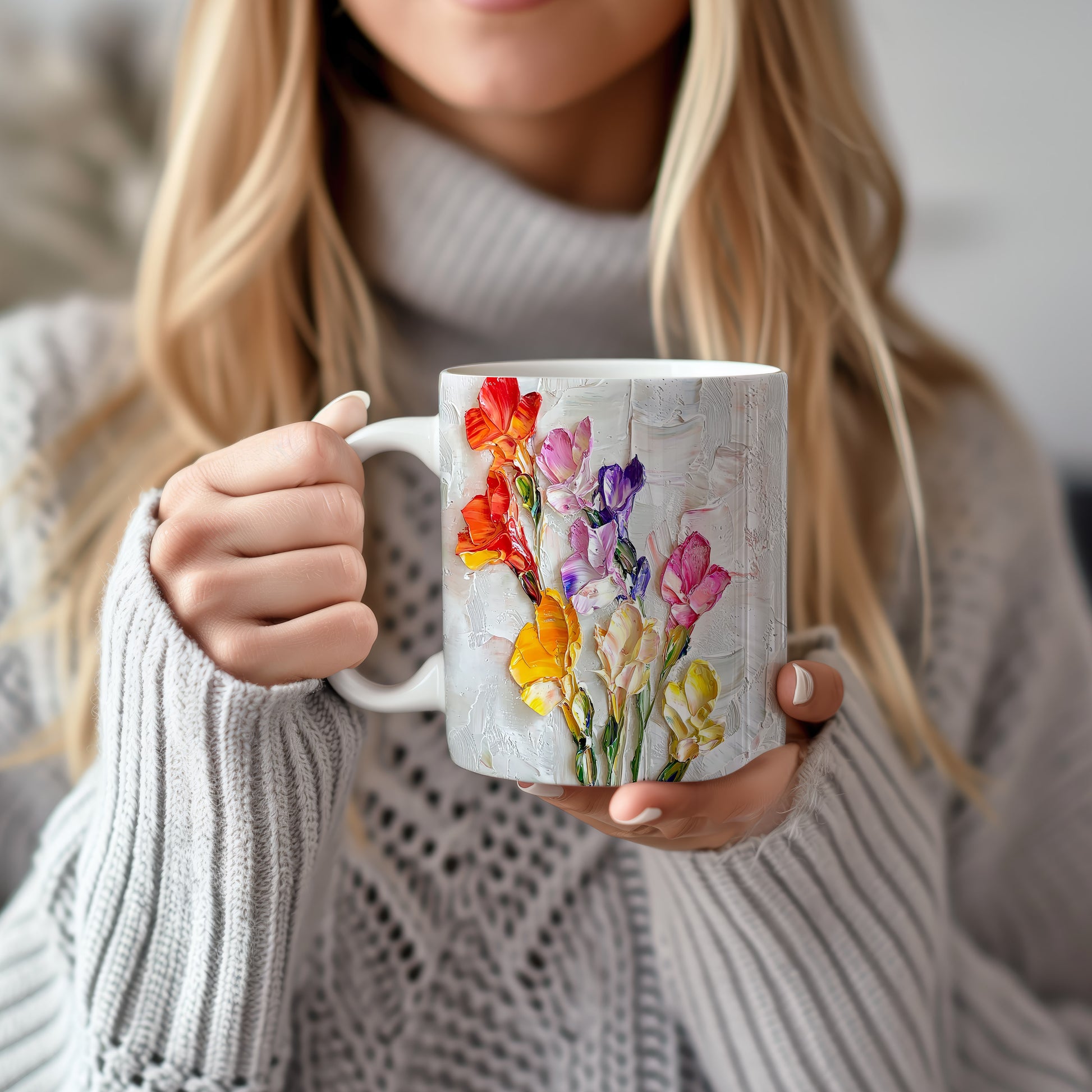 Hrnek s květinovým motivem v červených tónech – modrými detaily