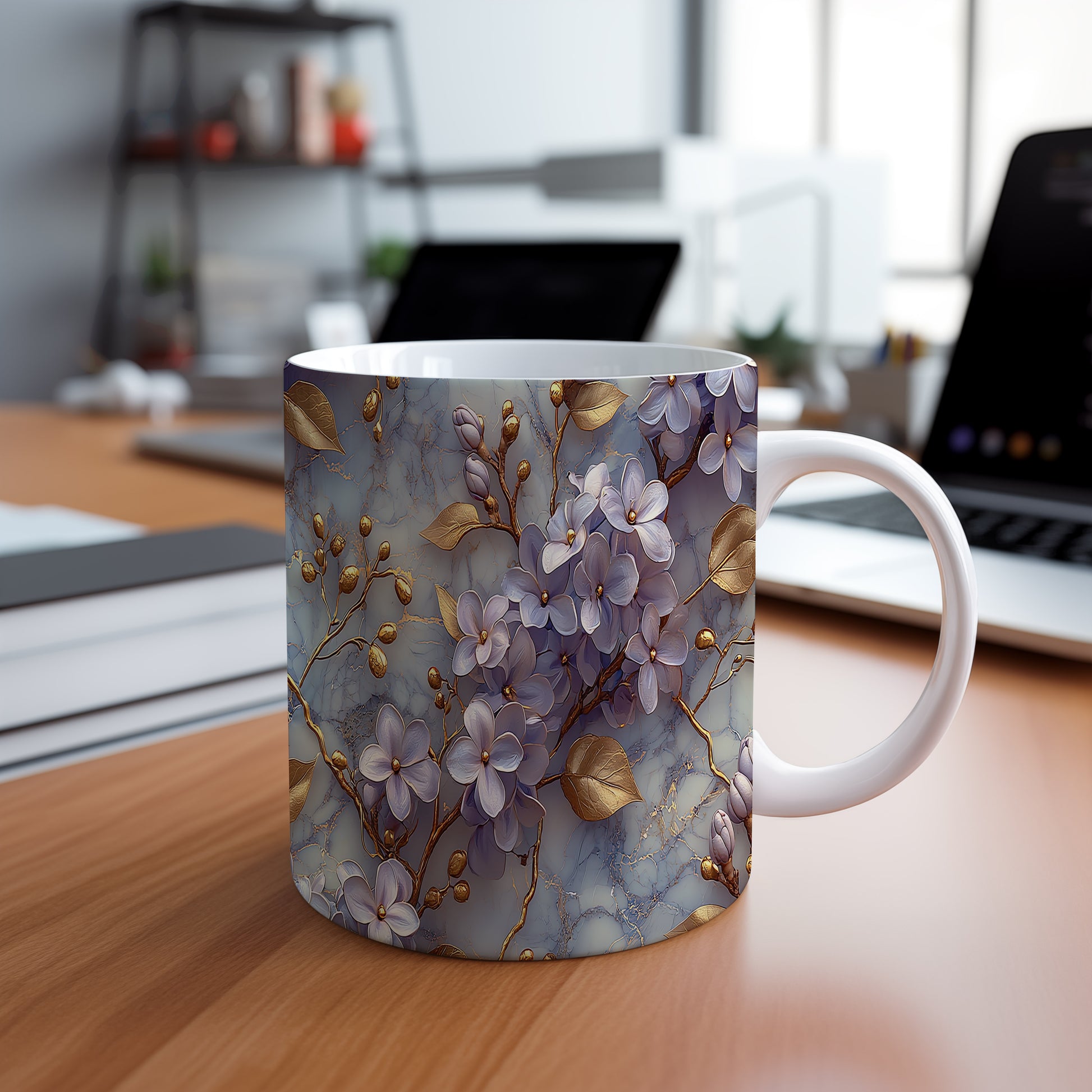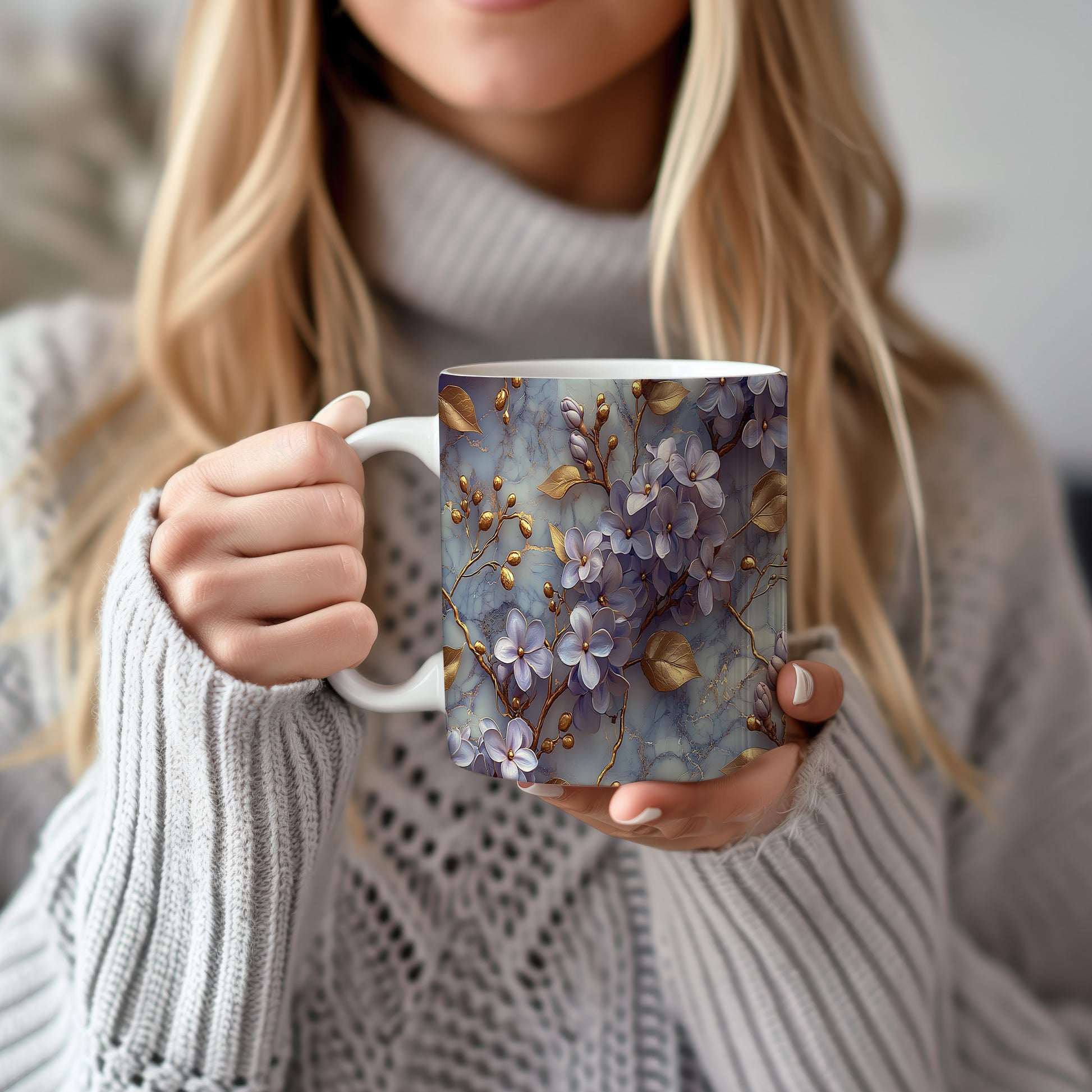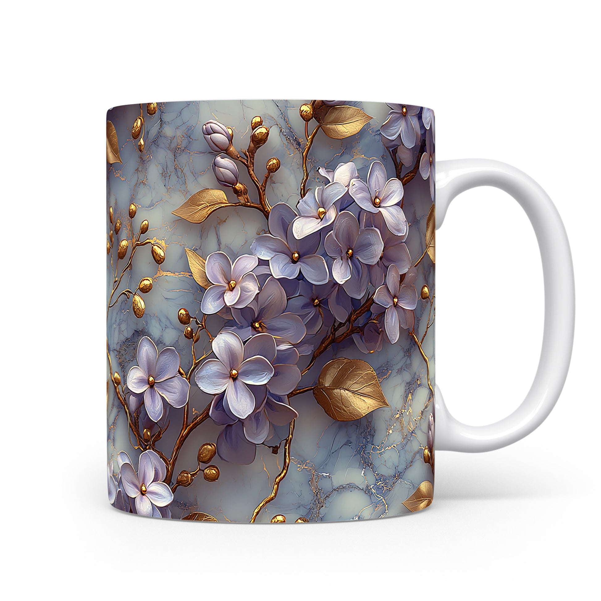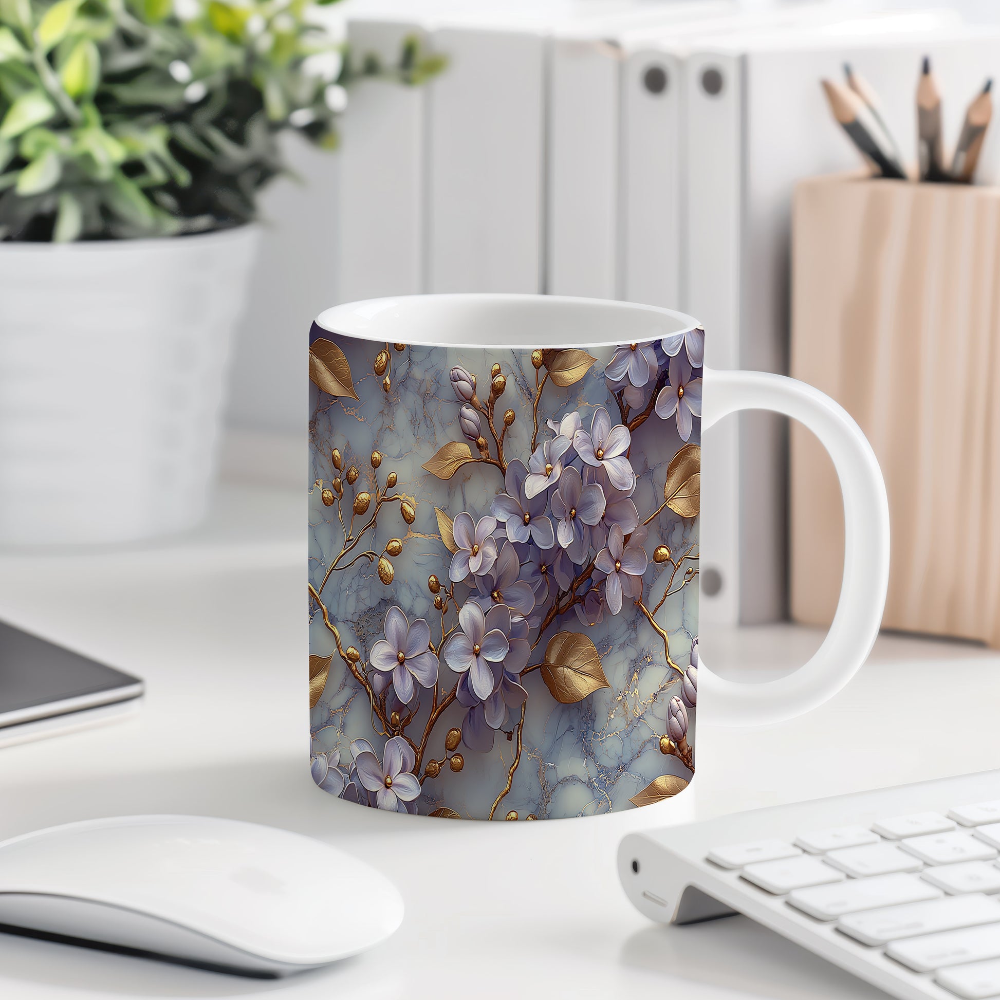 Tento keramický hrnek zdobí elegantní květinový motiv v modrých a zlatých tónech. Je ideální pro milovníky kávy a čaje, skvěle se hodí jako dárek pro vaše blízké. Materiál: keramika. Objem: 330 ml. Vhodné do myčky i mikrovlnky. Díky svému designu přináší do každého dne kousek elegance.