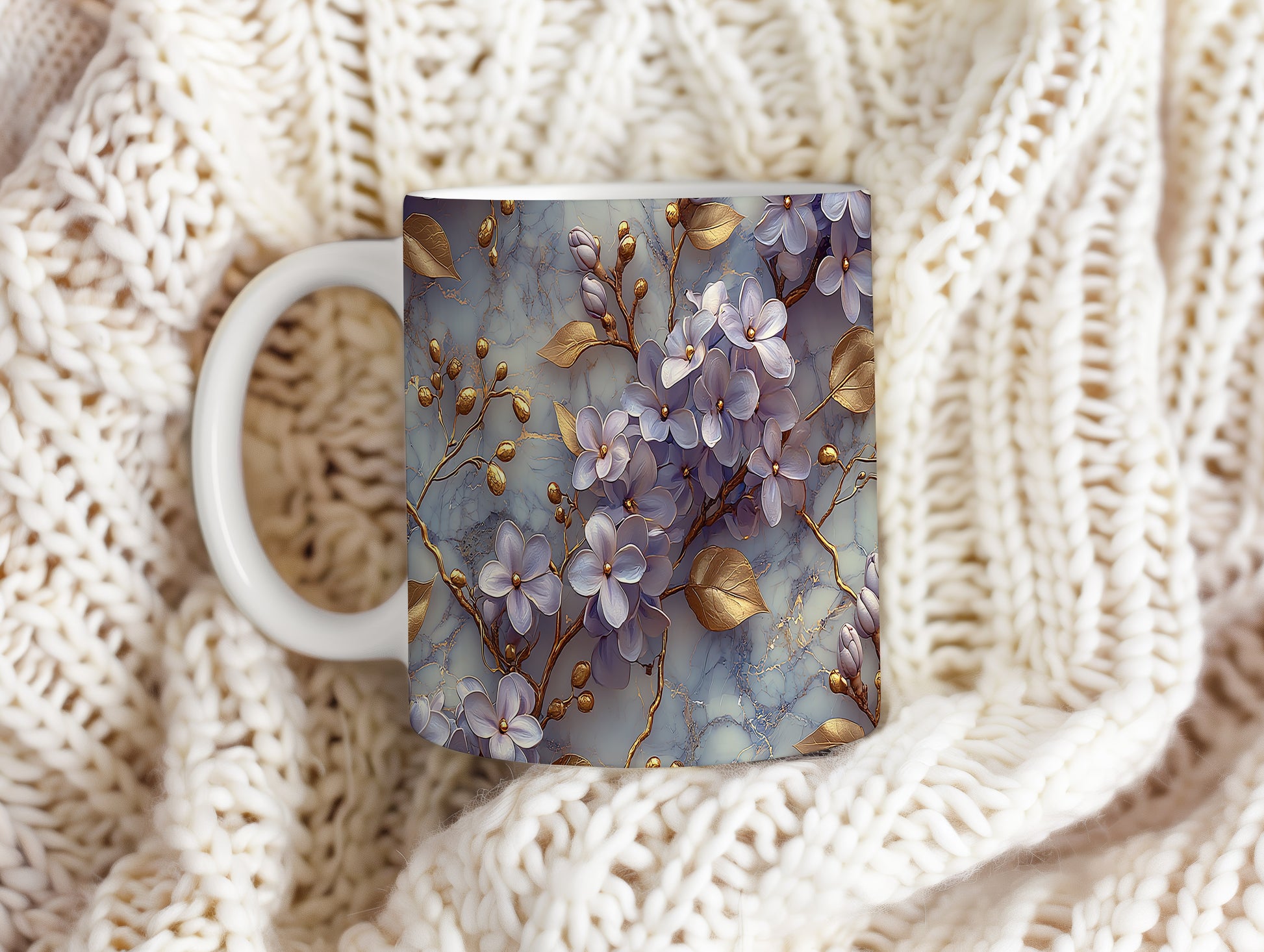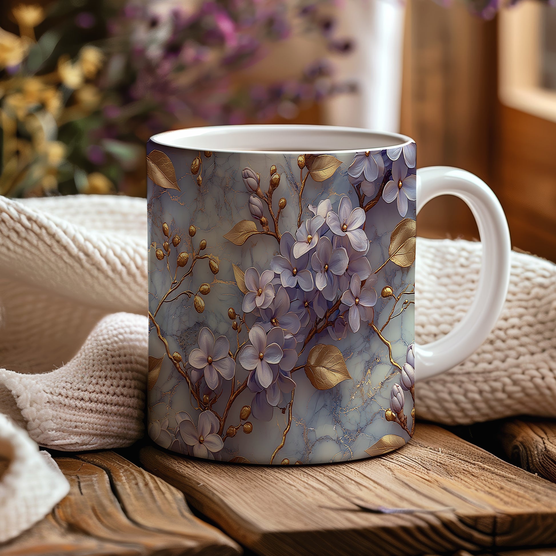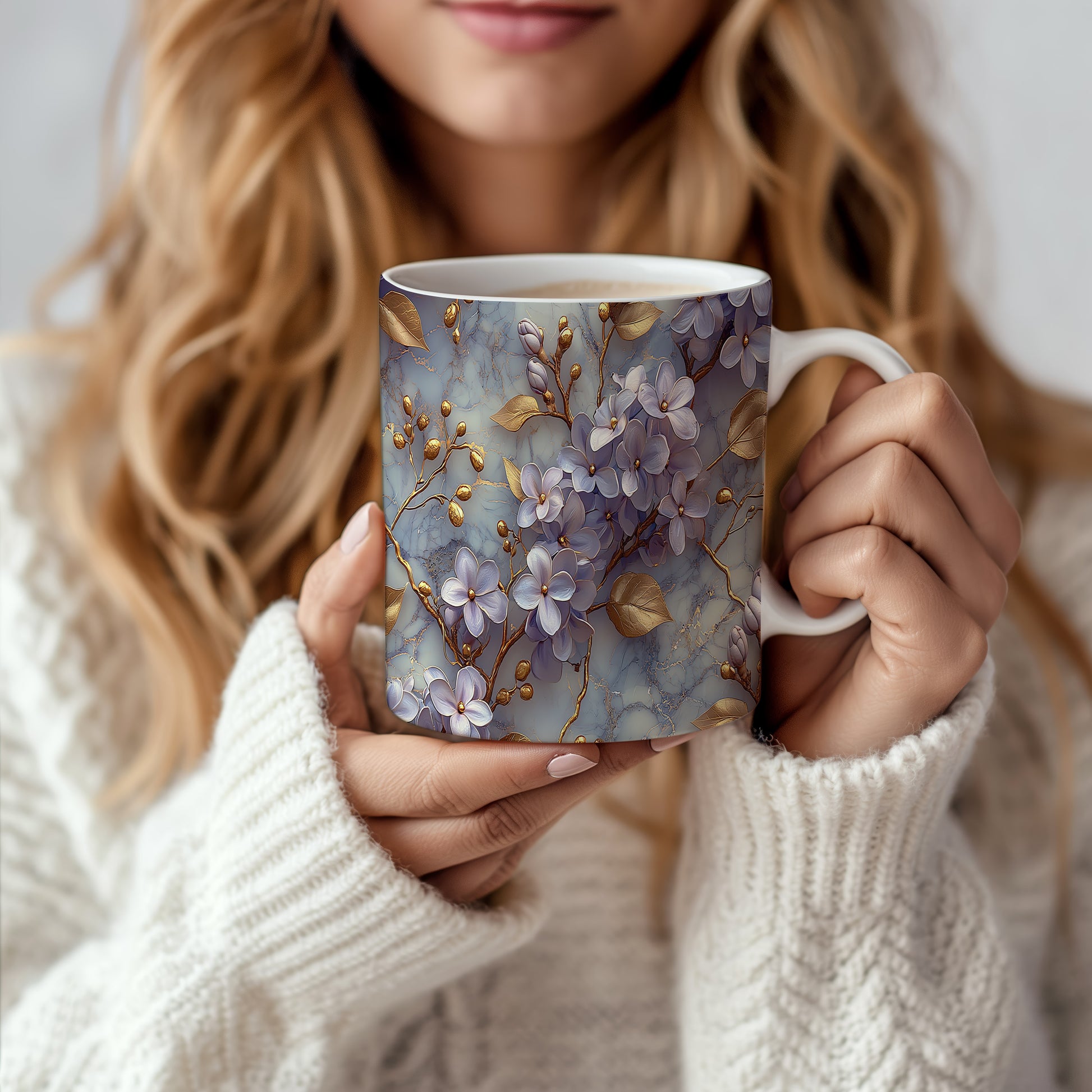 Hrnek s květinovým motivem v jemných odstínech – modrými detaily