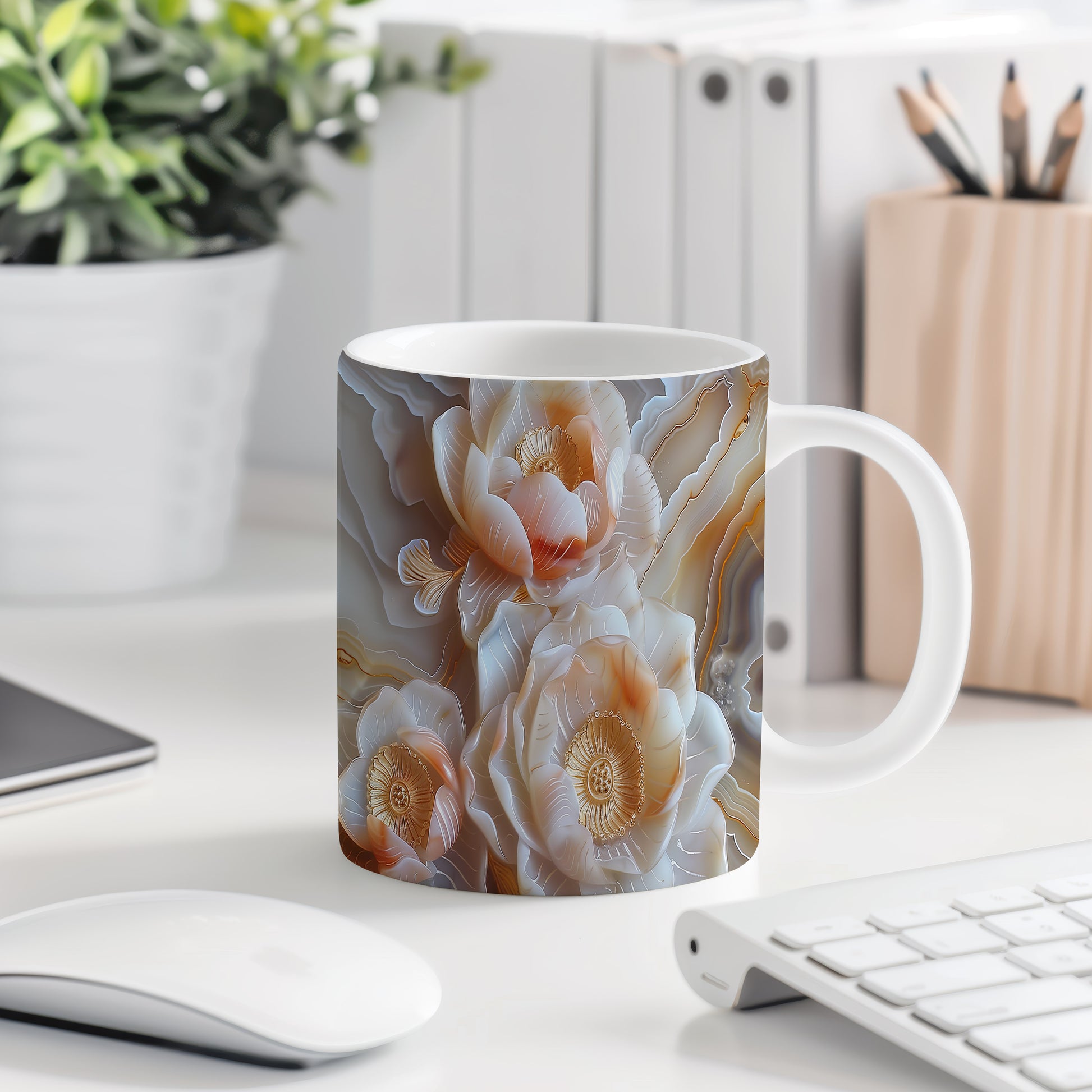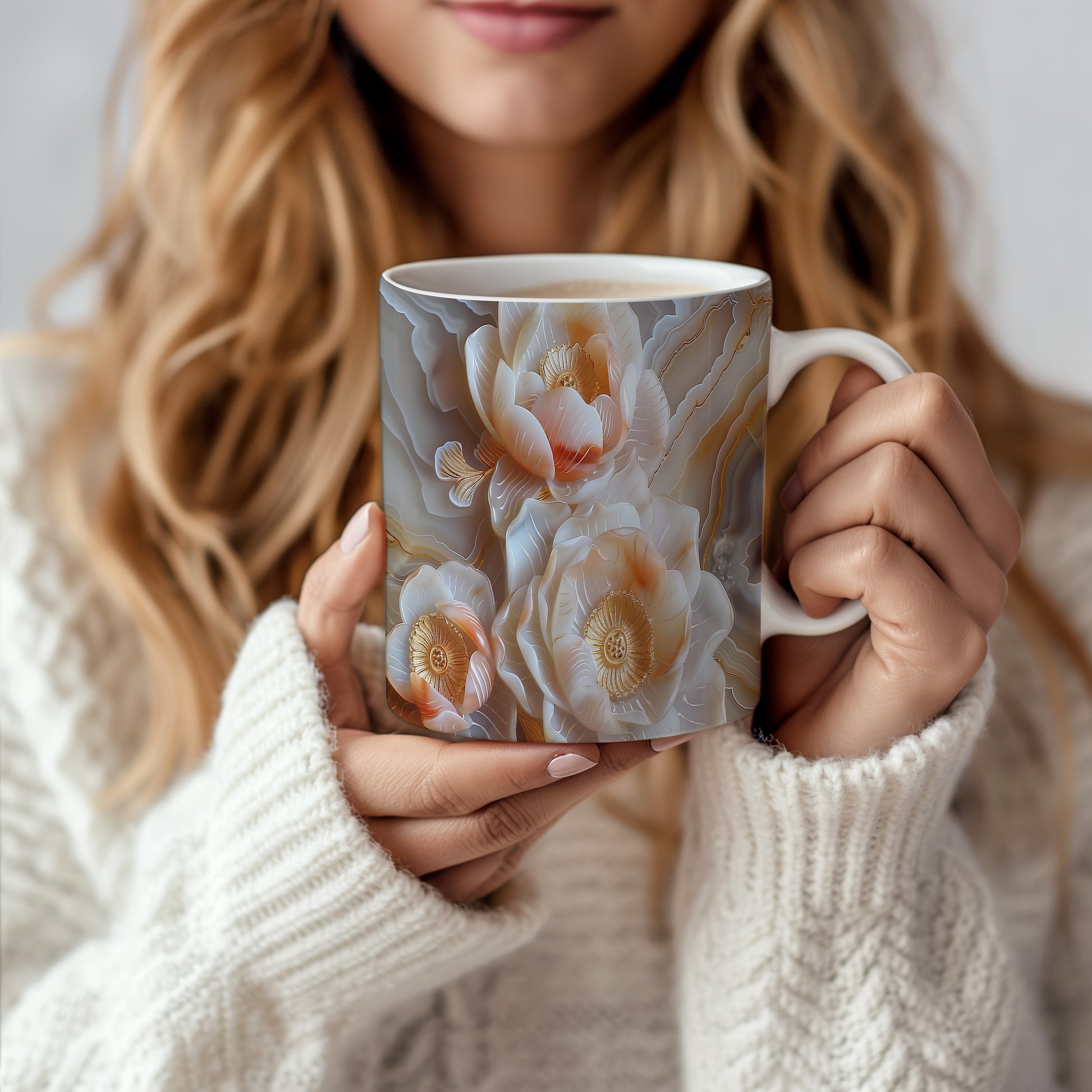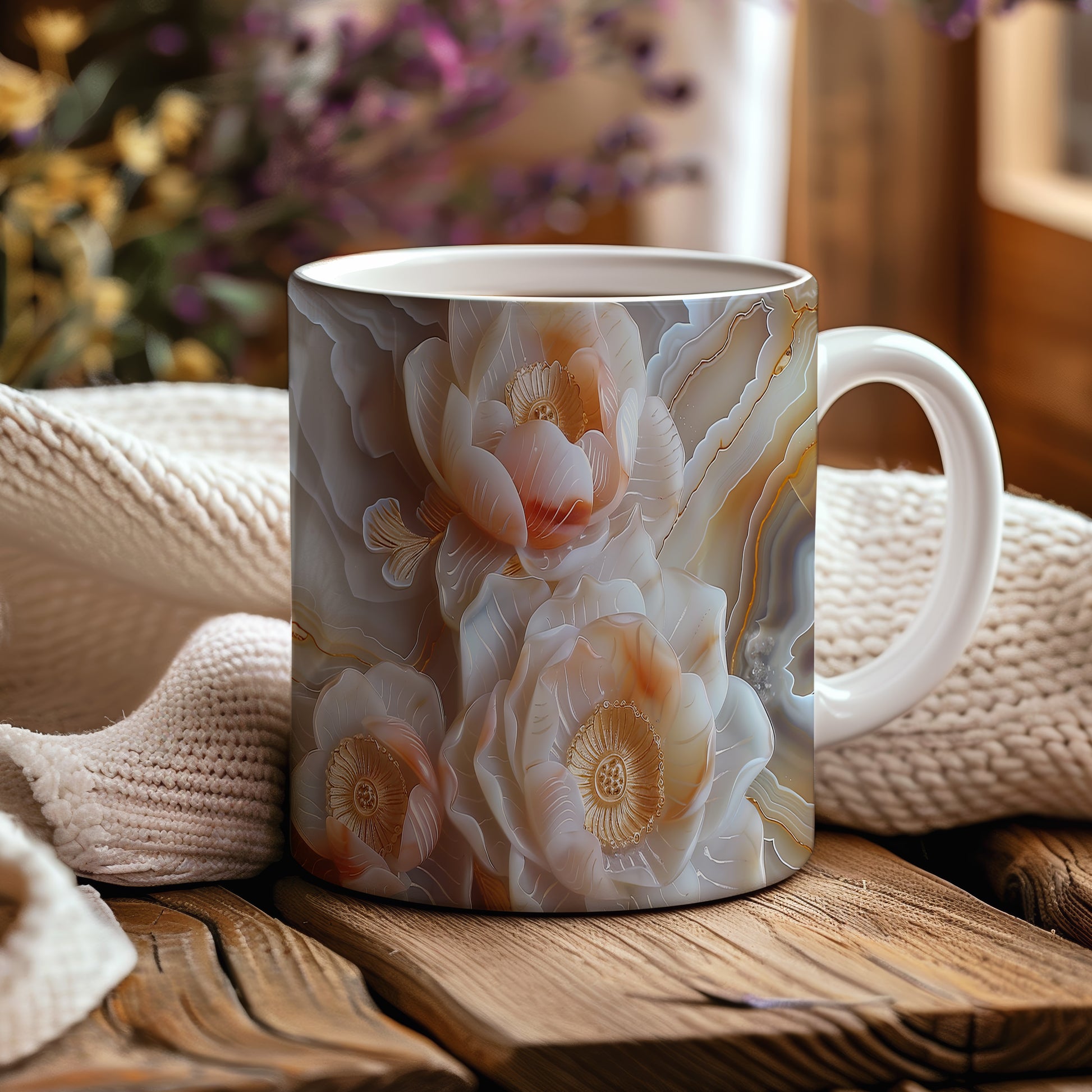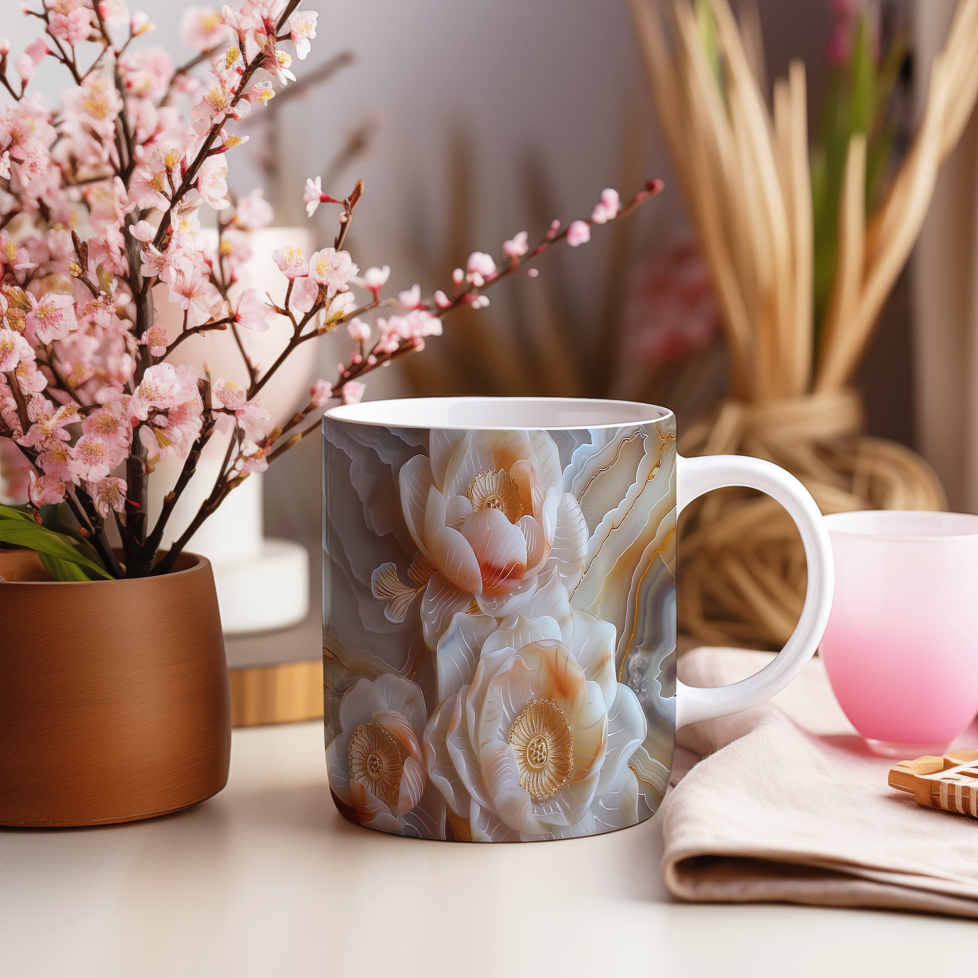 Hrnek s květinovým motivem v jemných tónech – malířským vzhledem