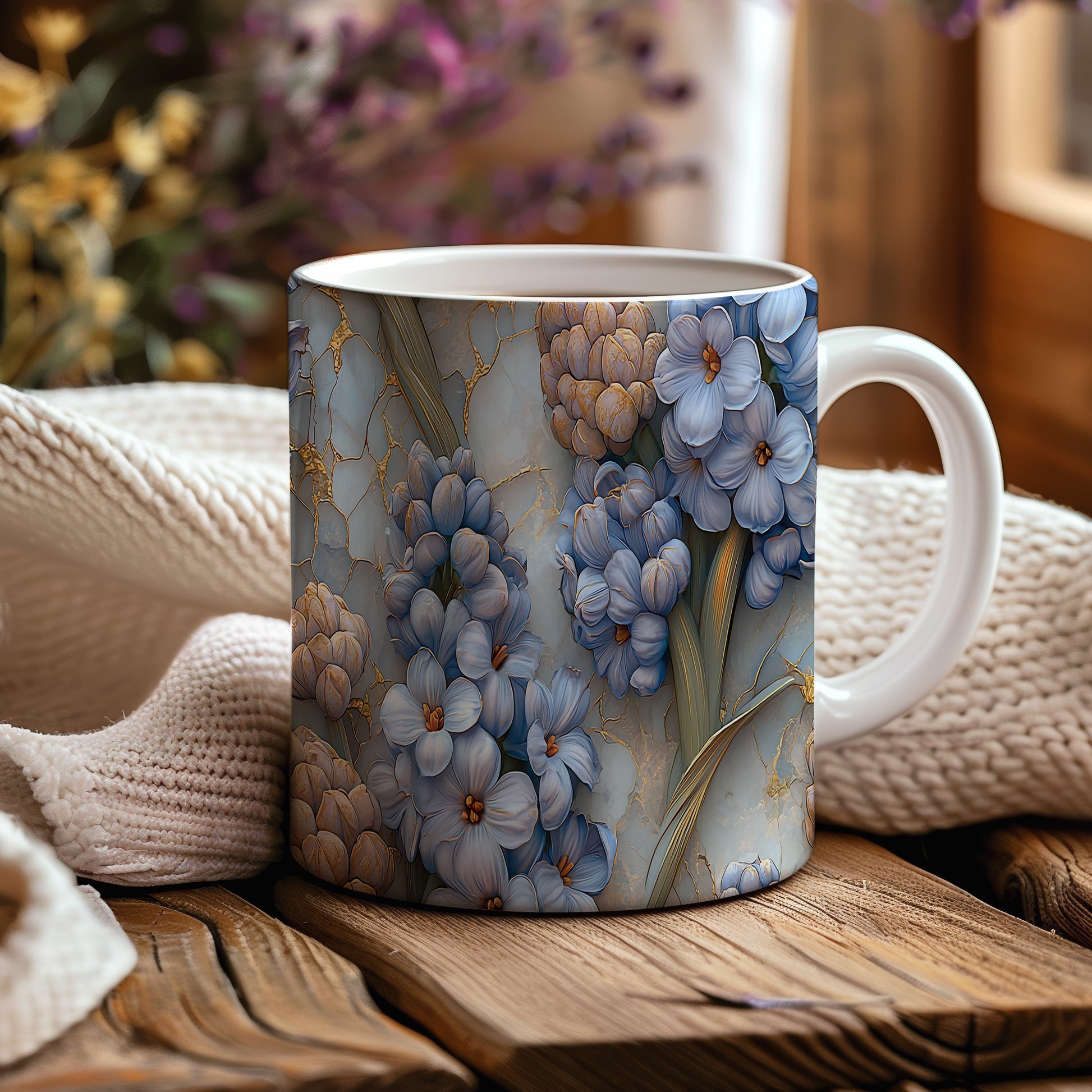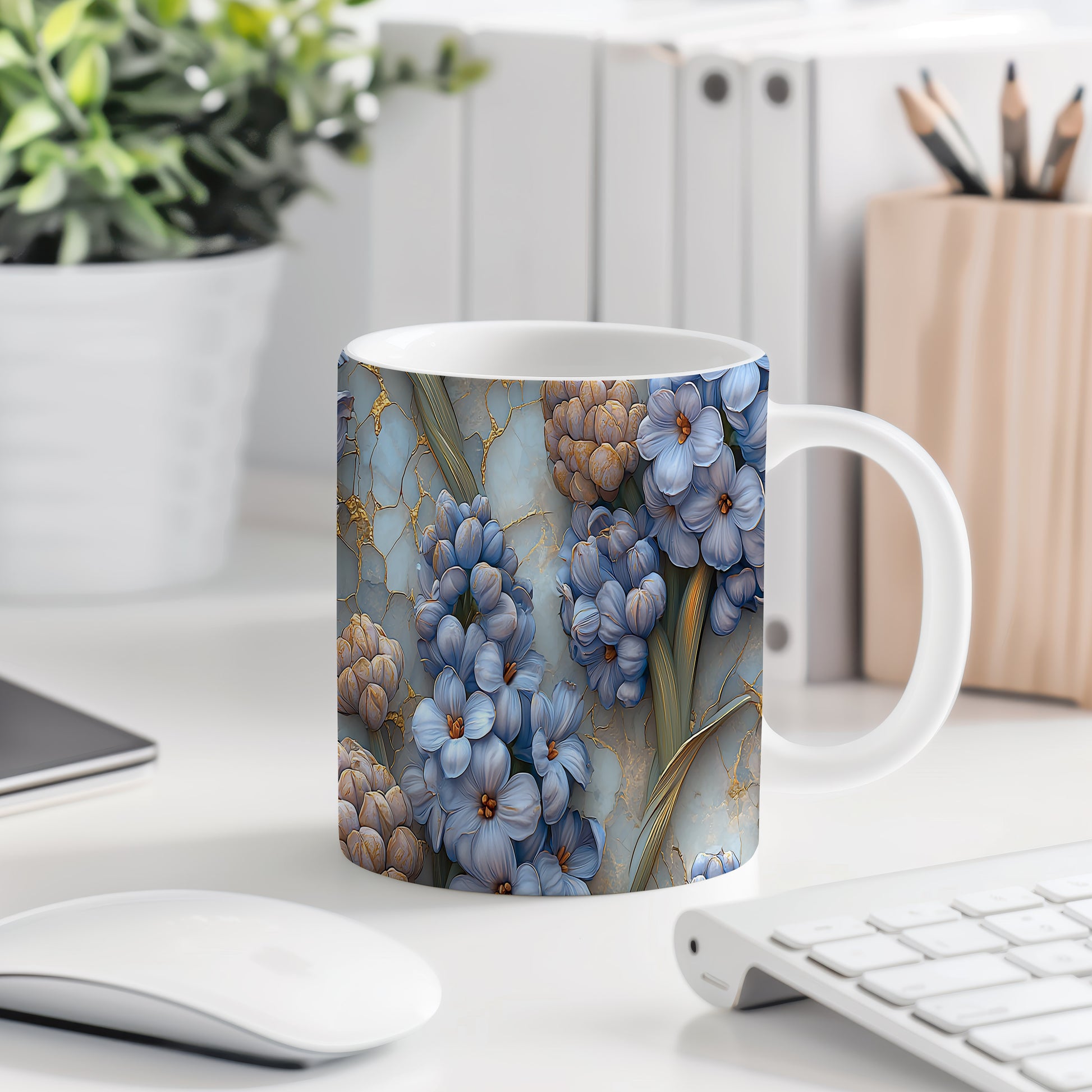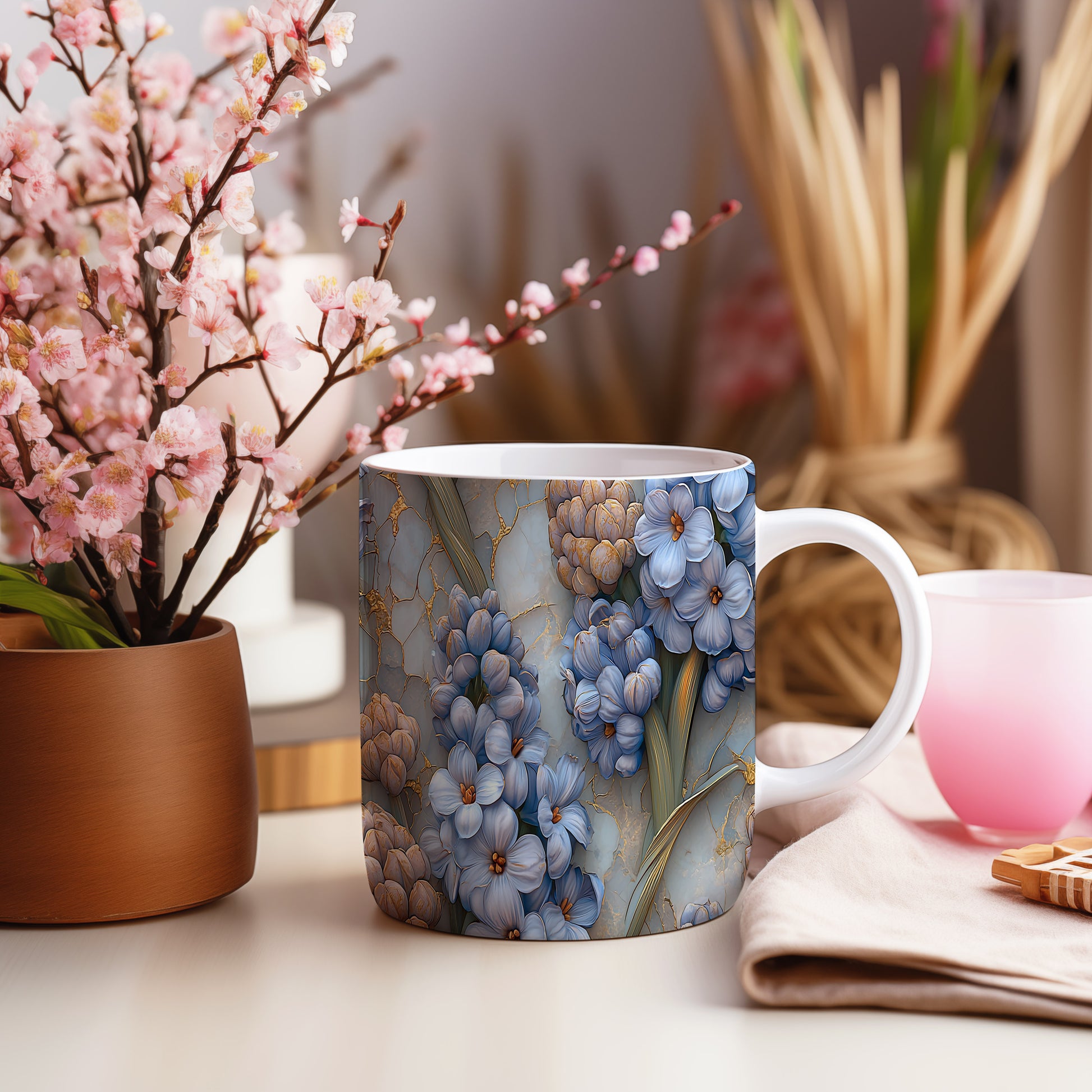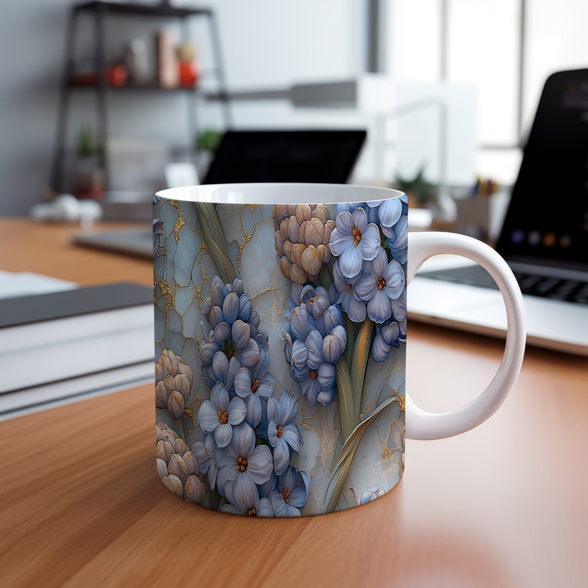 Hrnek s květinovým motivem v modré barvě