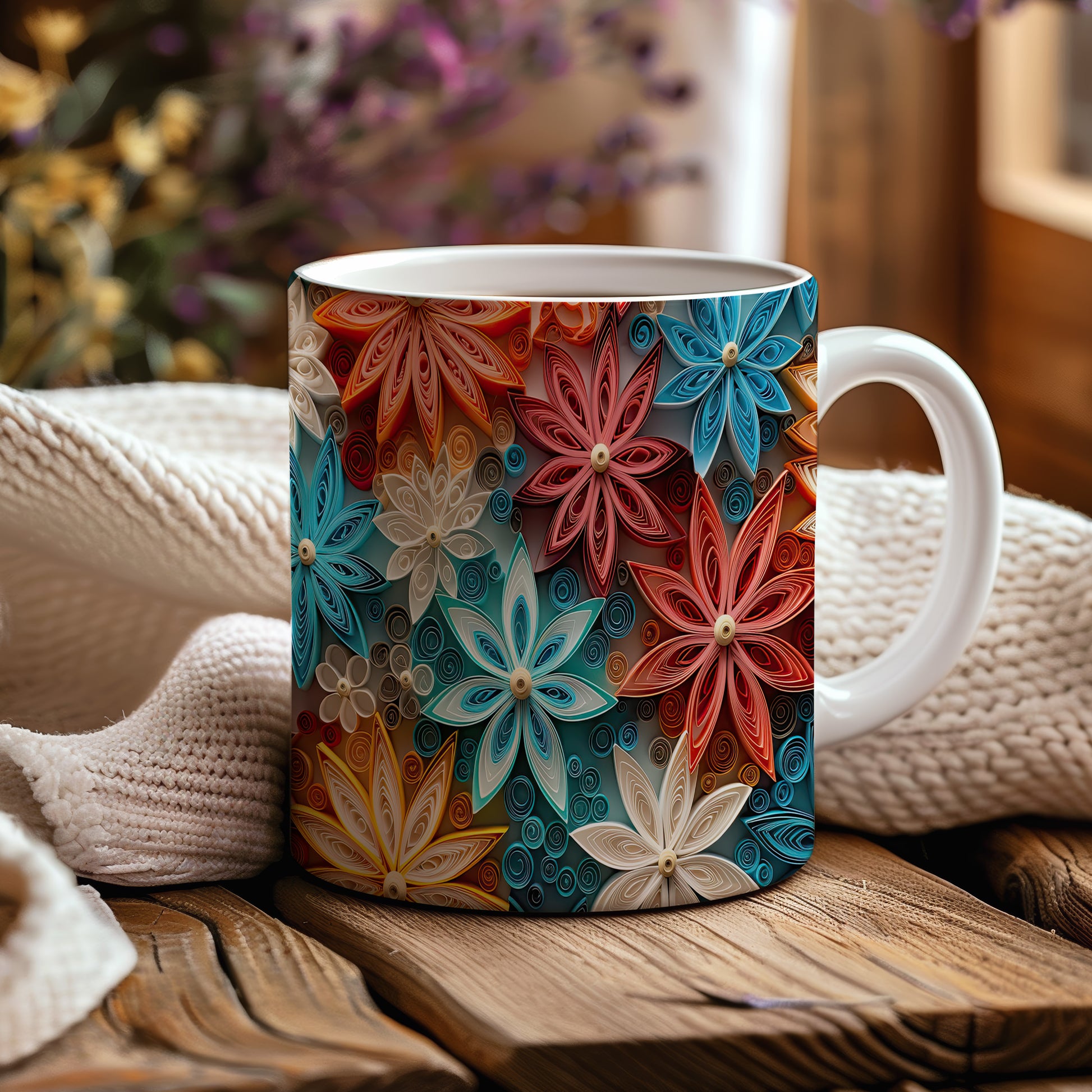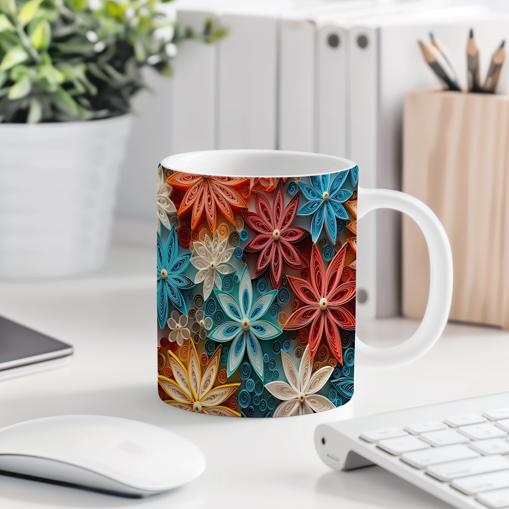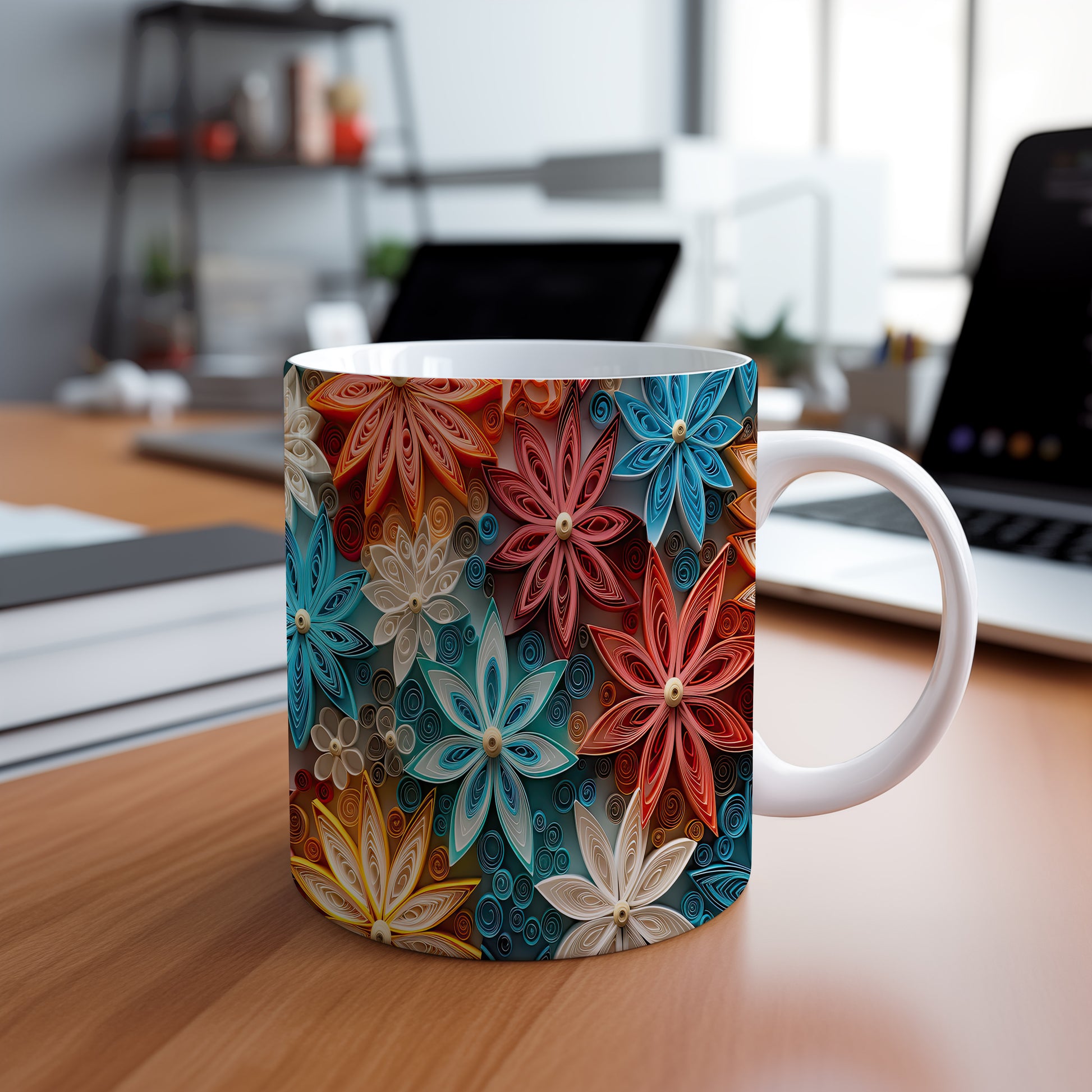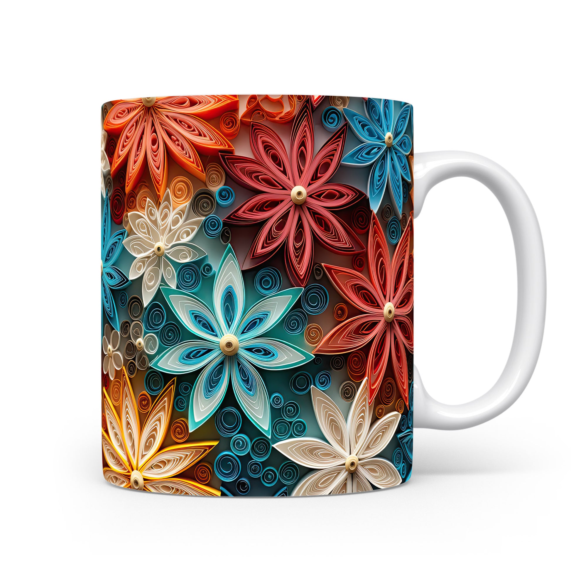 Tento krásný keramický hrnek s barevným květinovým motivem je inspirován papírovým quillingem. Je ideální pro každodenní používání a skvělým dárkem pro milovníky květin. Materiál: keramika. Objem: 330 ml. Vhodné do myčky i mikrovlnky. Díky svému designu přináší do vašeho pití radost a barevnost.