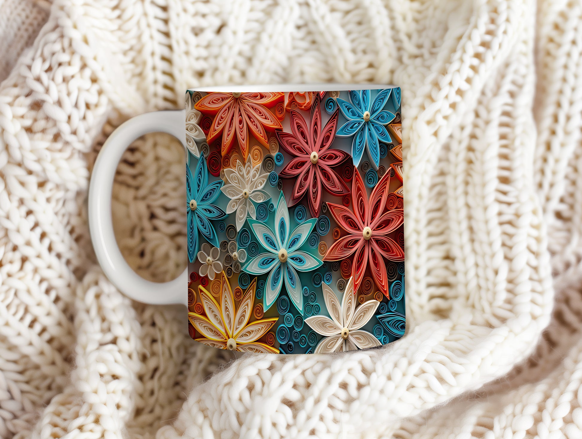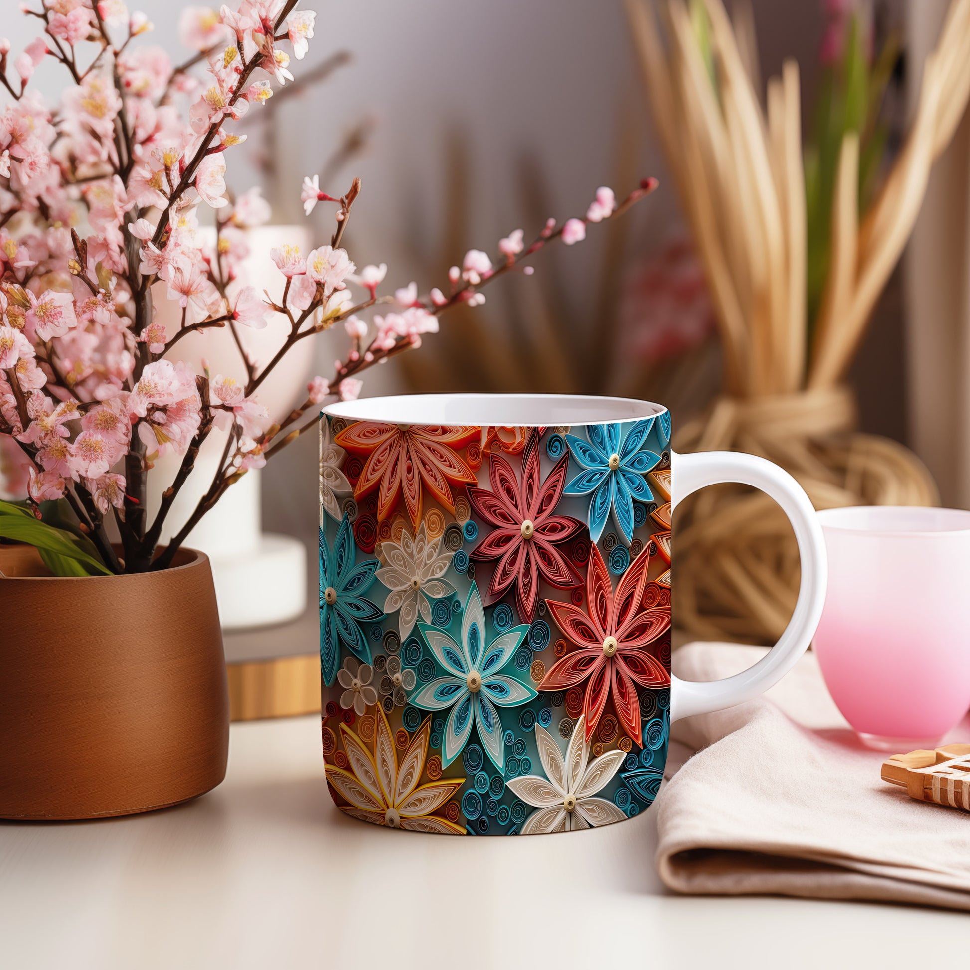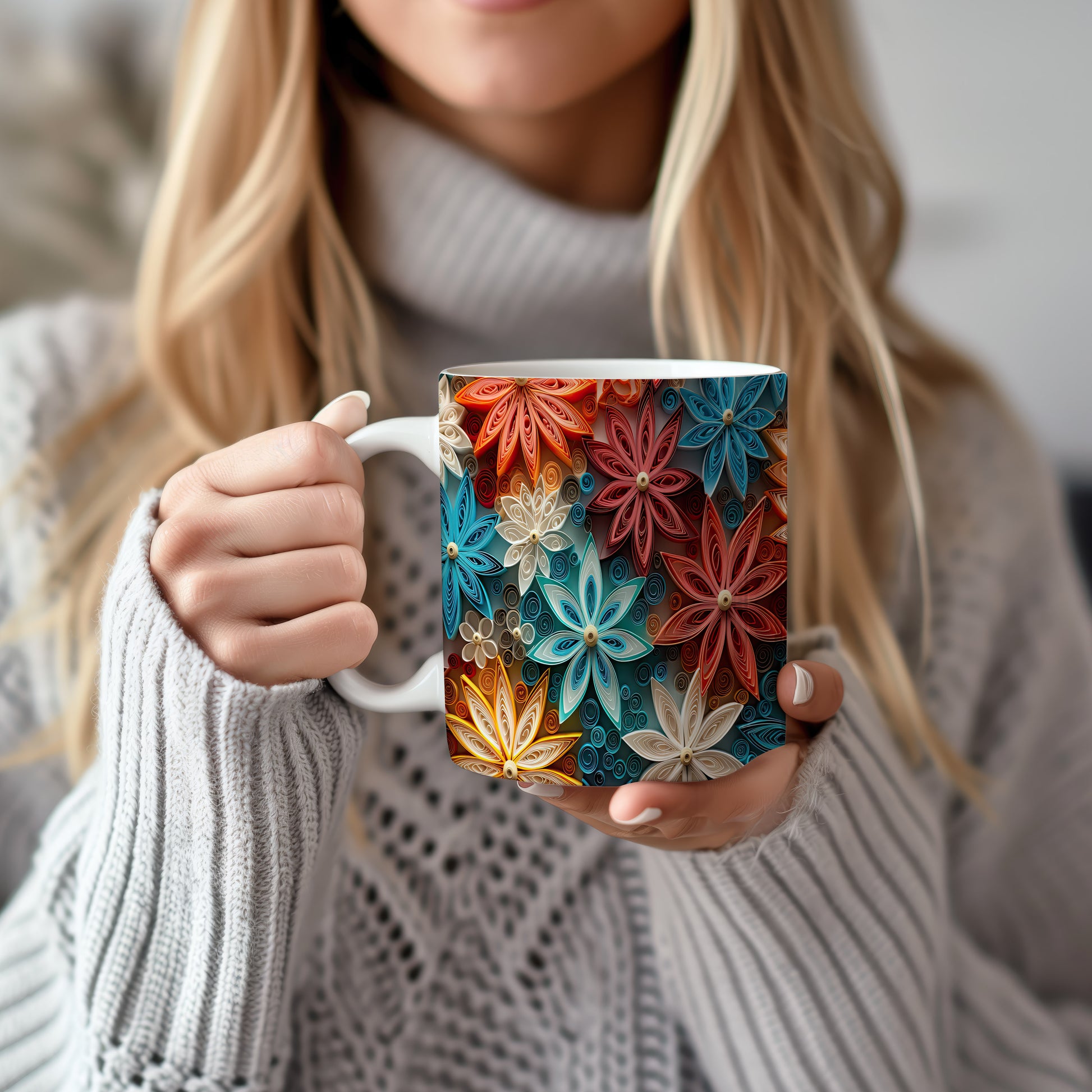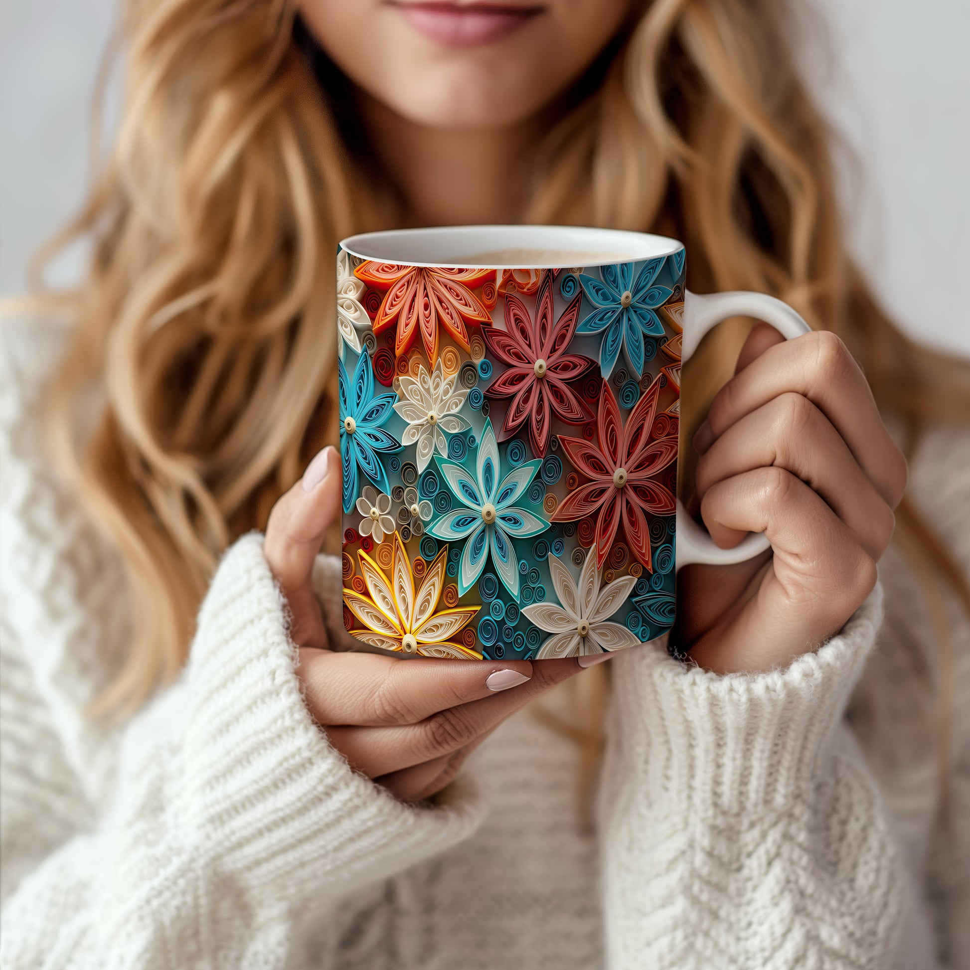 Tento krásný keramický hrnek s barevným květinovým motivem je inspirován papírovým quillingem. Je ideální pro každodenní používání a skvělým dárkem pro milovníky květin. Materiál: keramika. Objem: 330 ml. Vhodné do myčky i mikrovlnky. Díky svému designu přináší do vašeho pití radost a barevnost.
