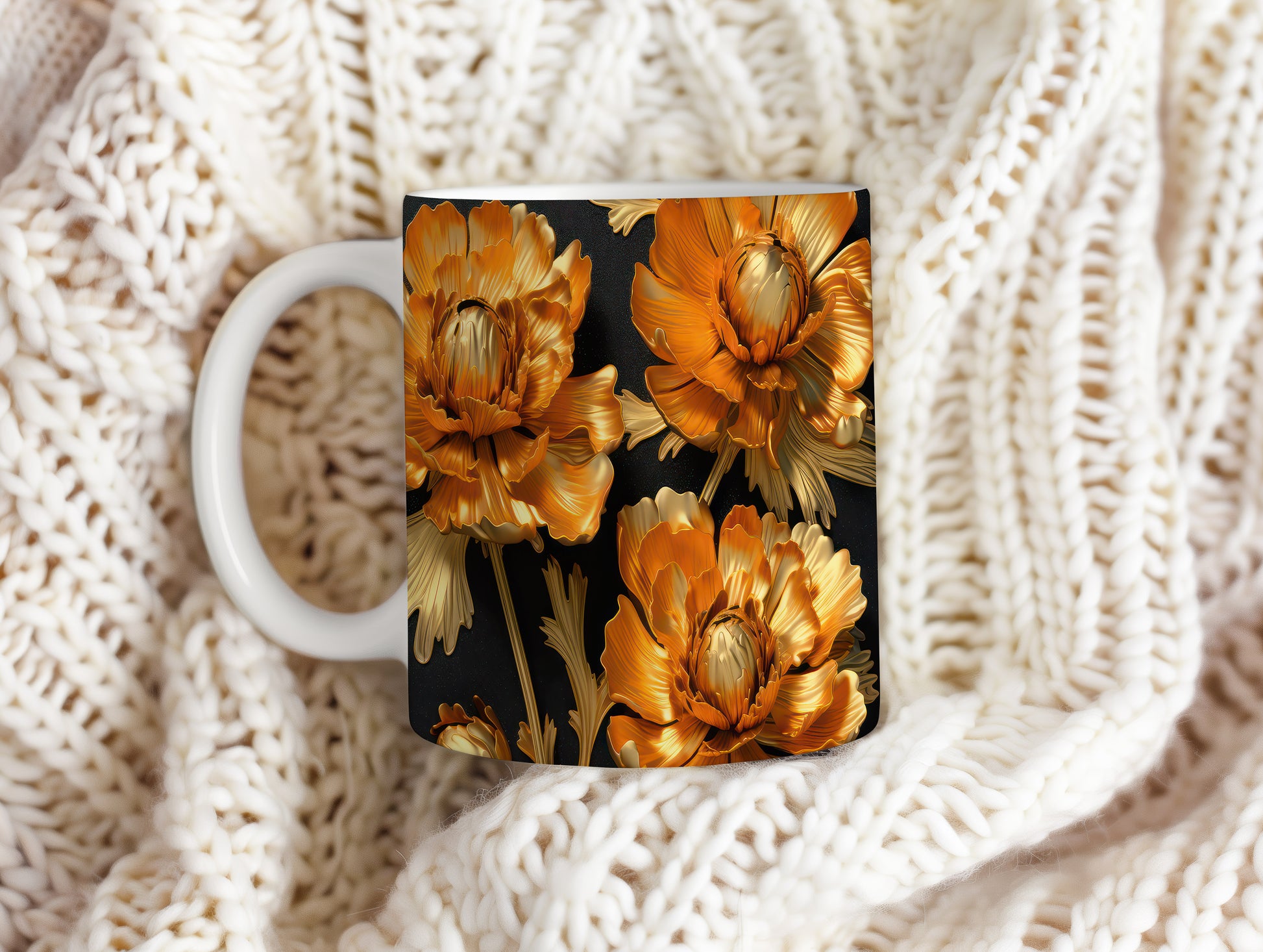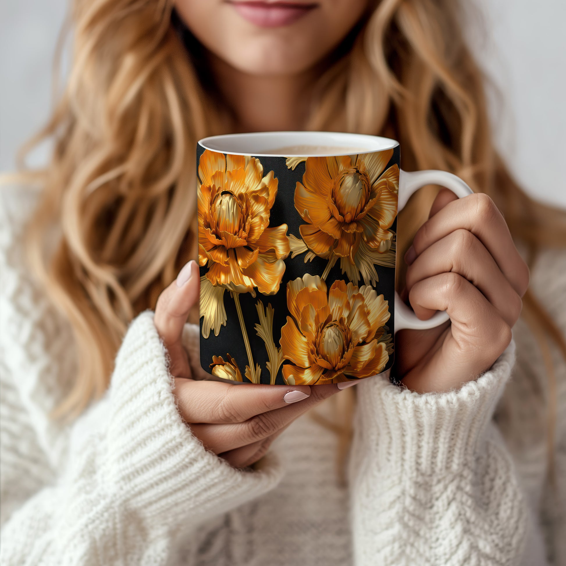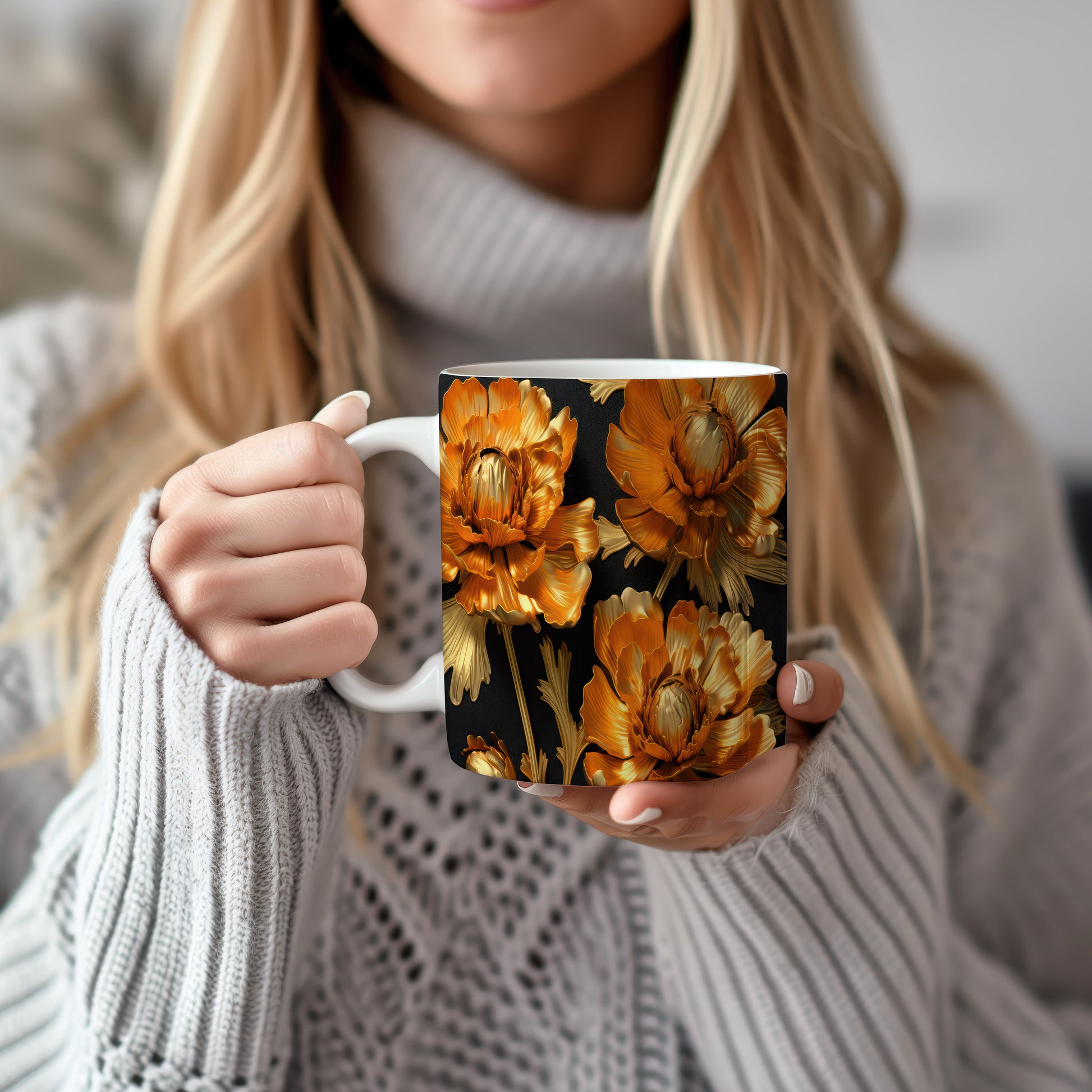 Elegantní hrnek s krásnými oranžovými květinami na černém pozadí. Tento stylový kousek potěší každého milovníka květin a přírody, skvělý tip na dárek pro blízké. Materiál: keramika. Objem: 330 ml. Vhodné do myčky i mikrovlnky. Užijte si kávu nebo čaj v tomto jedinečném hrnku, který přináší radost do každého dne.