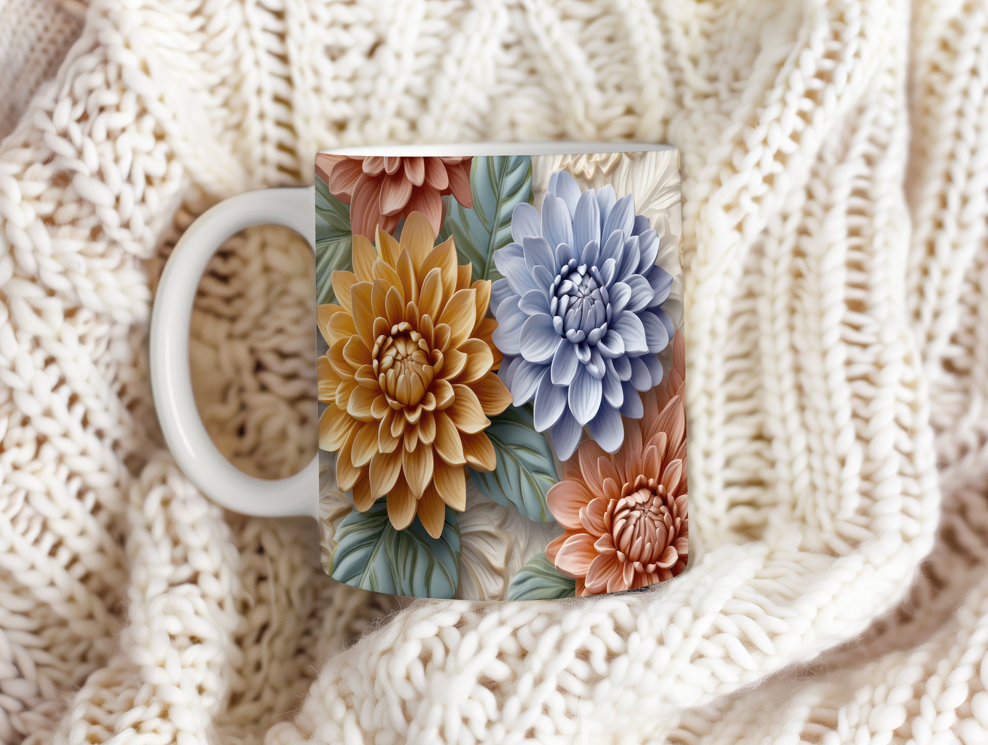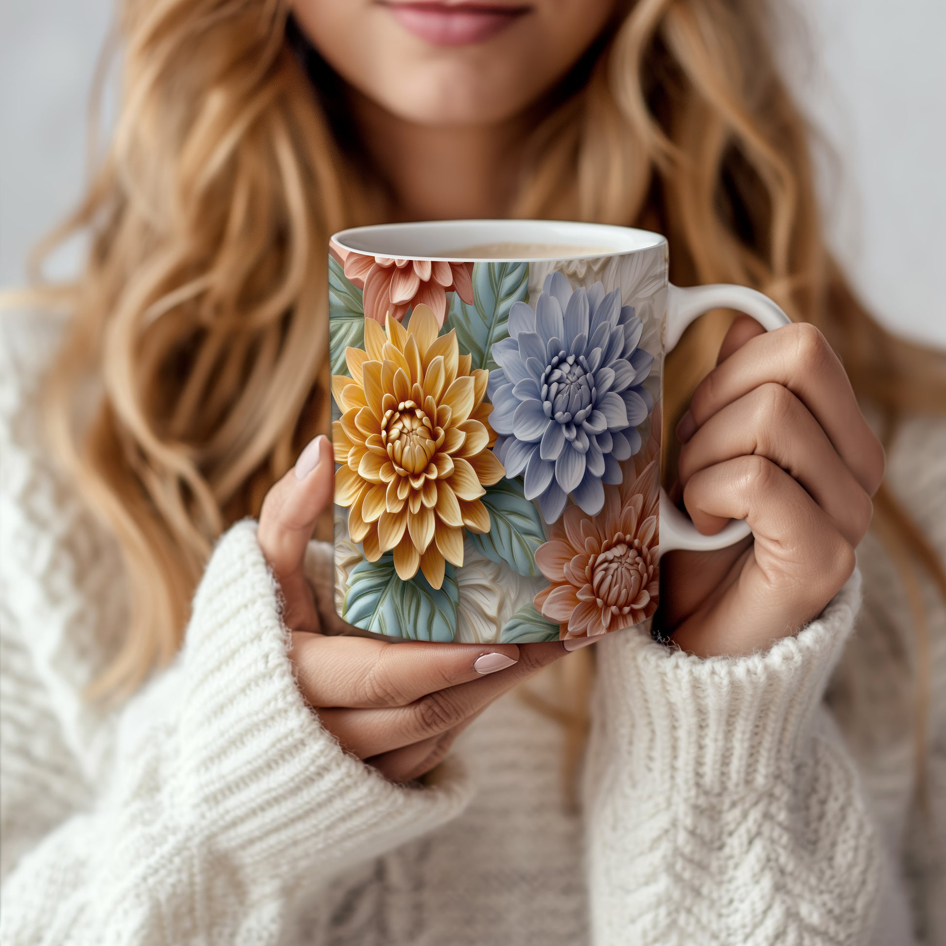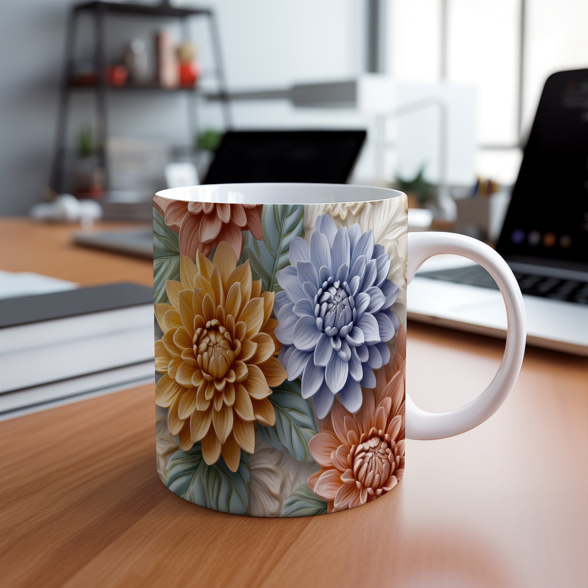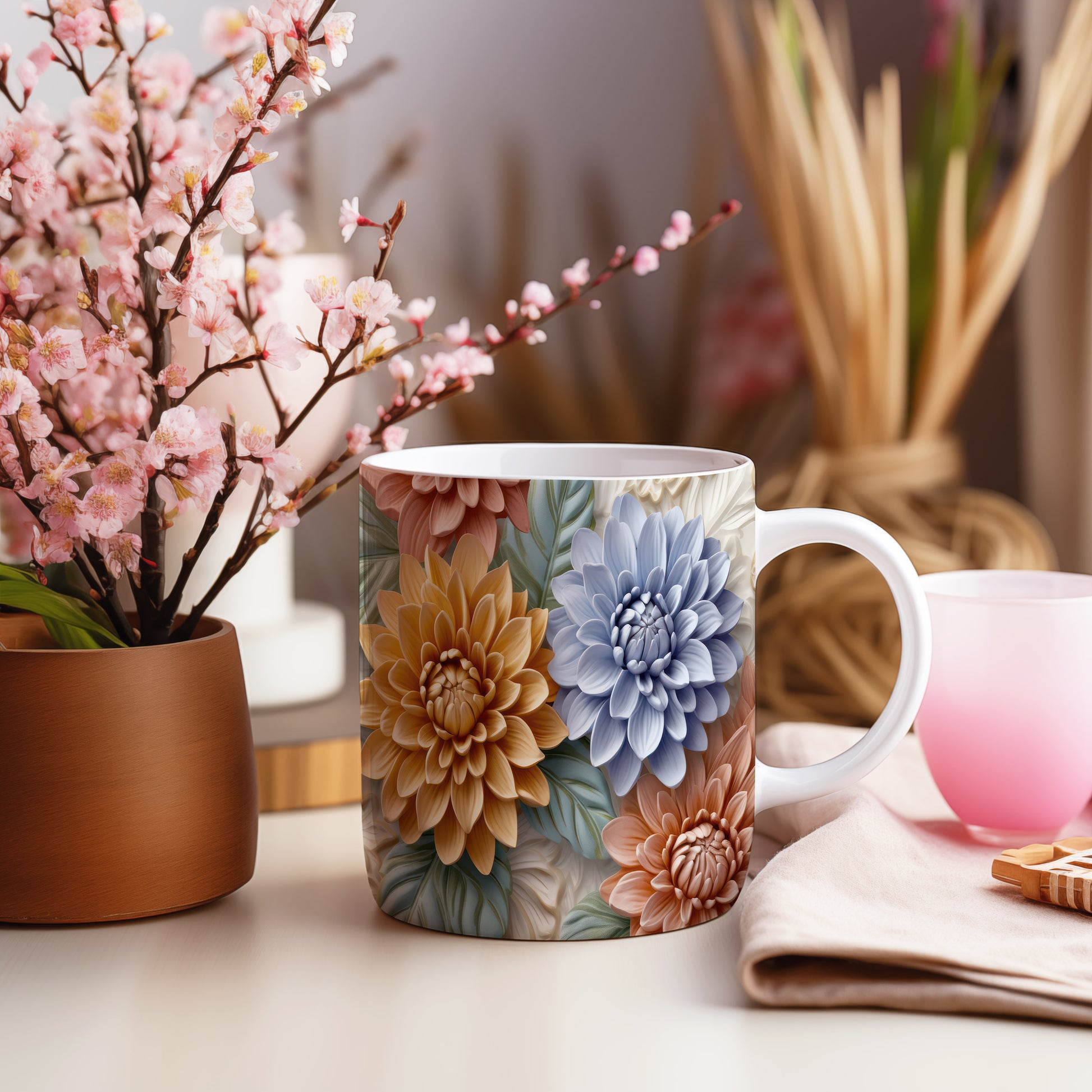 Hrnek s květinovým motivem v teplých barvách – digitální ilustrací