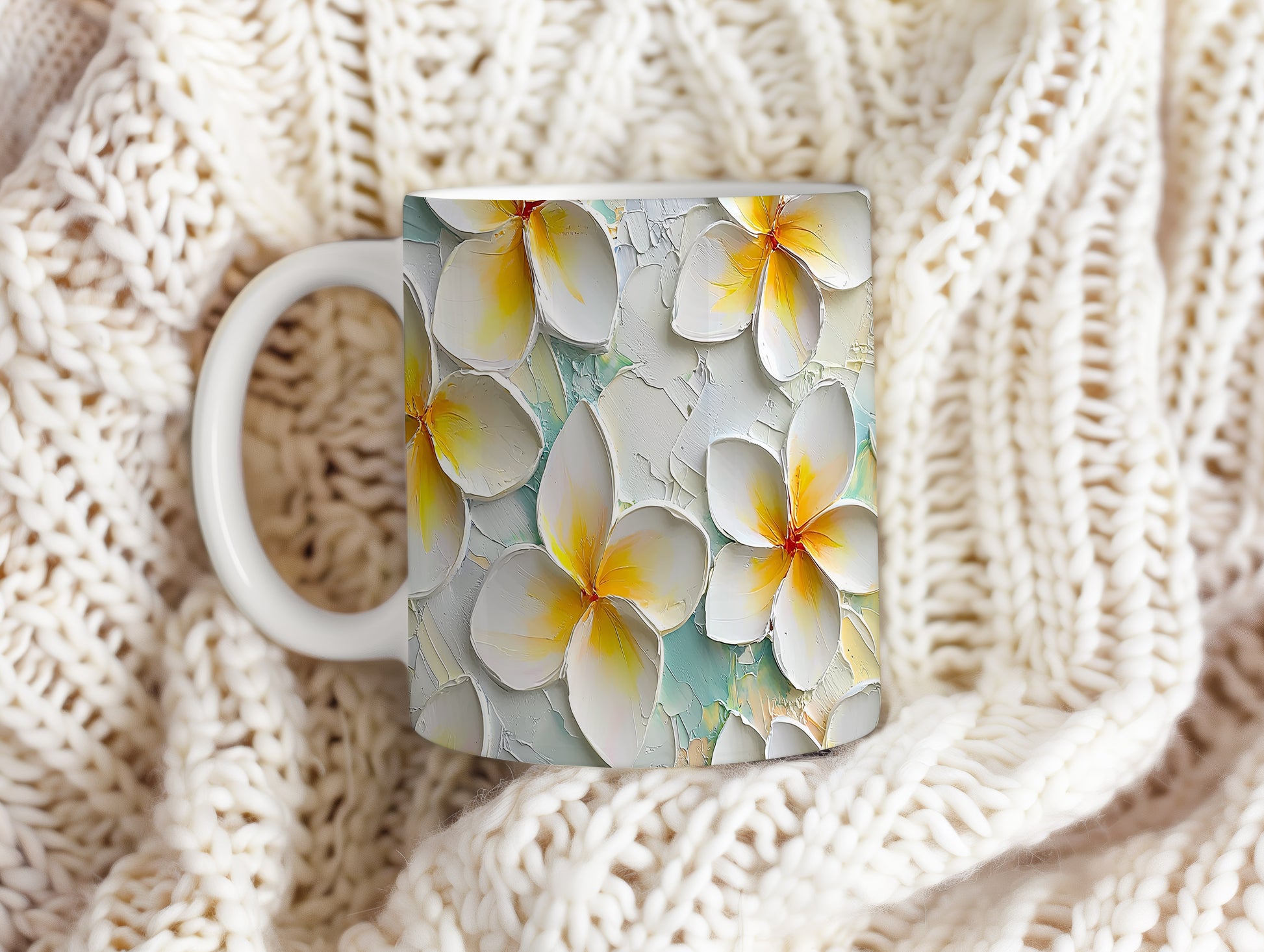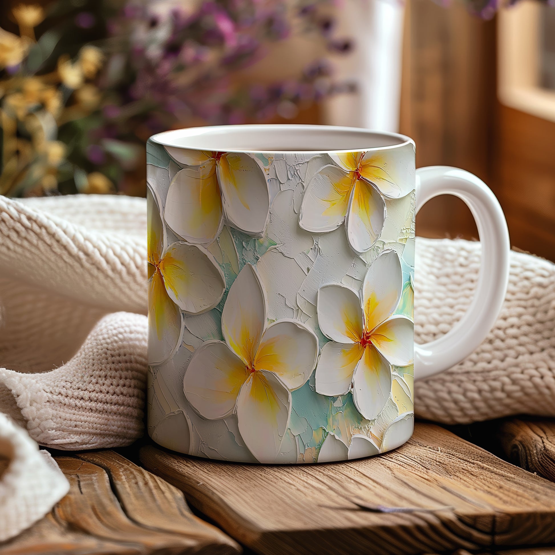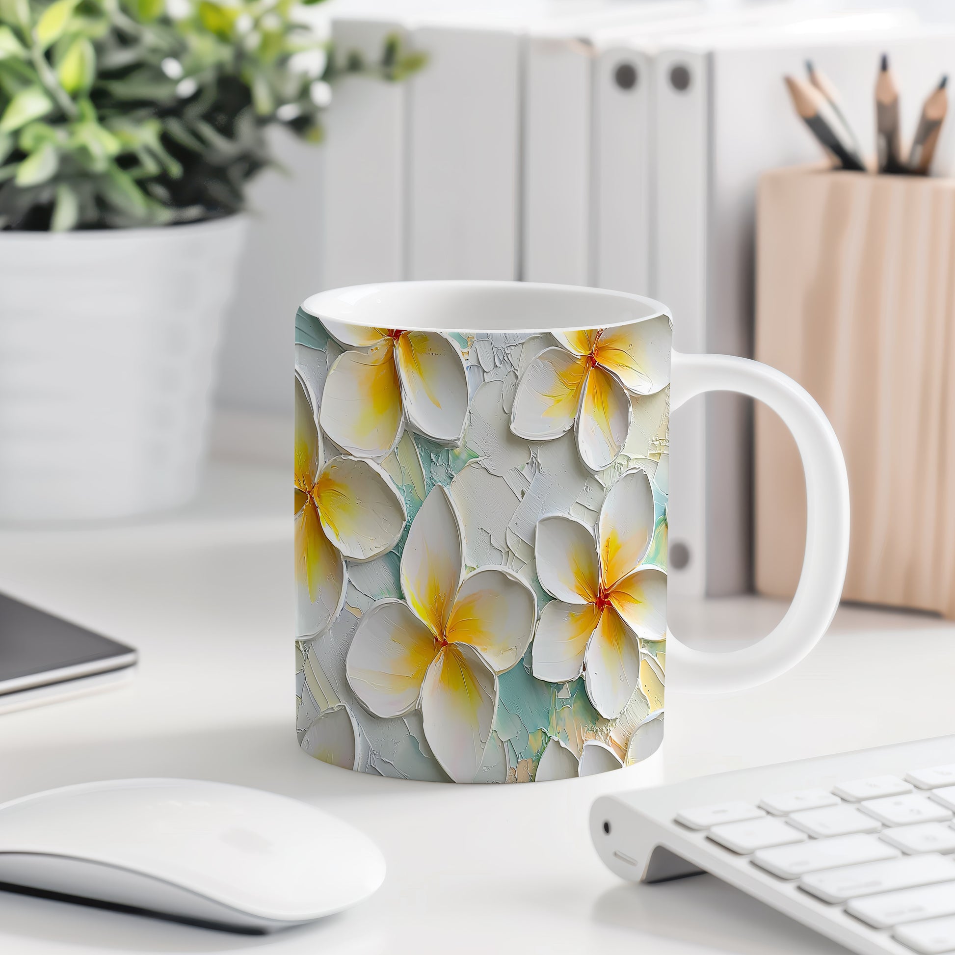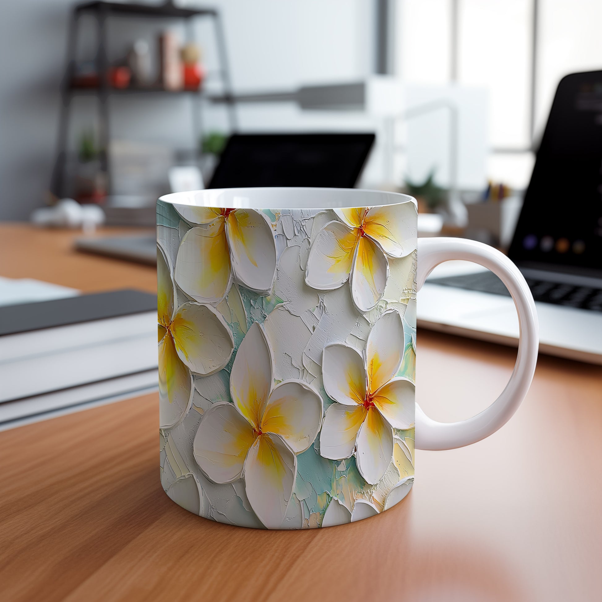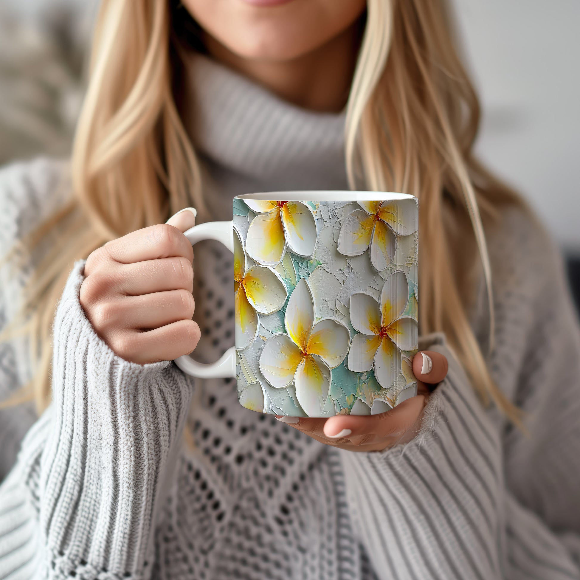 Hrnek s krásným květinovým motivem v bílé a žluté barvě na světle modrém pozadí. Tento stylový kousek je ideální pro každodenní používání a skvělým dárkem pro milovníky přírody. Materiál: keramika. Objem: 330 ml. Vhodné do myčky i mikrovlnky. Užijte si kávu nebo čaj s nádechem jara a osvěžte si tak každý den.