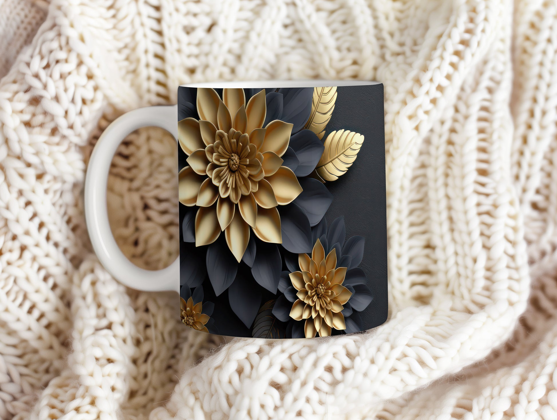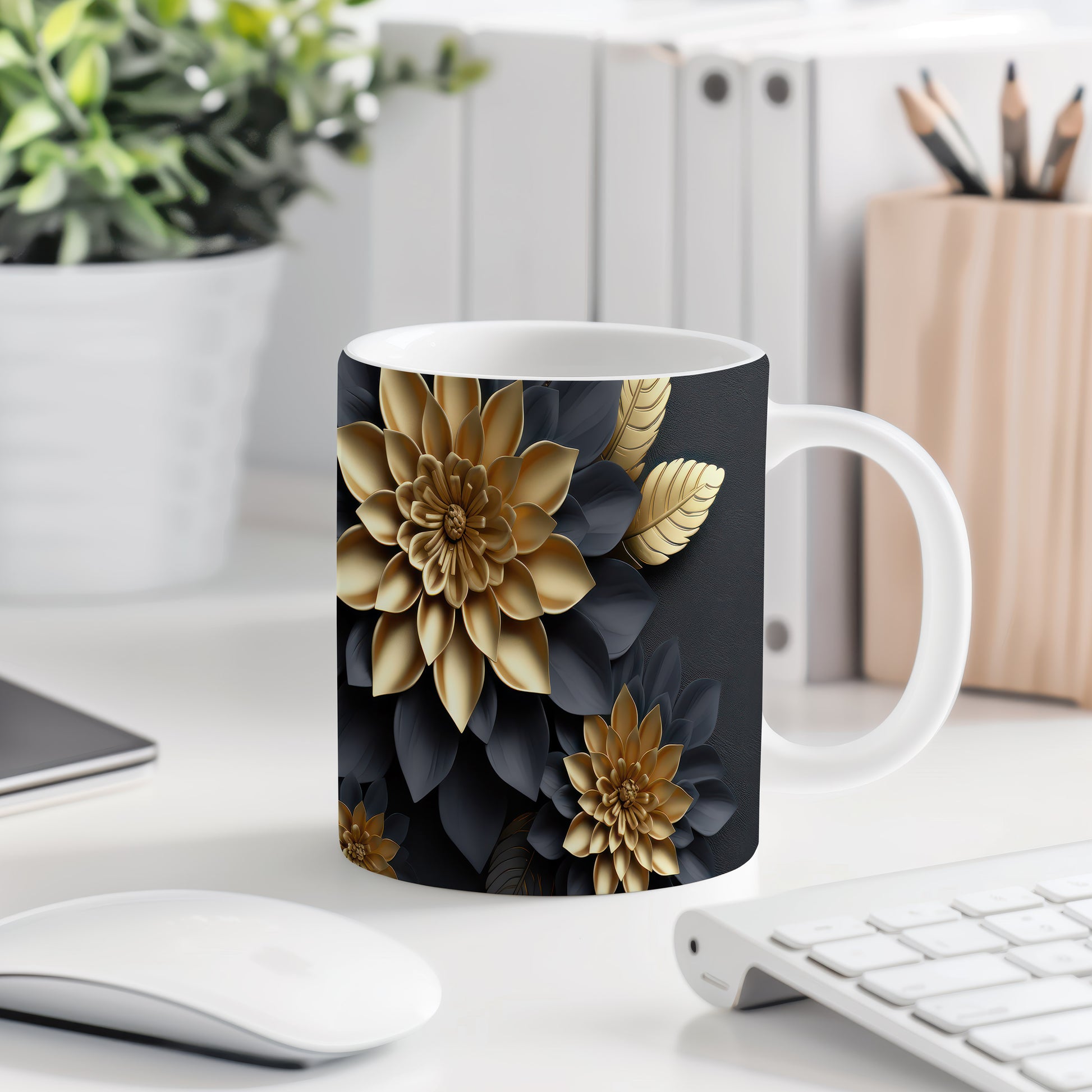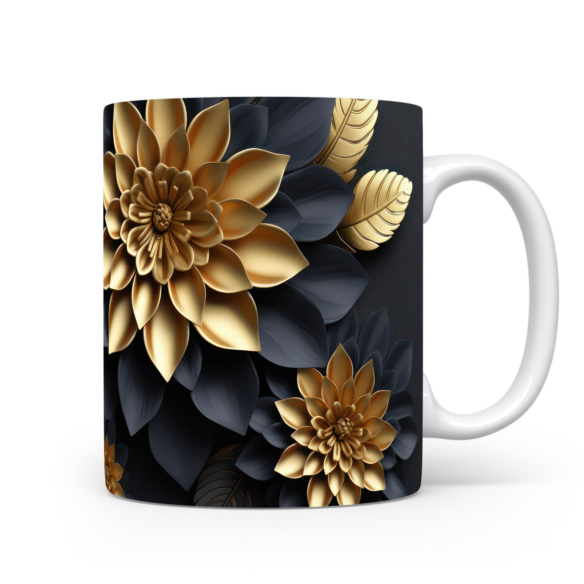 Hrnek s květinovým motivem v zlaté a černé barvě