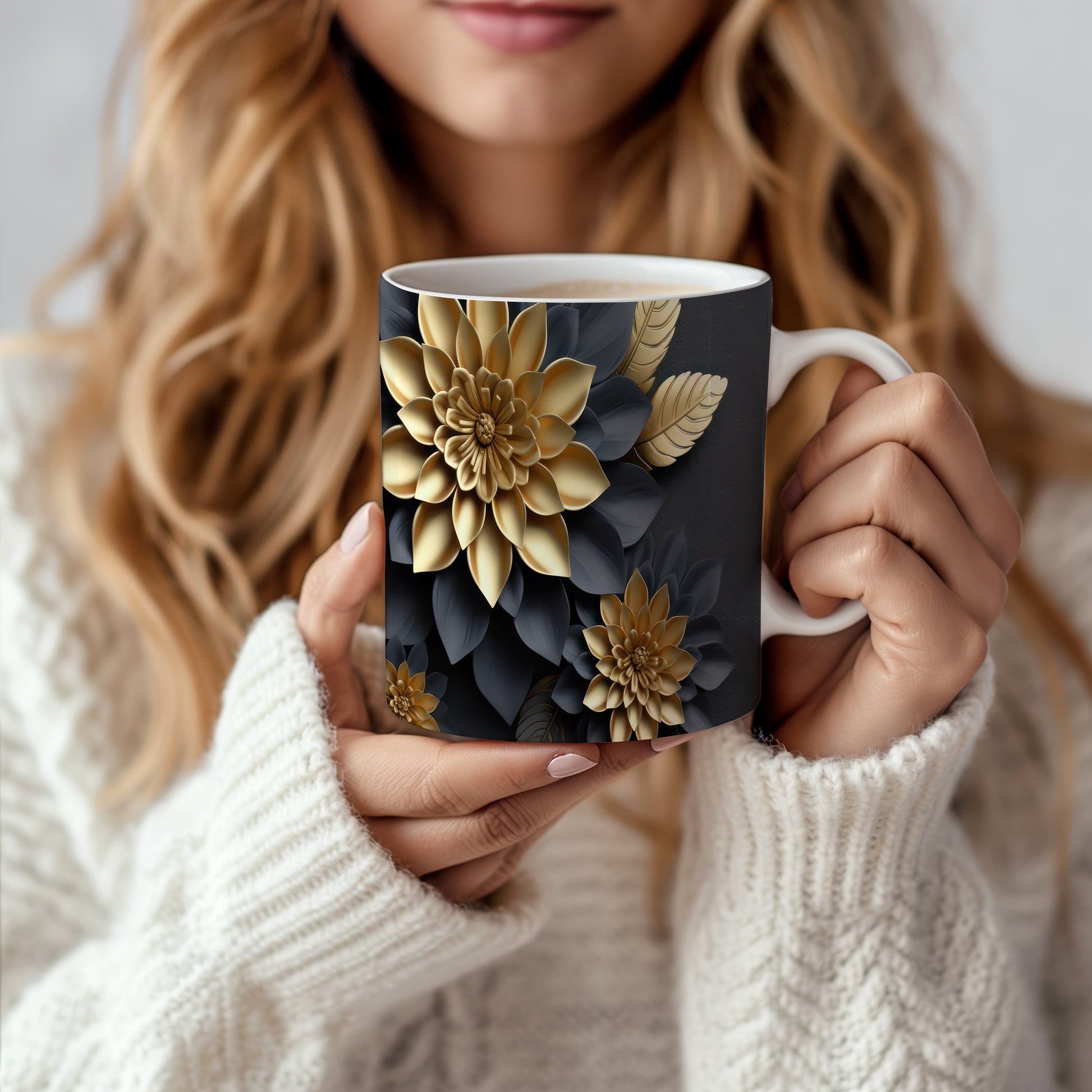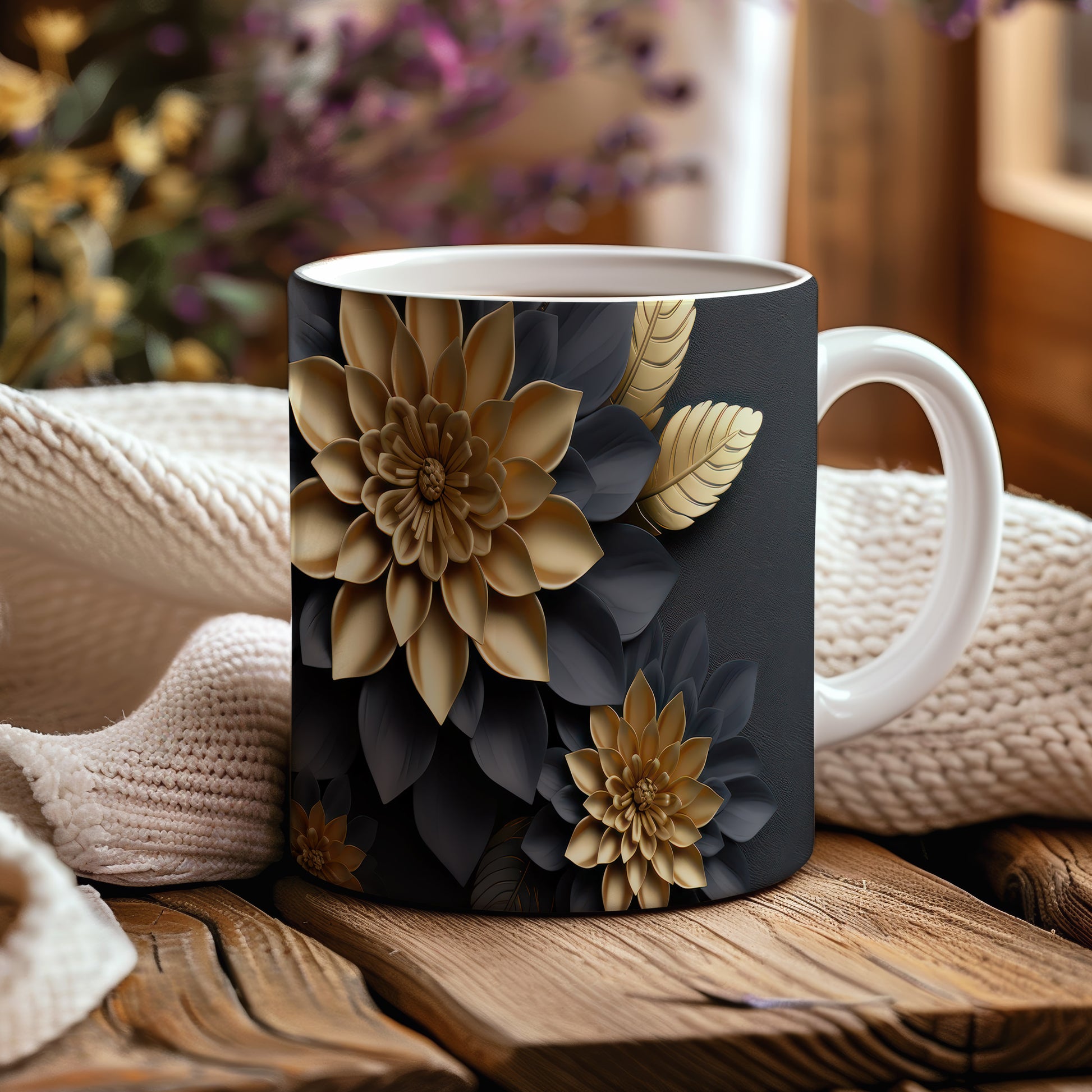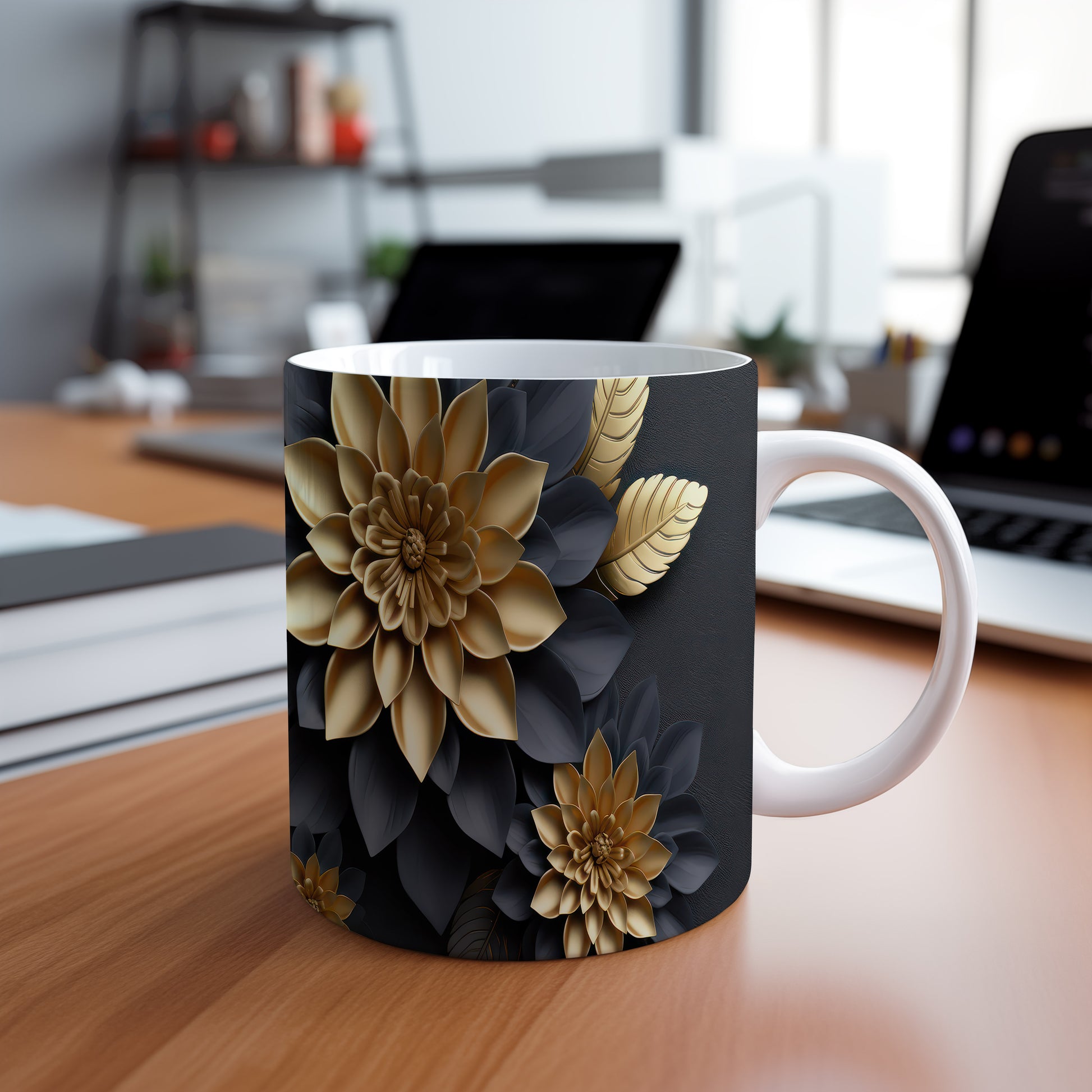 Hrnek s květinovým motivem v zlaté a černé barvě