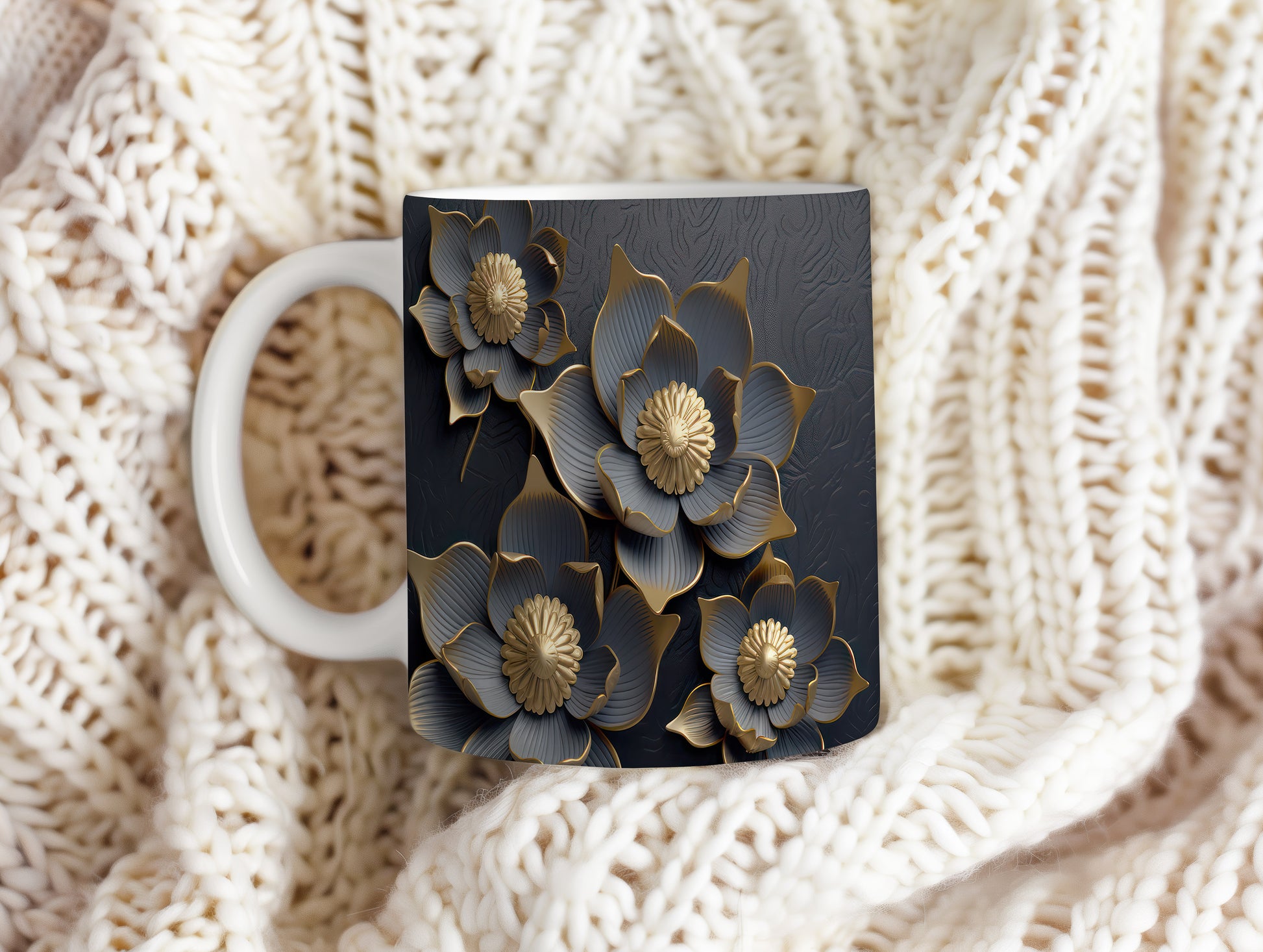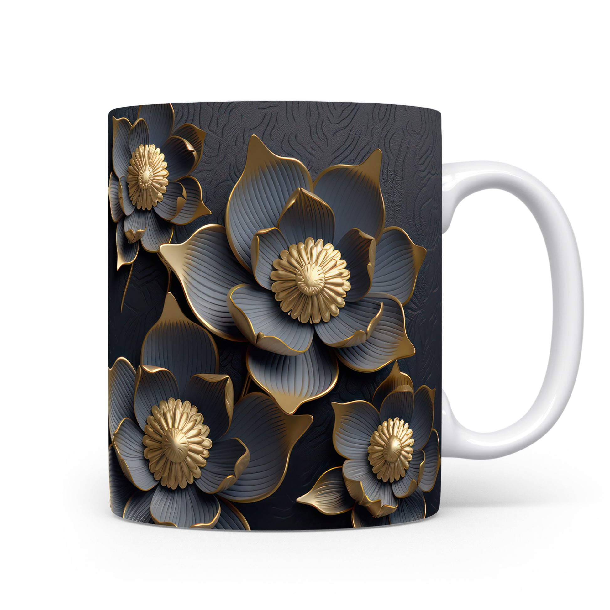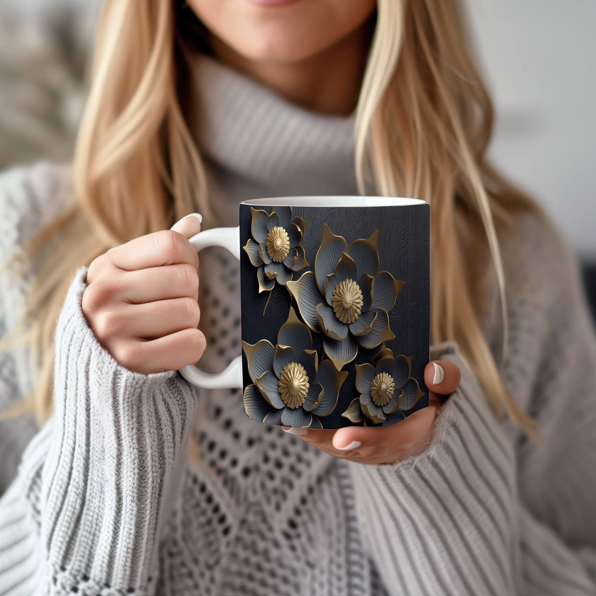 Hrnek s květinovým motivem v zlatých tónech – černým akcentem
