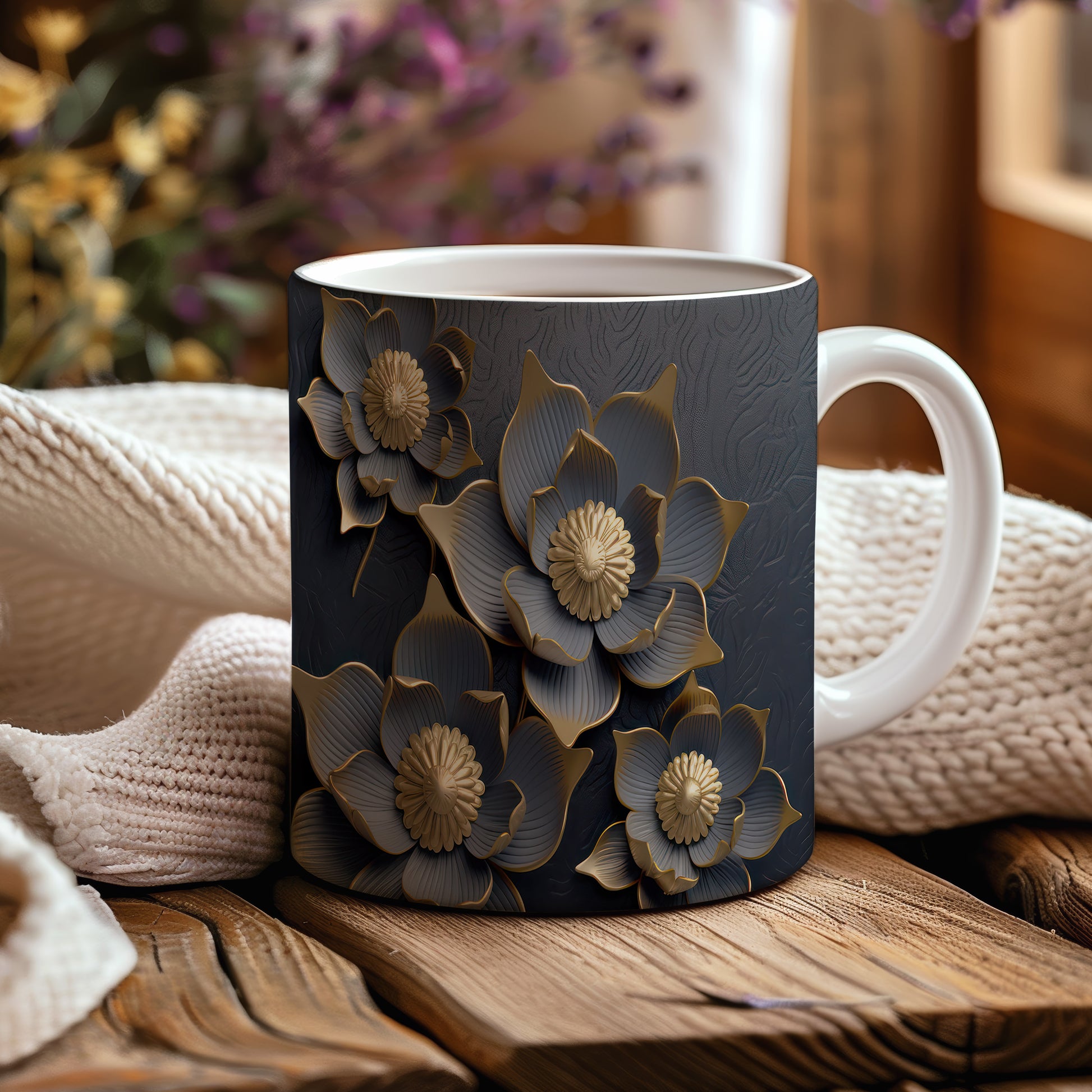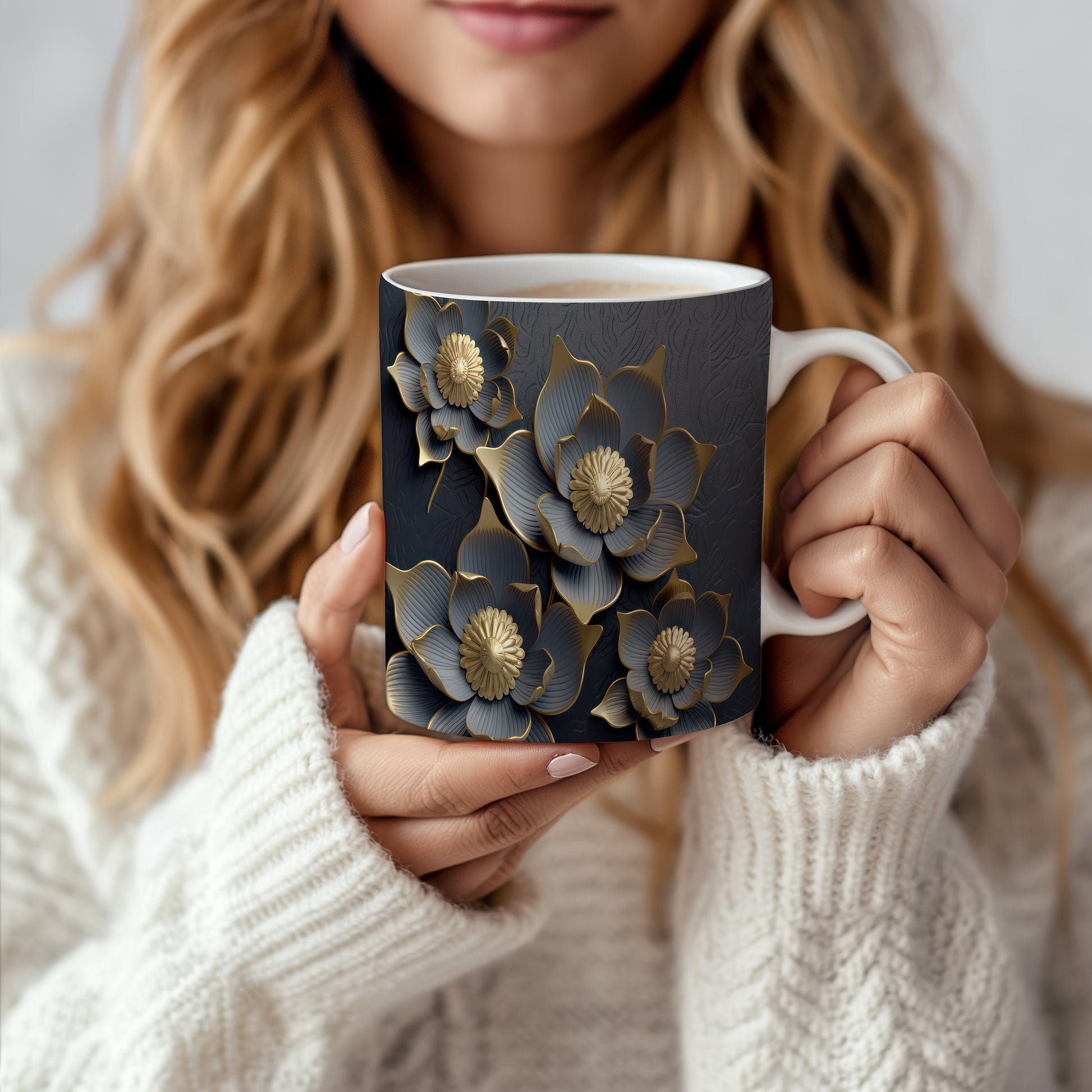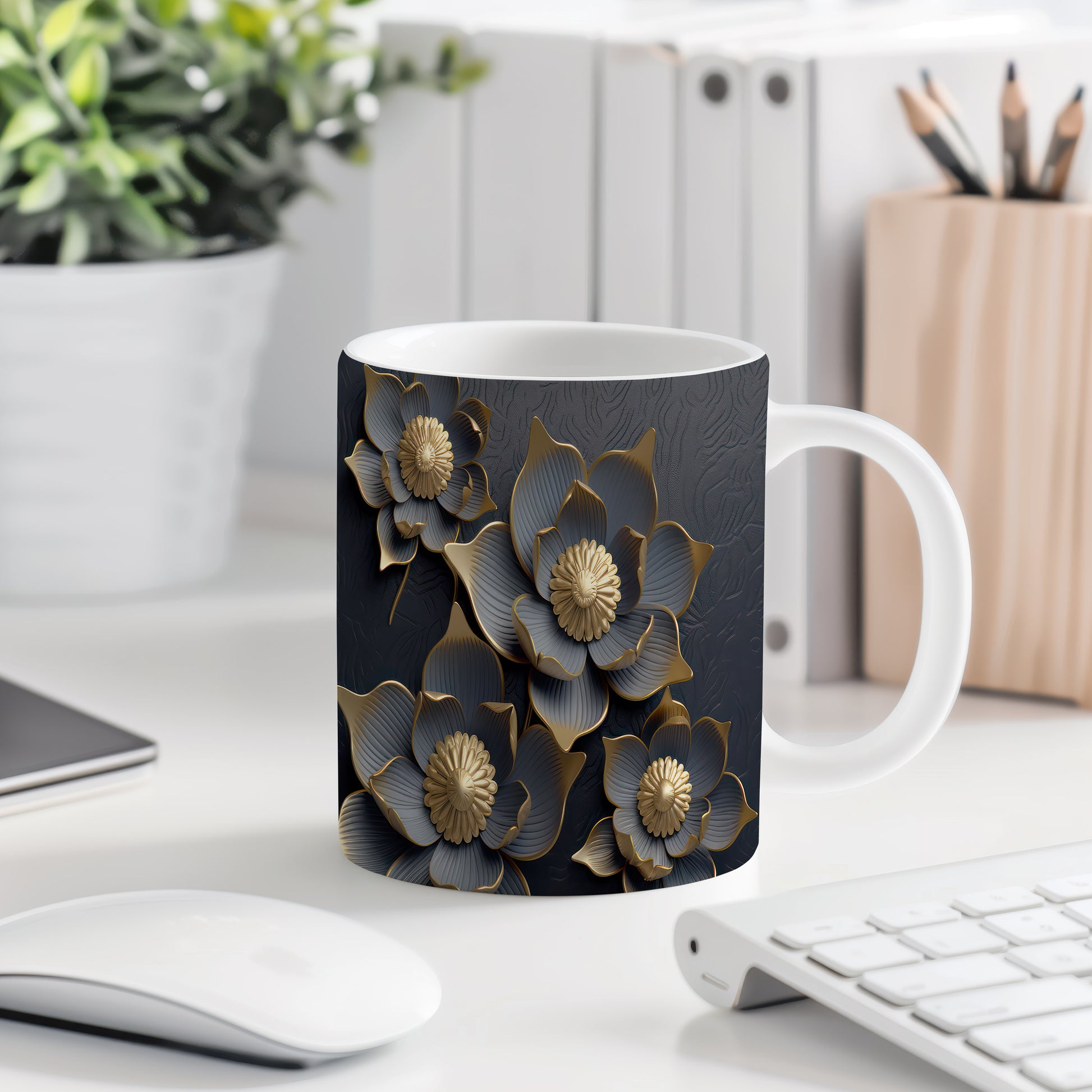 Hrnek s květinovým motivem v zlatých tónech – černým akcentem
