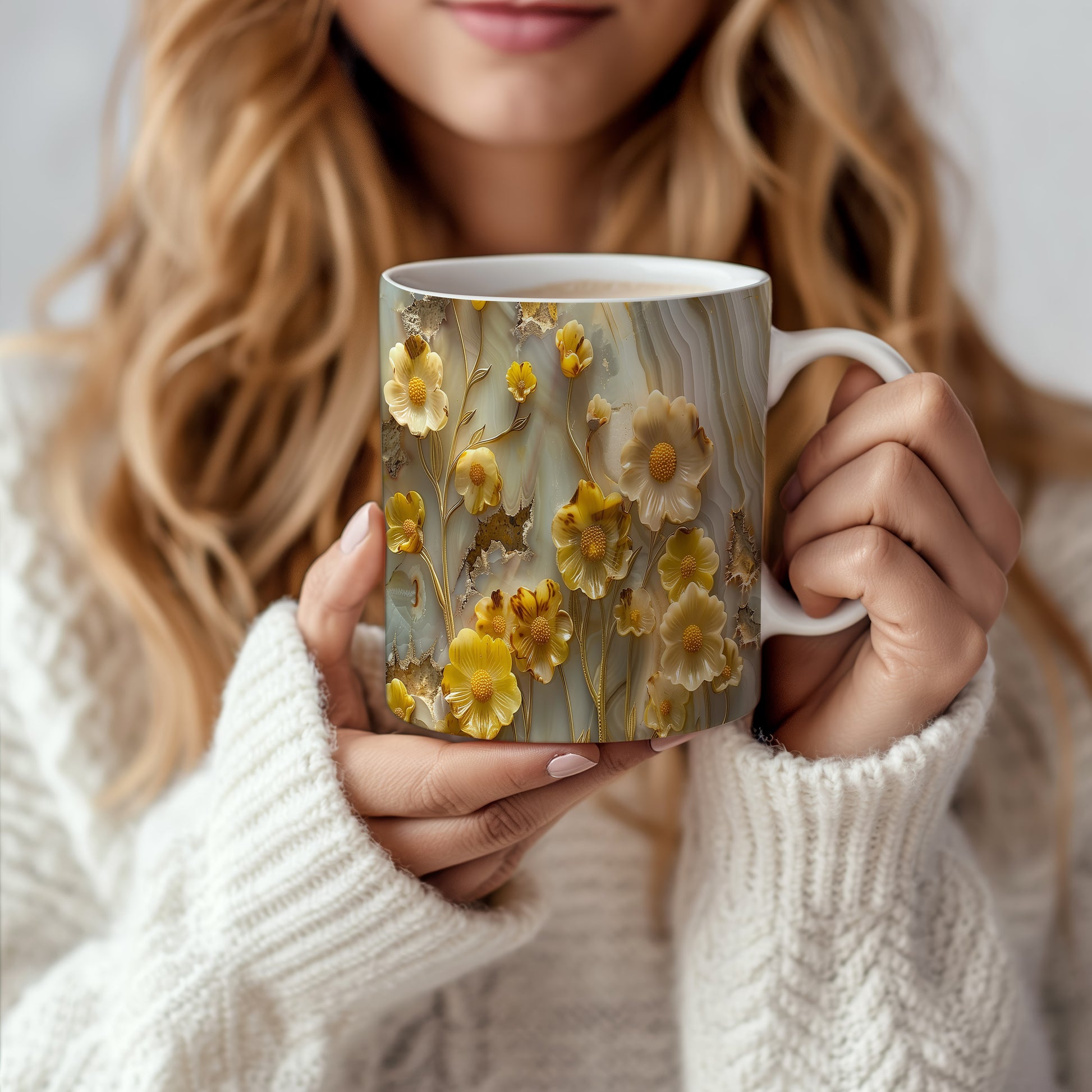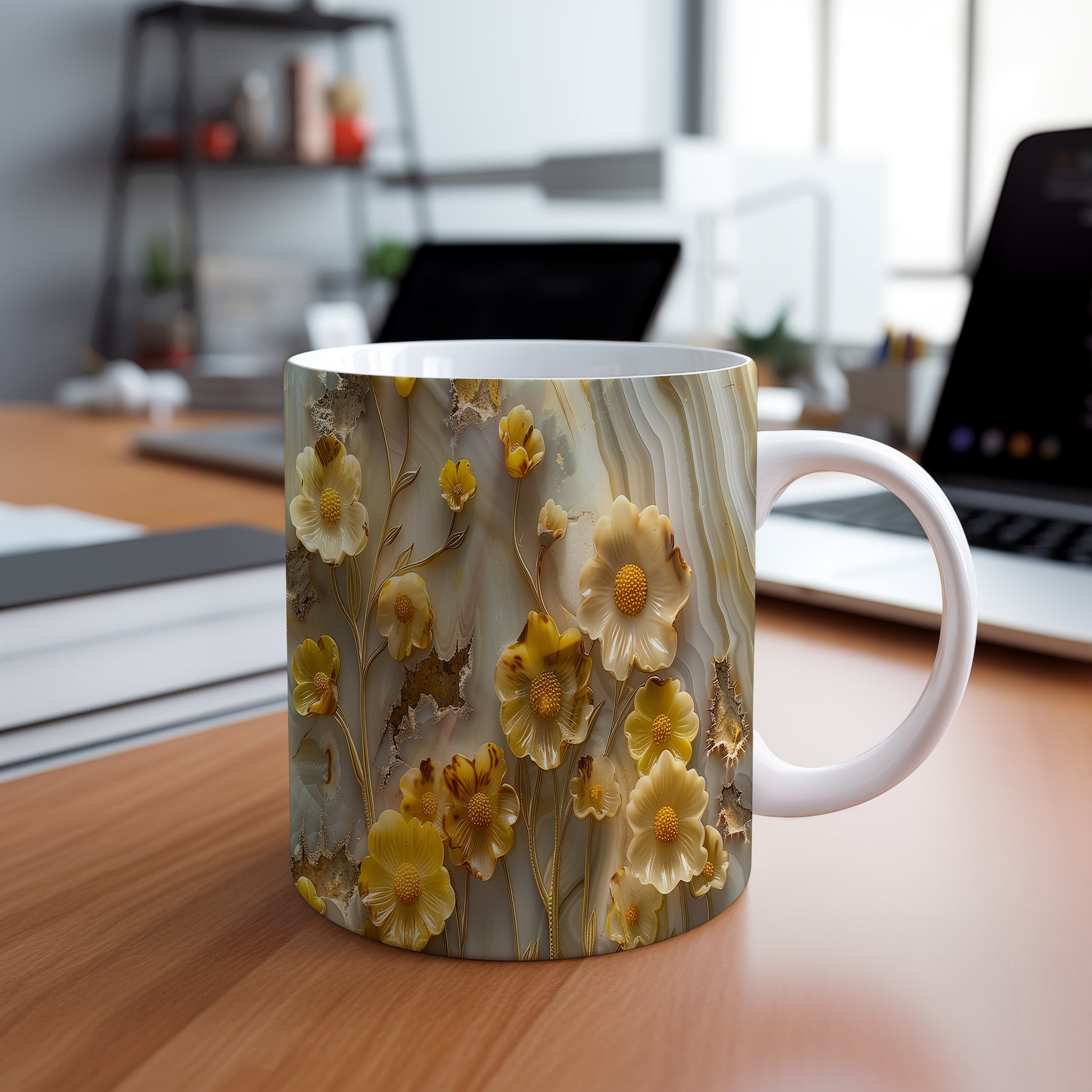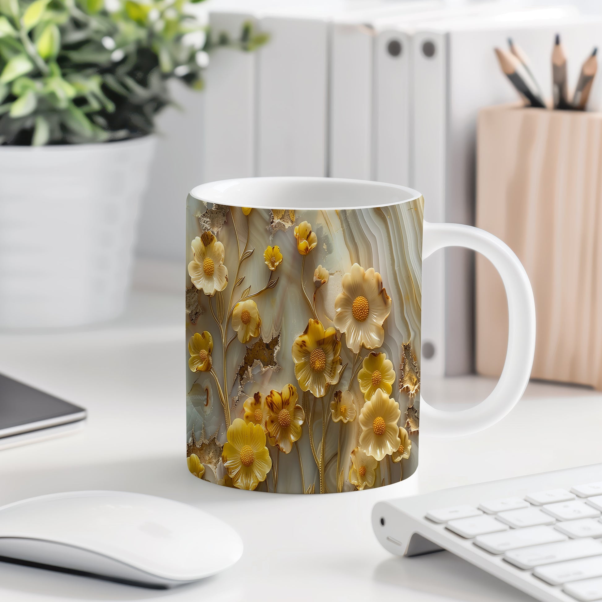 Hrnek s květinovým motivem v žlutých tónech – bílým provedením