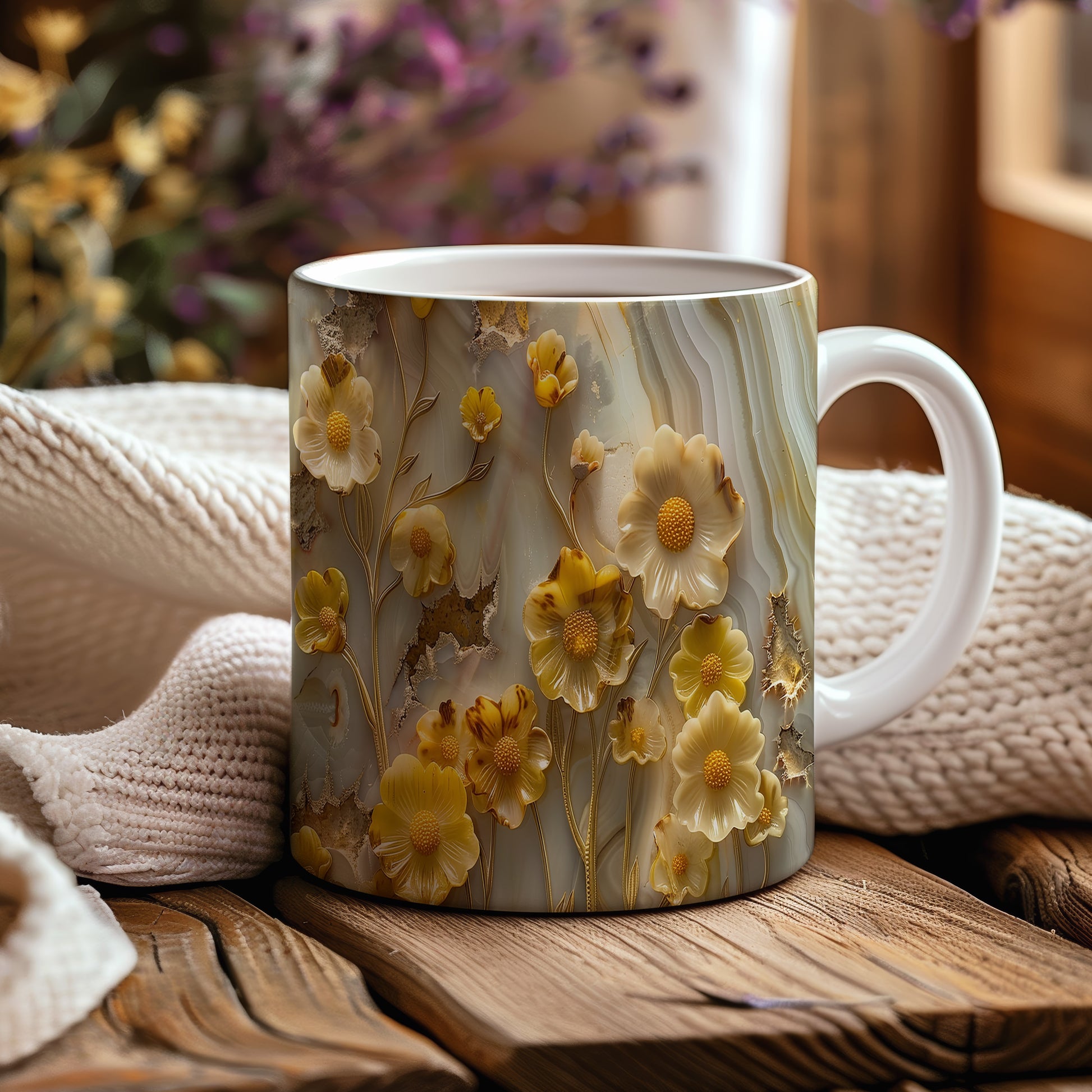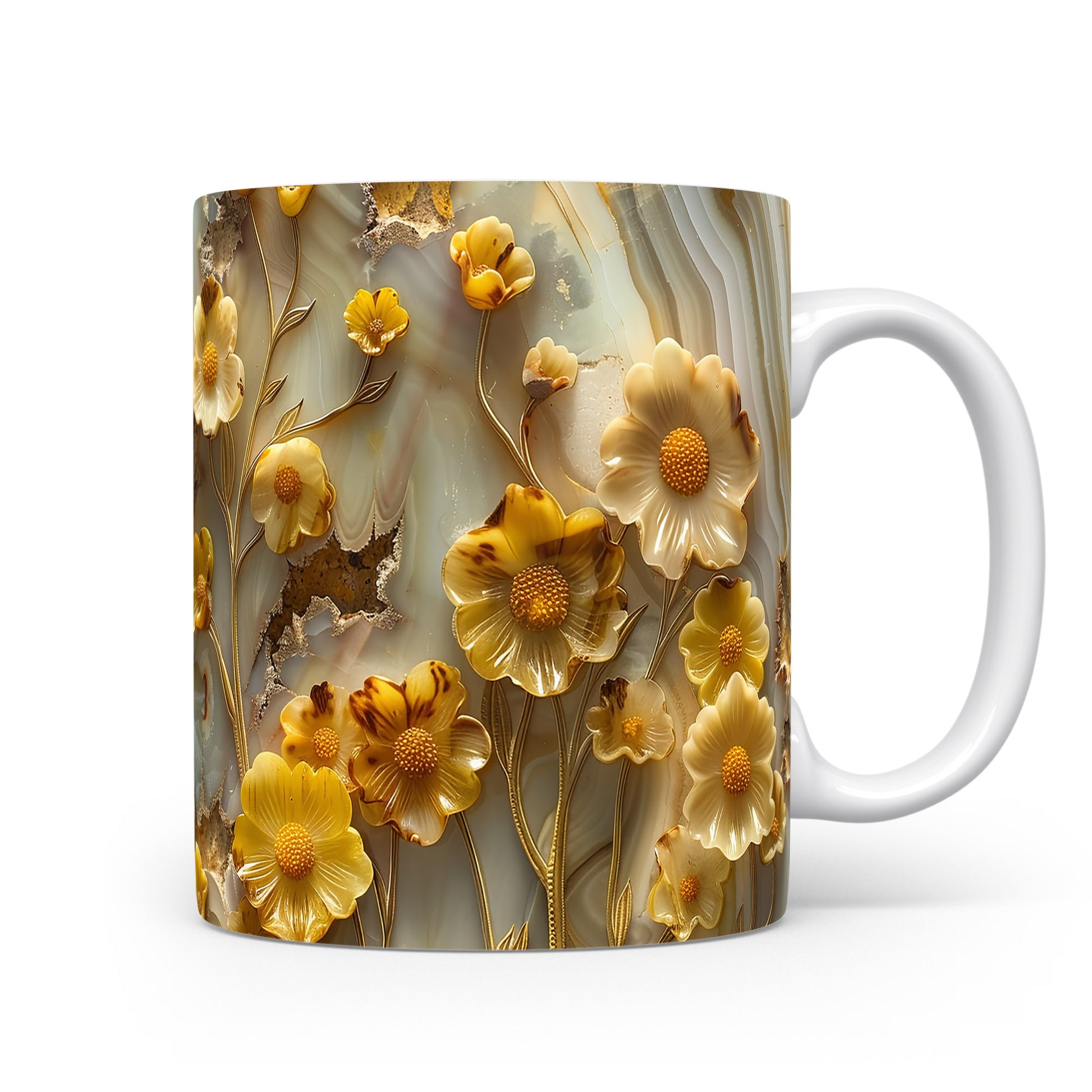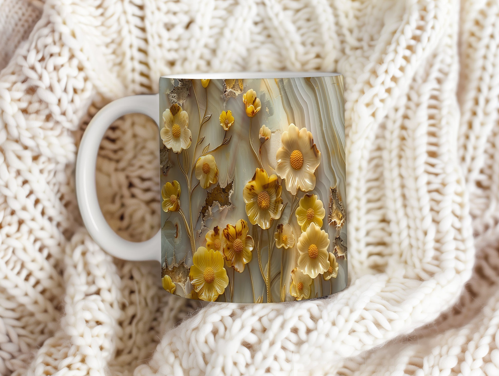 Hrnek s květinovým motivem v žlutých tónech – bílým provedením