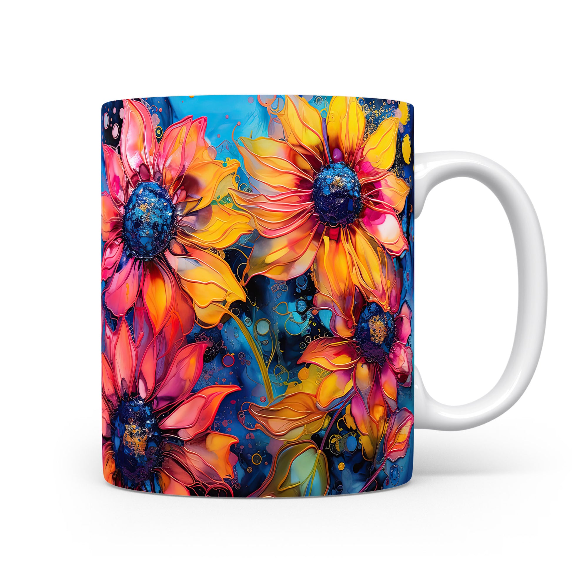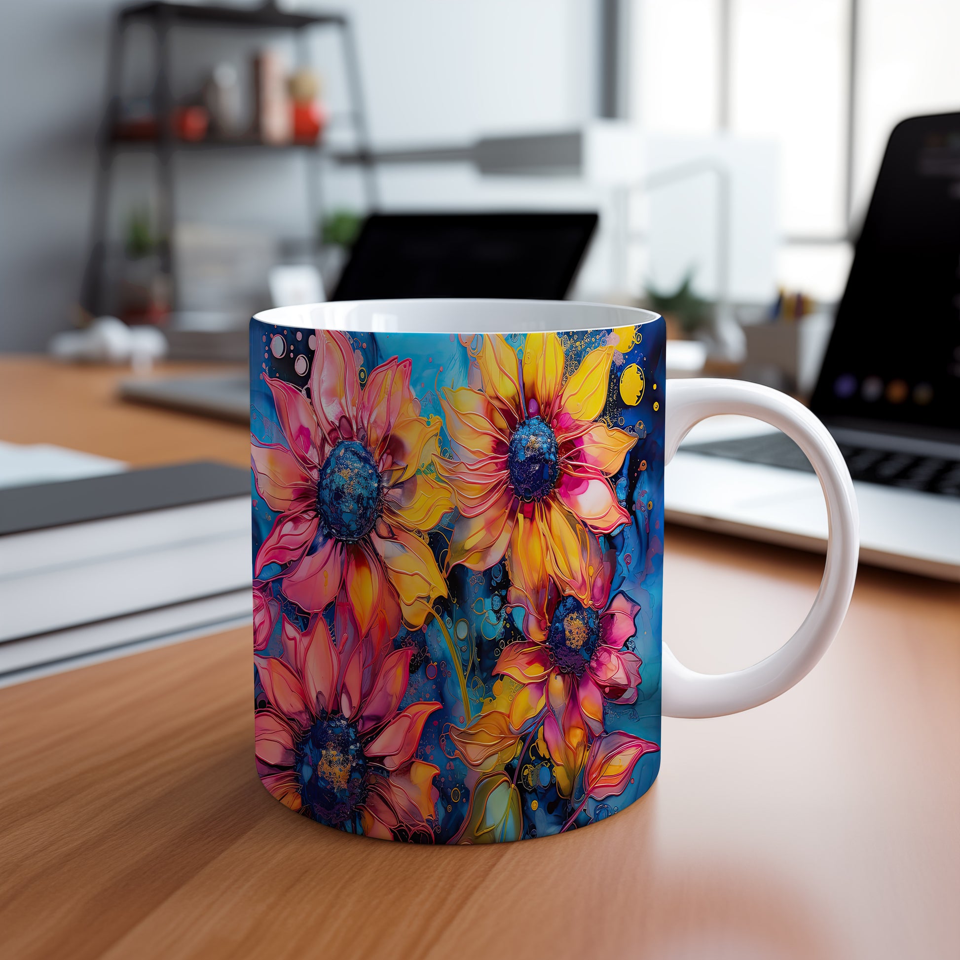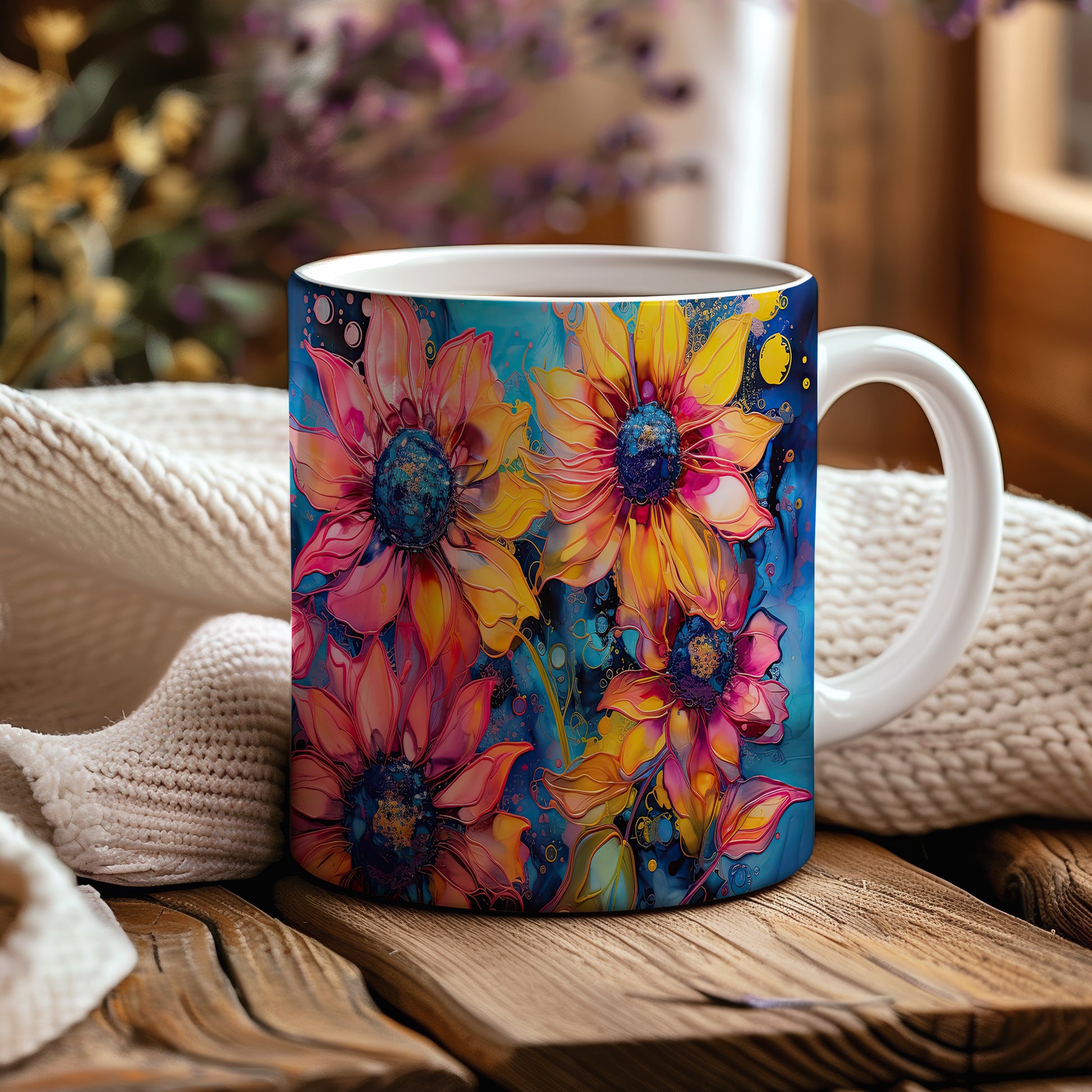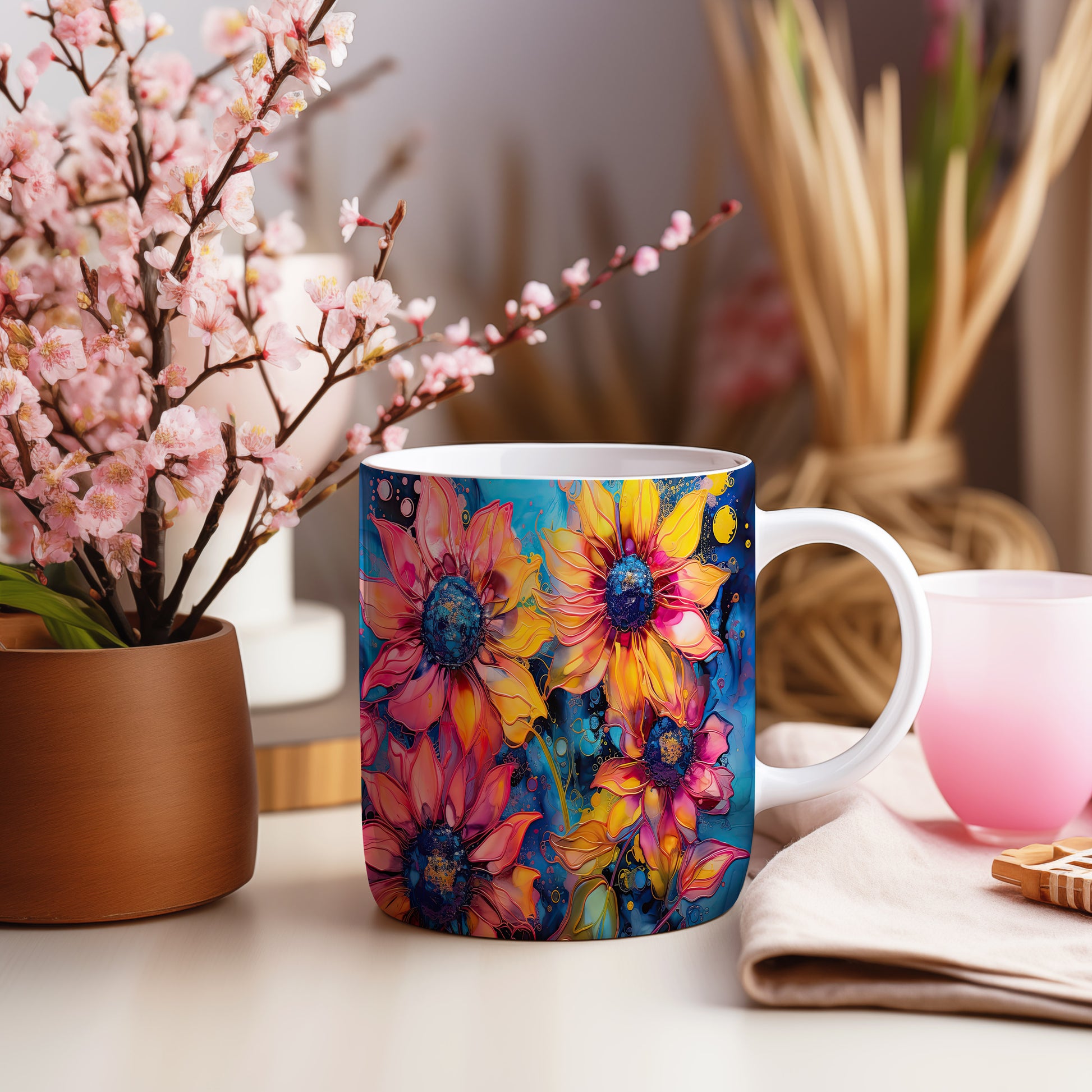 Hrnek s krásnými květinami v odstínech žluté a růžové na modrém pozadí. Tento stylový hrnek je ideální pro milovníky přírody a skvělým dárkem pro přátele nebo rodinu. Materiál: keramika. Objem: 330 ml. Vhodné do myčky i mikrovlnky. Užívejte si svůj oblíbený nápoj s radostí a veselejším stylem.