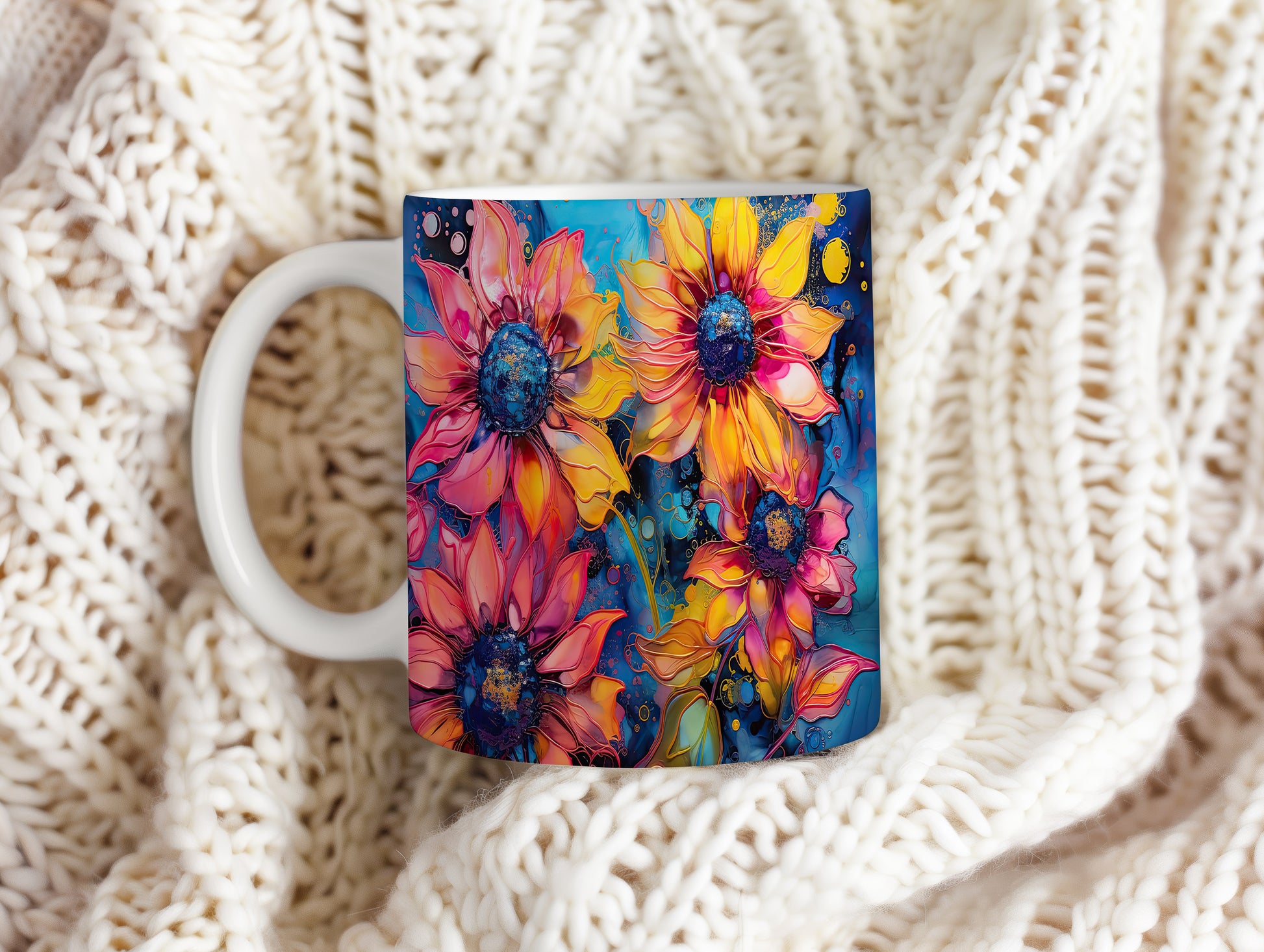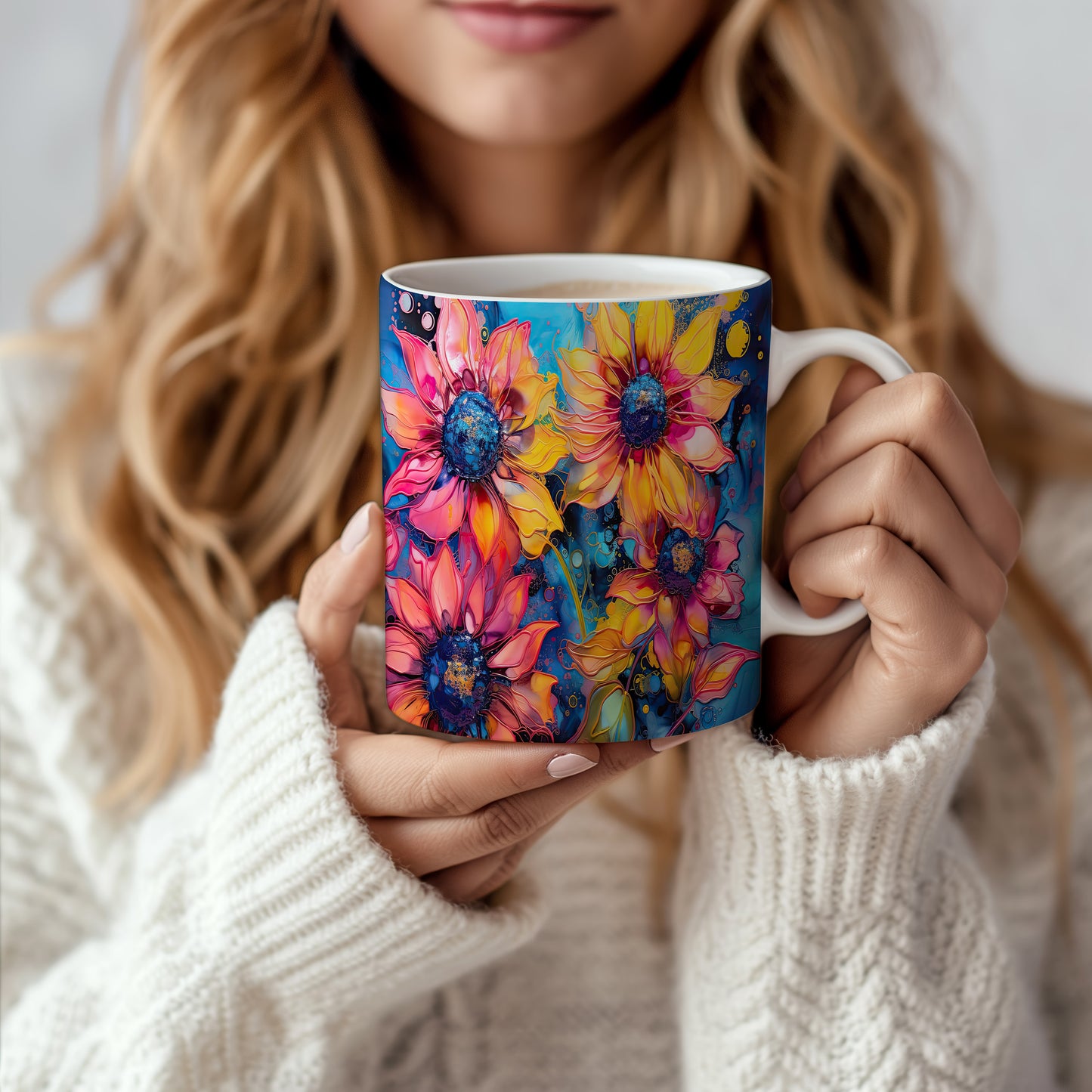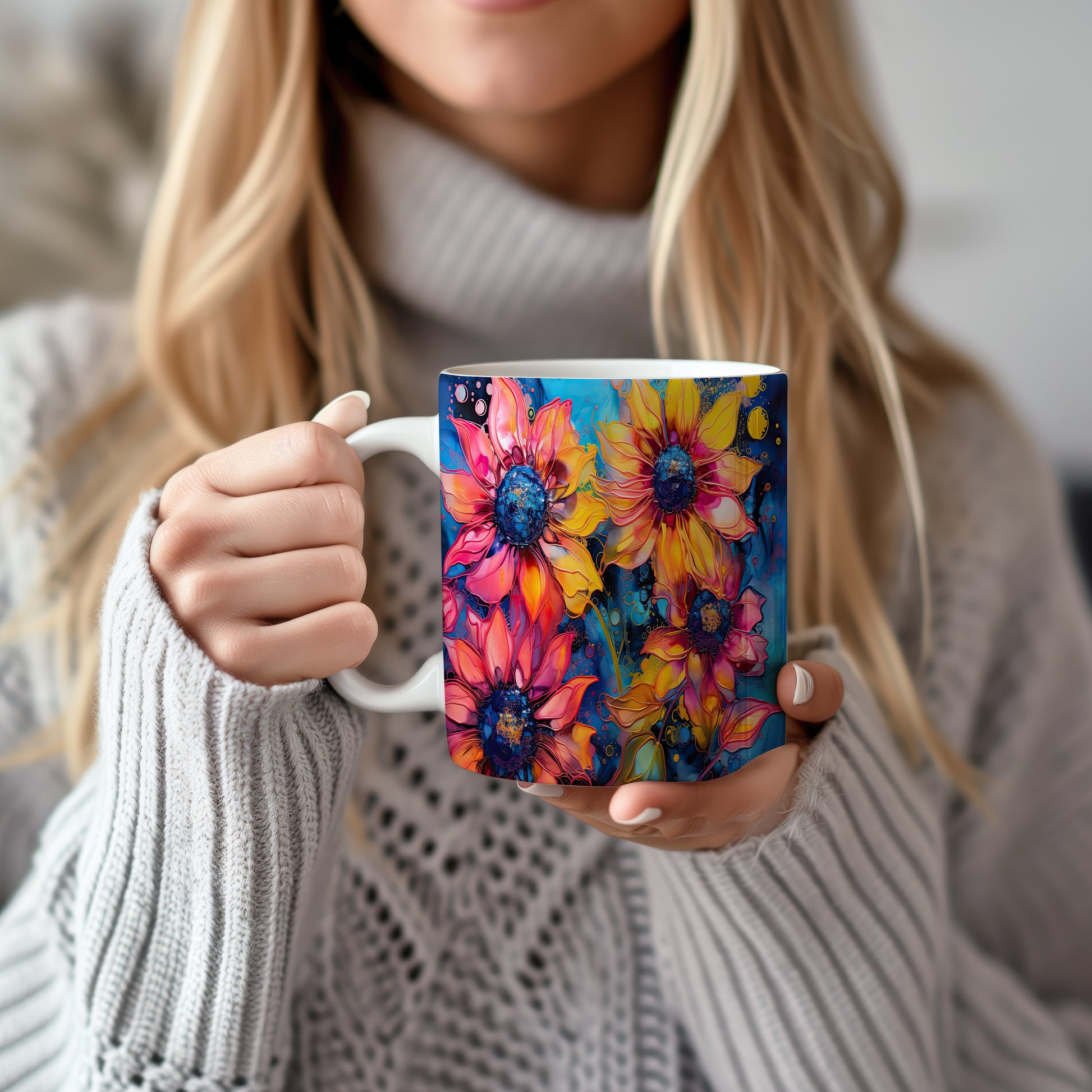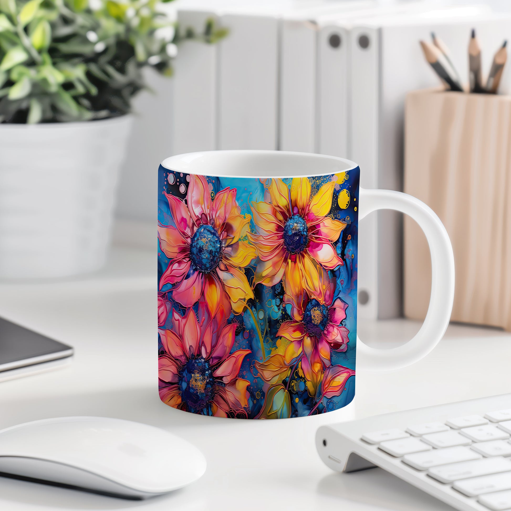 Hrnek s krásnými květinami v odstínech žluté a růžové na modrém pozadí. Tento stylový hrnek je ideální pro milovníky přírody a skvělým dárkem pro přátele nebo rodinu. Materiál: keramika. Objem: 330 ml. Vhodné do myčky i mikrovlnky. Užívejte si svůj oblíbený nápoj s radostí a veselejším stylem.