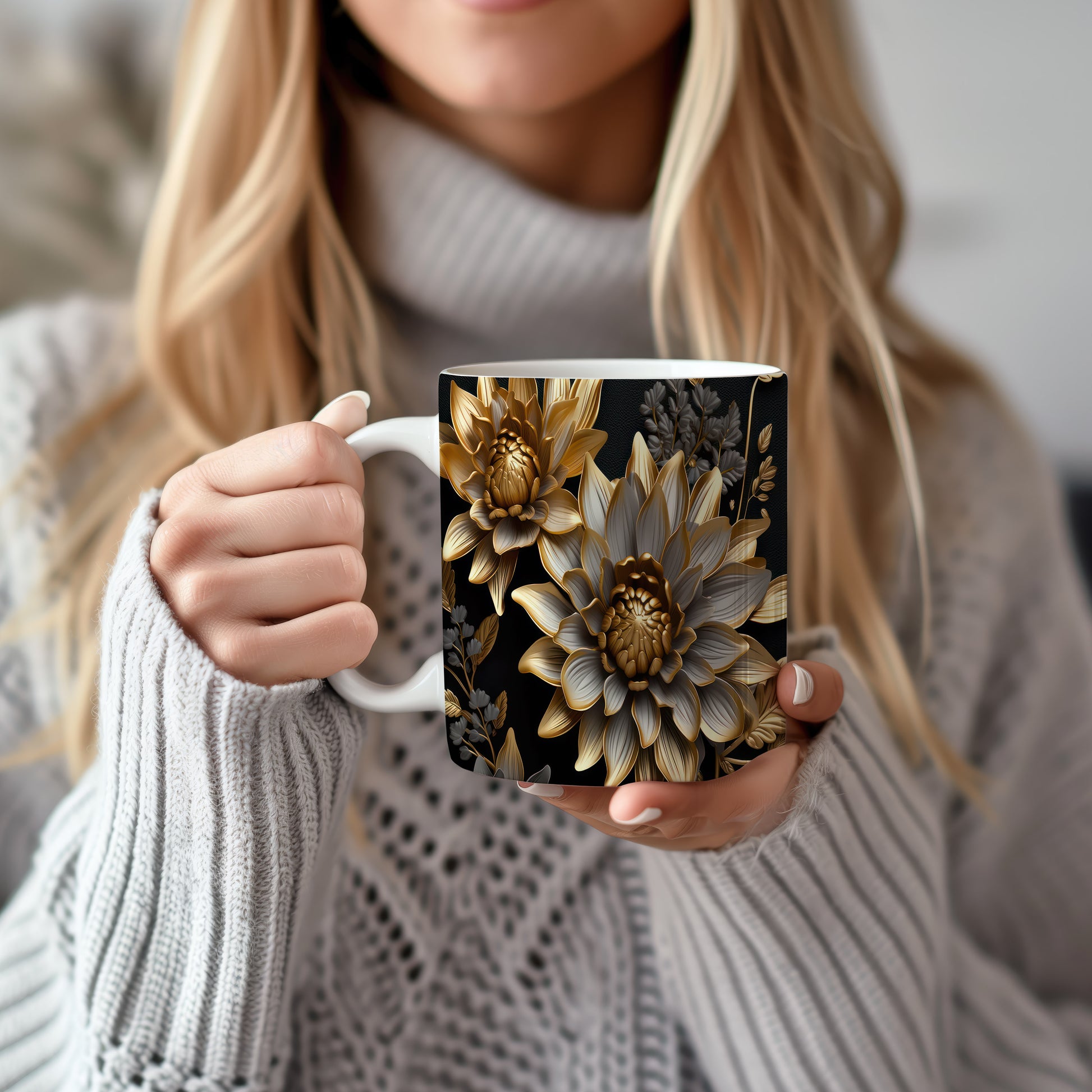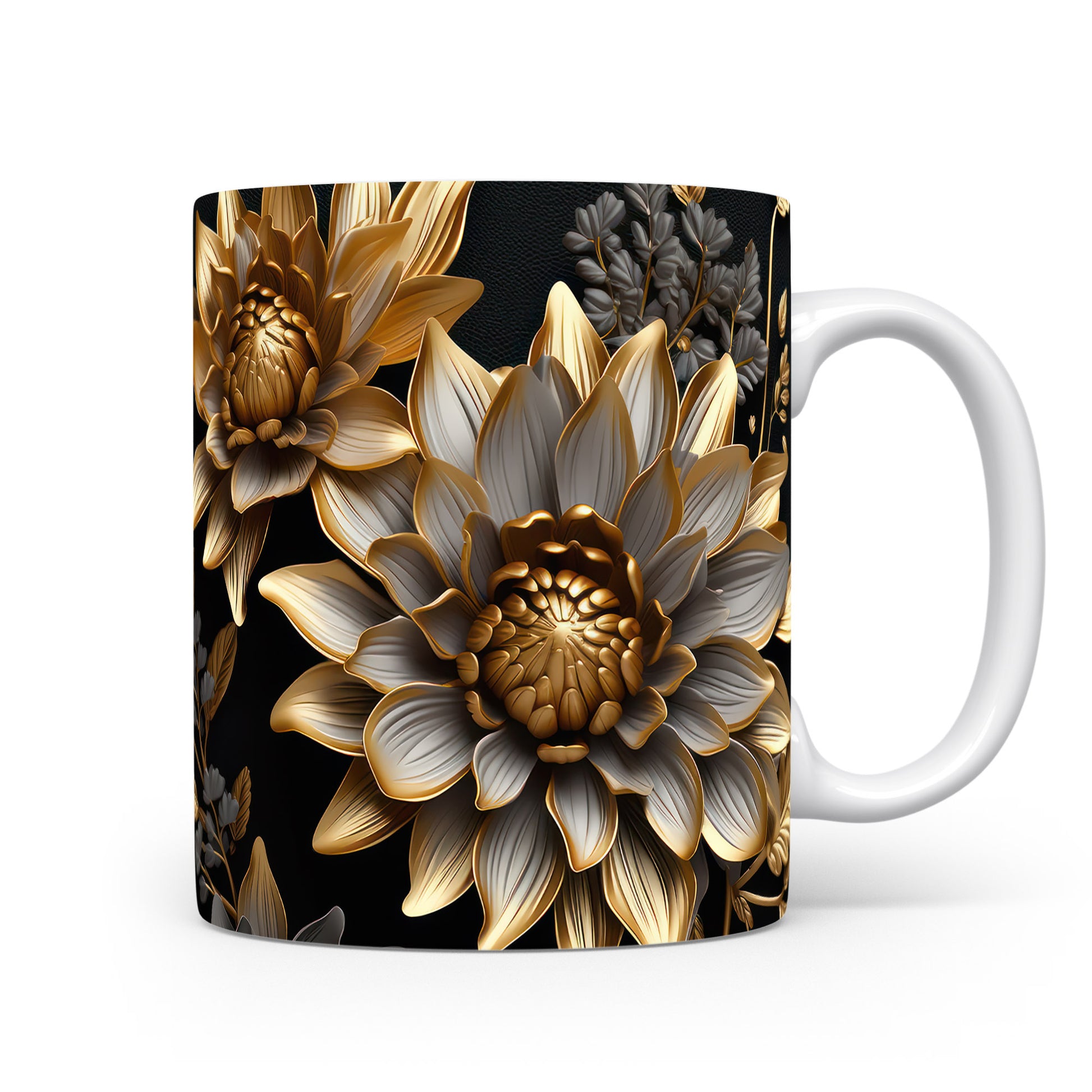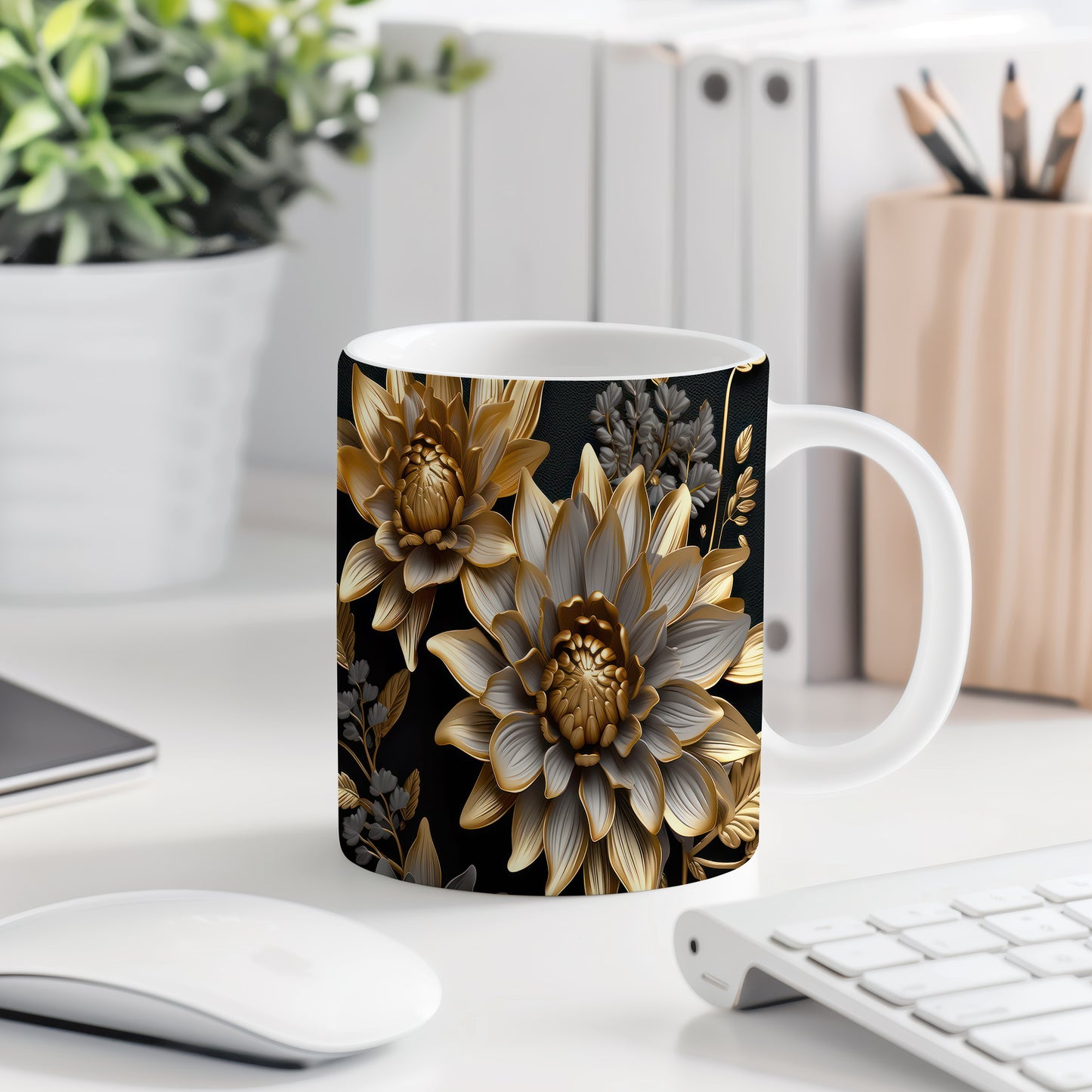 Stylový hrnek s květinovým motivem v zlatých a bílých odstínech. Tento elegantní kousek je ideální pro milovníky čaje a kávy, skvěle se hodí jako dárek pro přátele nebo rodinu. Materiál: keramika. Objem: 330 ml. Vhodné do myčky i mikrovlnky. Užívejte si každé sousto s tímto krásným hrnkem, který dodá vašemu pití šmrnc.