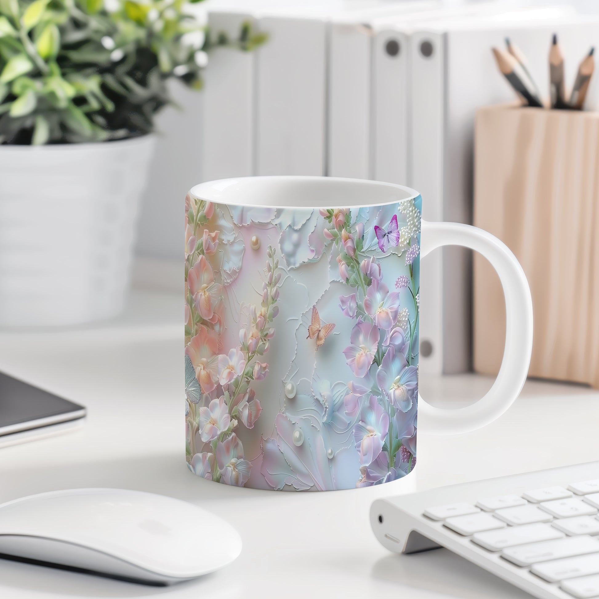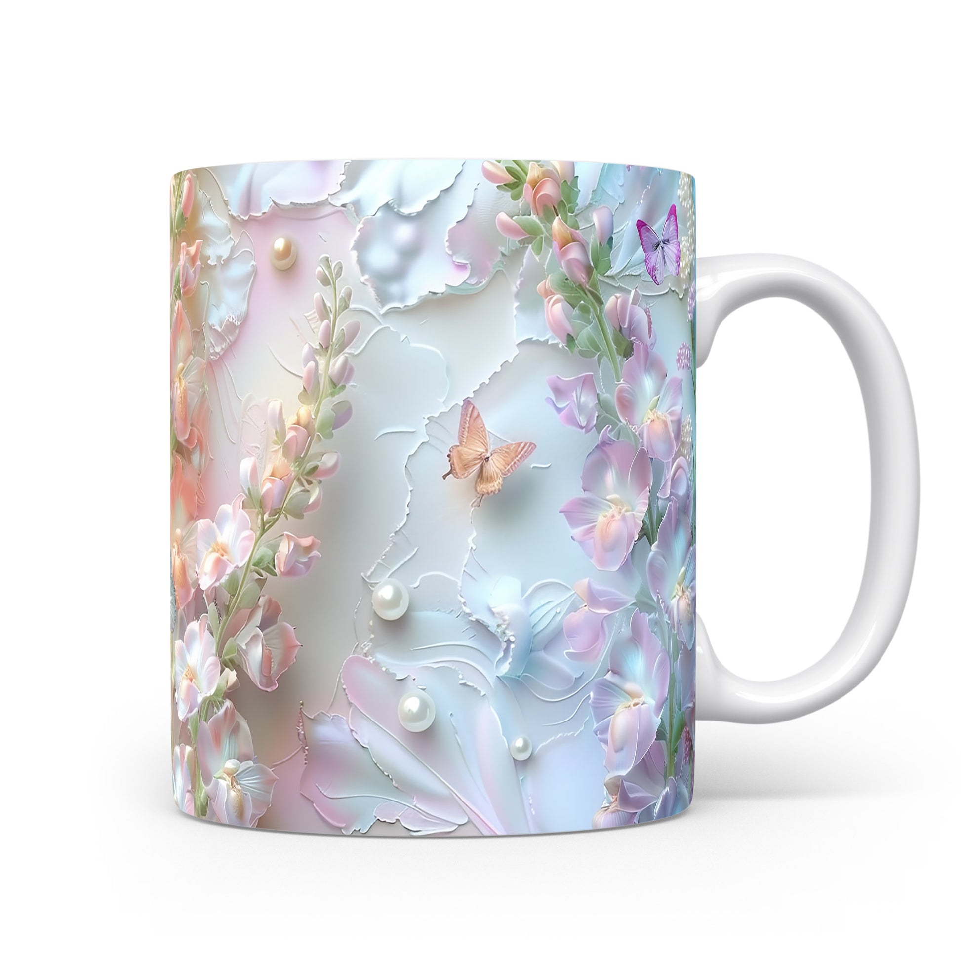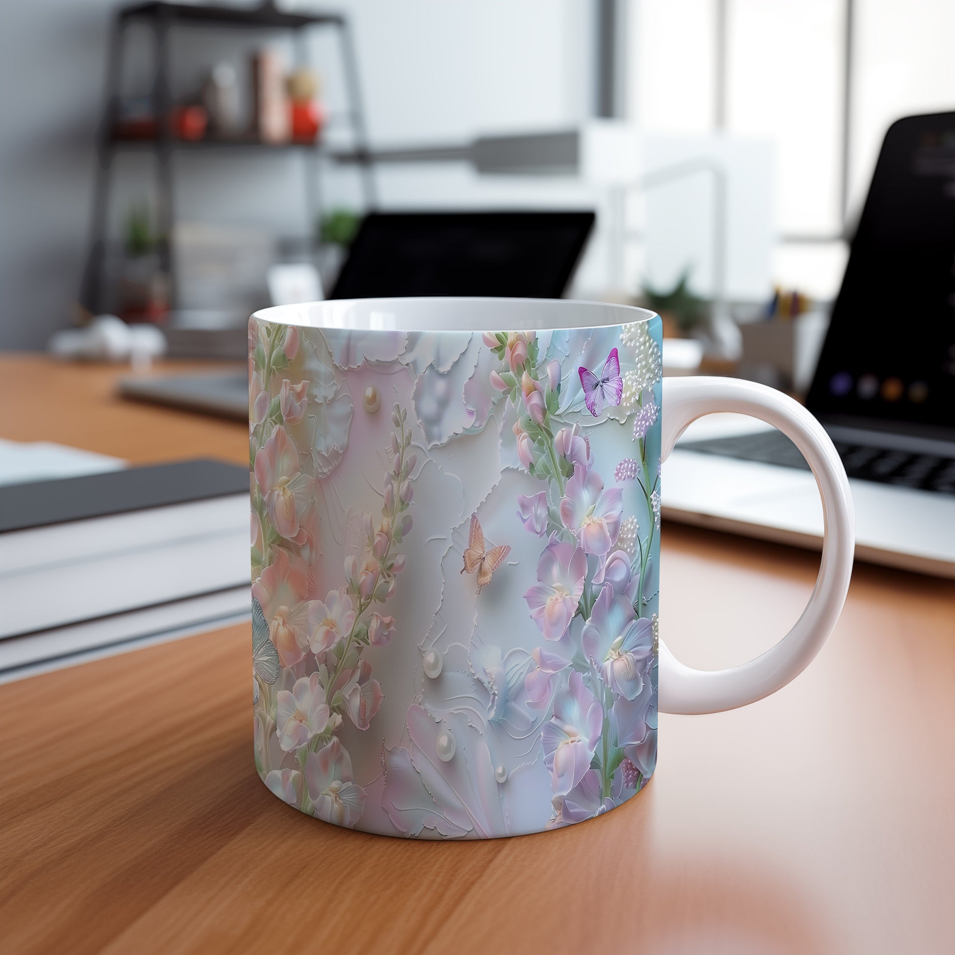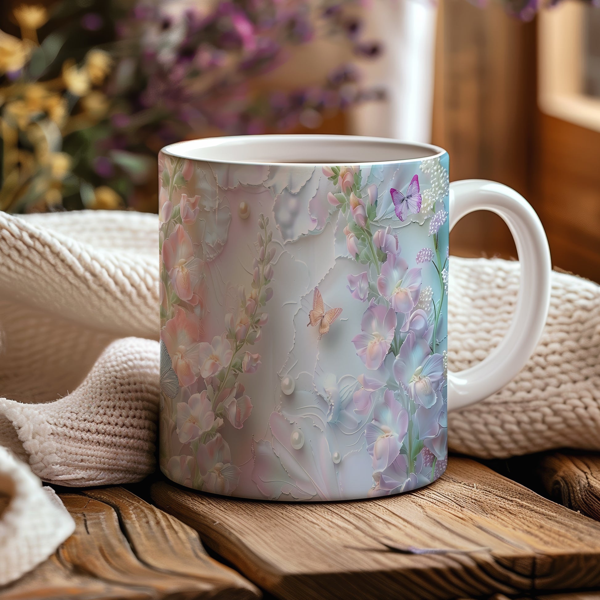 Elegantní hrnek s květinovým vzorem a motýly v jemných pastelových barvách. Tento stylový kousek je ideální pro každodenní používání a skvělým dárkem pro milovníky přírody. Materiál: keramika. Objem: 330 ml. Vhodné do myčky i mikrovlnky. Díky svému designu přináší do vašeho domova příjemnou atmosféru.