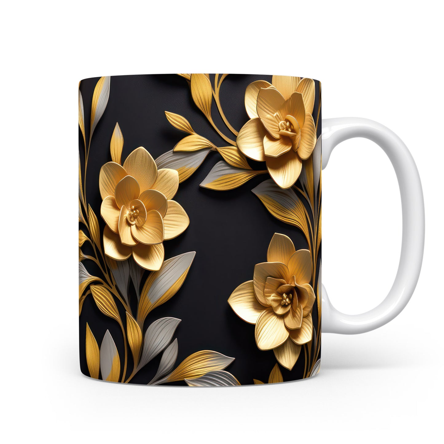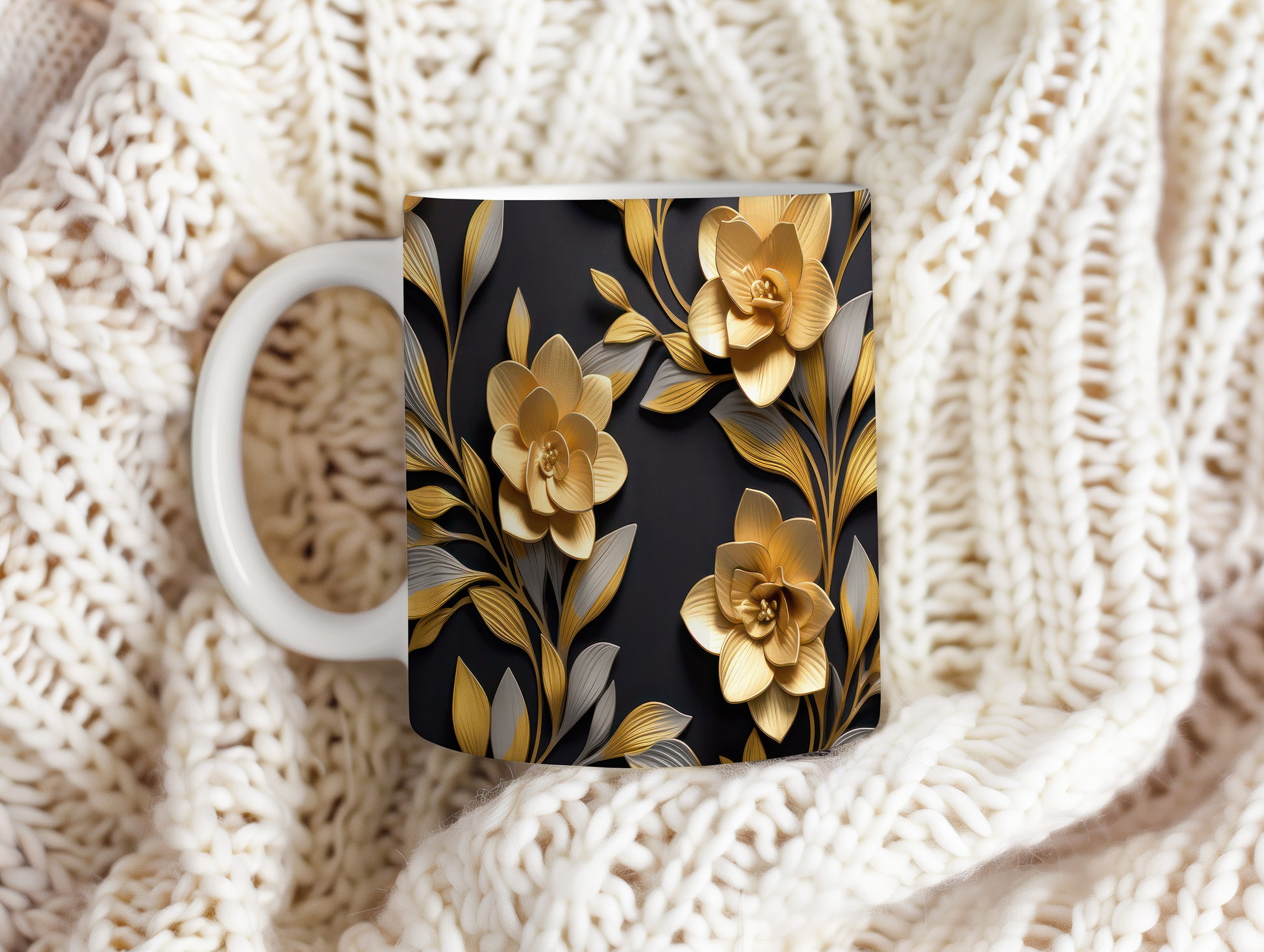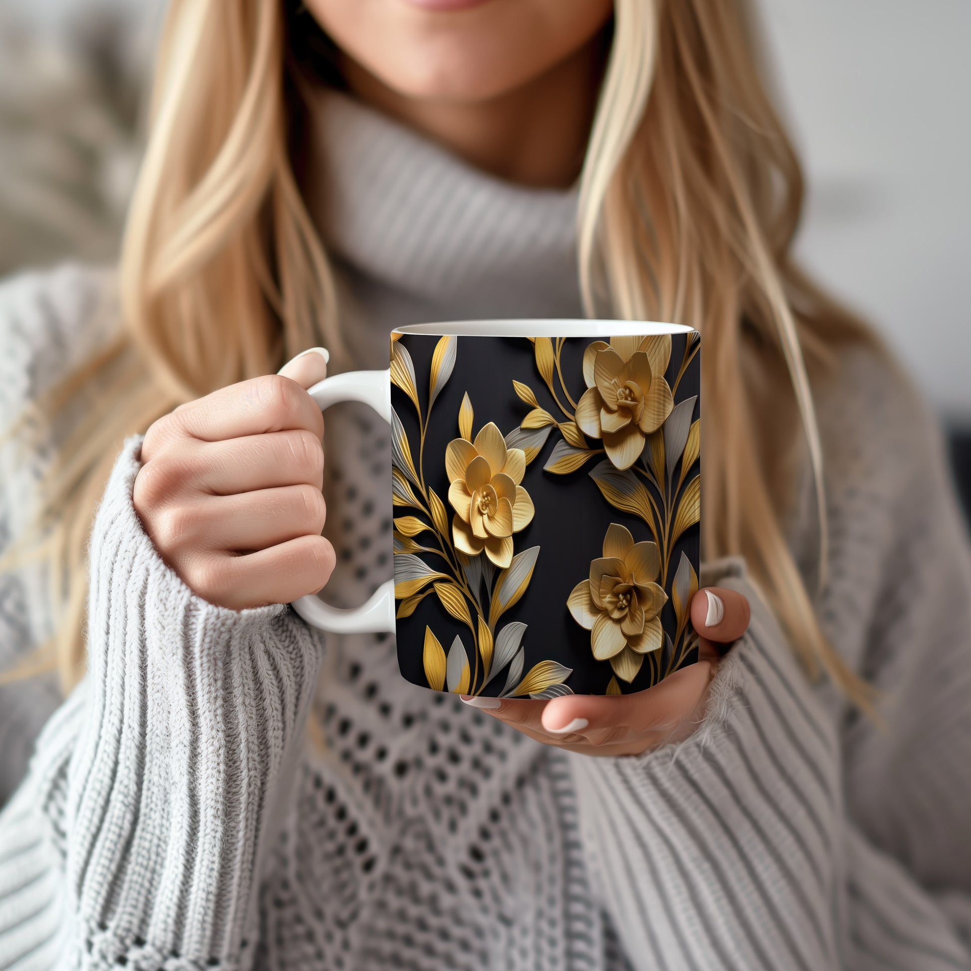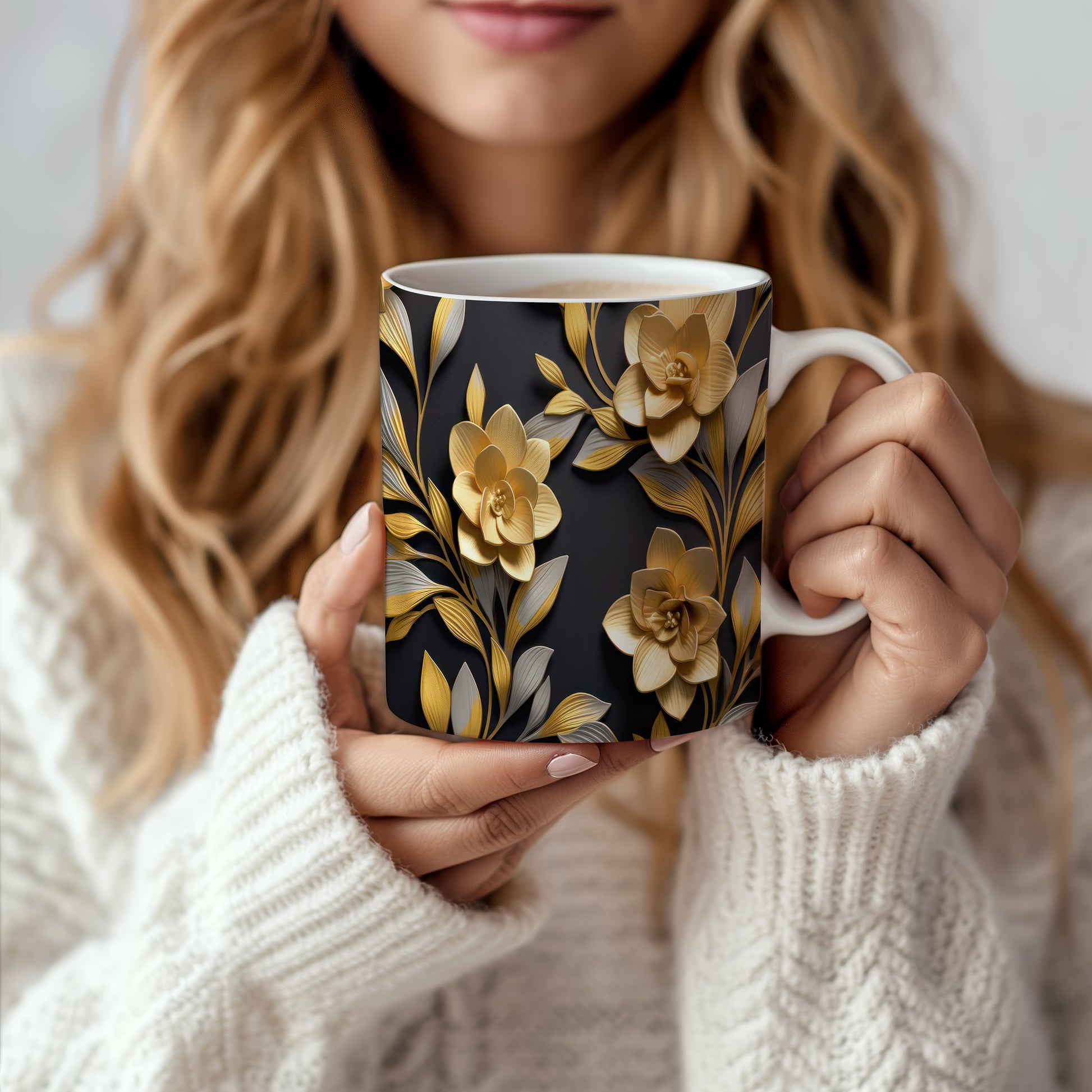 Hrnek s květinovým vzorem v černé a zlaté – černým akcentem