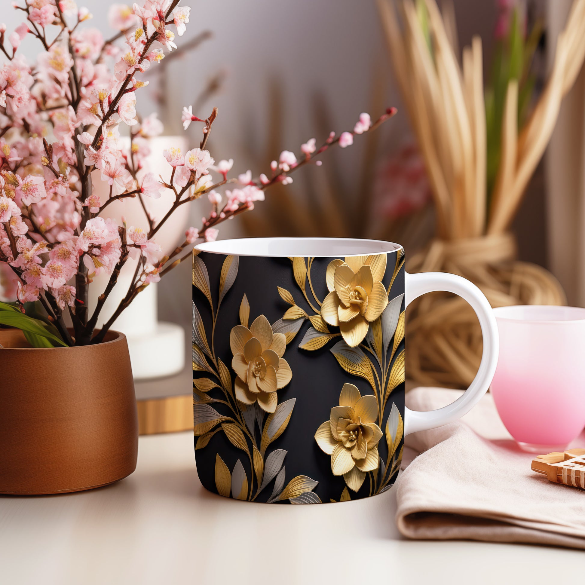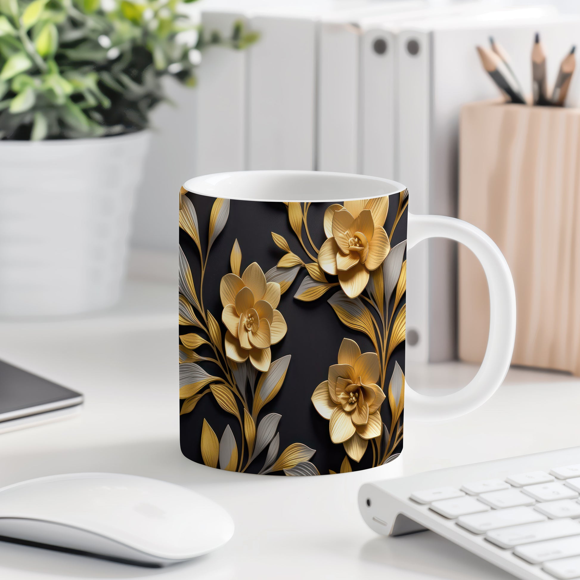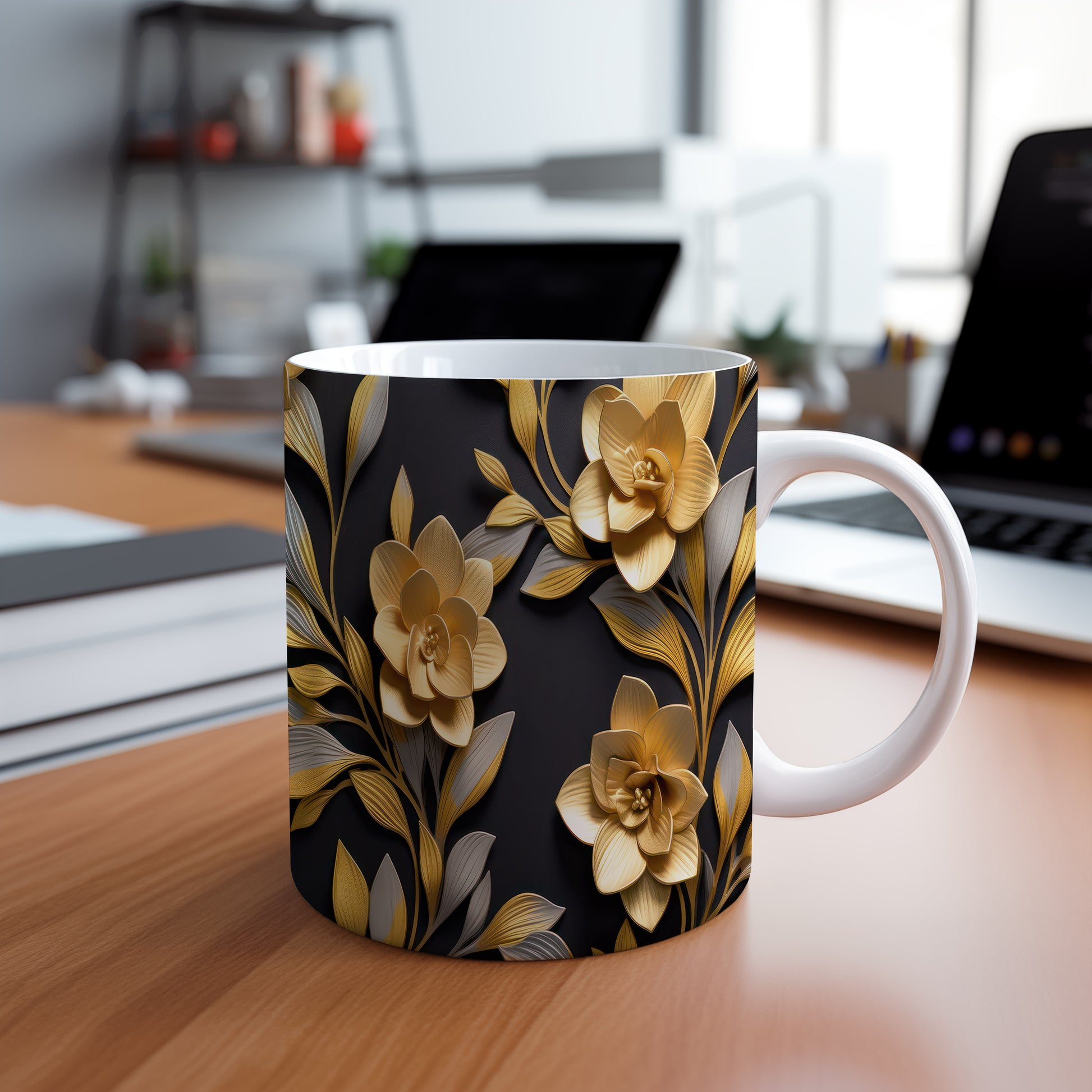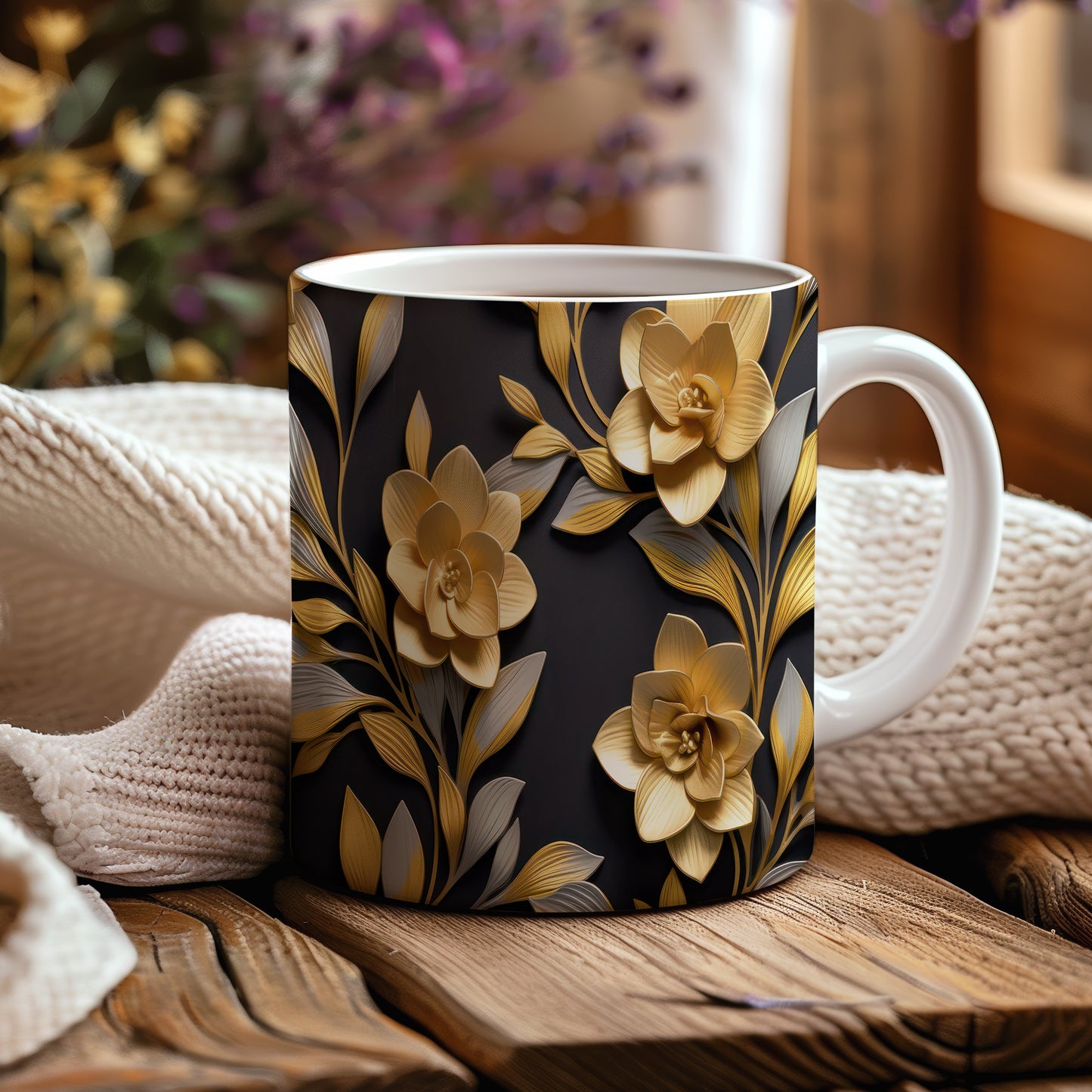 Hrnek s květinovým vzorem v černé a zlaté – černým akcentem