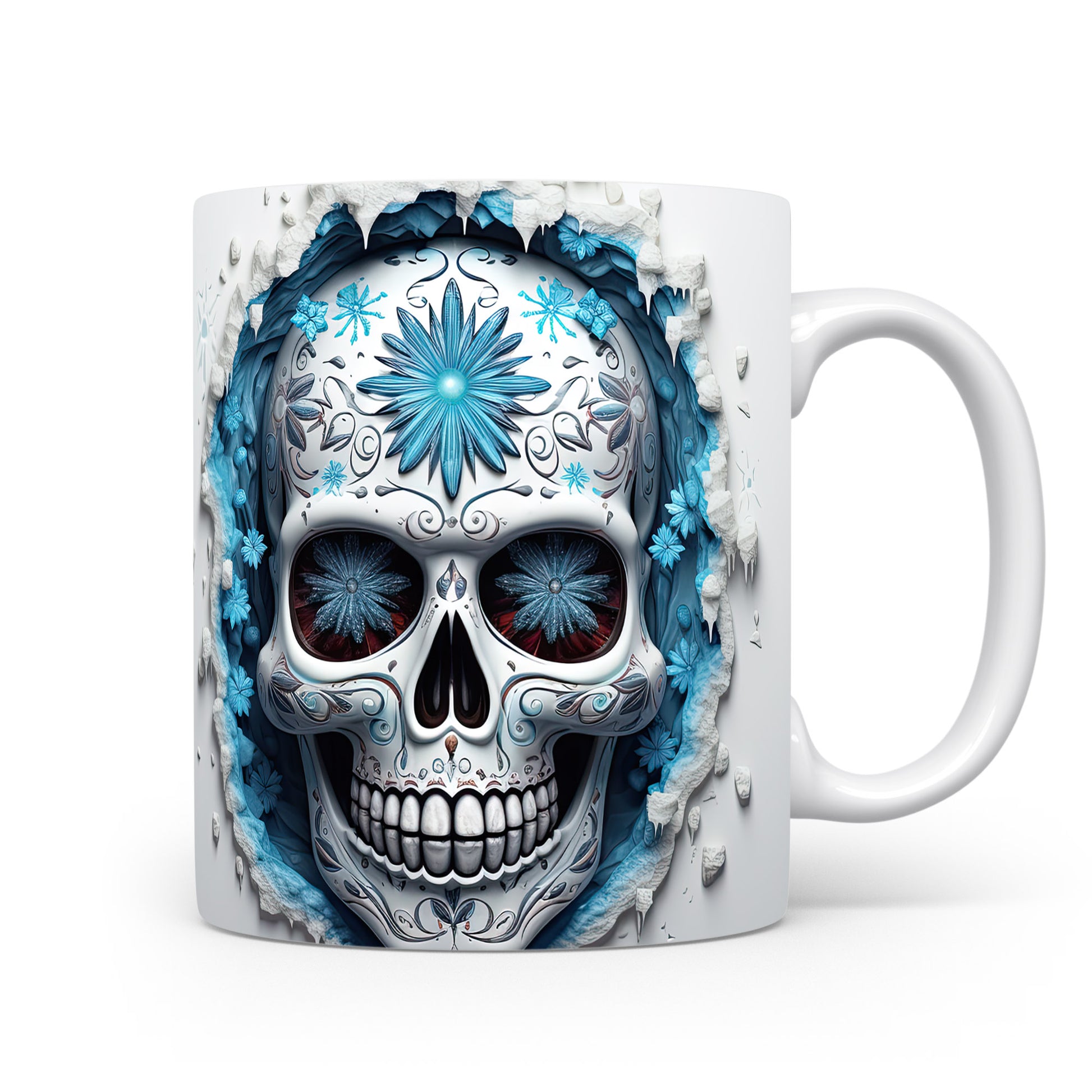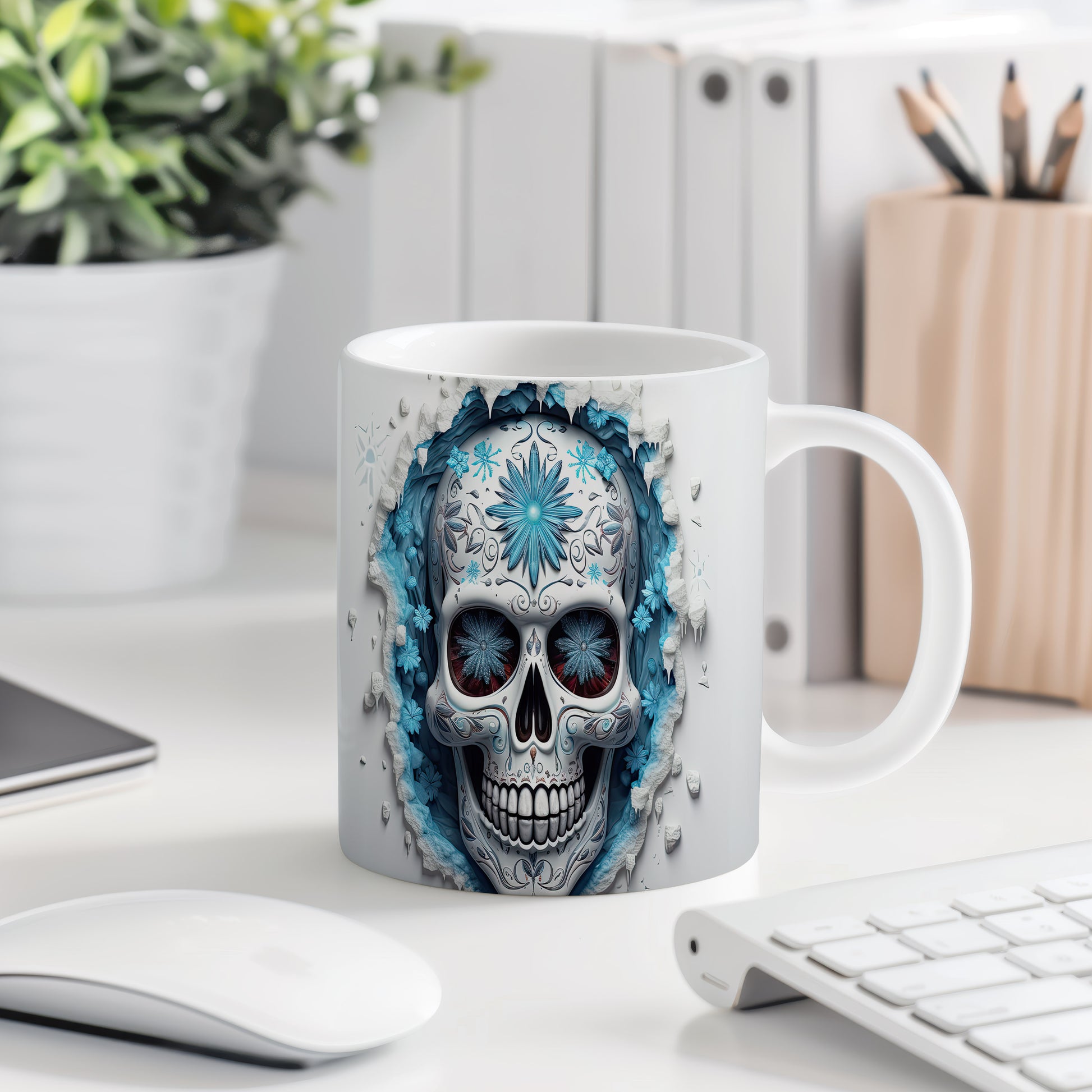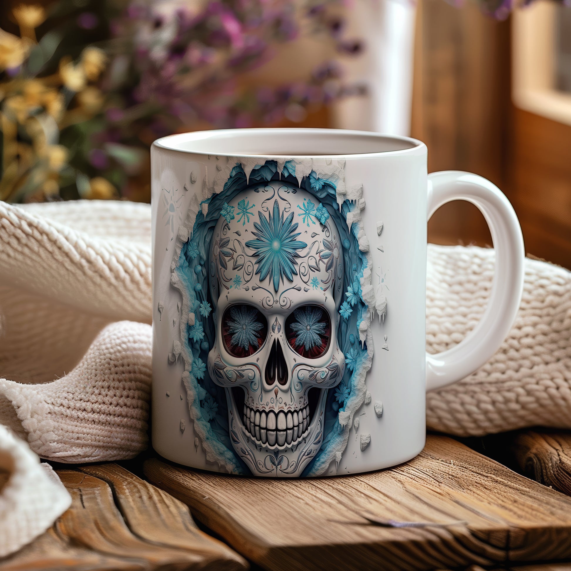 Tento jedinečný hrnek s motivem lebky a modrých květů přináší originální design pro milovníky mystiky. Je ideálním dárkem pro přátele, kteří ocení netradiční kousky. Materiál: keramika. Objem: 330 ml. Vhodné do myčky i mikrovlnky. Používání tohoto hrnku dodá vašemu pití osobitý styl.