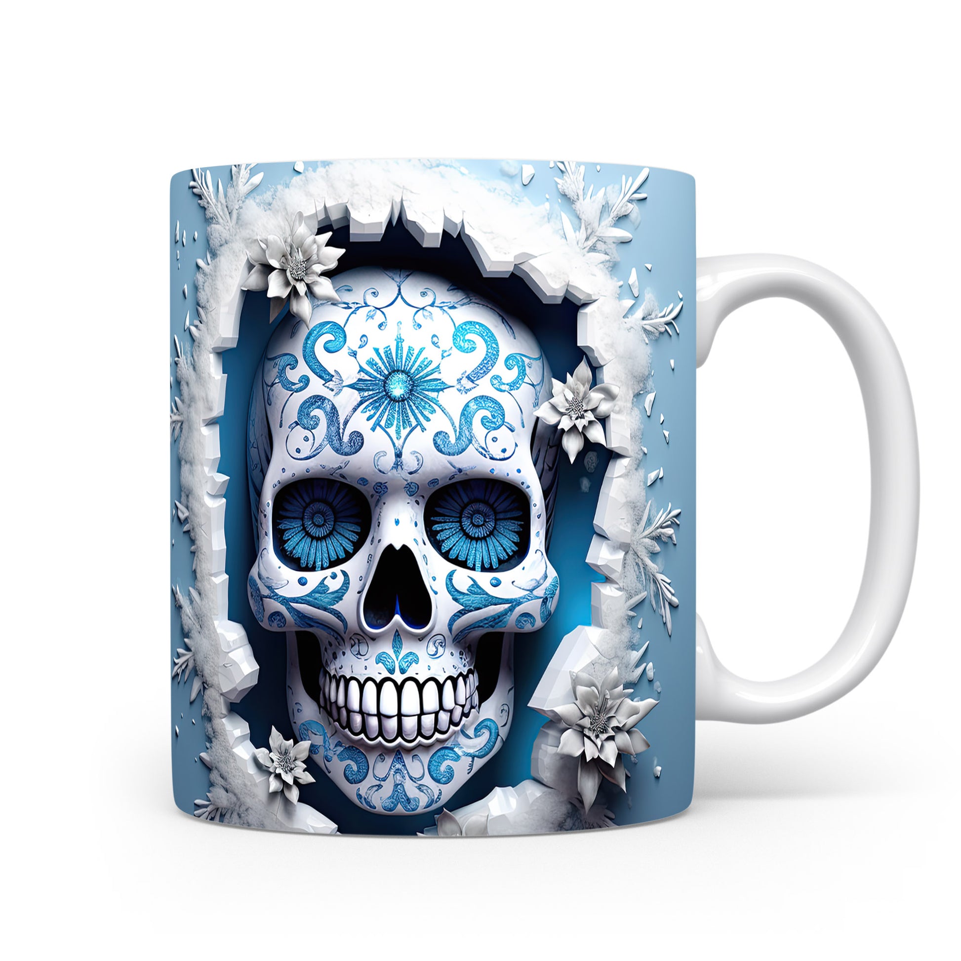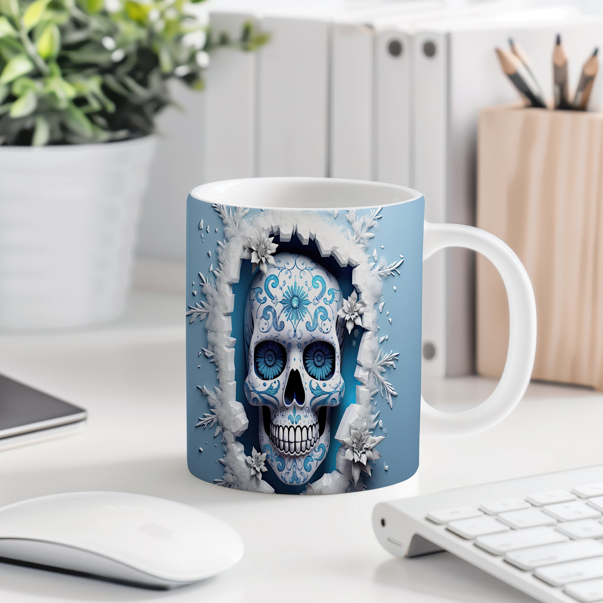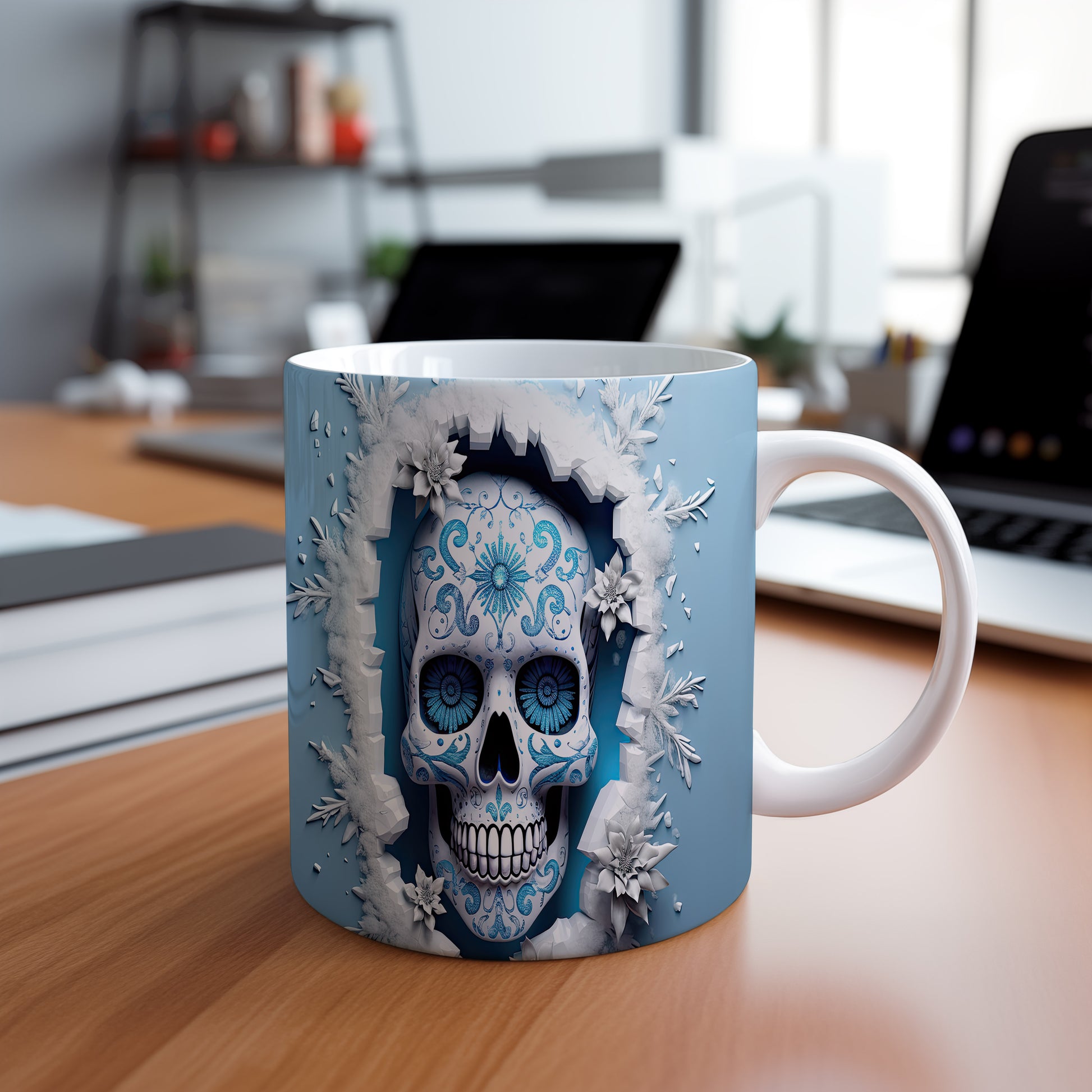Tento keramický hrnek zaujme motivem lebky s modrými ornamenty a květinovými detaily. Je ideální pro milovníky originálního designu a skvělým dárkem pro přátele nebo rodinu. Materiál: keramika. Objem: 330 ml. Vhodné do myčky i mikrovlnky. Díky svému jedinečnému vzhledu přináší do každodenního pití kávy nebo čaje osobitý styl.