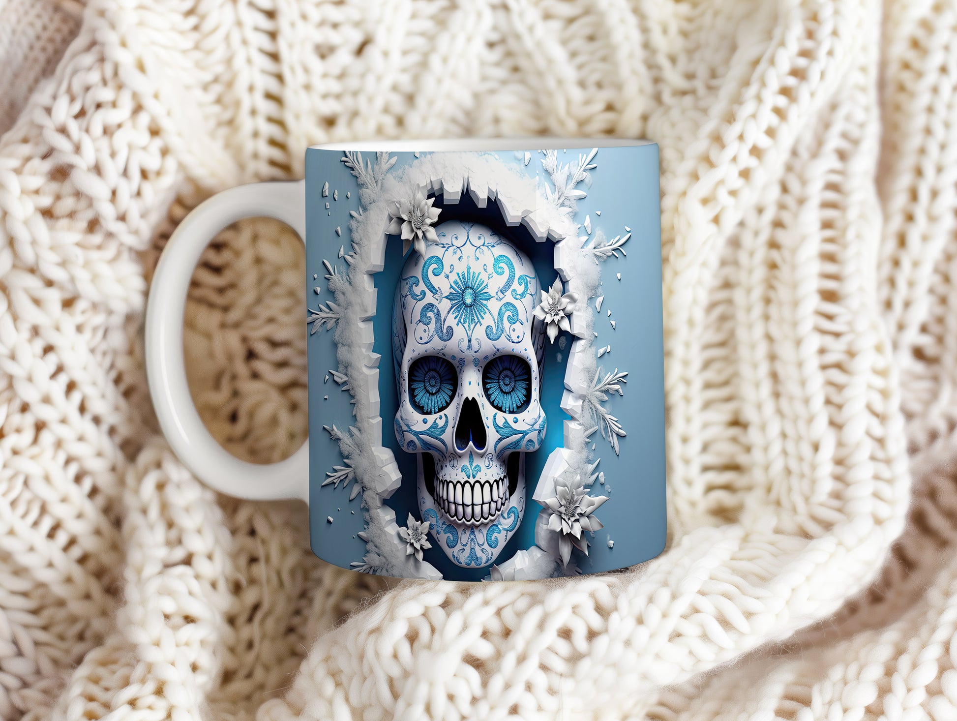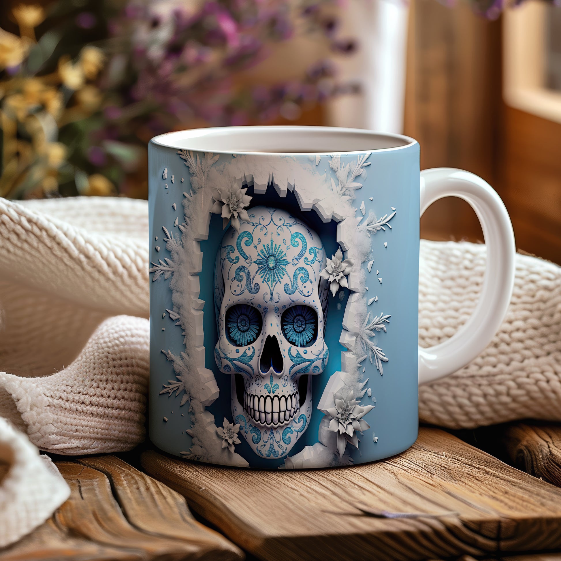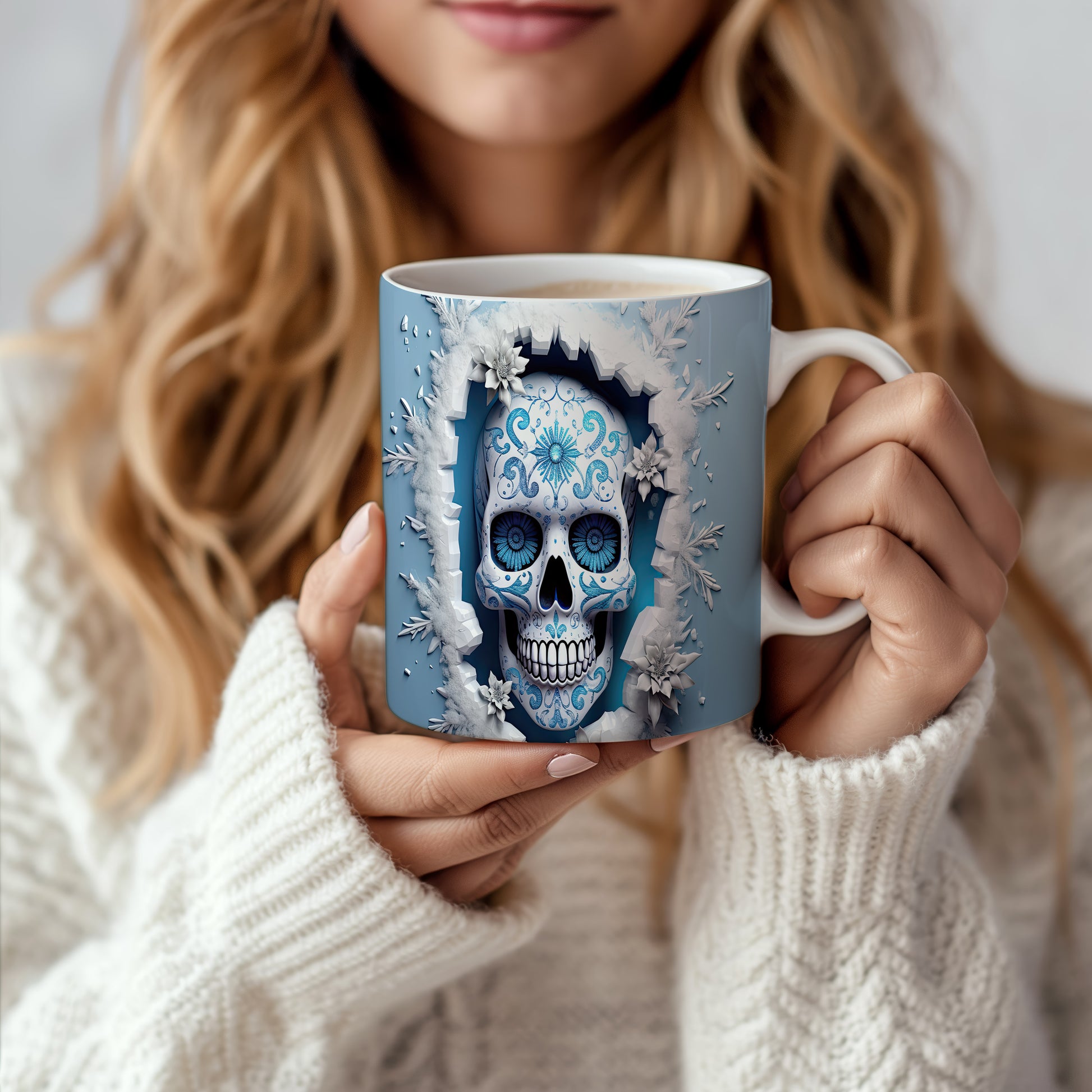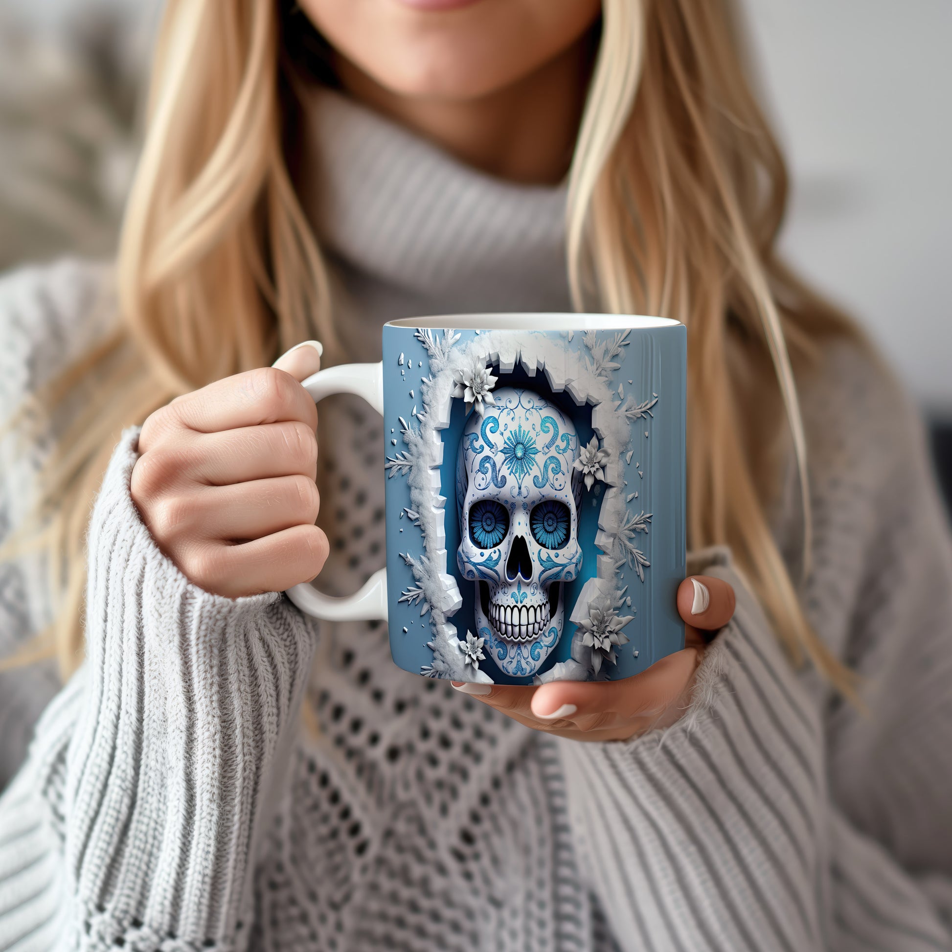 Tento keramický hrnek zaujme motivem lebky s modrými ornamenty a květinovými detaily. Je ideální pro milovníky originálního designu a skvělým dárkem pro přátele nebo rodinu. Materiál: keramika. Objem: 330 ml. Vhodné do myčky i mikrovlnky. Díky svému jedinečnému vzhledu přináší do každodenního pití kávy nebo čaje osobitý styl.