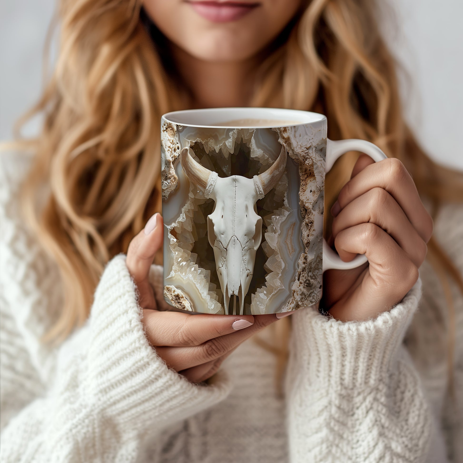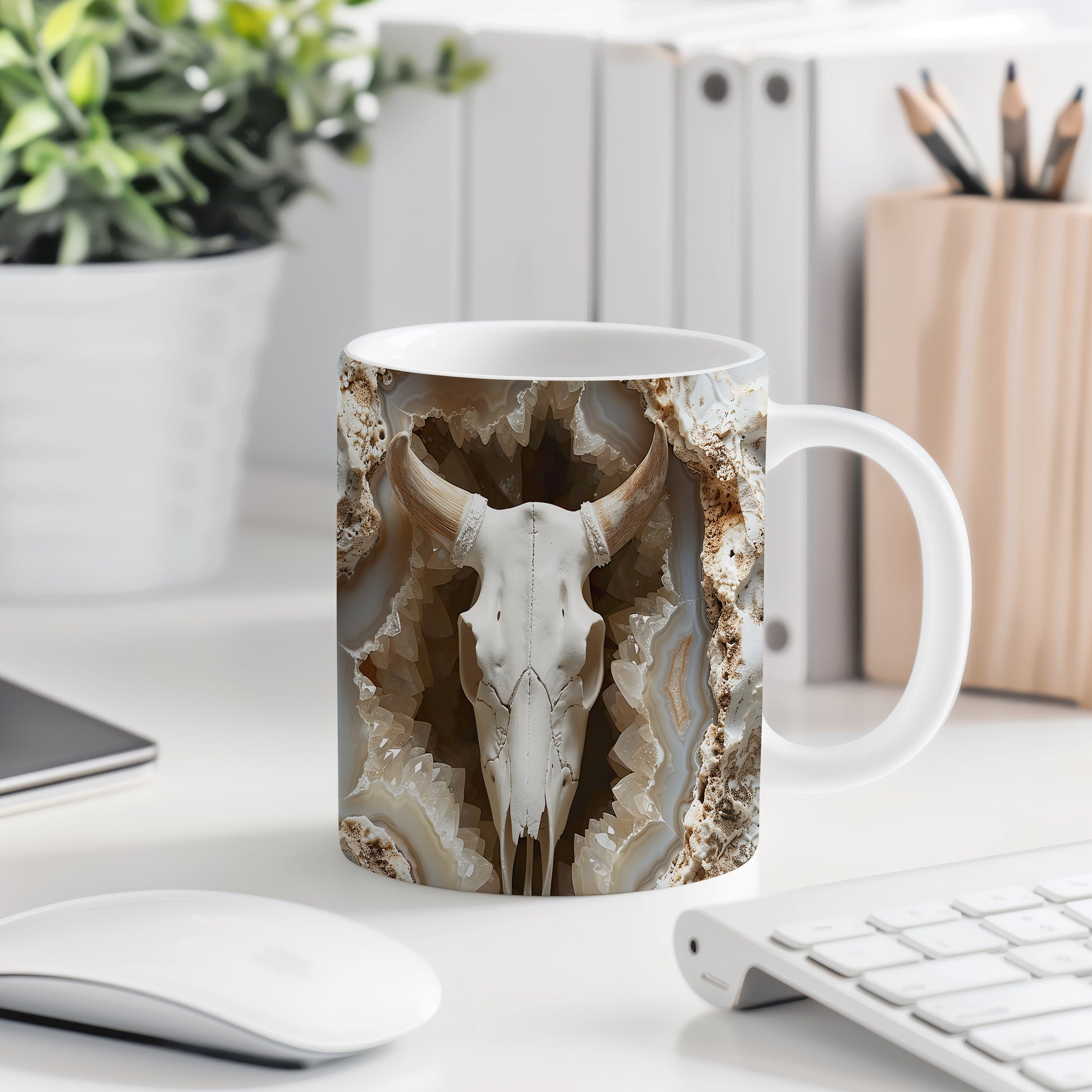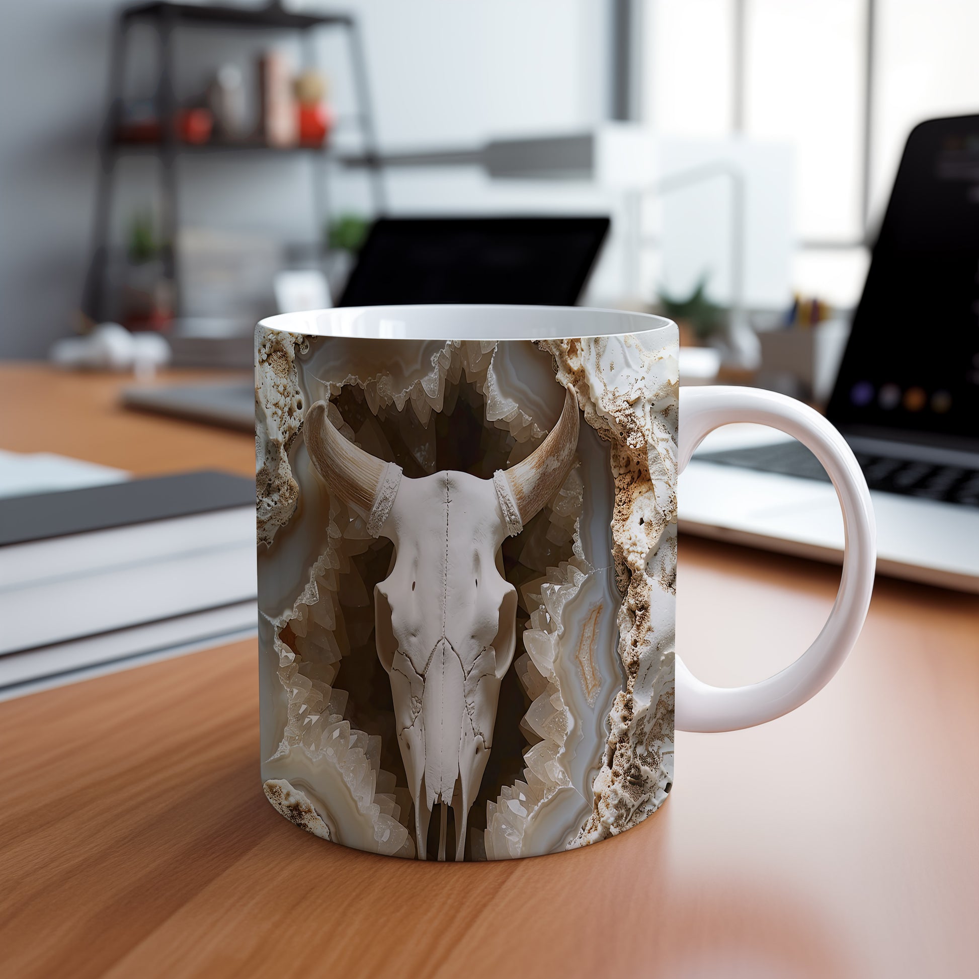 Tento hrnek zobrazuje lebku býka na pozadí přírodního skalního vzoru. Je ideální pro milovníky přírody a originálního designu, skvěle se hodí jako dárek pro přátele nebo rodinu. Materiál: keramika. Objem: 330 ml. Vhodné do myčky i mikrovlnky. Používání tohoto hrnku přináší jedinečný zážitek z pití.