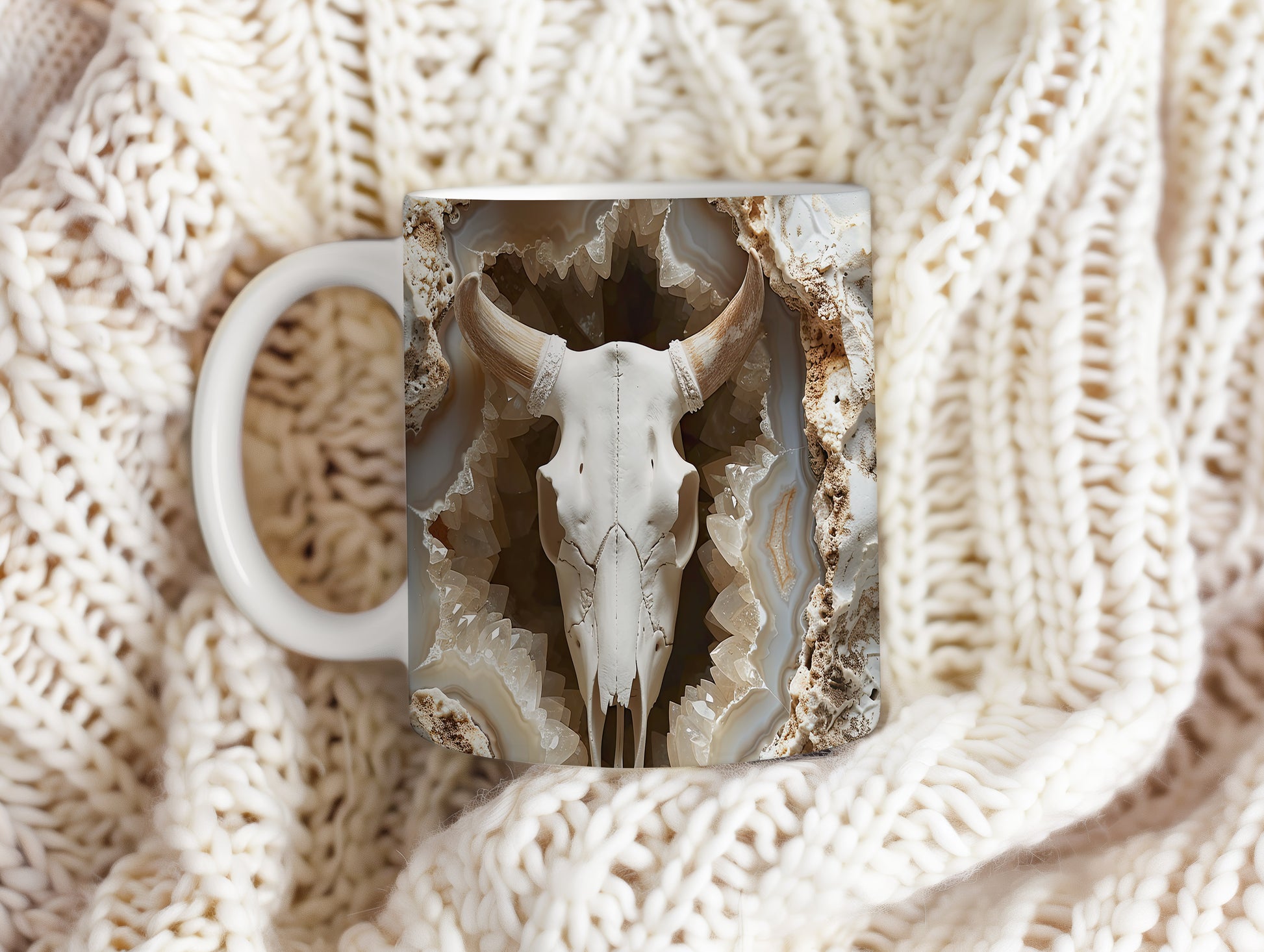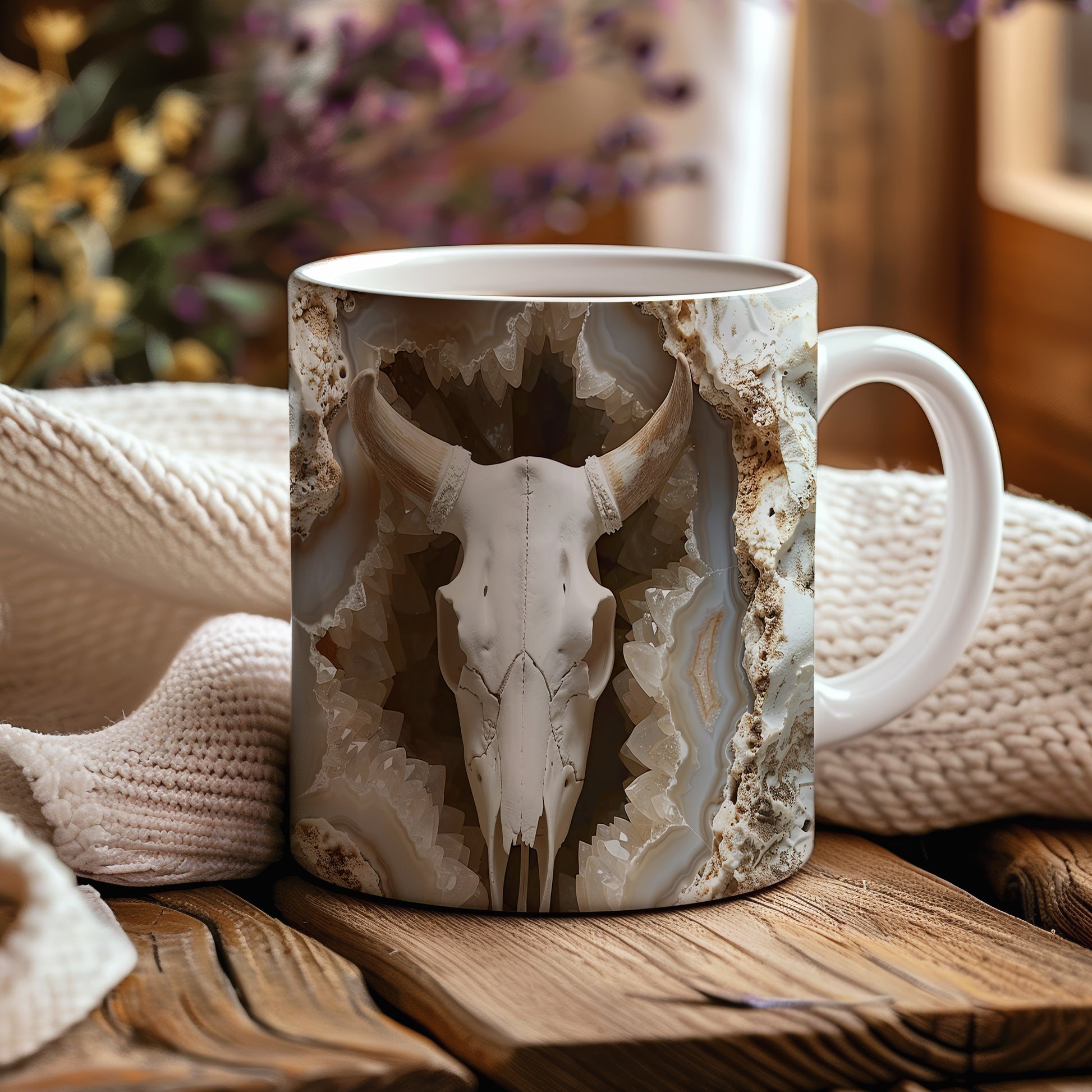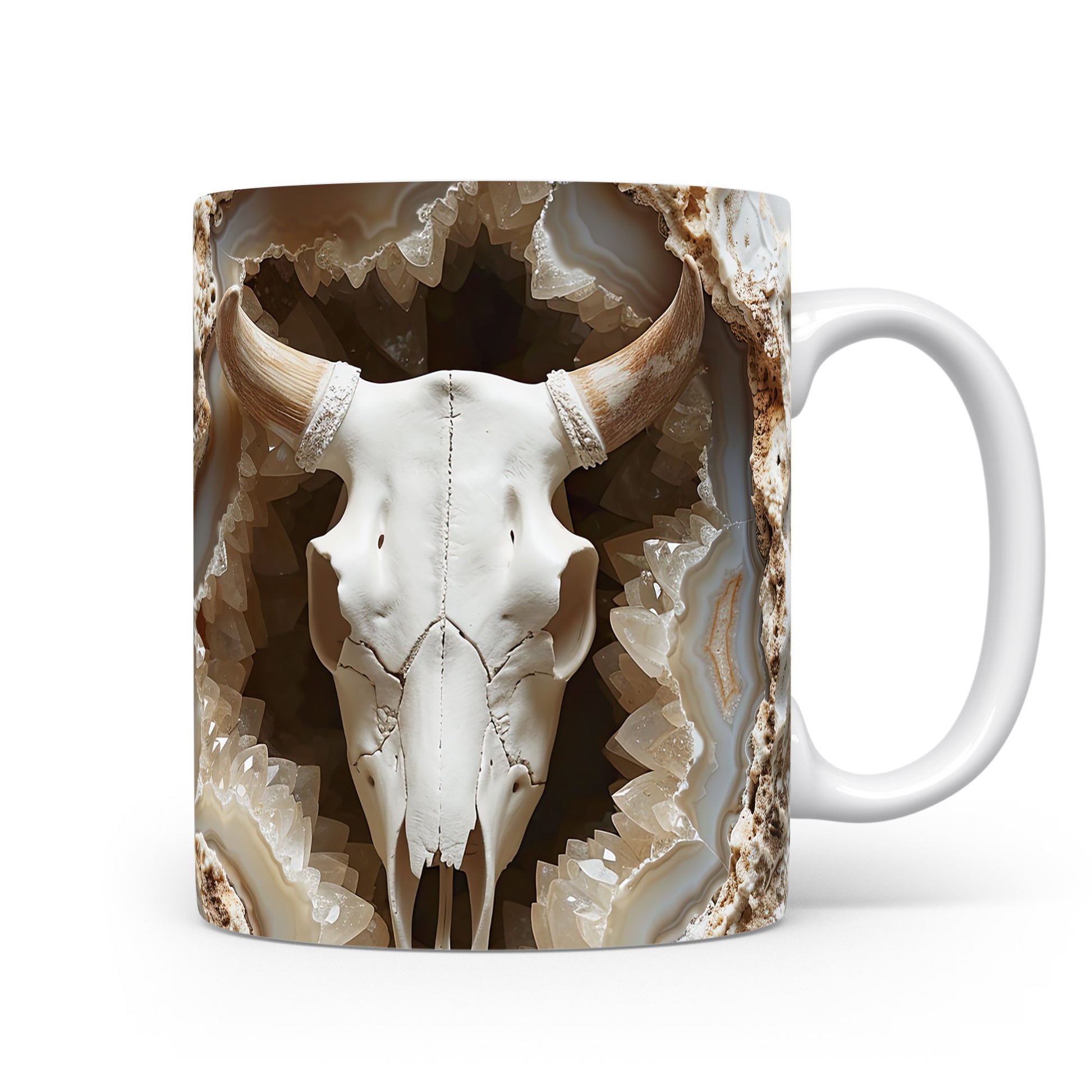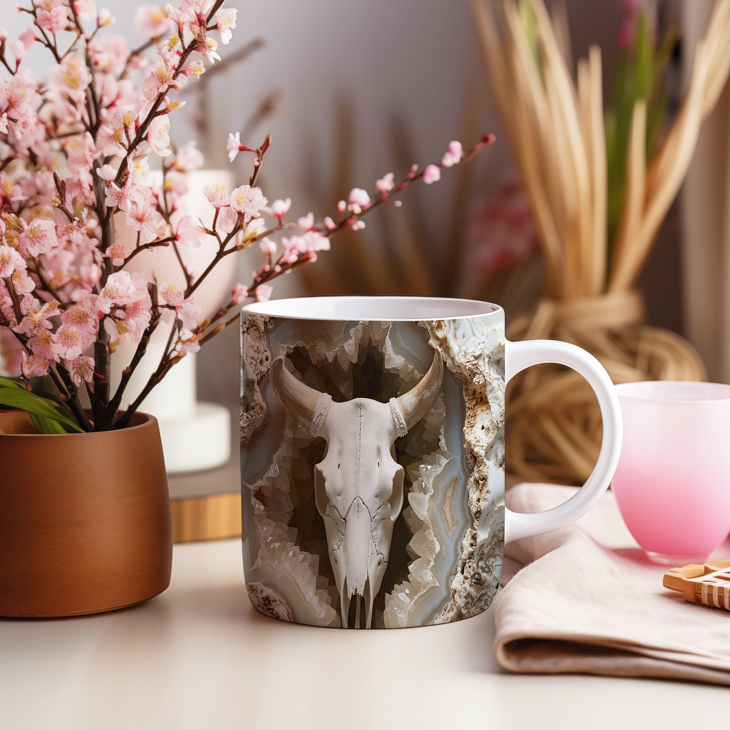 Tento hrnek zobrazuje lebku býka na pozadí přírodního skalního vzoru. Je ideální pro milovníky přírody a originálního designu, skvěle se hodí jako dárek pro přátele nebo rodinu. Materiál: keramika. Objem: 330 ml. Vhodné do myčky i mikrovlnky. Používání tohoto hrnku přináší jedinečný zážitek z pití.