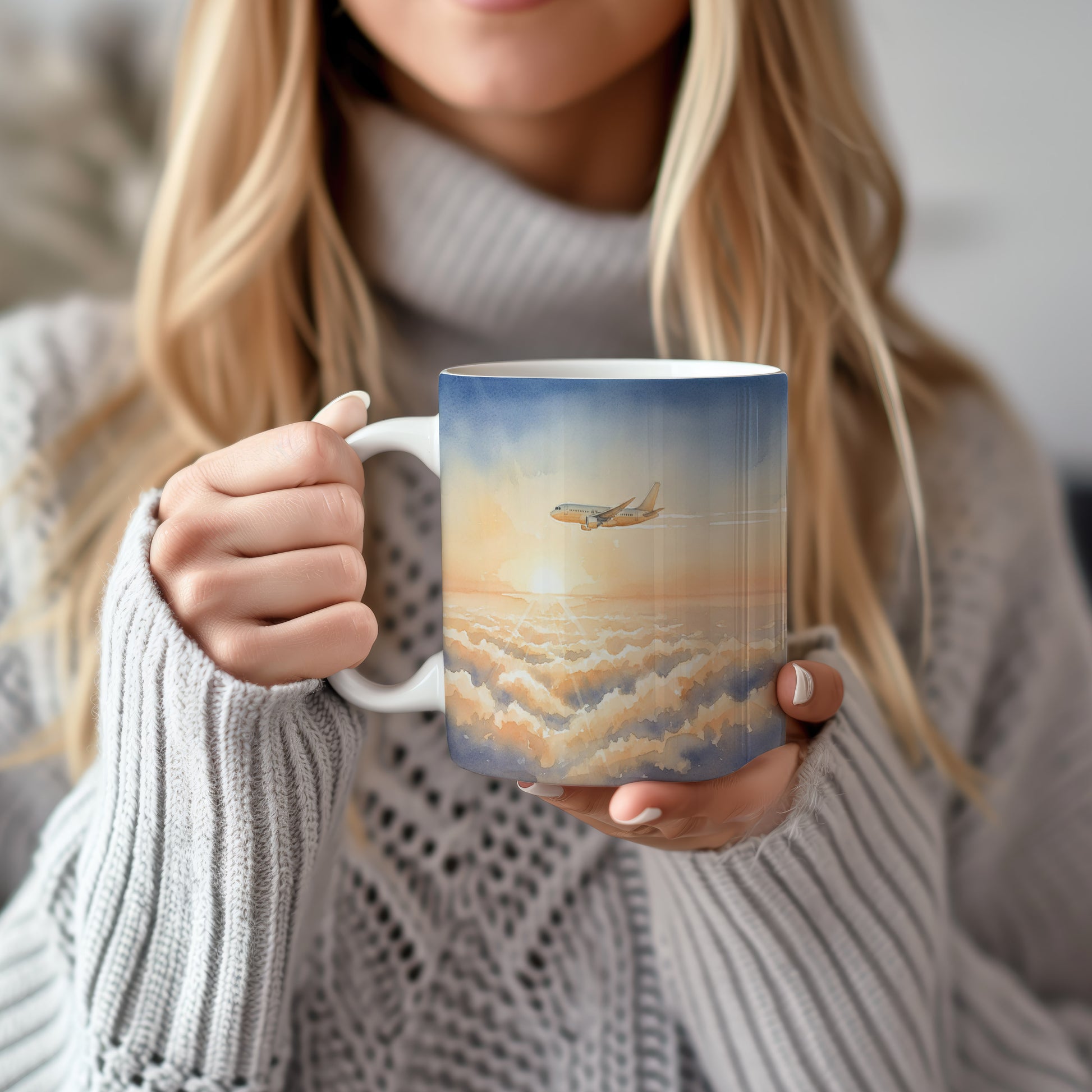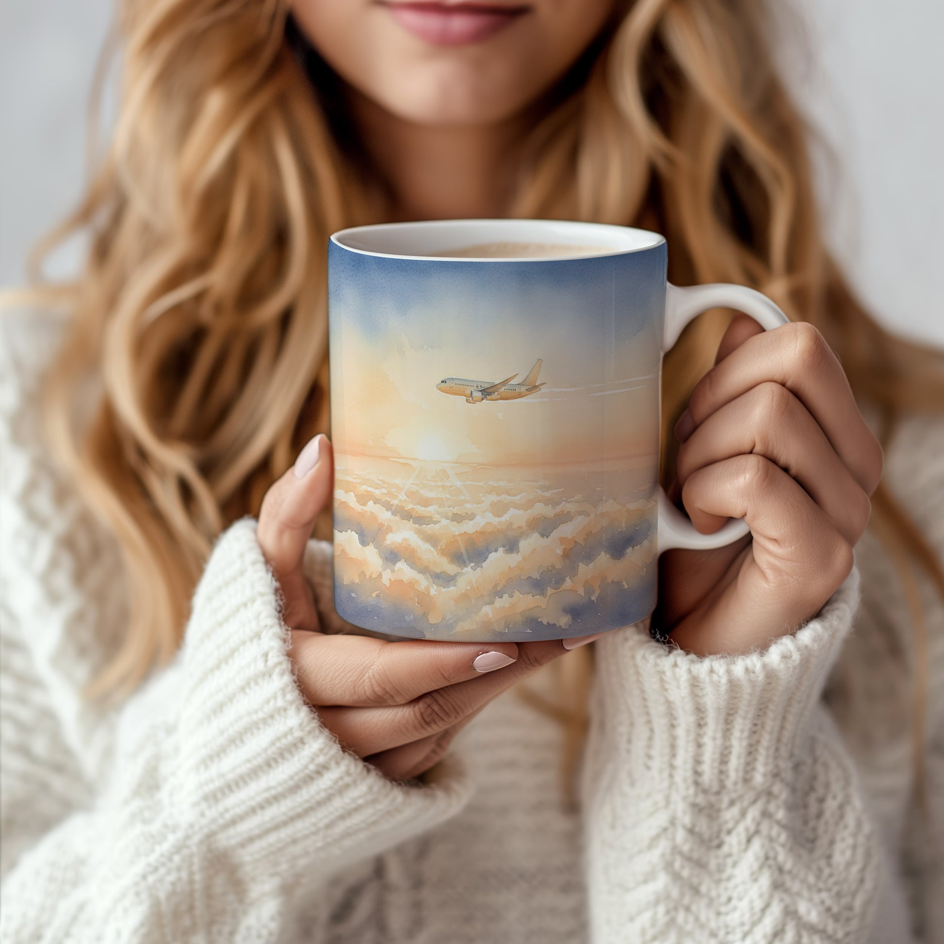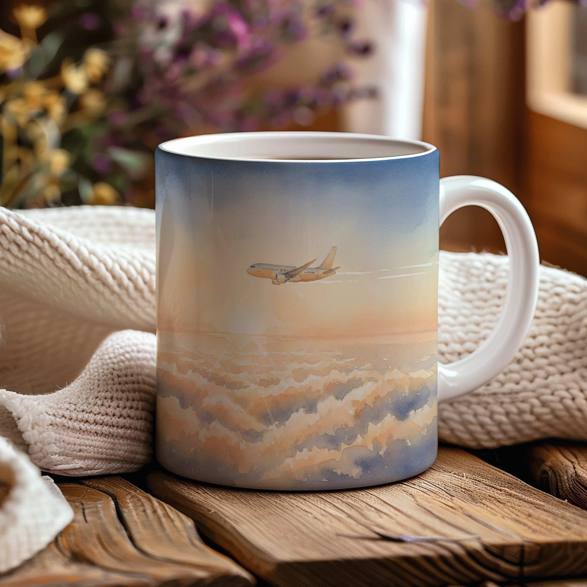 Objevte krásu letu s naším hrnkem, jehož akvarelový motiv letadla nad zářivými mraky vás přenese do nebeských výšin. Hrnek 330 ml – vhodný do myčky i mikrovlnky.