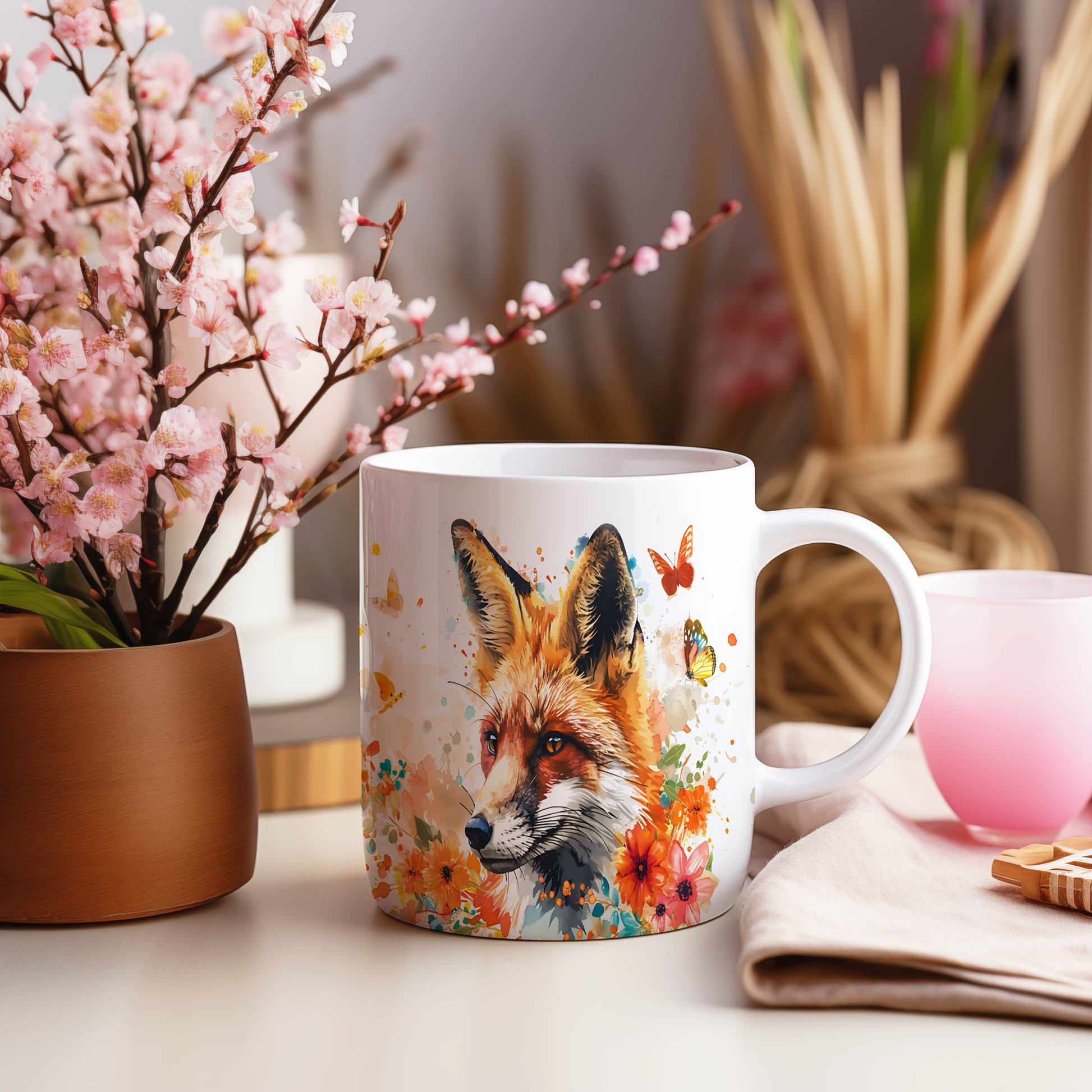 Hrnek s liškou a květinami