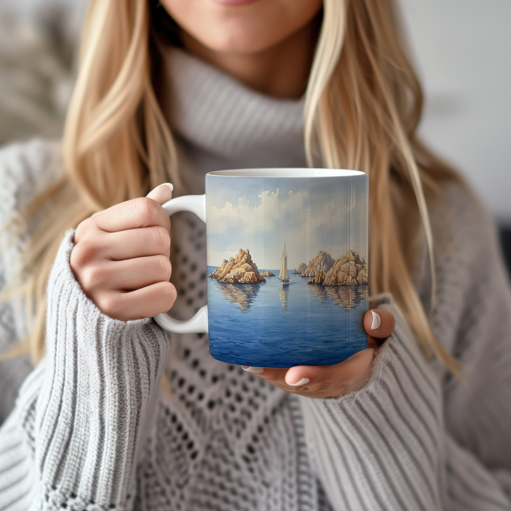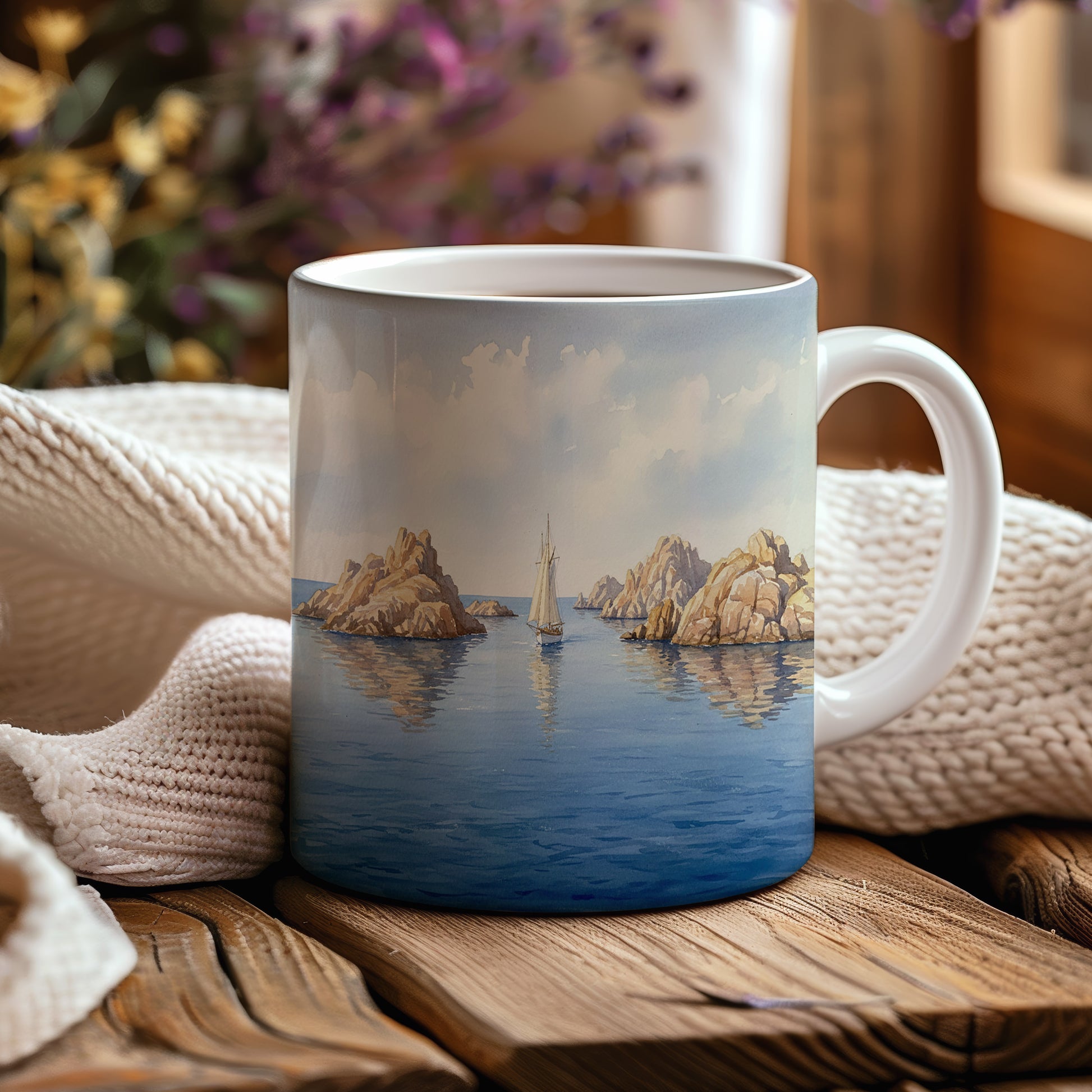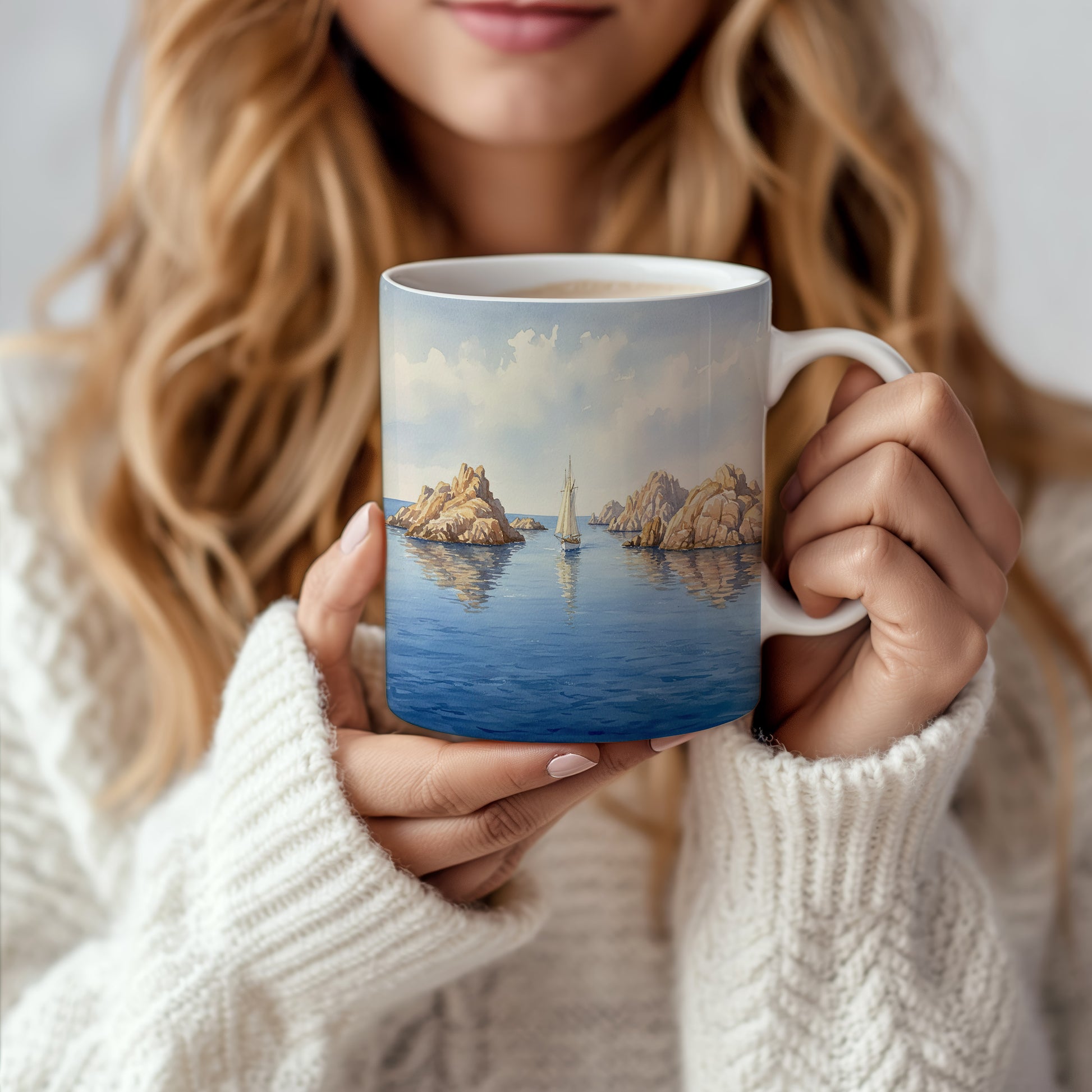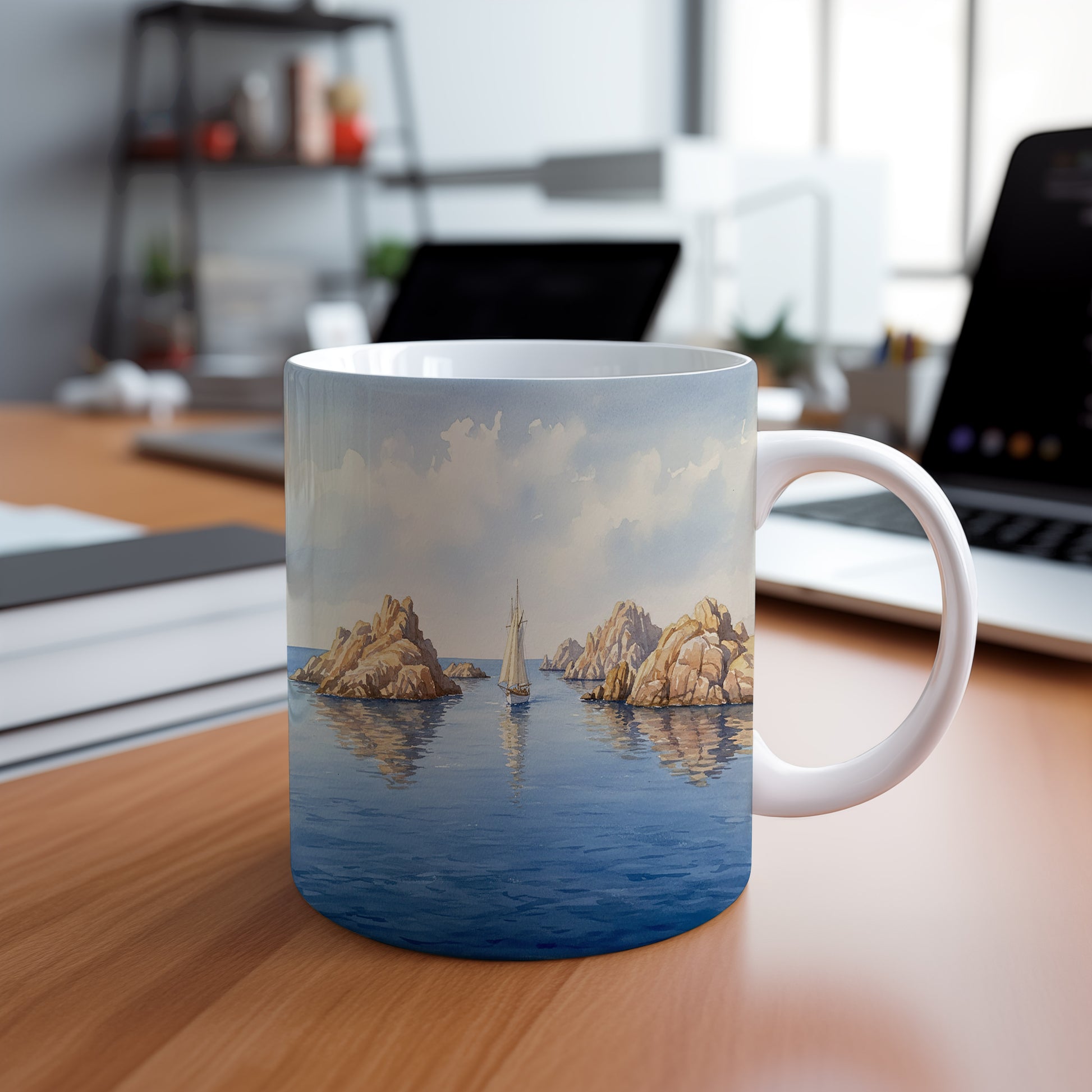 Prozkoumejte klidný svět akvarelové krajiny s lodí mezi majestátními skalami. Ideální pro milovníky moře a dobrodružství. Hrnek 330 ml – vhodný do myčky i mikrovlnky.
