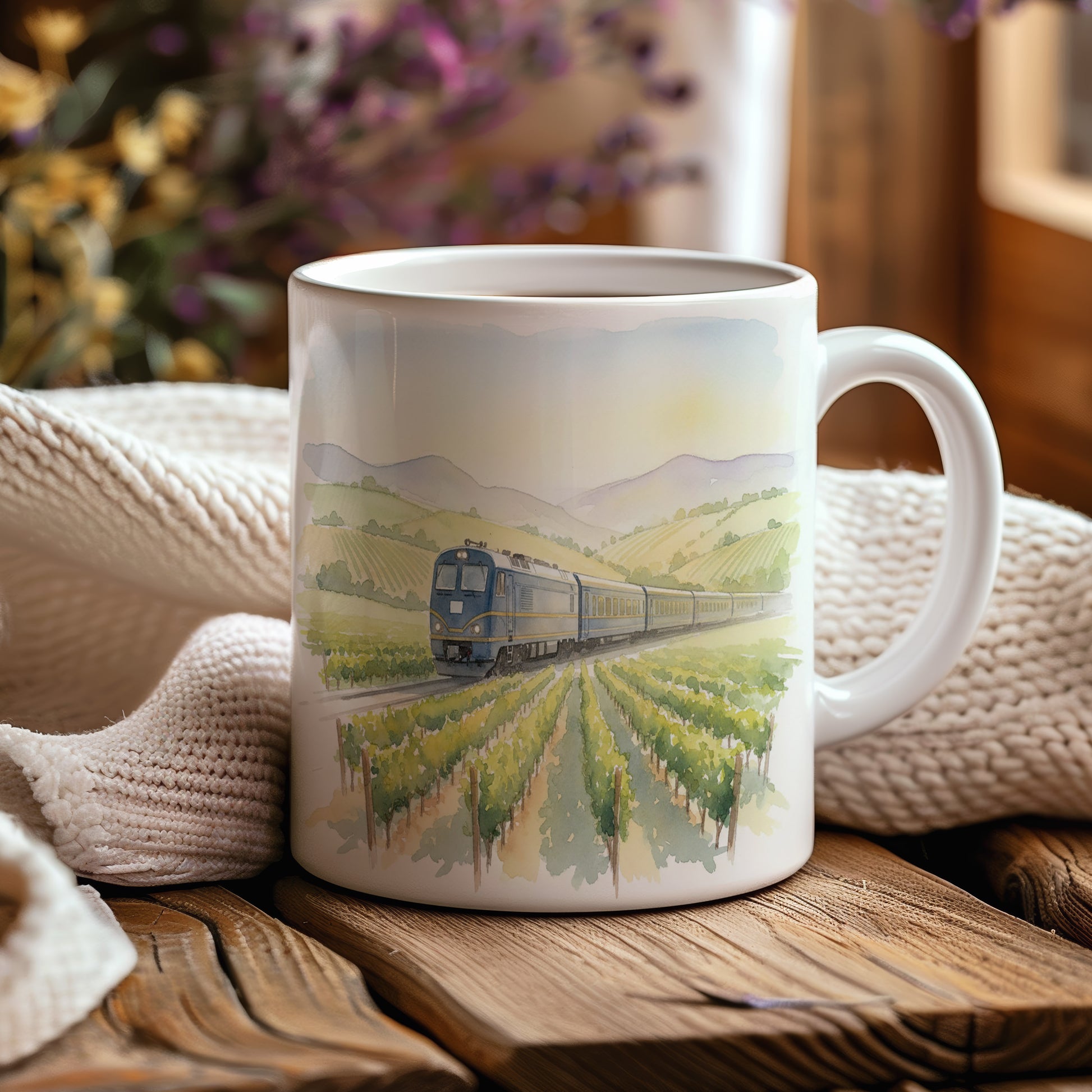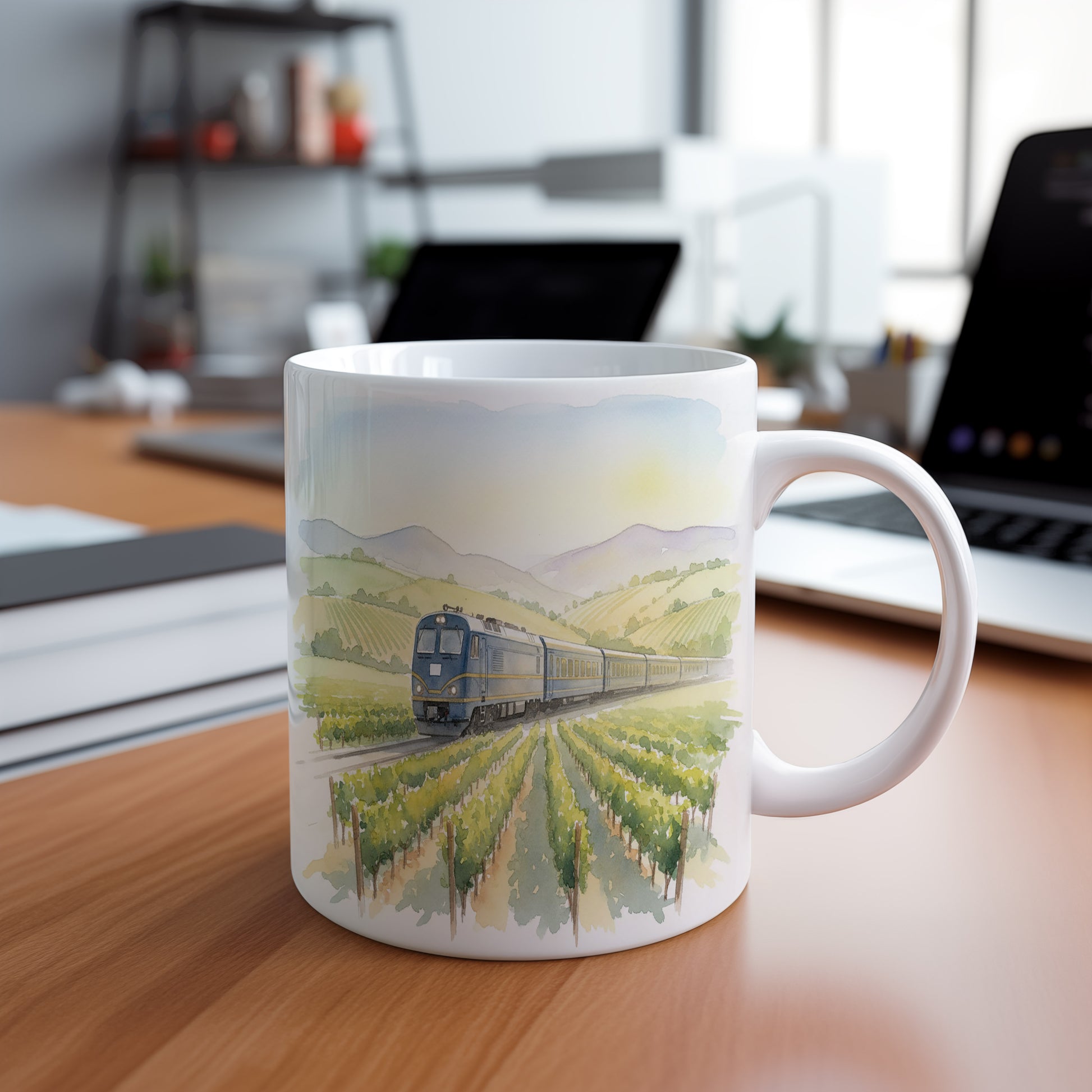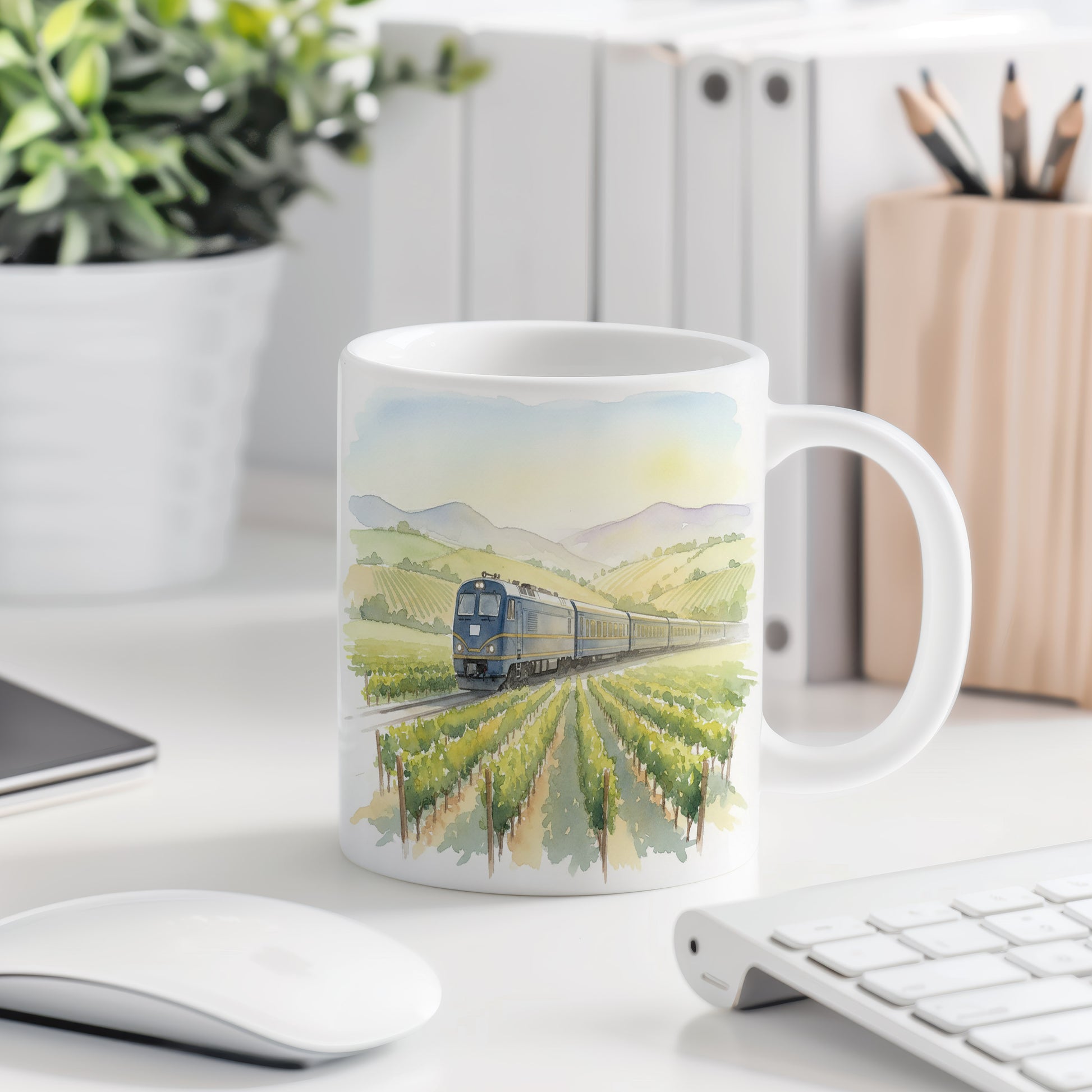 Užijte si klidnou jízdu vlakem mezi vinicemi na našem hrnku s akvarelovým motivem. Ideální pro milovníky železnic a přírody.