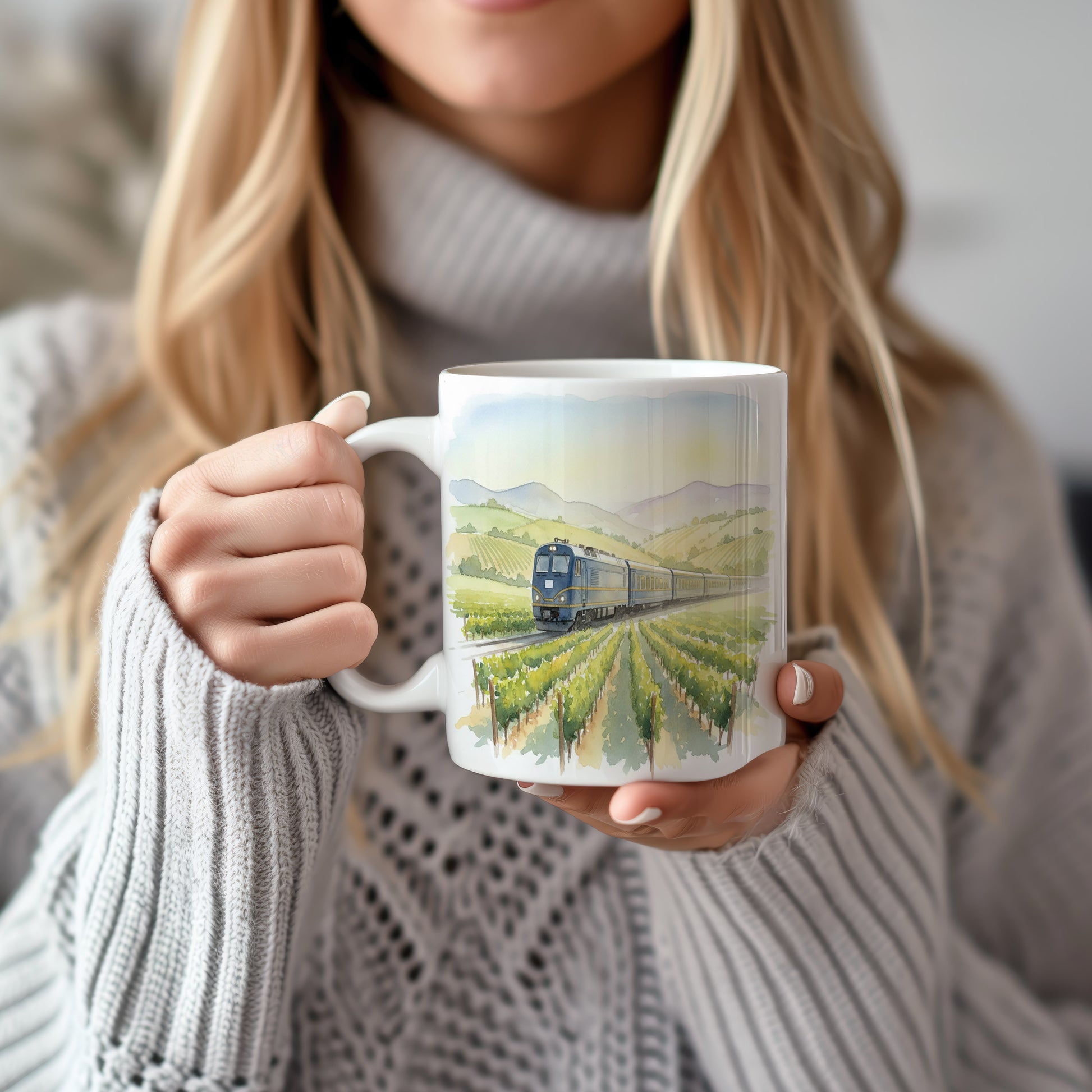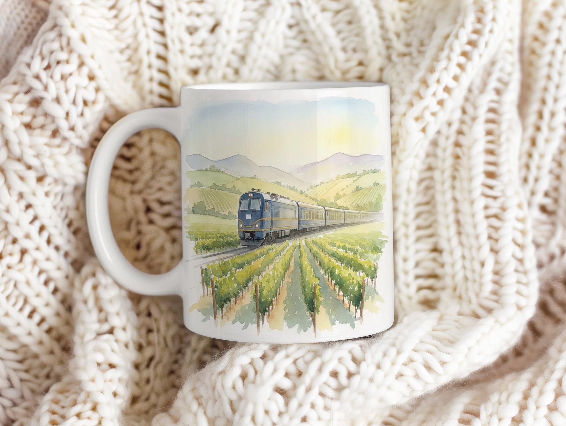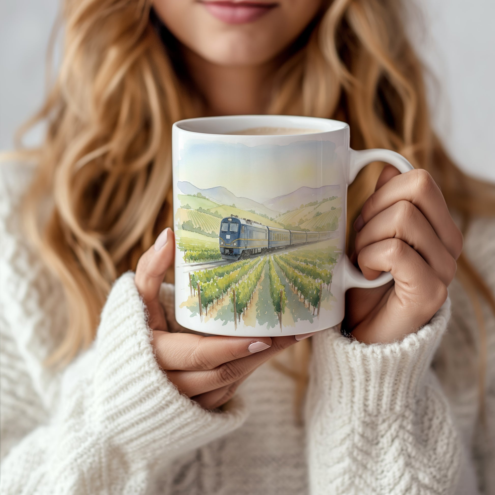 Užijte si klidnou jízdu vlakem mezi vinicemi na našem hrnku s akvarelovým motivem. Ideální pro milovníky železnic a přírody.