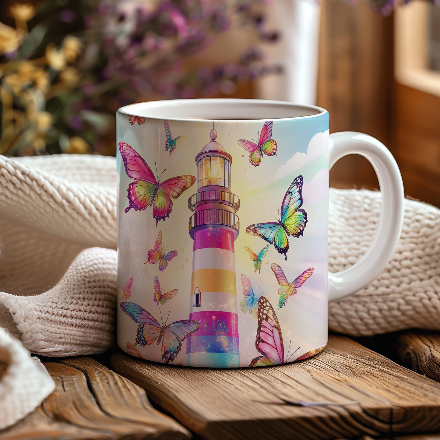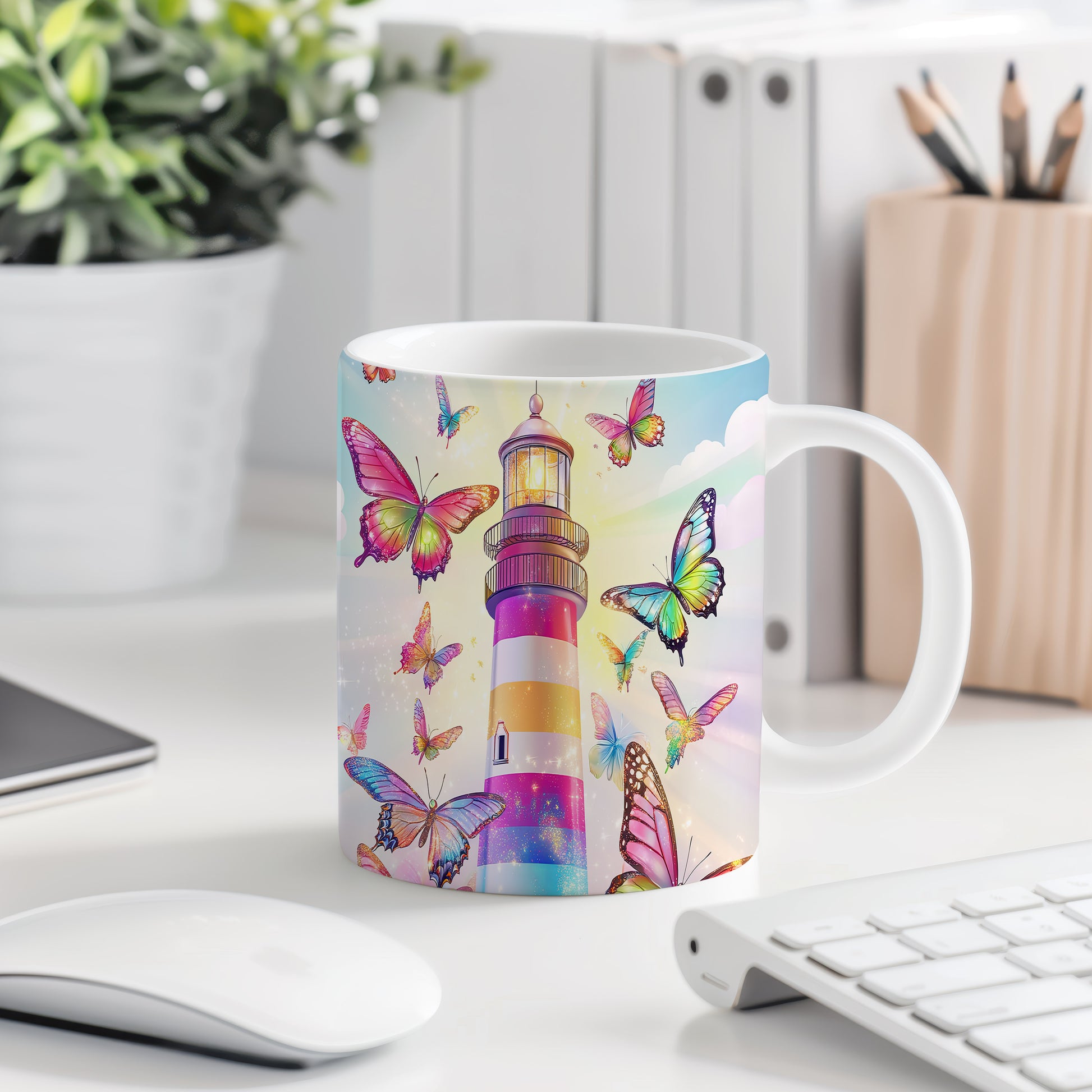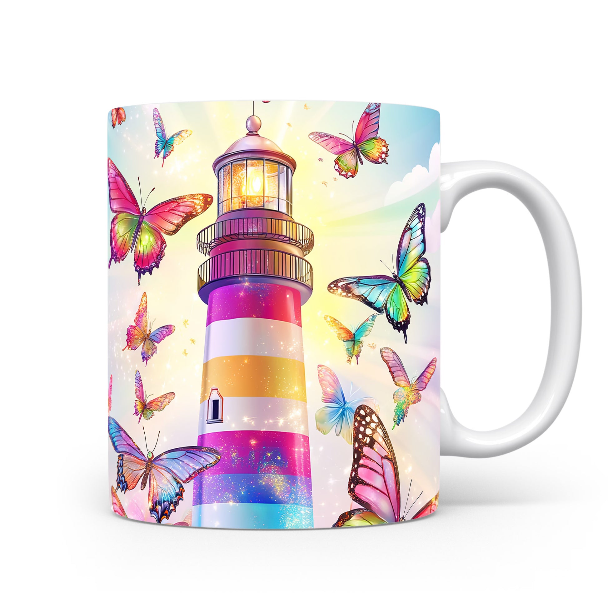 Tento hrnek s barevným majákem a živými motýly přináší do vašeho dne radost a svěžest. Je ideální pro milovníky přírody a skvělým dárkem pro každého, kdo ocení krásu detailů. Materiál: keramika. Objem: 330 ml. Vhodné do myčky i mikrovlnky. Používáním tohoto hrnku si užijete nejen oblíbený nápoj, ale také příjemný pohled na originální design.