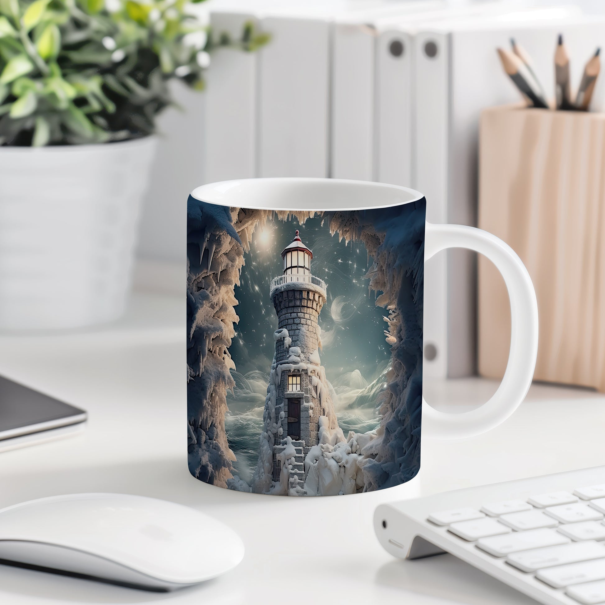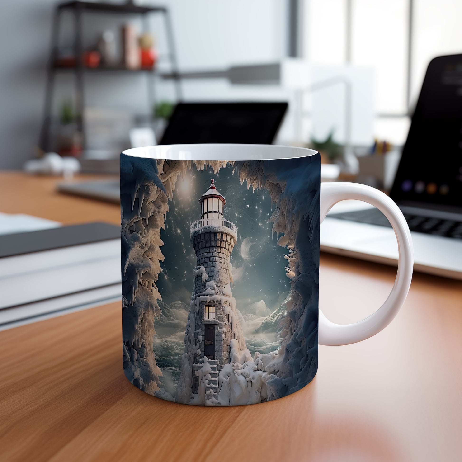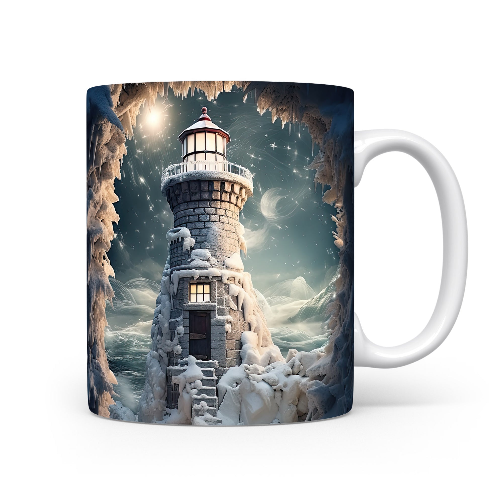 Tento hrnek zobrazuje malebný maják v zasněžené zimní krajině, doplněný o krásné hvězdy na obloze. Je ideální pro milovníky přírody a zimních scenérií, skvělý tip na dárek pro přátele či rodinu. Materiál: keramika. Objem: 330 ml. Vhodné do myčky i mikrovlnky. Užívejte si teplé nápoje s tímto stylovým hrnkem, který přináší útulnou atmosféru.