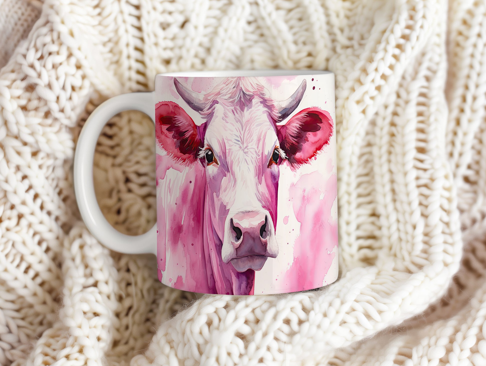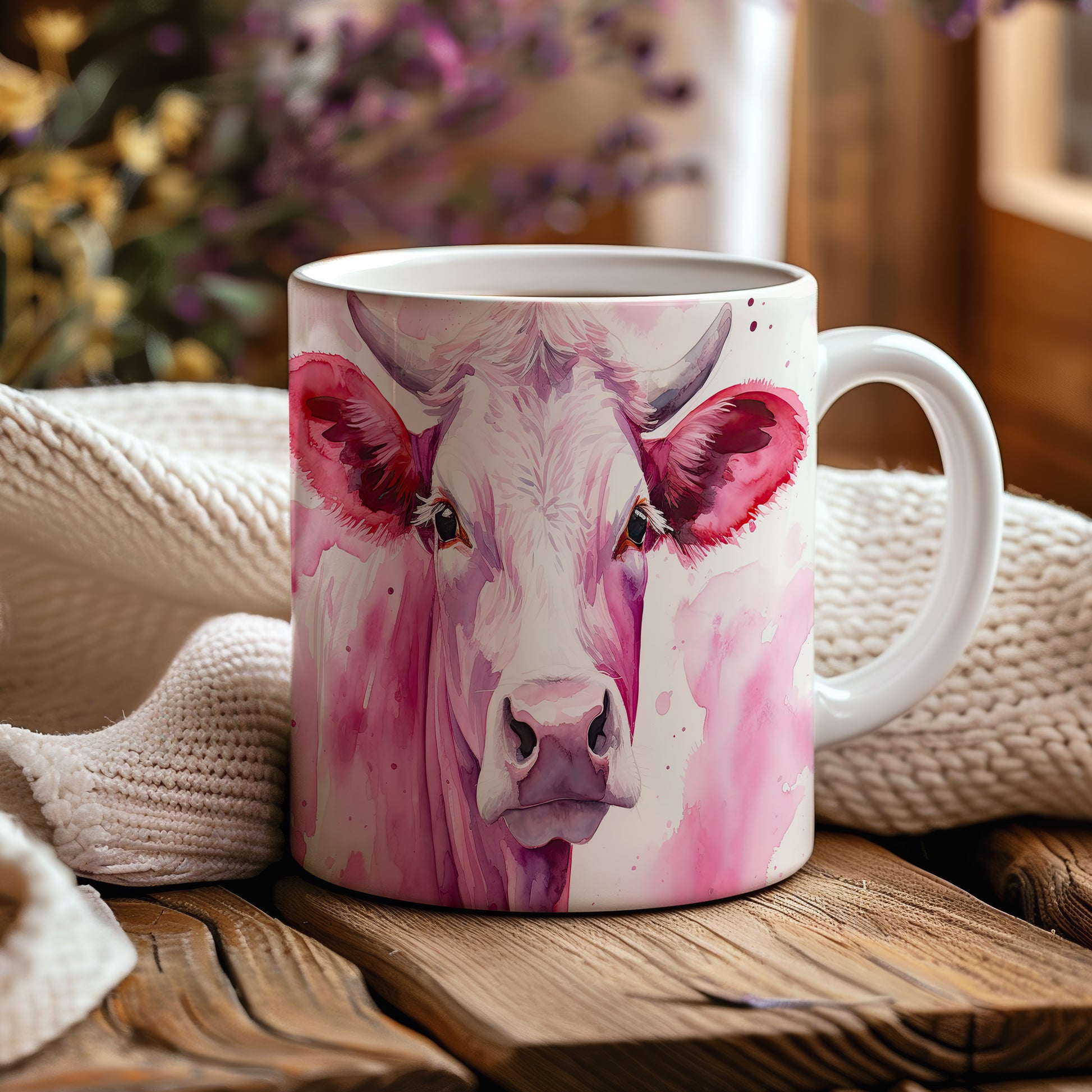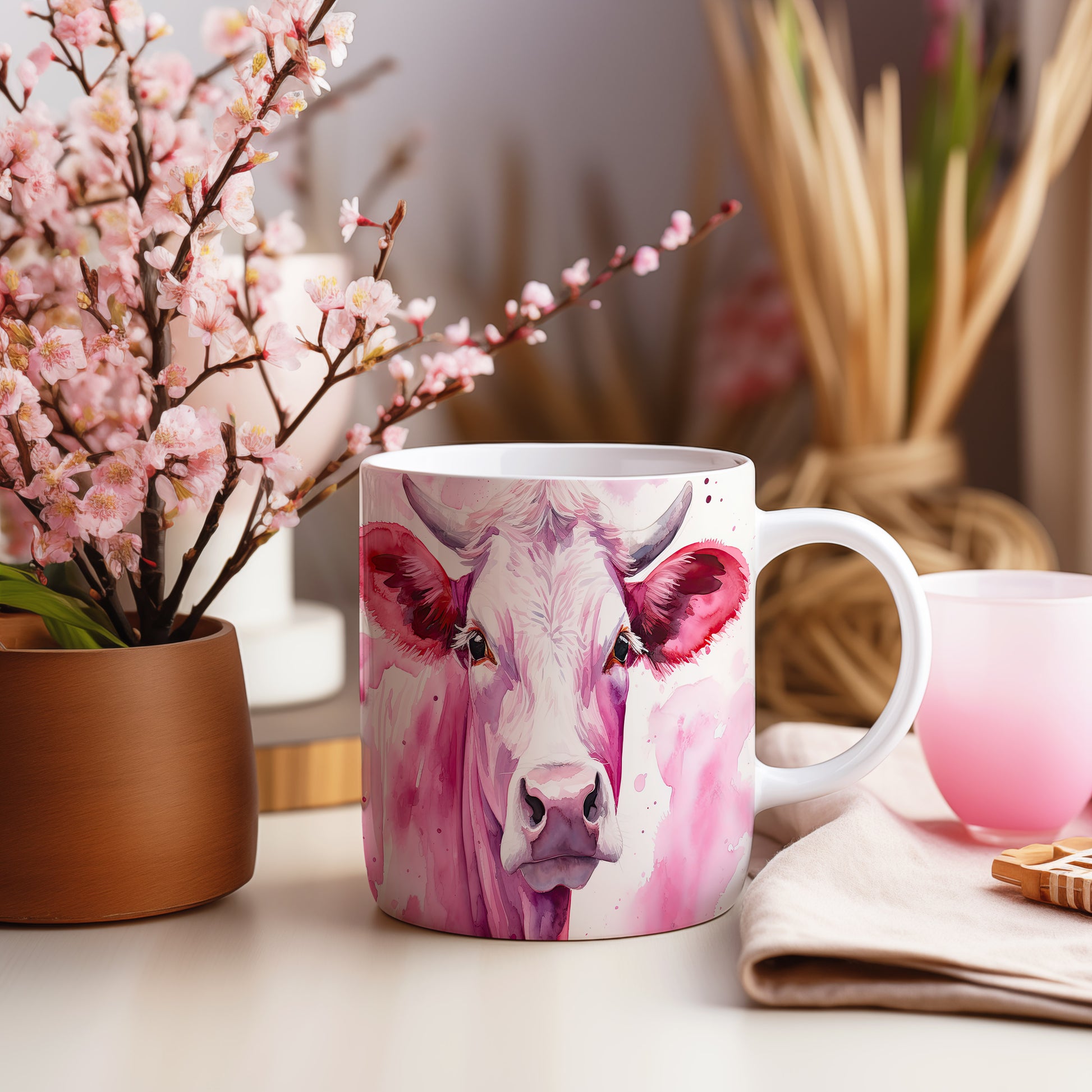 Hrnek s malbou krávy na růžovém pozadí