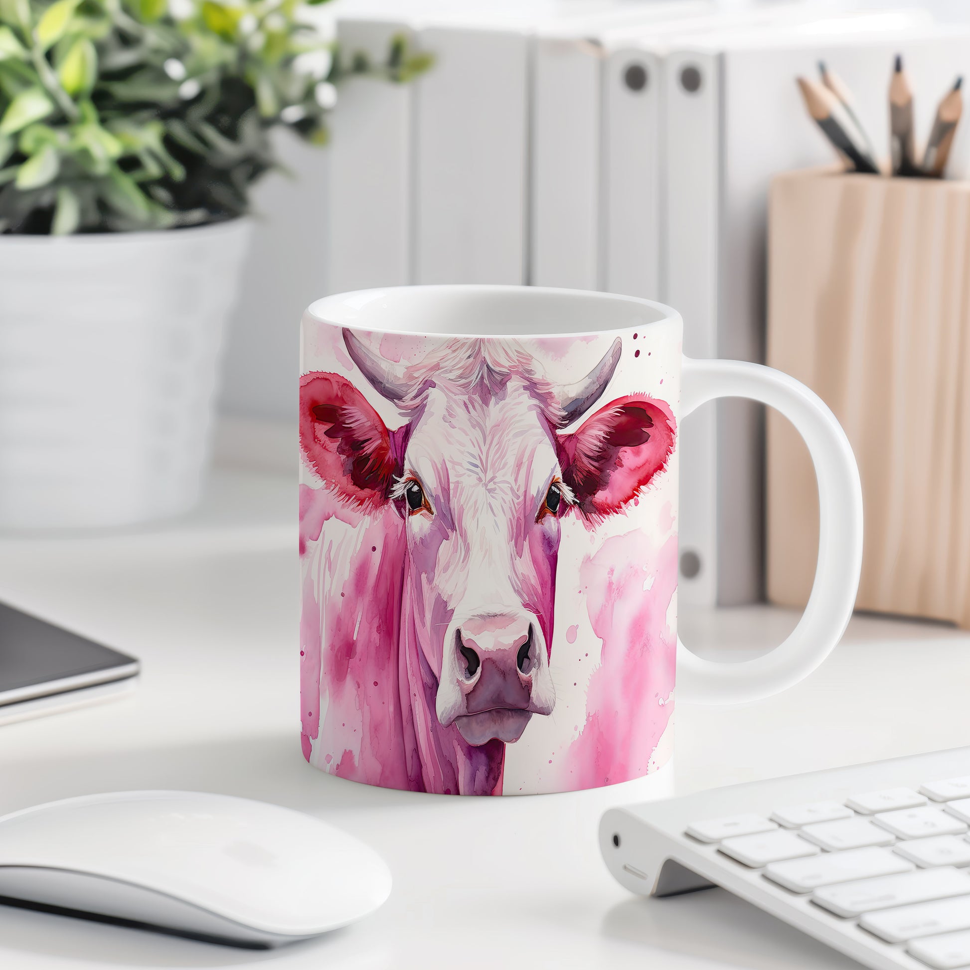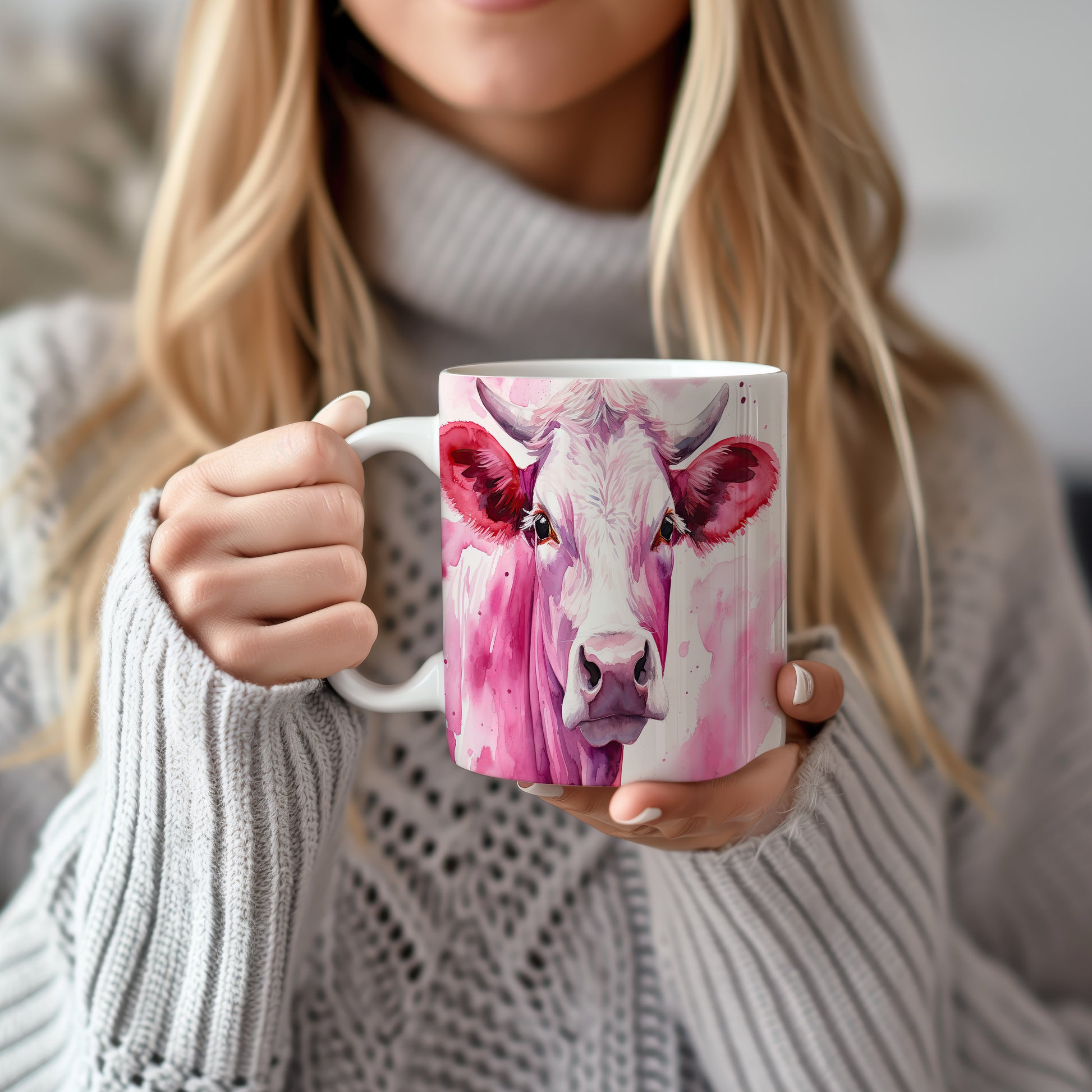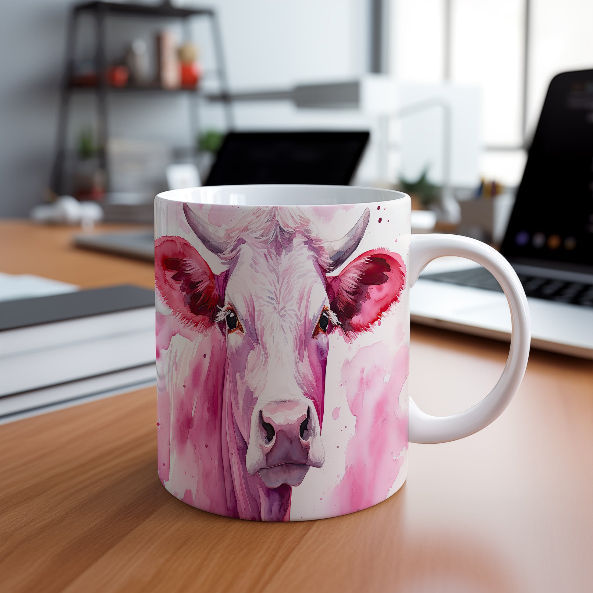 Hrnek s malbou krávy na růžovém pozadí