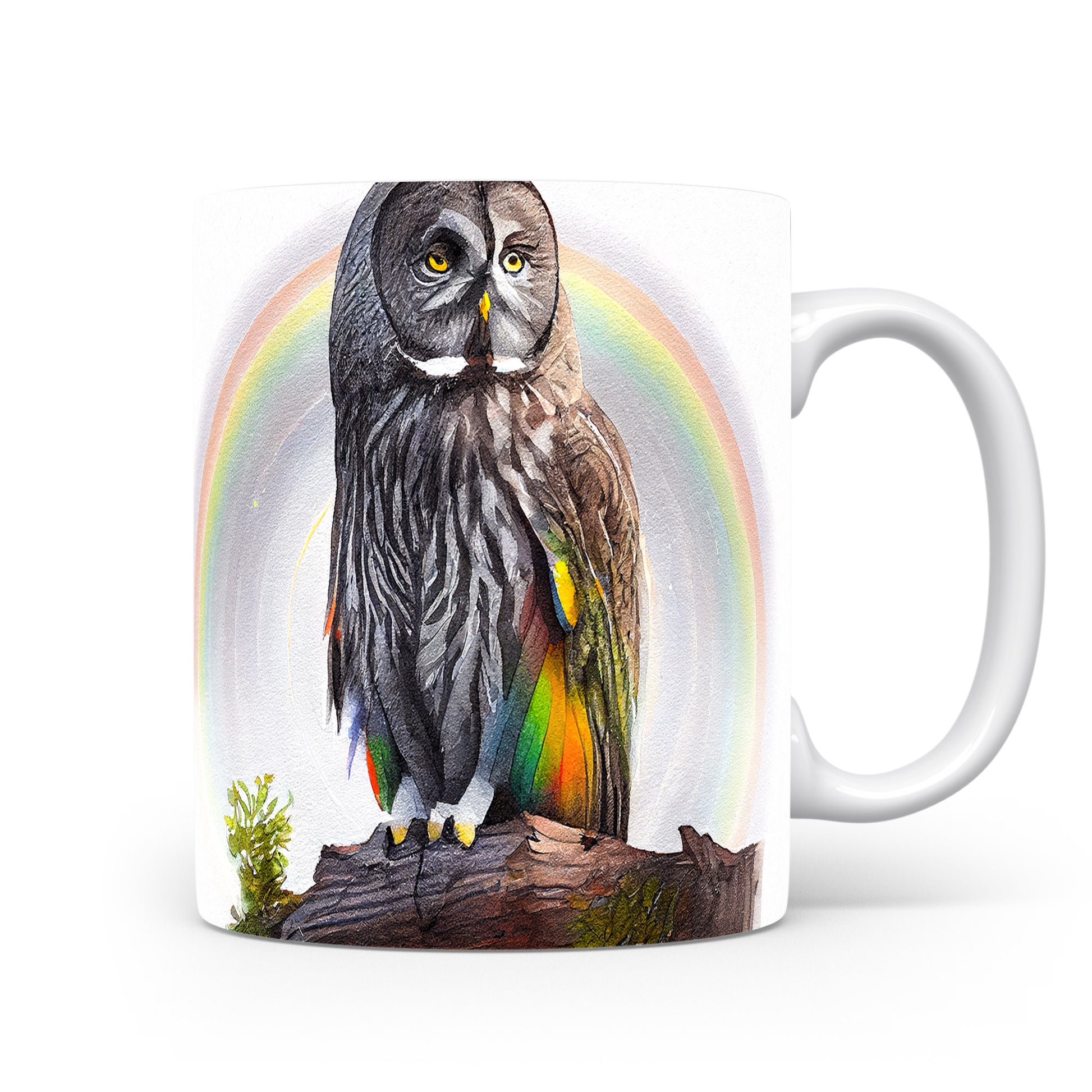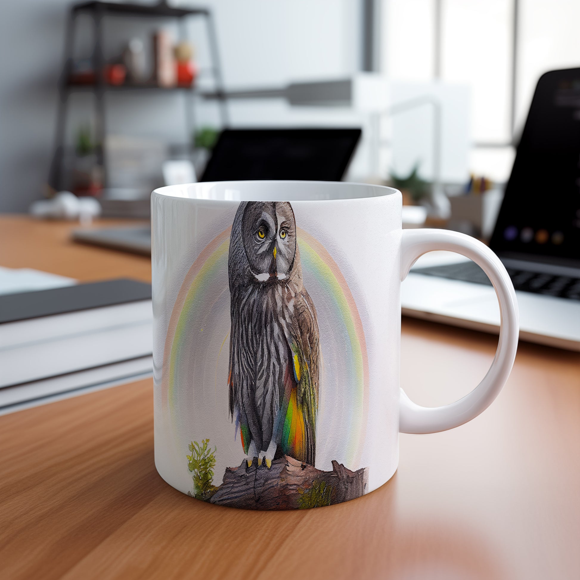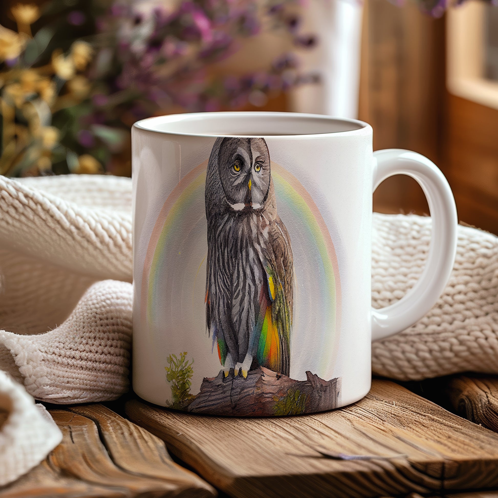 Hrnek s malbou sovy na pozadí duhy