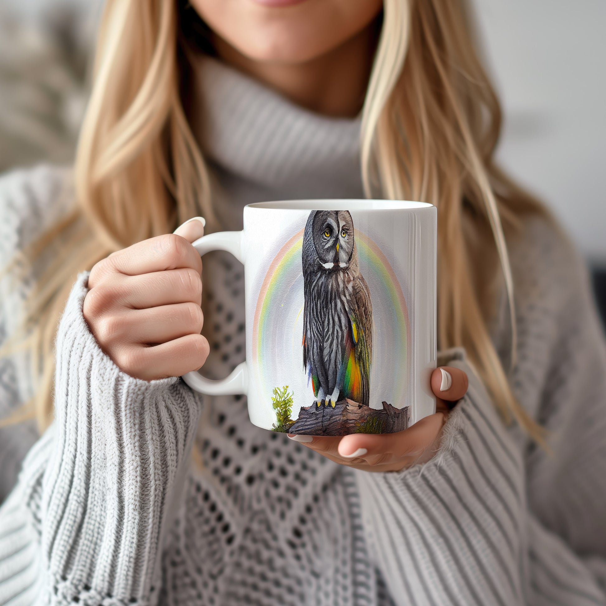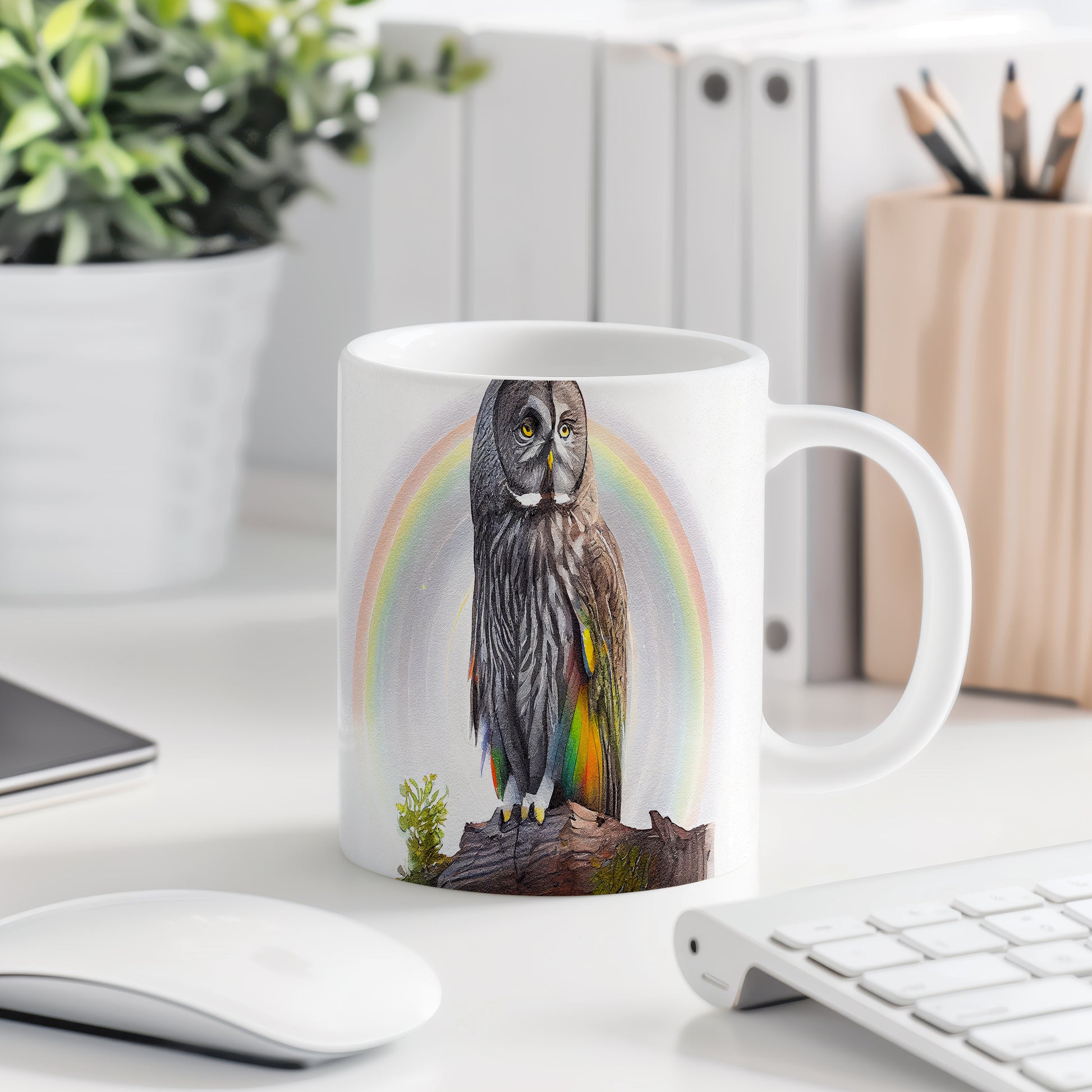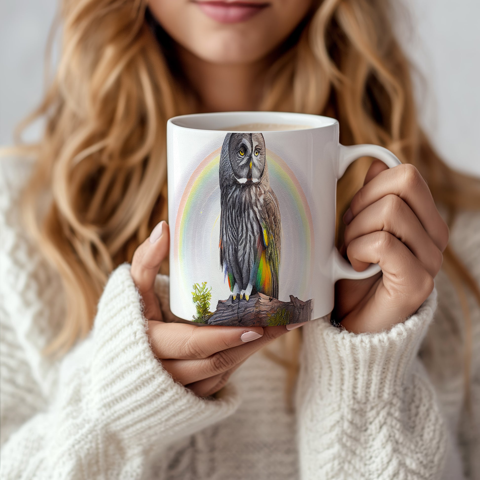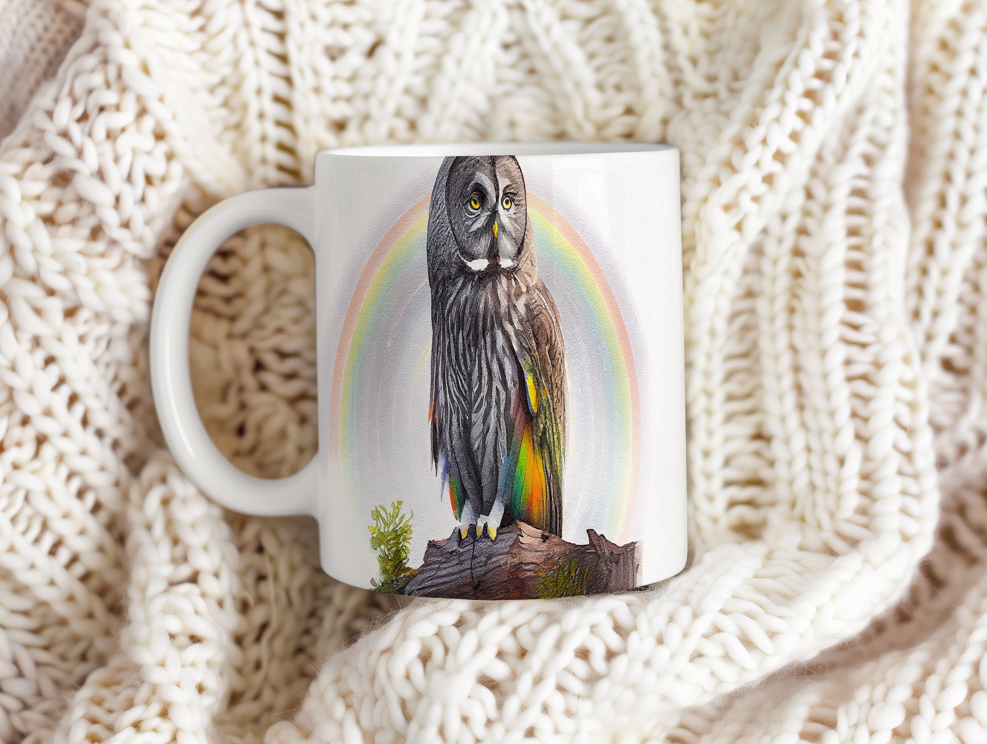 Hrnek s malbou sovy na pozadí duhy