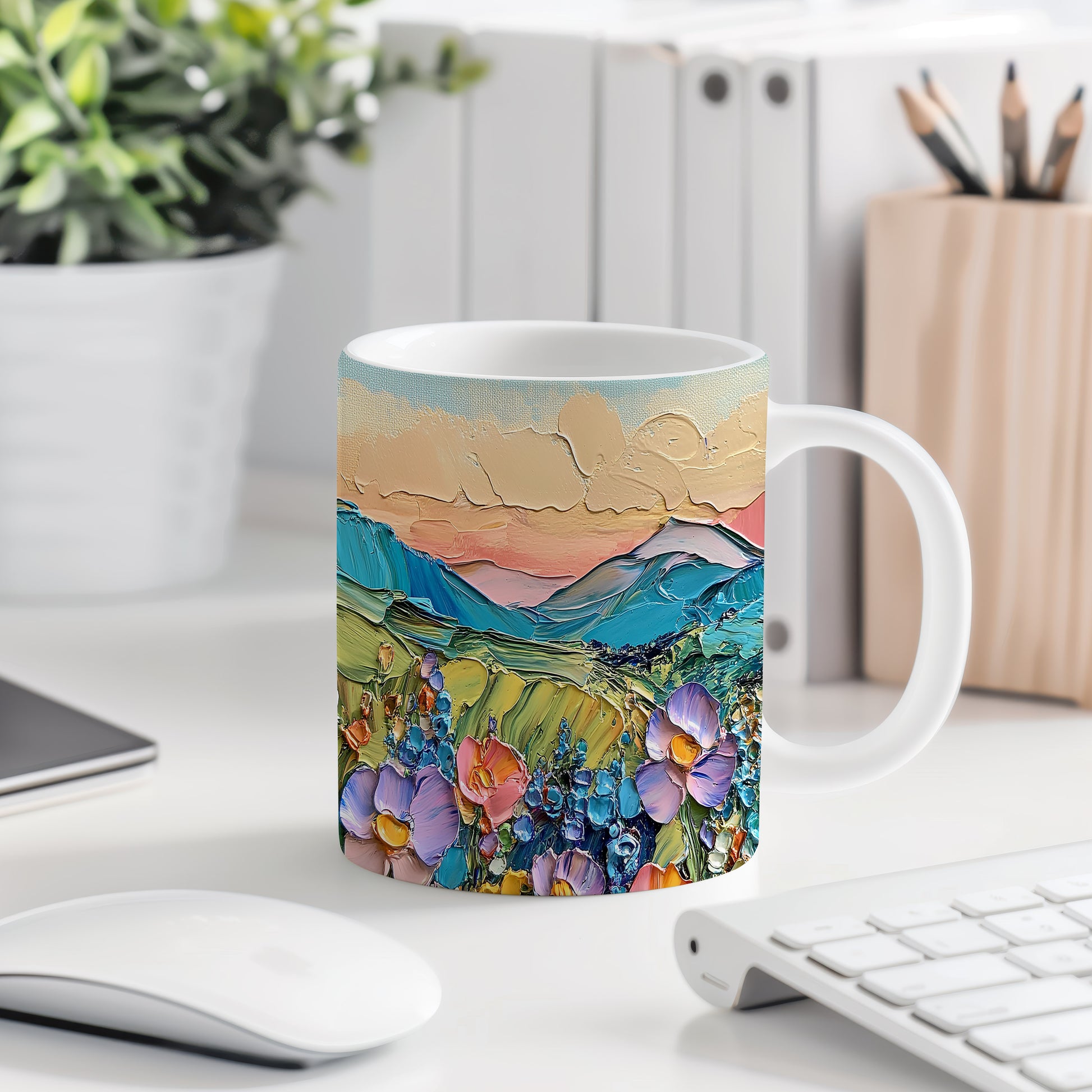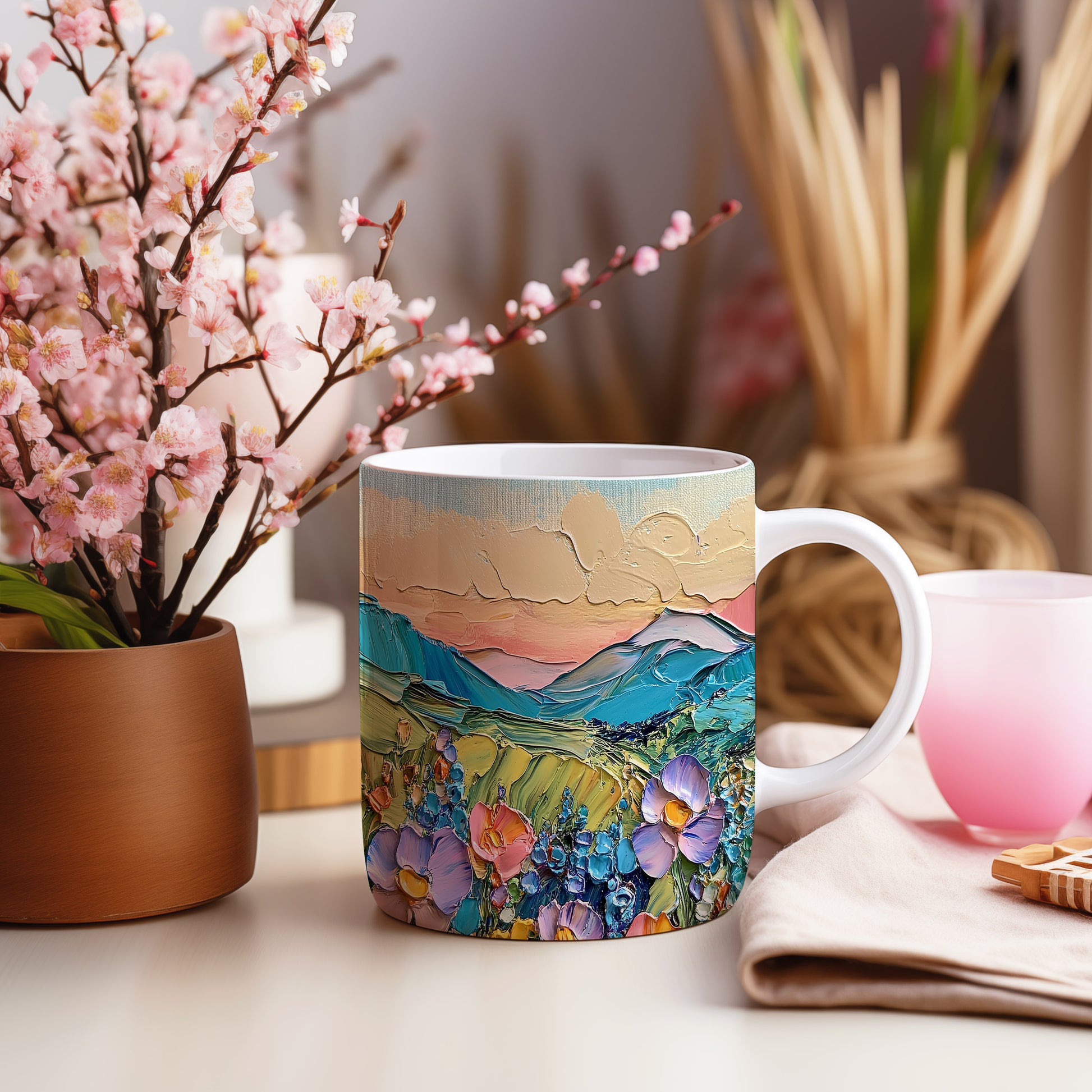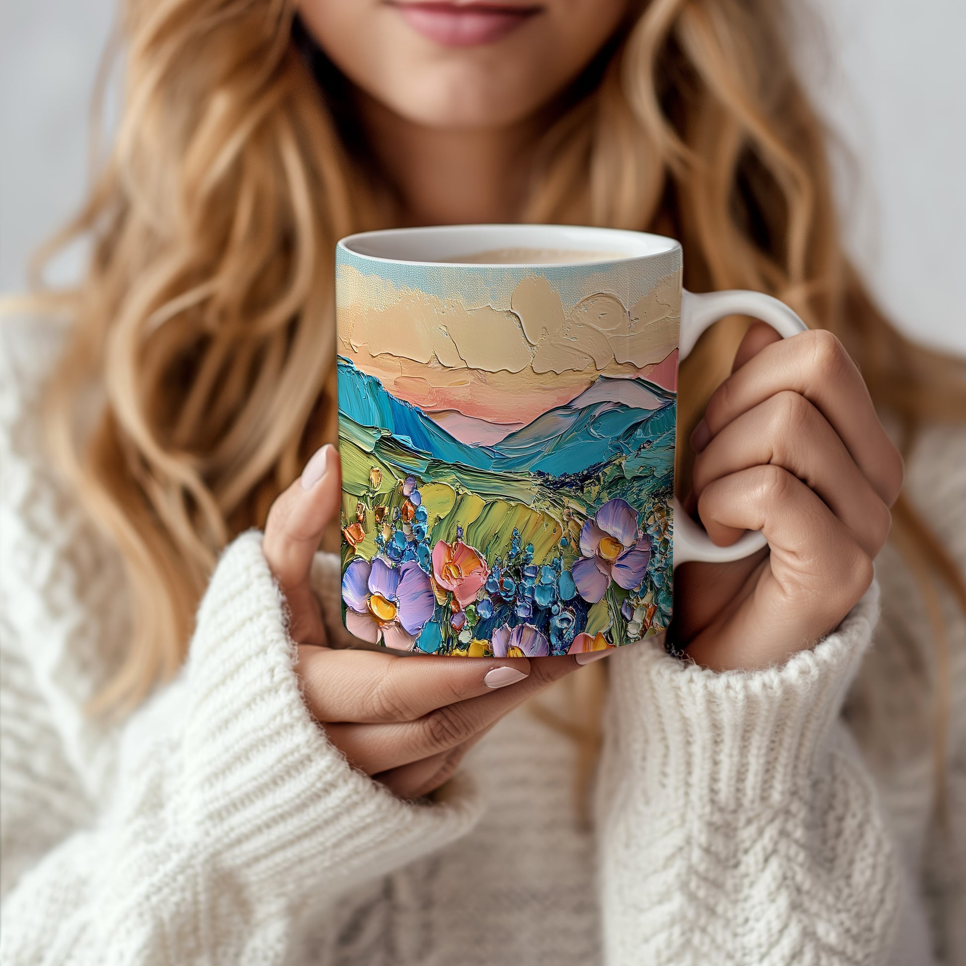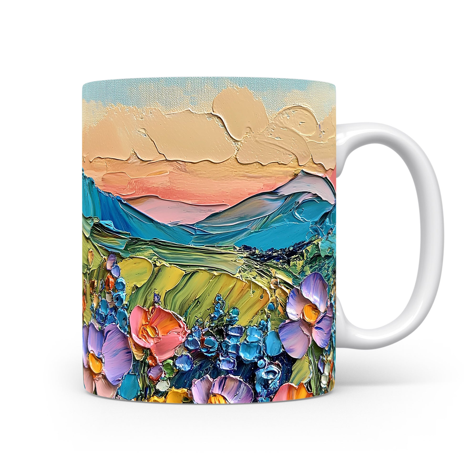 Hrnek s malebnou krajinou a květinami je skvělým kouskem pro milovníky přírody a krásných výhledů. Tento hrnek je ideální jako dárek pro přátele nebo rodinu, kteří ocení estetiku a pohodlí. Materiál: keramika. Objem: 330 ml. Vhodné do myčky i mikrovlnky. Díky svému designu přináší do každého dne radost a pohodu.