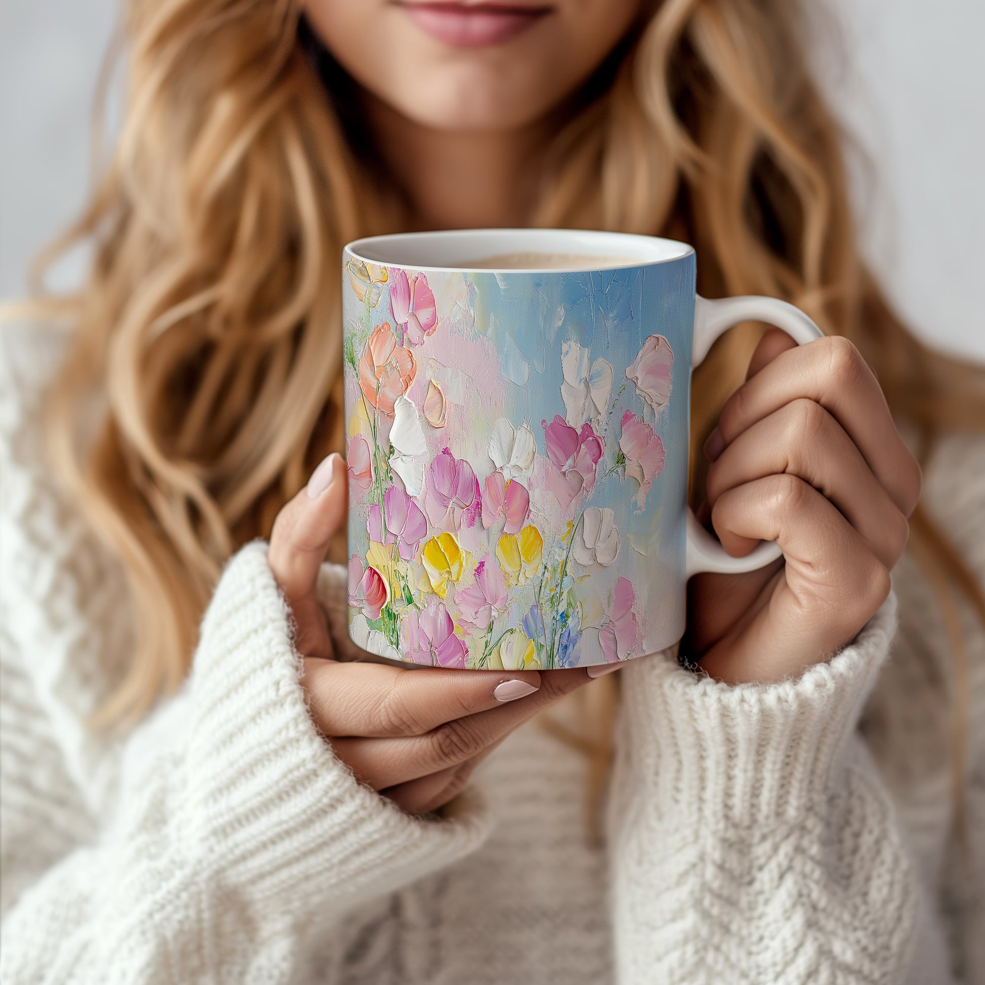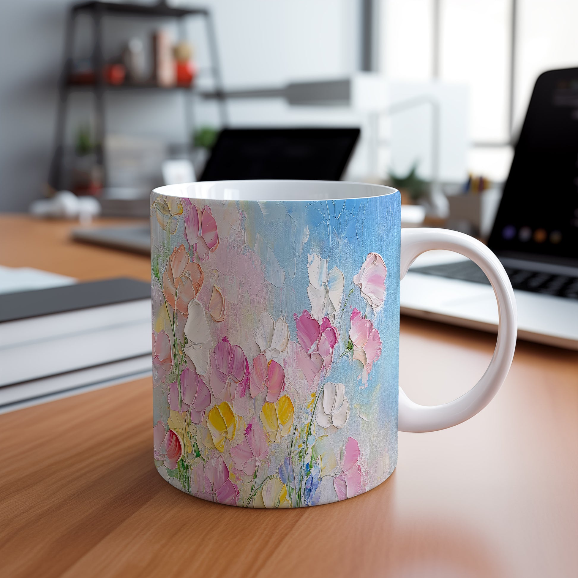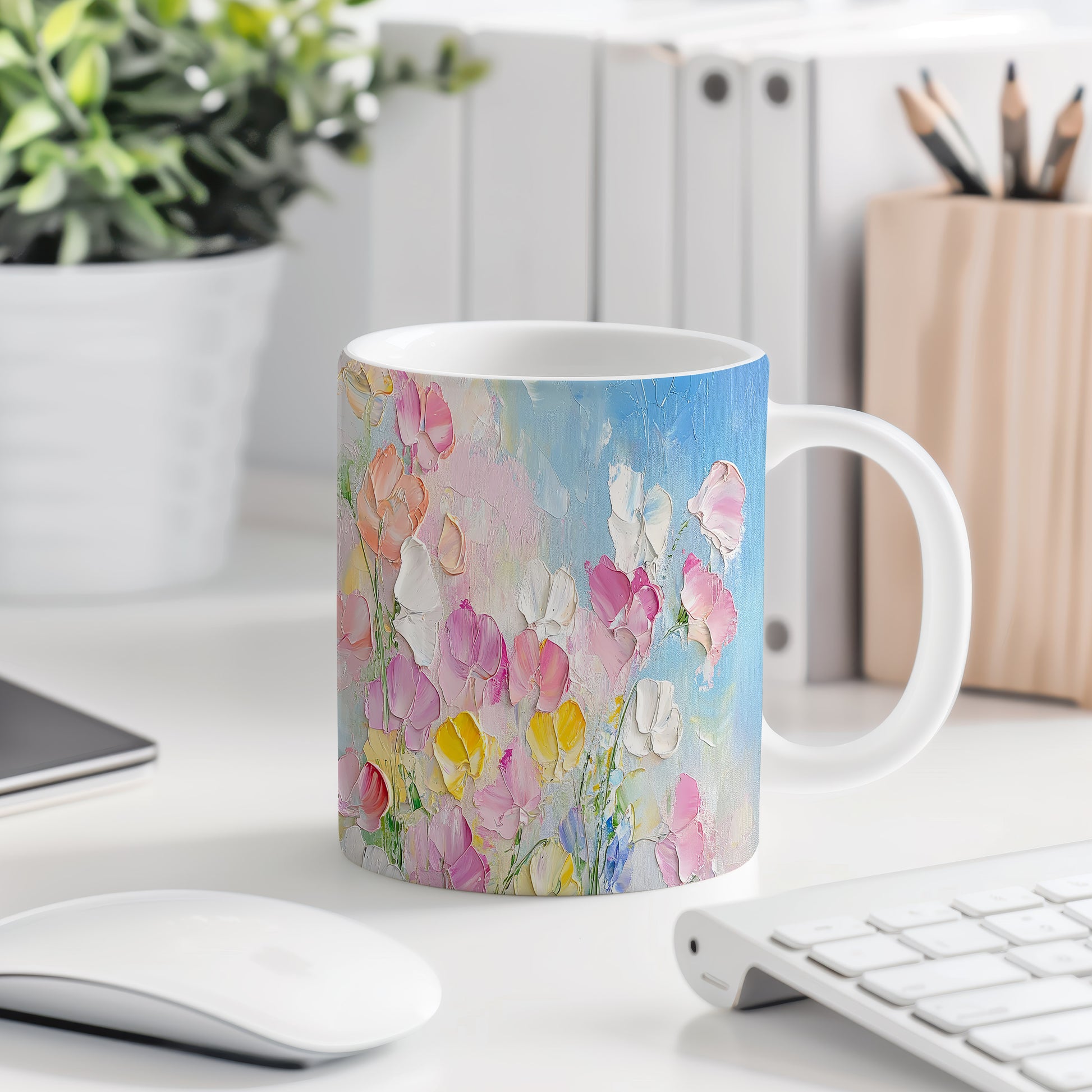 Hrnek s malebnými květinami v modrých tónech