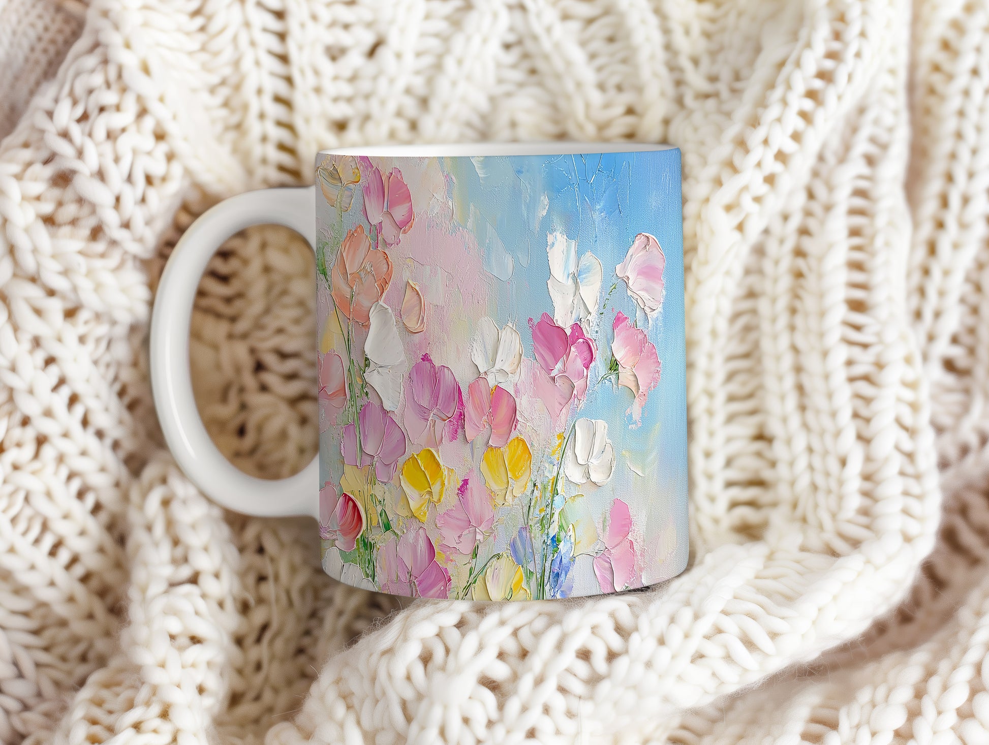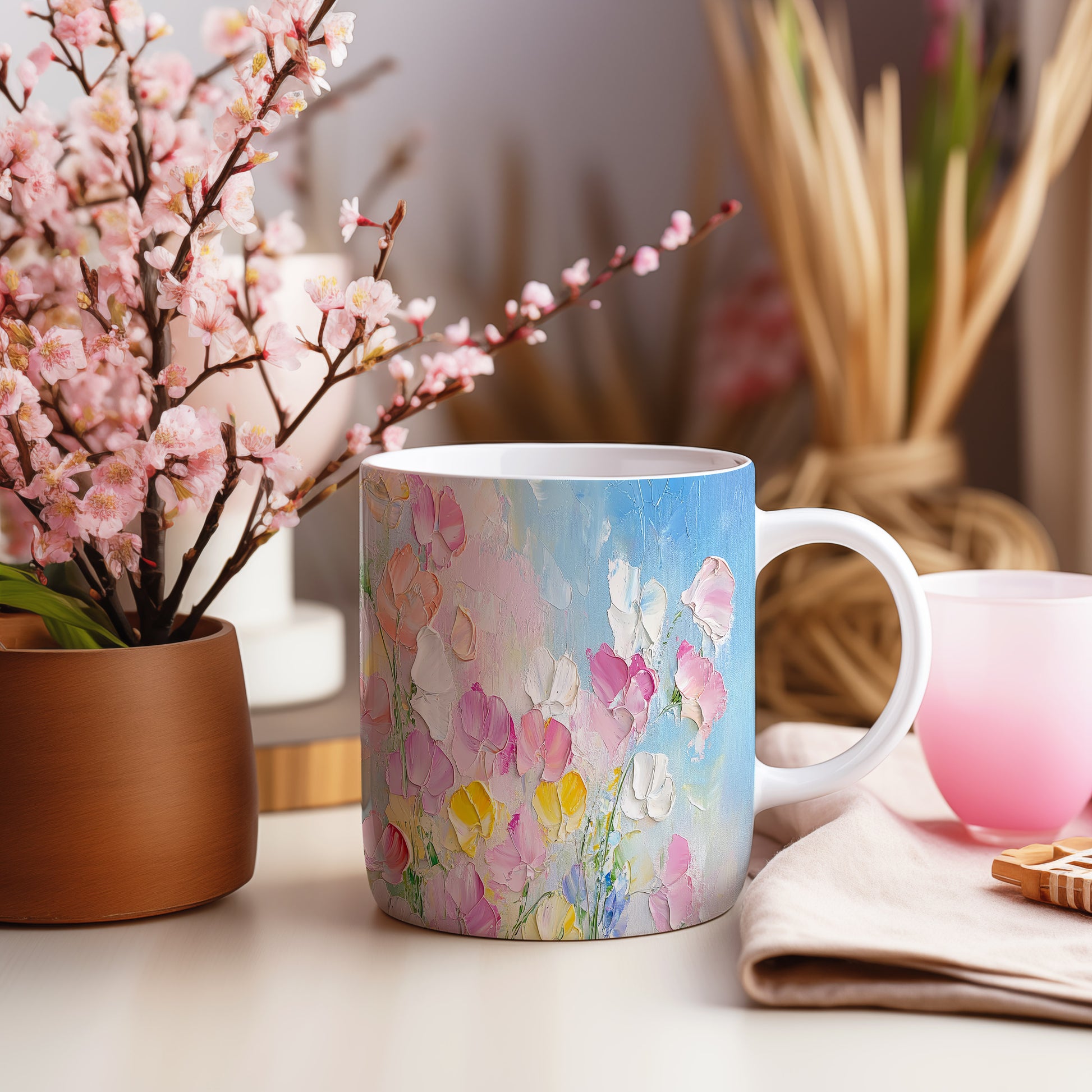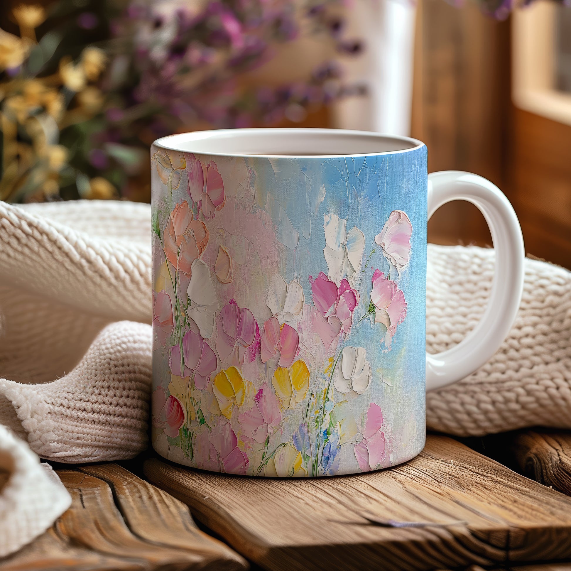 Hrnek s malebnými květinami v modrých tónech