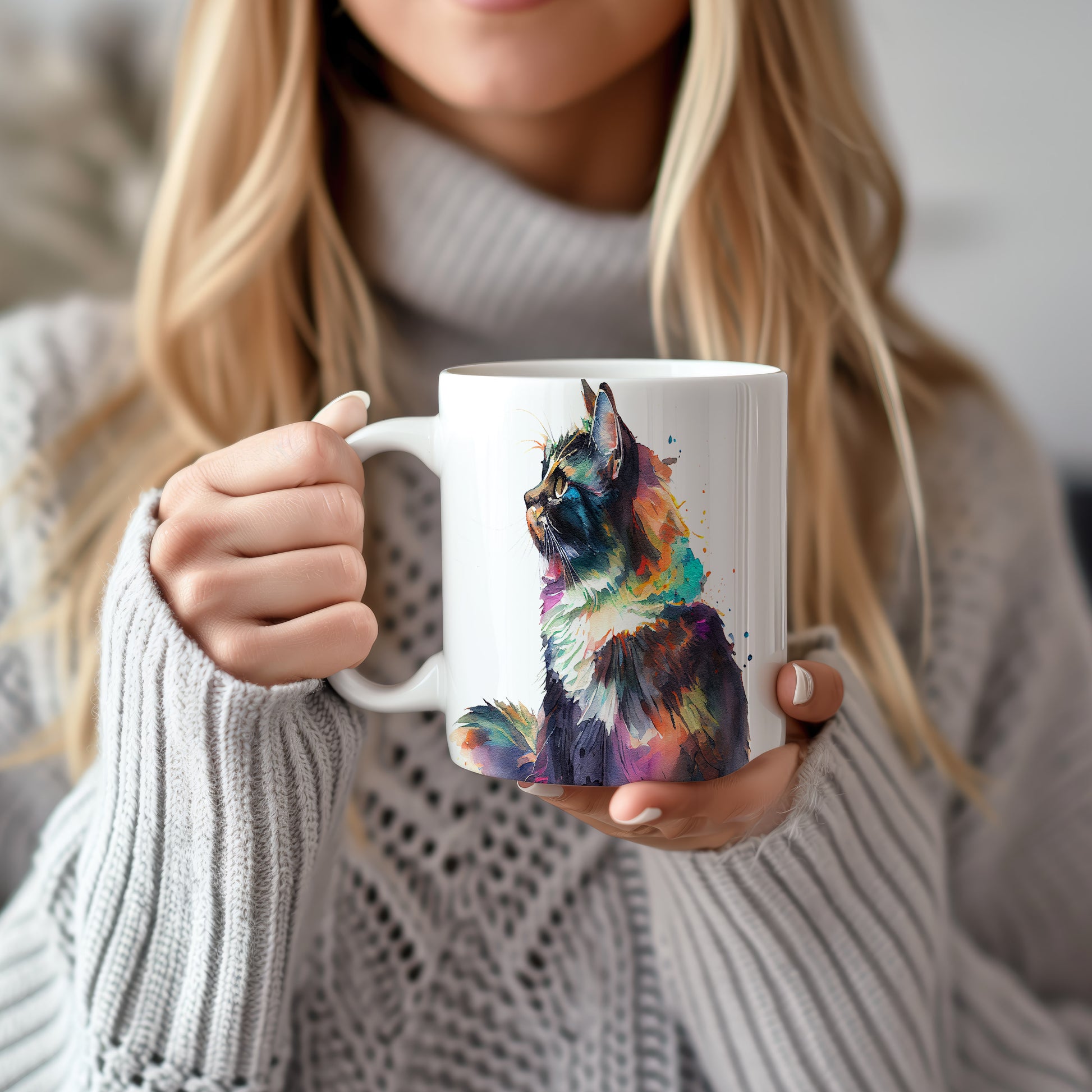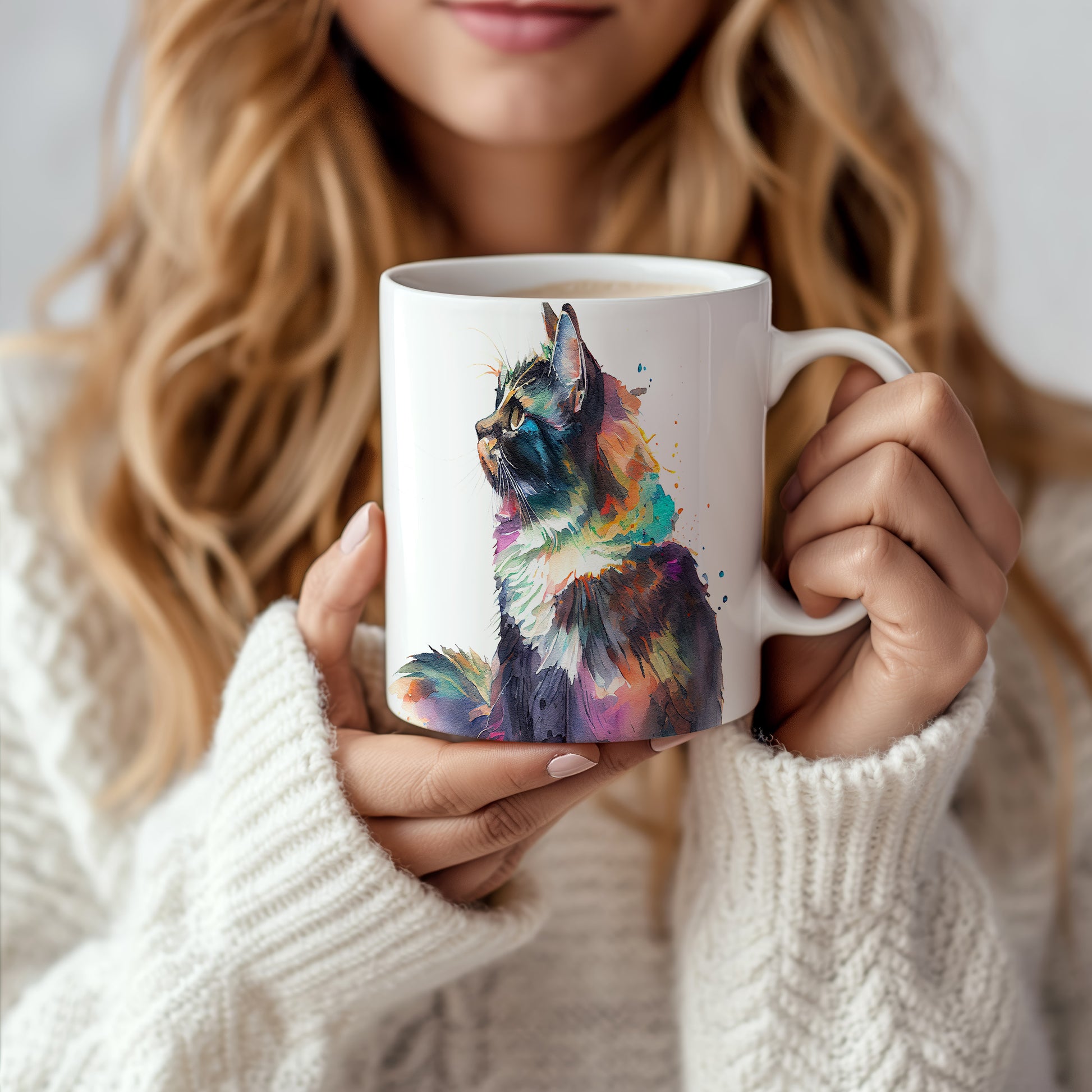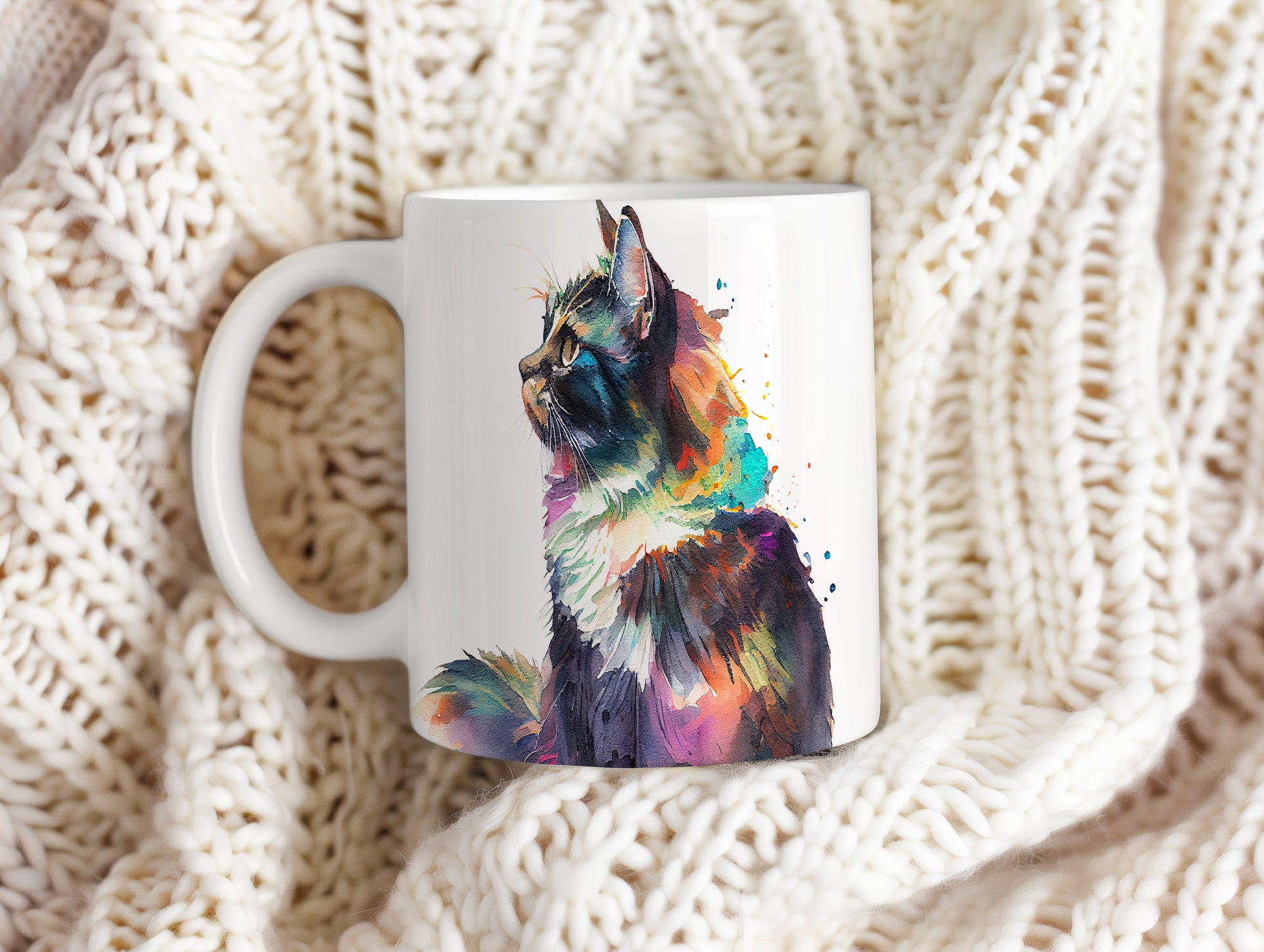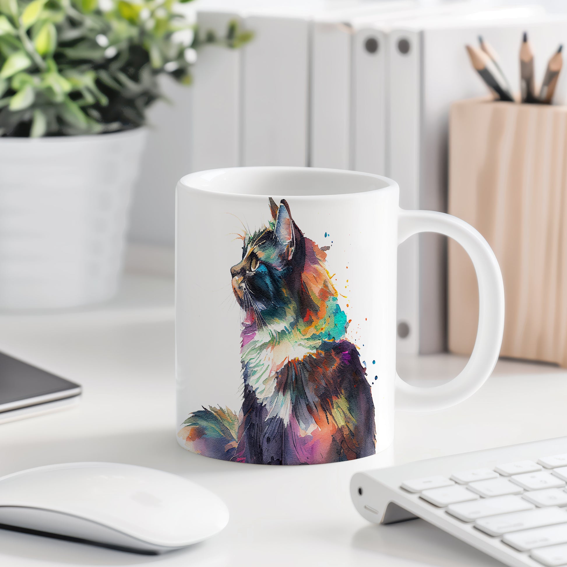 Tento hrnek je zdoben barevným akvarelovým motivem kočky, která se dívá na stranu. Je ideální pro milovníky zvířat a potěší každého, kdo má rád kočky. Materiál: keramika. Objem: 330 ml. Vhodné do myčky i mikrovlnky. Používání tohoto hrnku přináší radost a útulnost do každého dne.