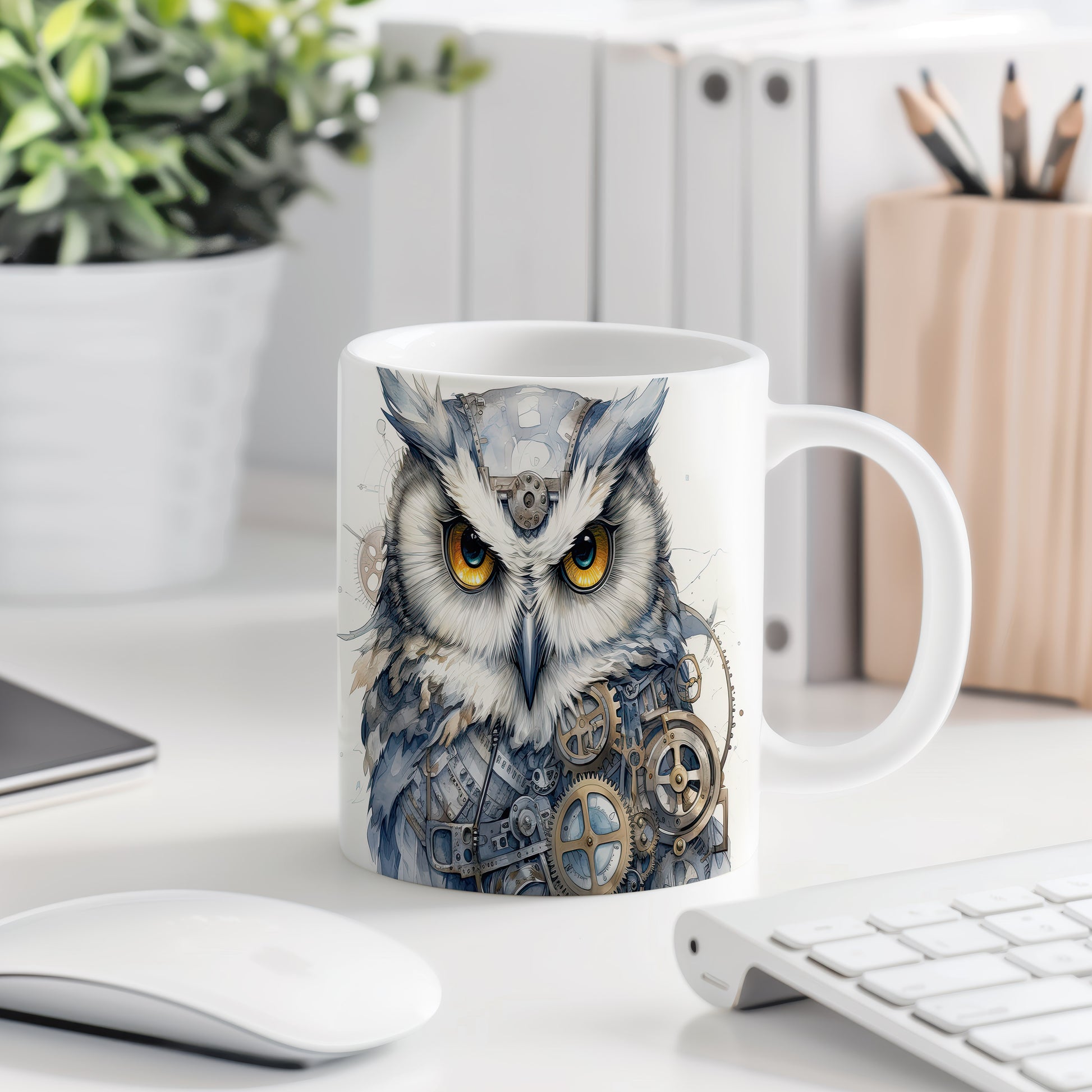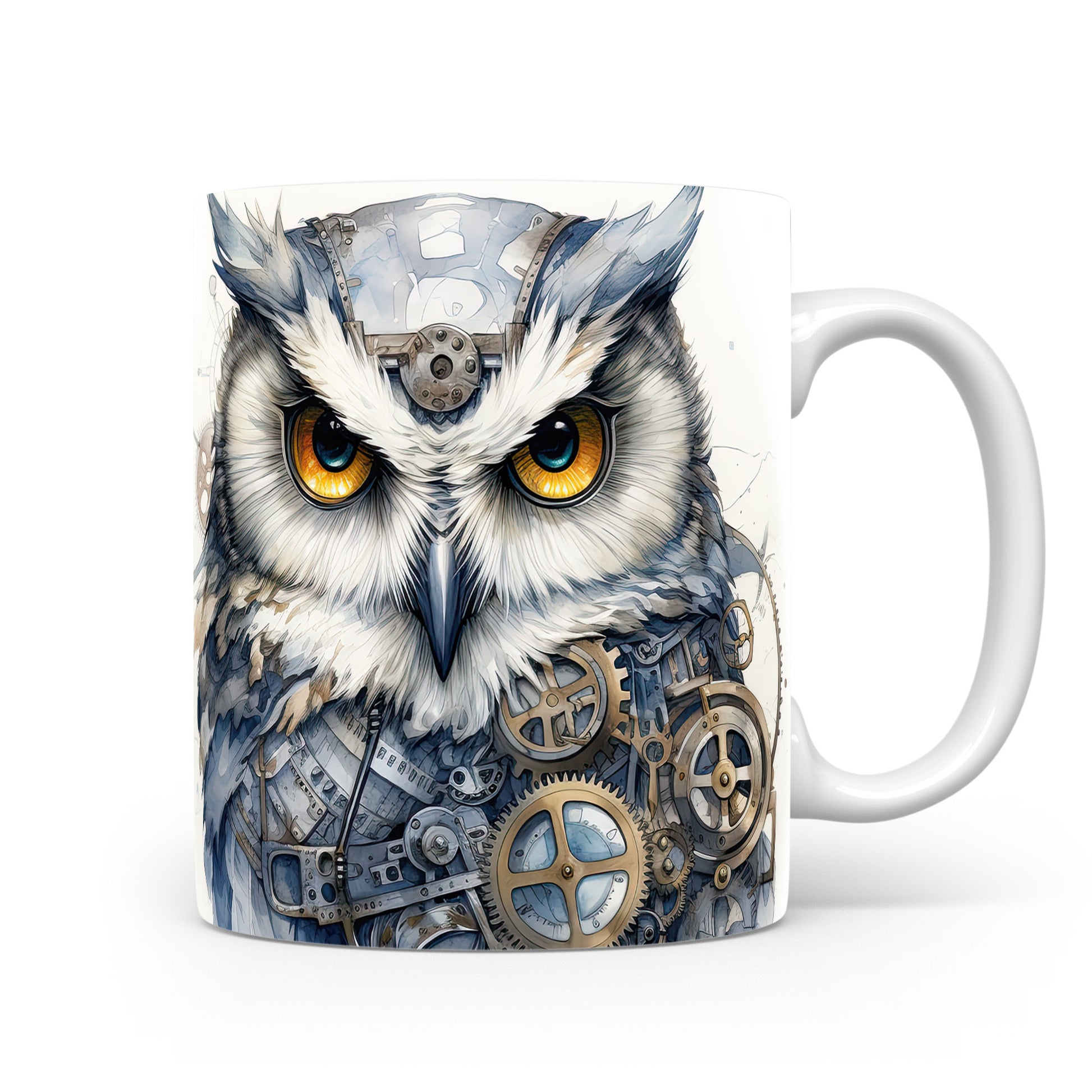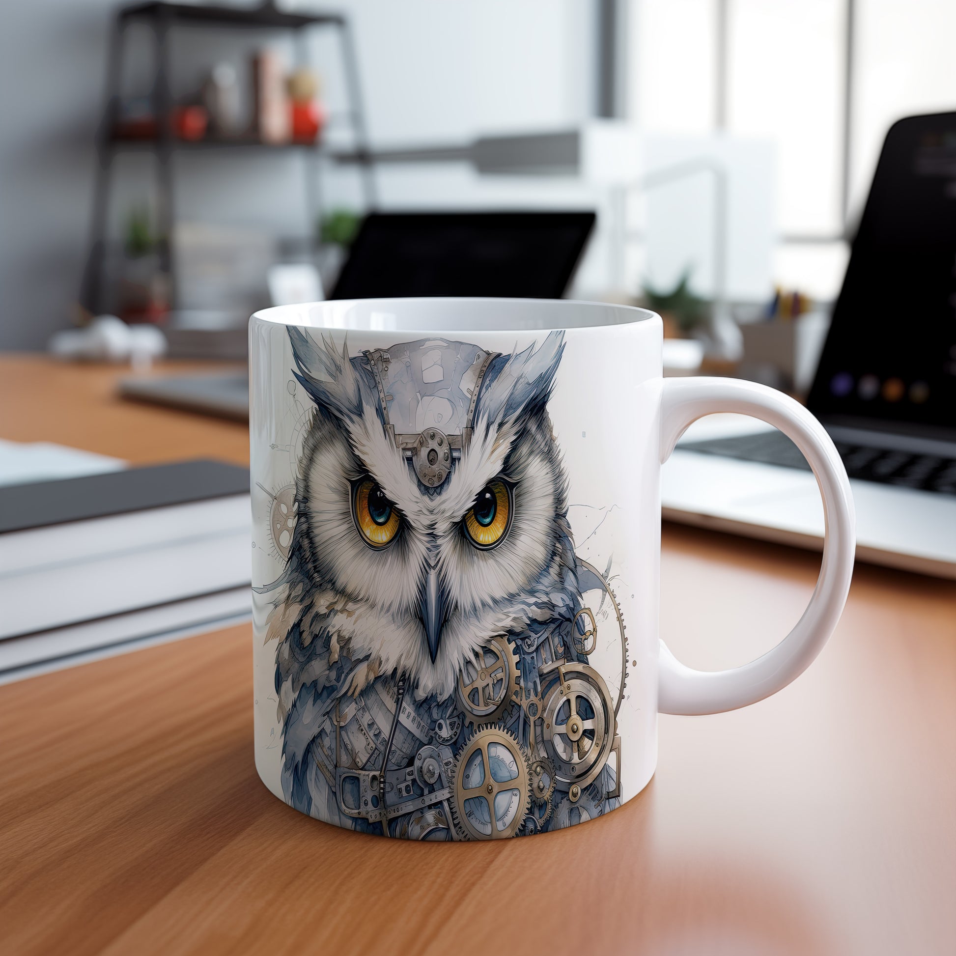 Tento hrnek zobrazuje mechanickou sovu s výraznýma očima a stylizovanými ozubenými koly. Je ideální pro milovníky ptáků a originálního designu, skvělý tip na dárek pro kreativní duše. Materiál: keramika. Objem: 330 ml. Vhodné do myčky i mikrovlnky. Používáním tohoto hrnku si užijete nejen stylový vzhled, ale i praktické využití.