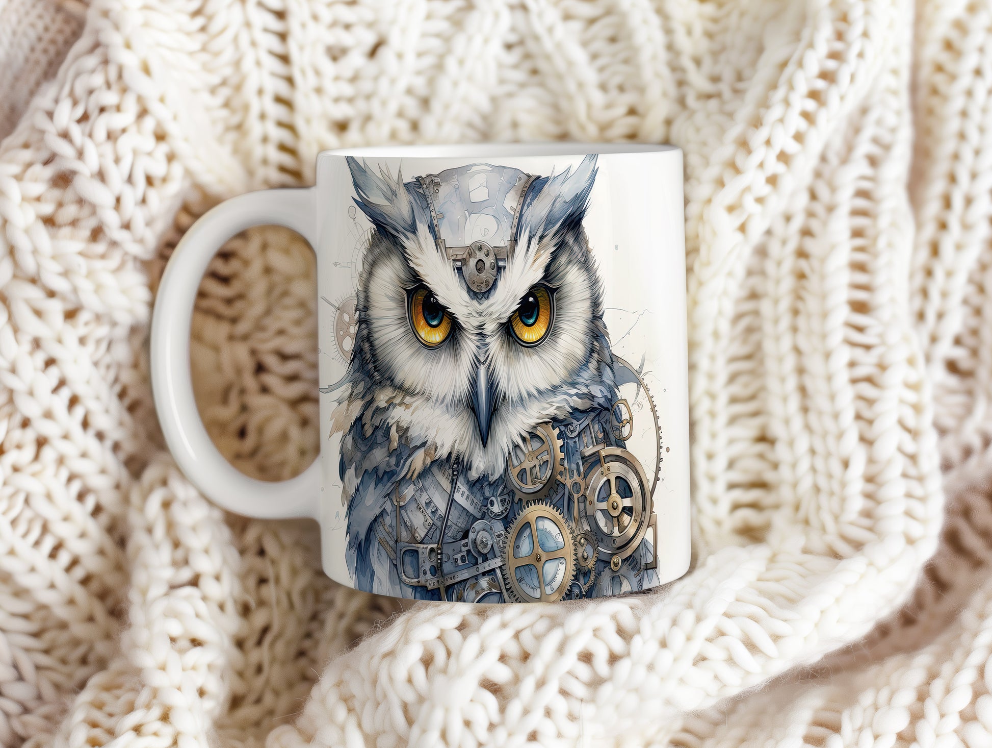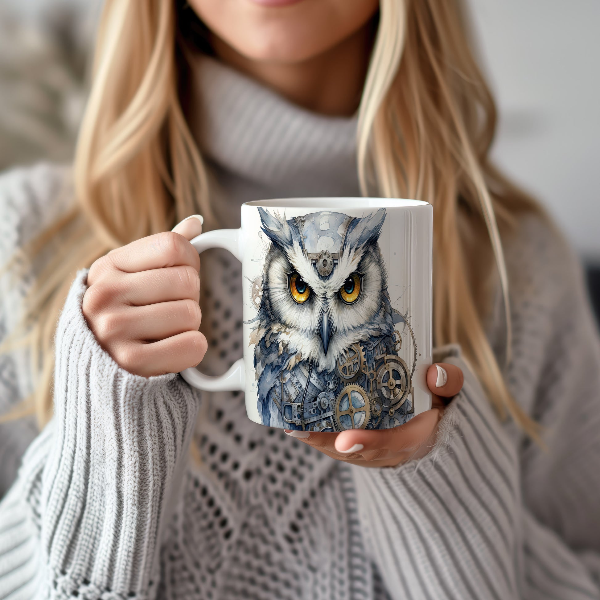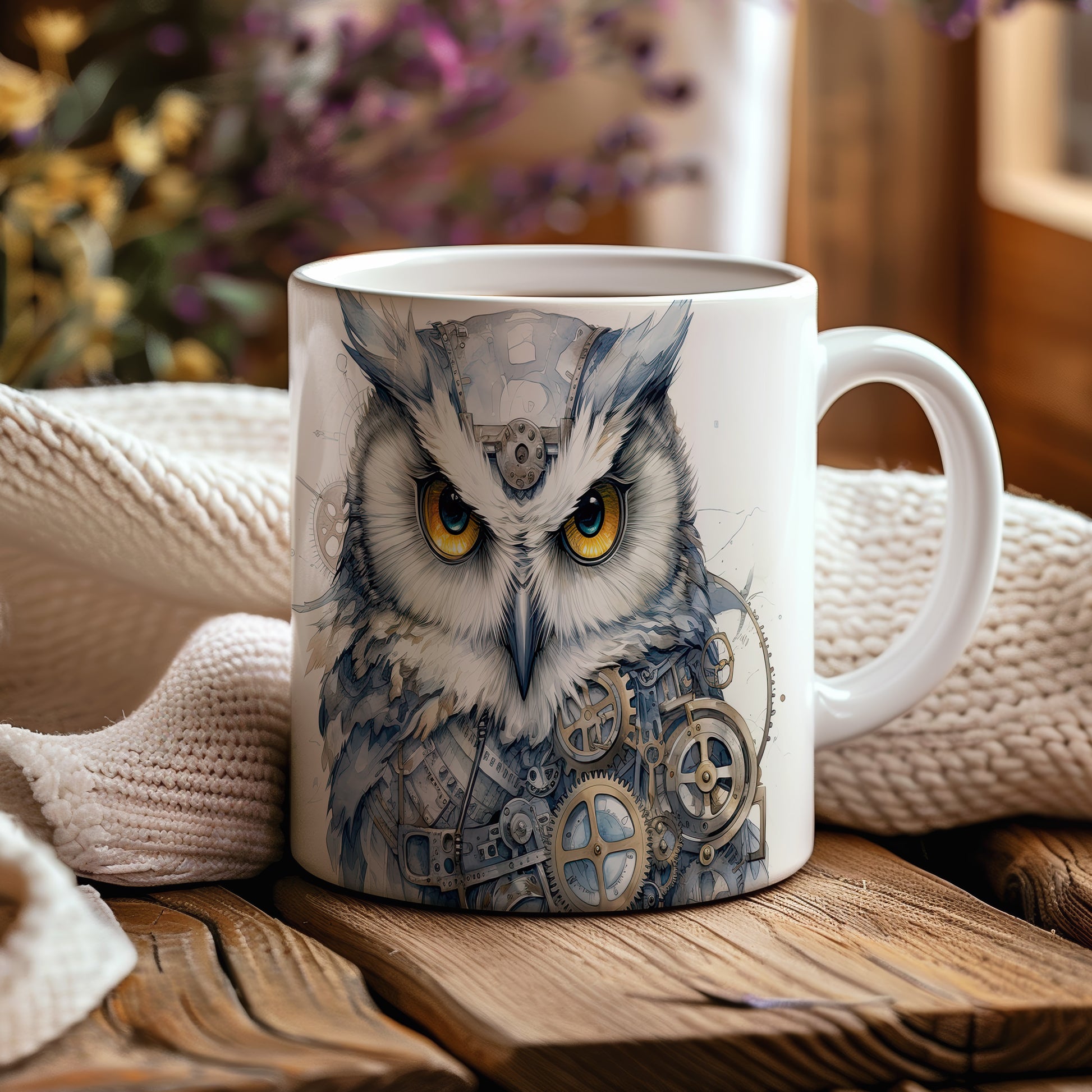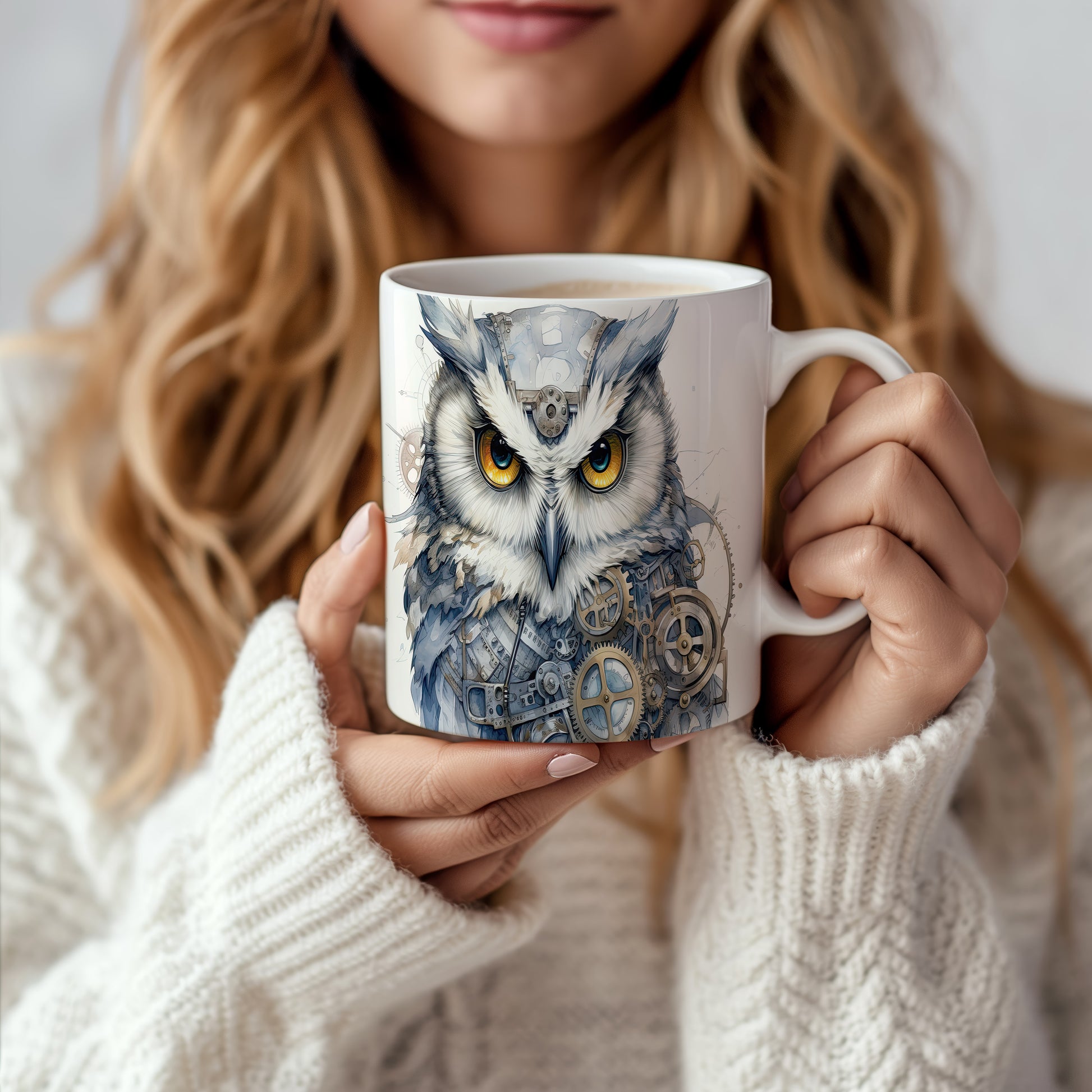Tento hrnek zobrazuje mechanickou sovu s výraznýma očima a stylizovanými ozubenými koly. Je ideální pro milovníky ptáků a originálního designu, skvělý tip na dárek pro kreativní duše. Materiál: keramika. Objem: 330 ml. Vhodné do myčky i mikrovlnky. Používáním tohoto hrnku si užijete nejen stylový vzhled, ale i praktické využití.