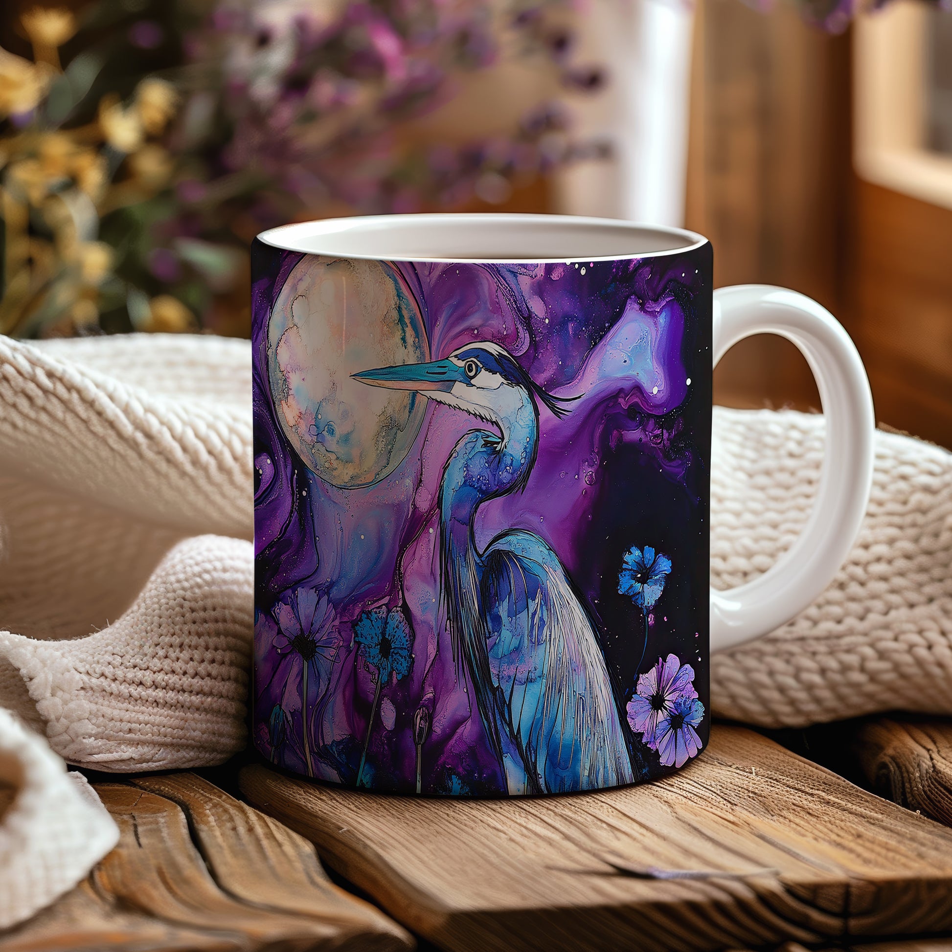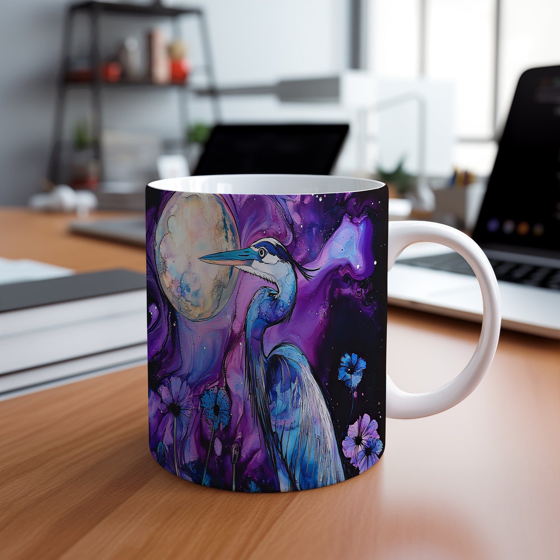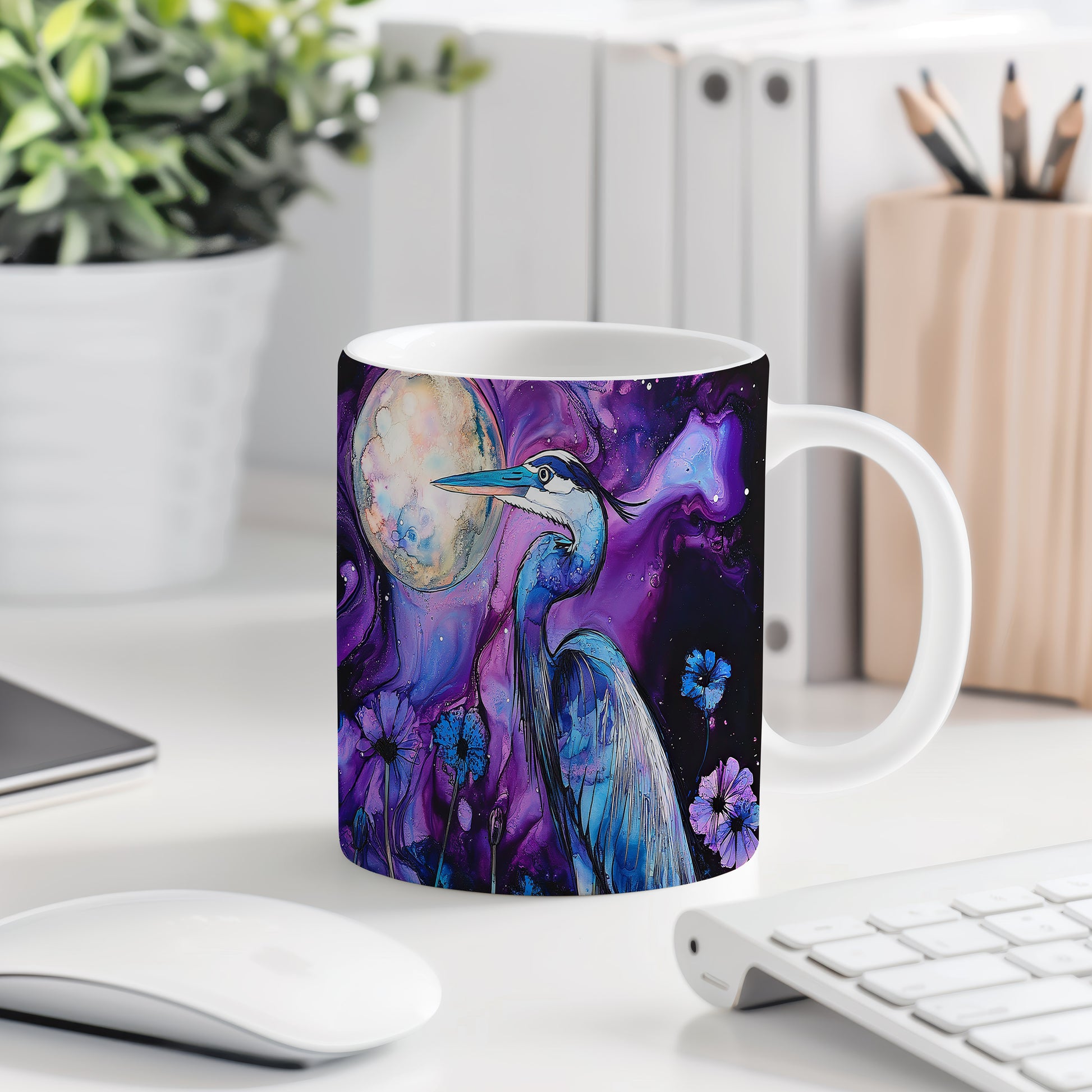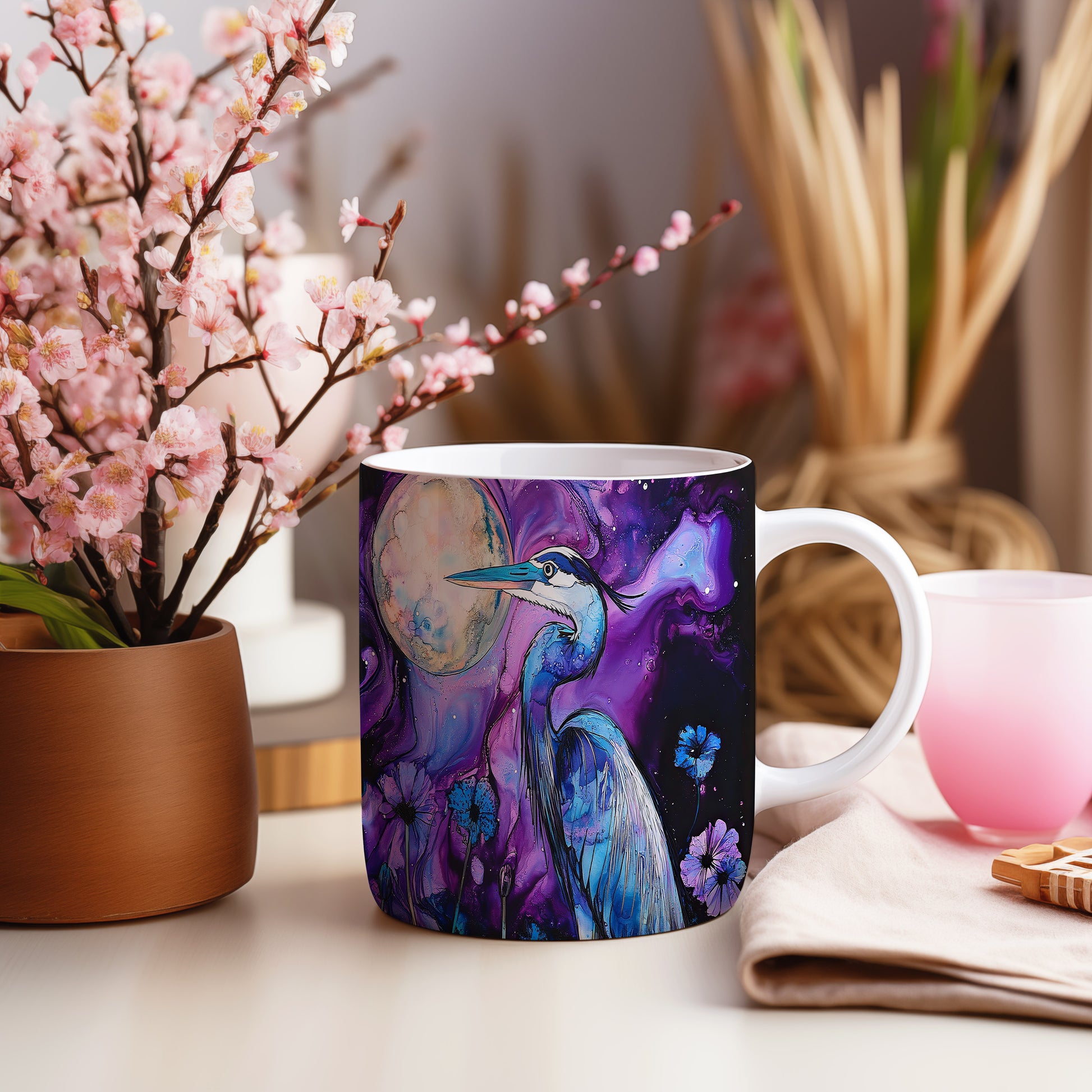 Tento hrnek zobrazuje elegantního modrého jeřába v harmonickém stylu. Je ideální pro milovníky přírody a originálních designů, skvělý tip na dárek pro přátele nebo rodinu. Materiál: keramika. Objem: 330 ml. Vhodné do myčky i mikrovlnky. Užívejte si svůj oblíbený nápoj s tímto stylovým hrnkem.