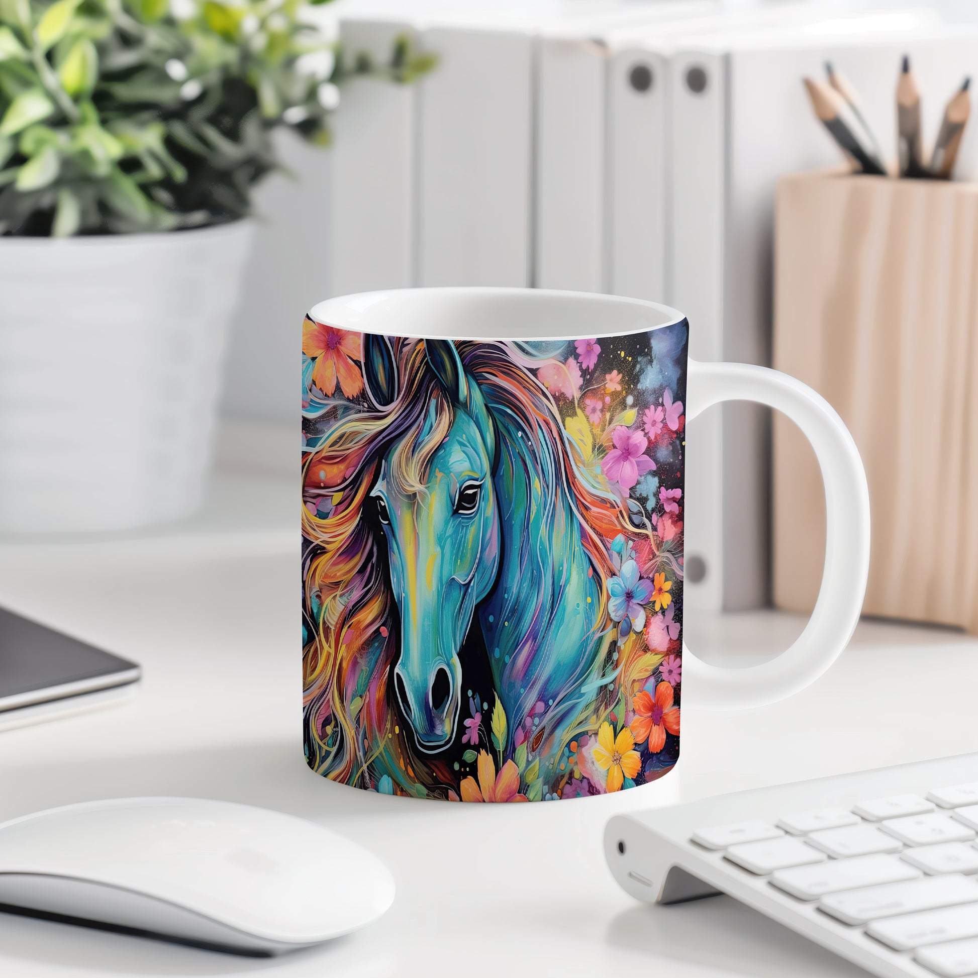 Tento keramický hrnek s motivem modrého koně přináší do vaší sbírky nádech přírody. Je ideální pro milovníky koní a skvělým dárkem pro přátele či rodinu. Materiál: keramika. Objem: 330 ml. Vhodné do myčky i mikrovlnky. Díky svému designu se stane oblíbeným společníkem při každém doušku vašeho oblíbeného nápoje.