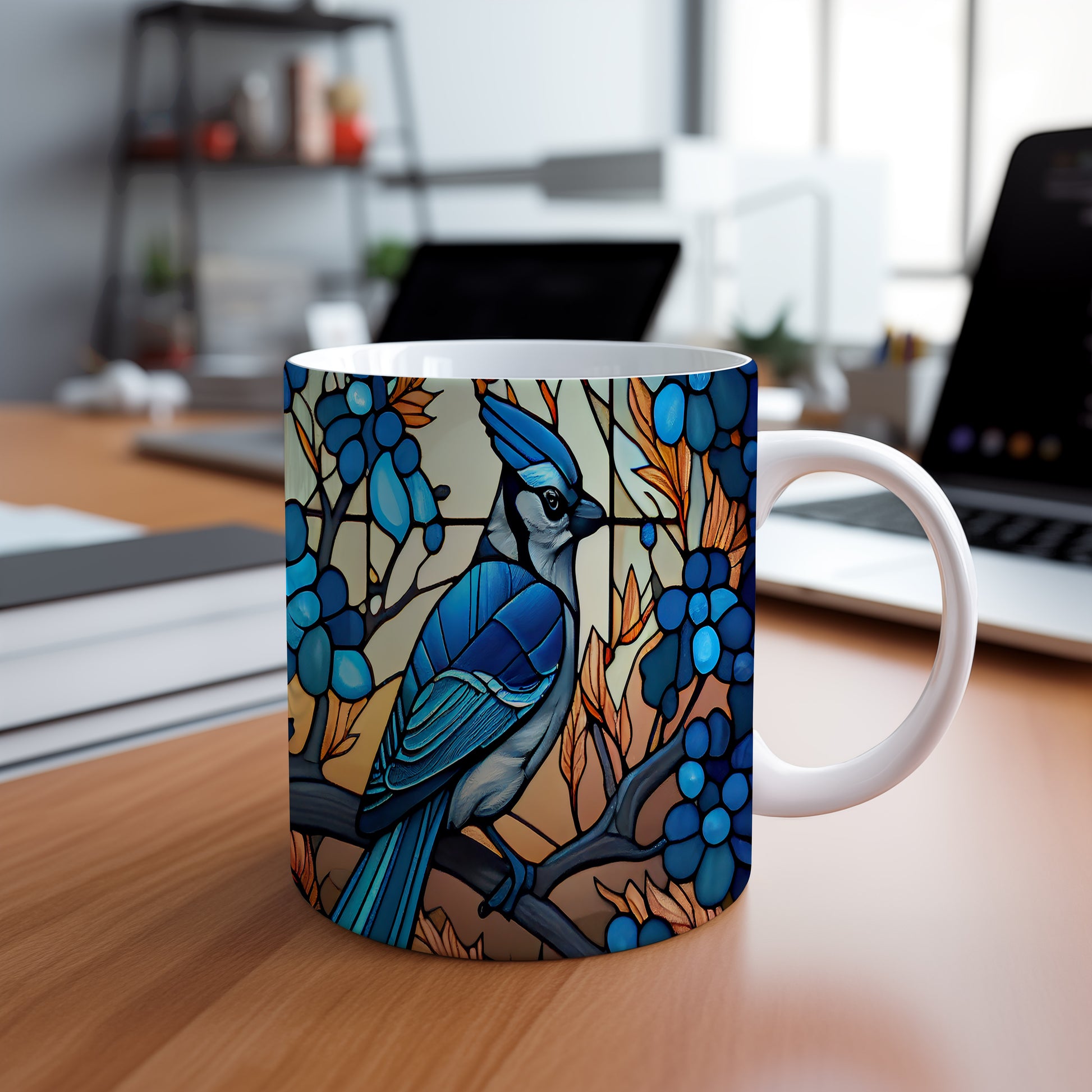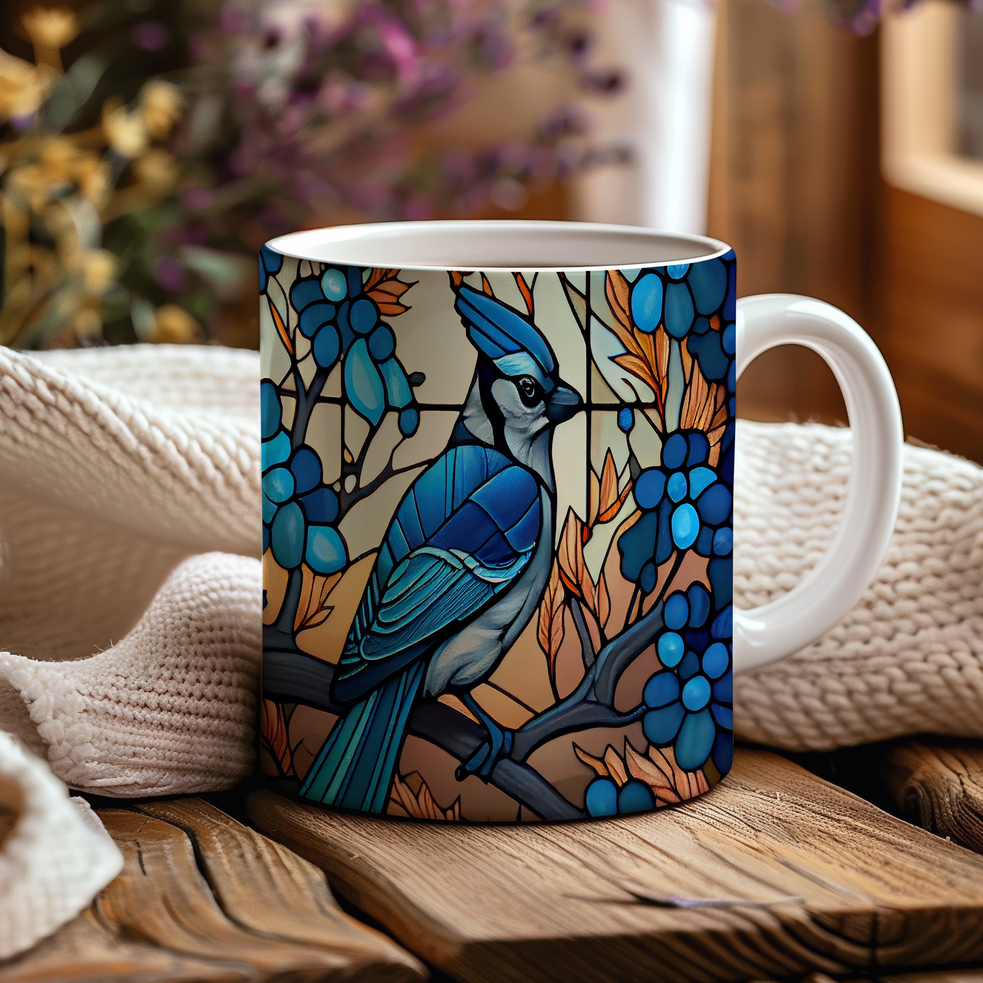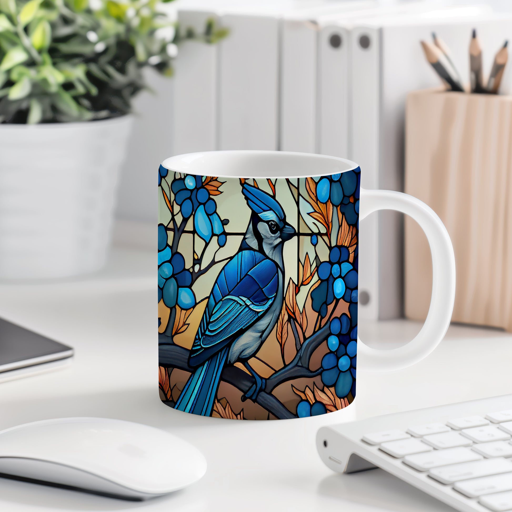 Hrnek s modrým ptákem a barevnými listy v přírodním stylu