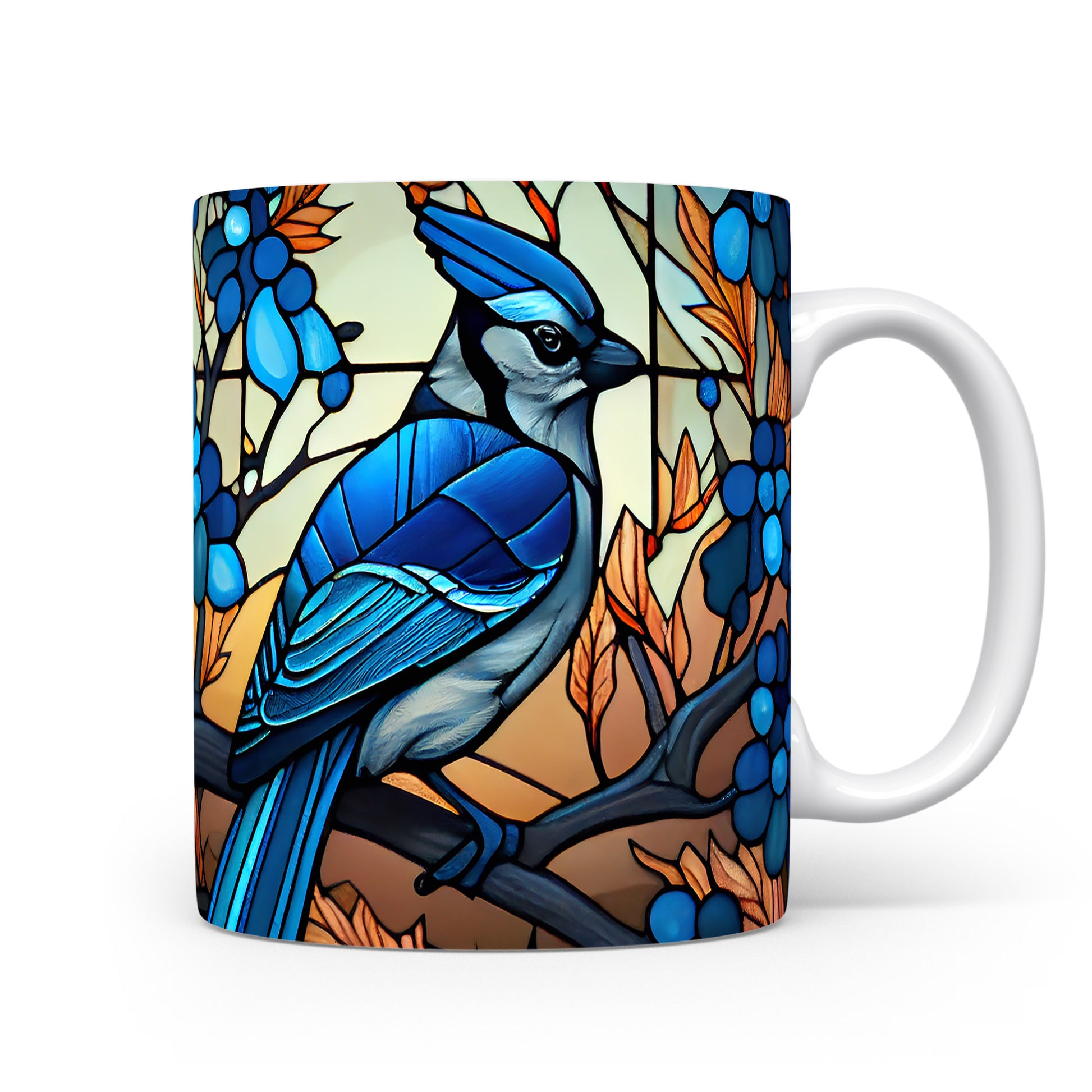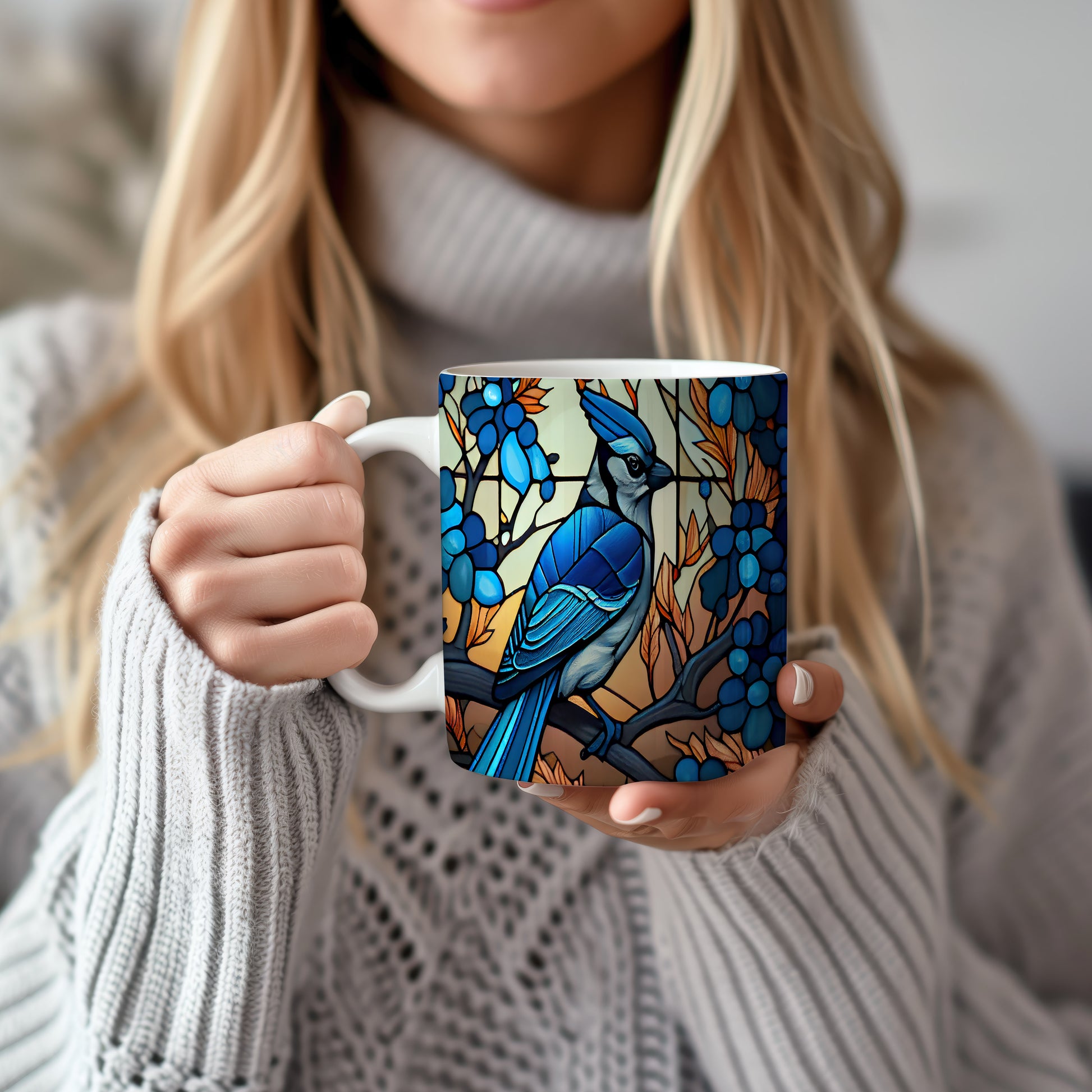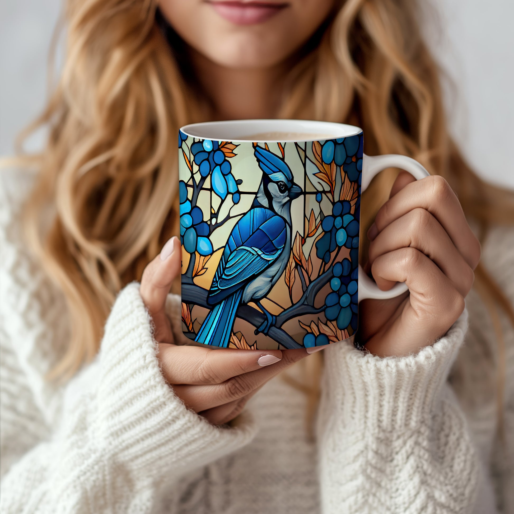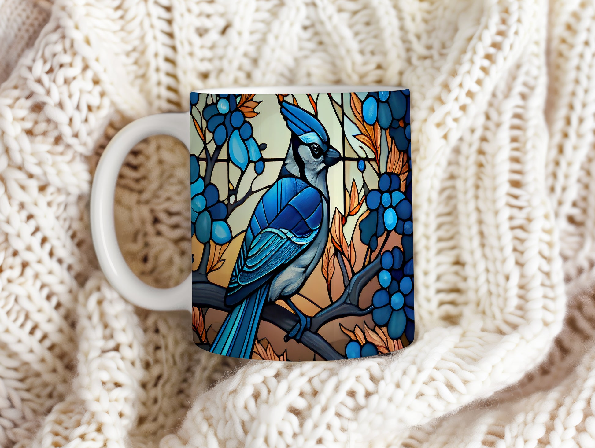Hrnek s modrým ptákem a barevnými listy v přírodním stylu
