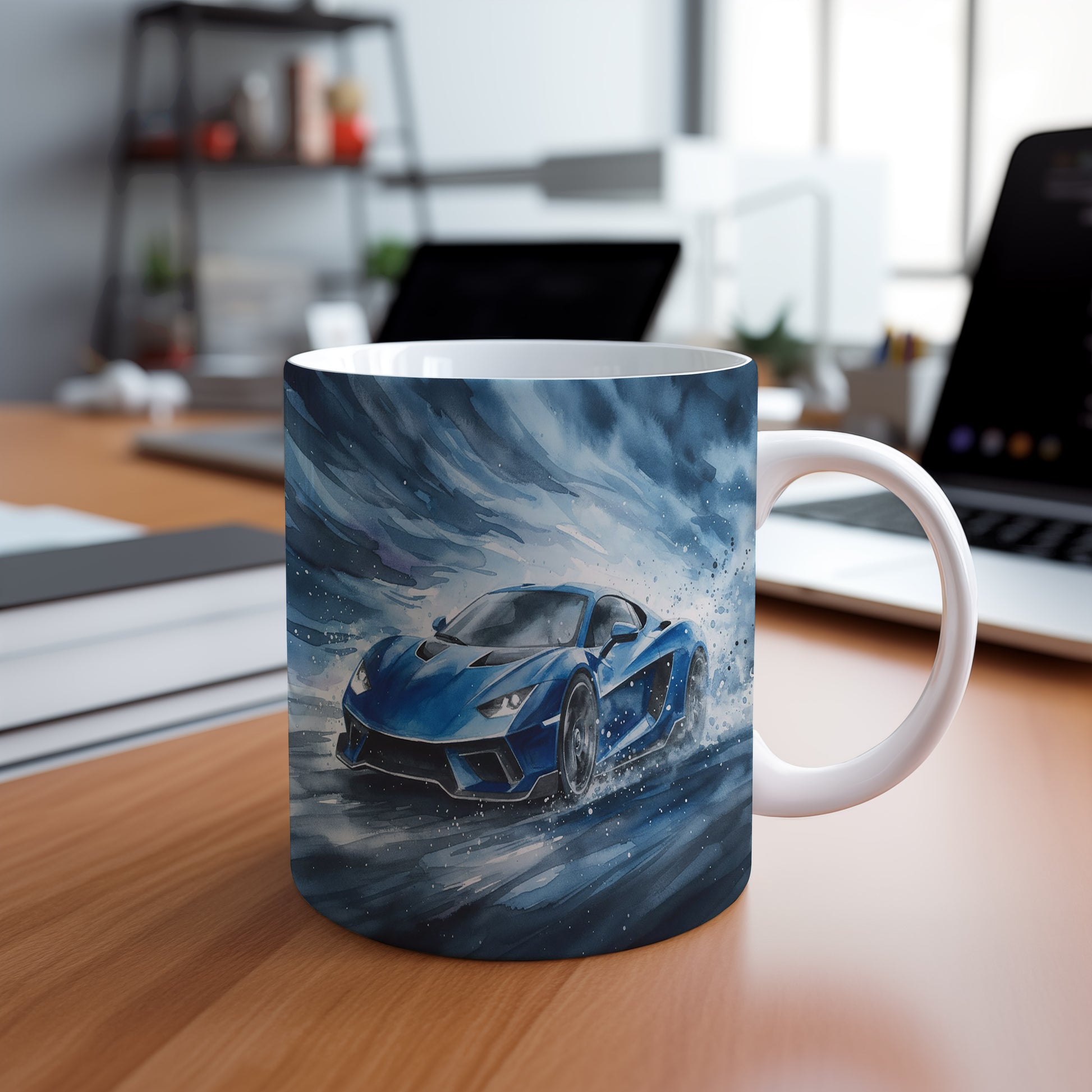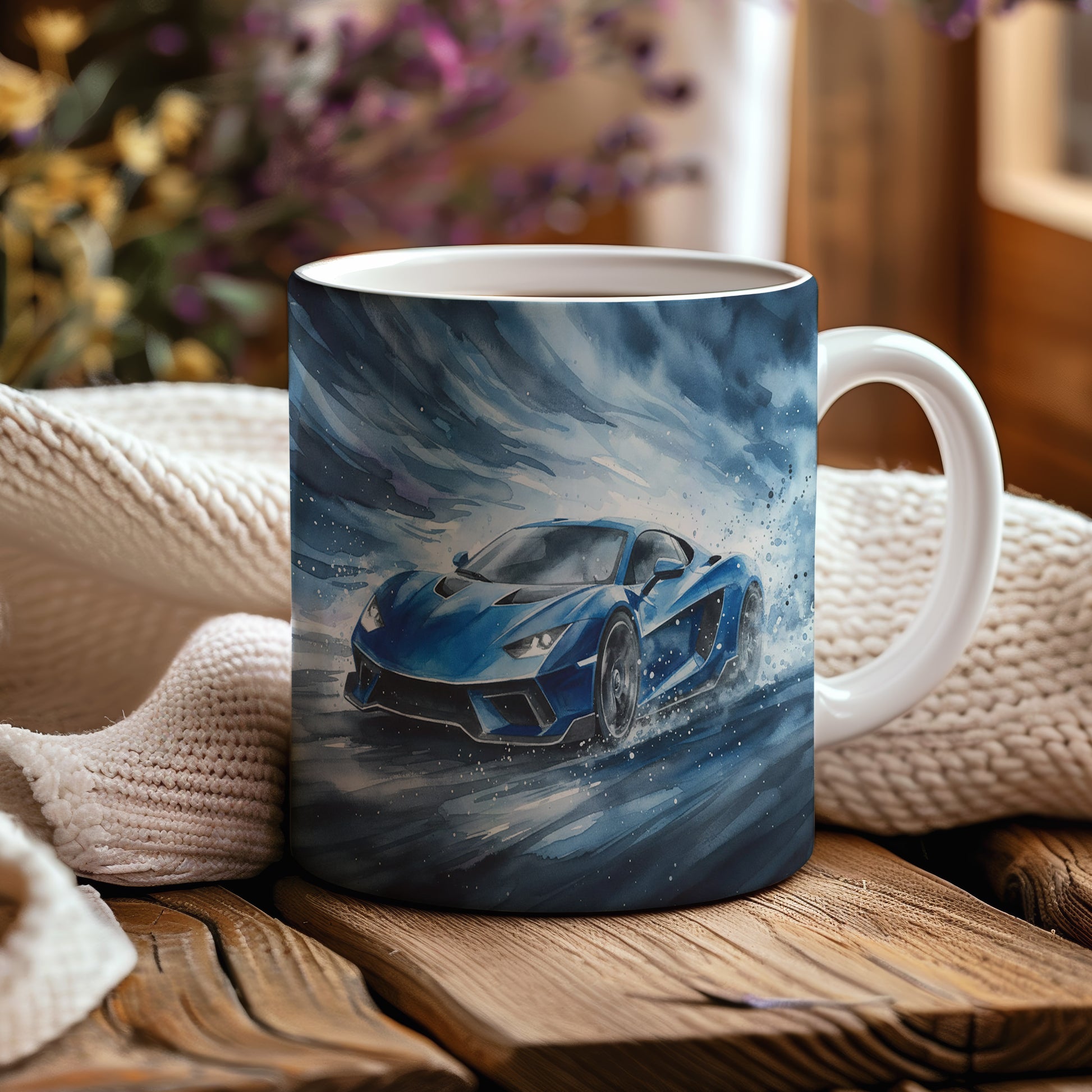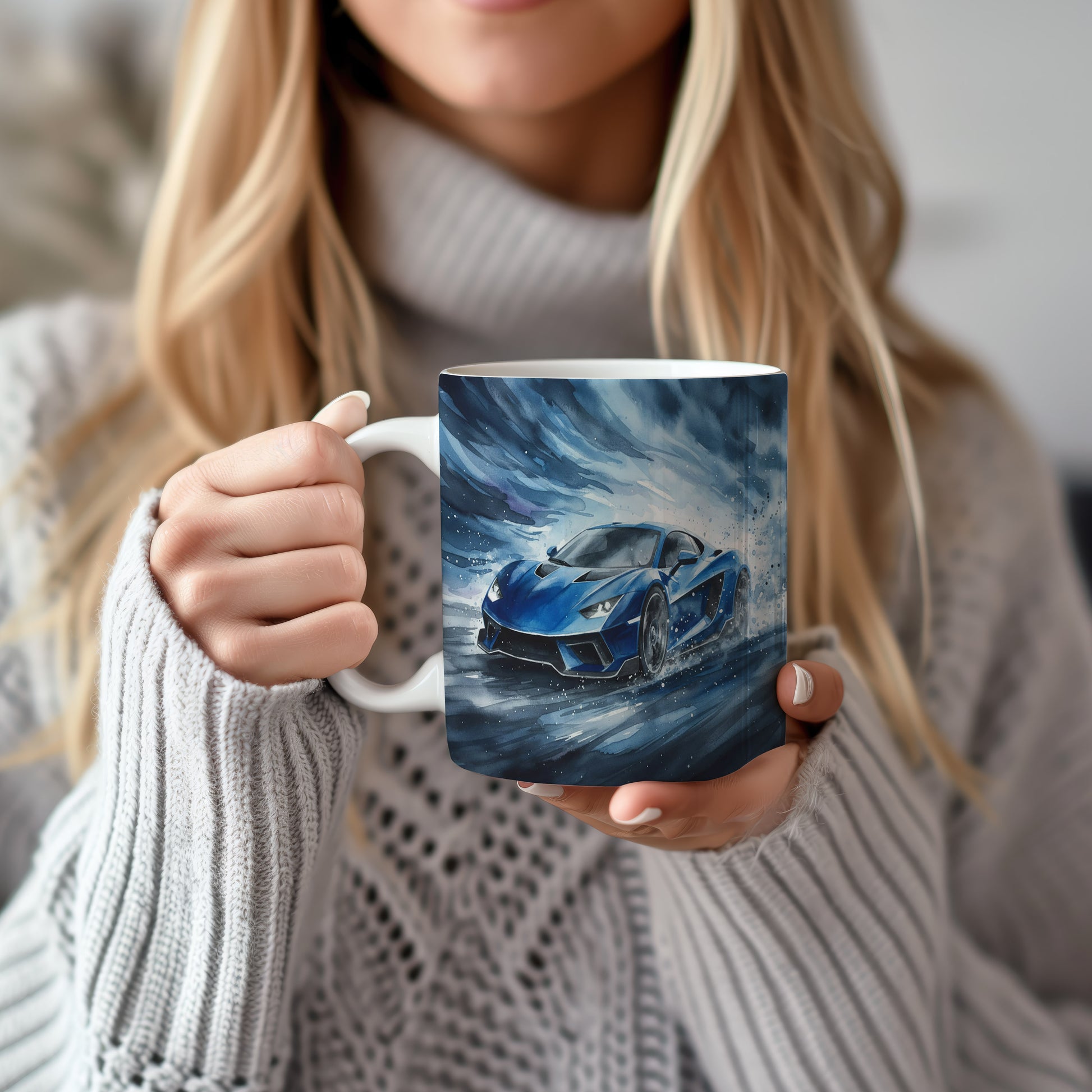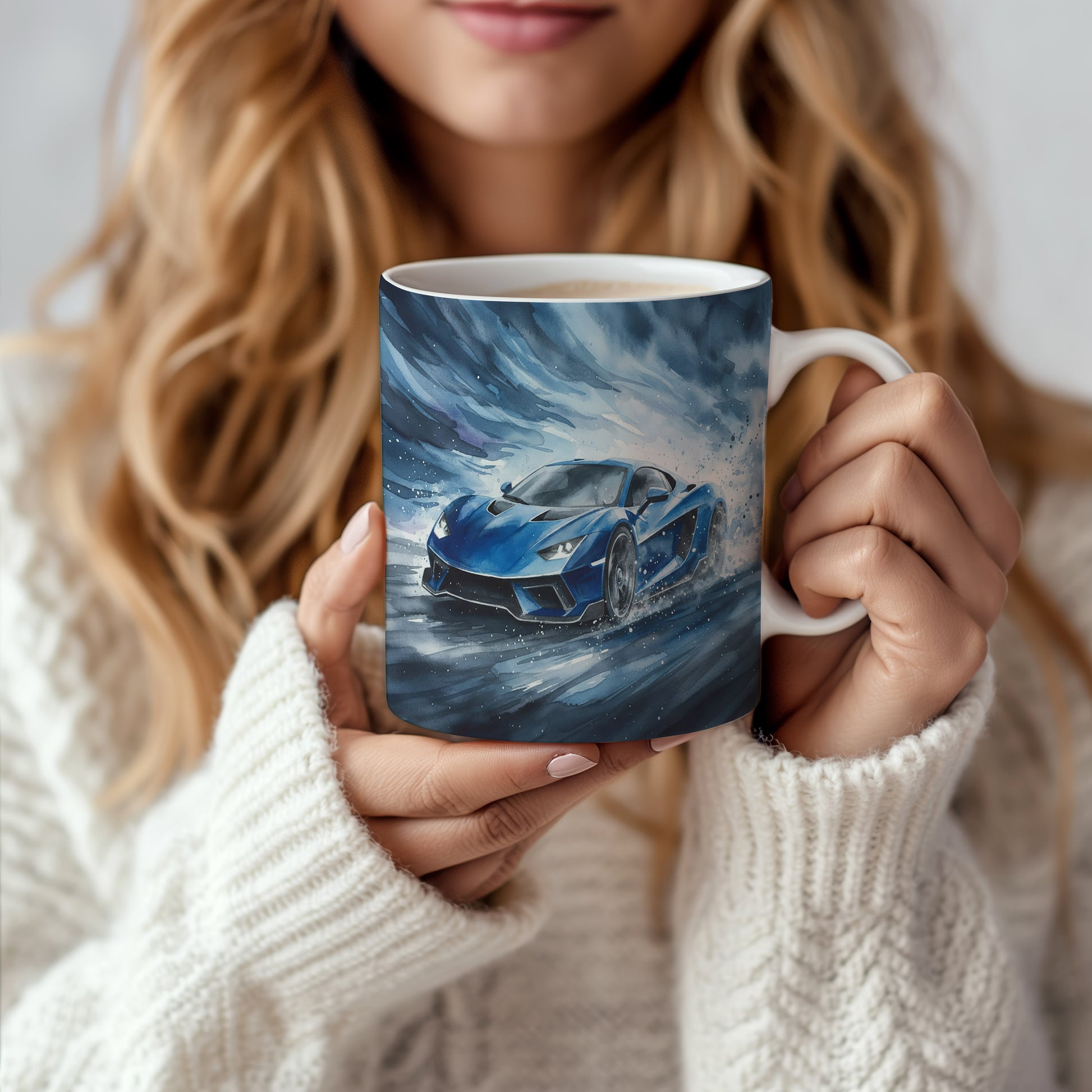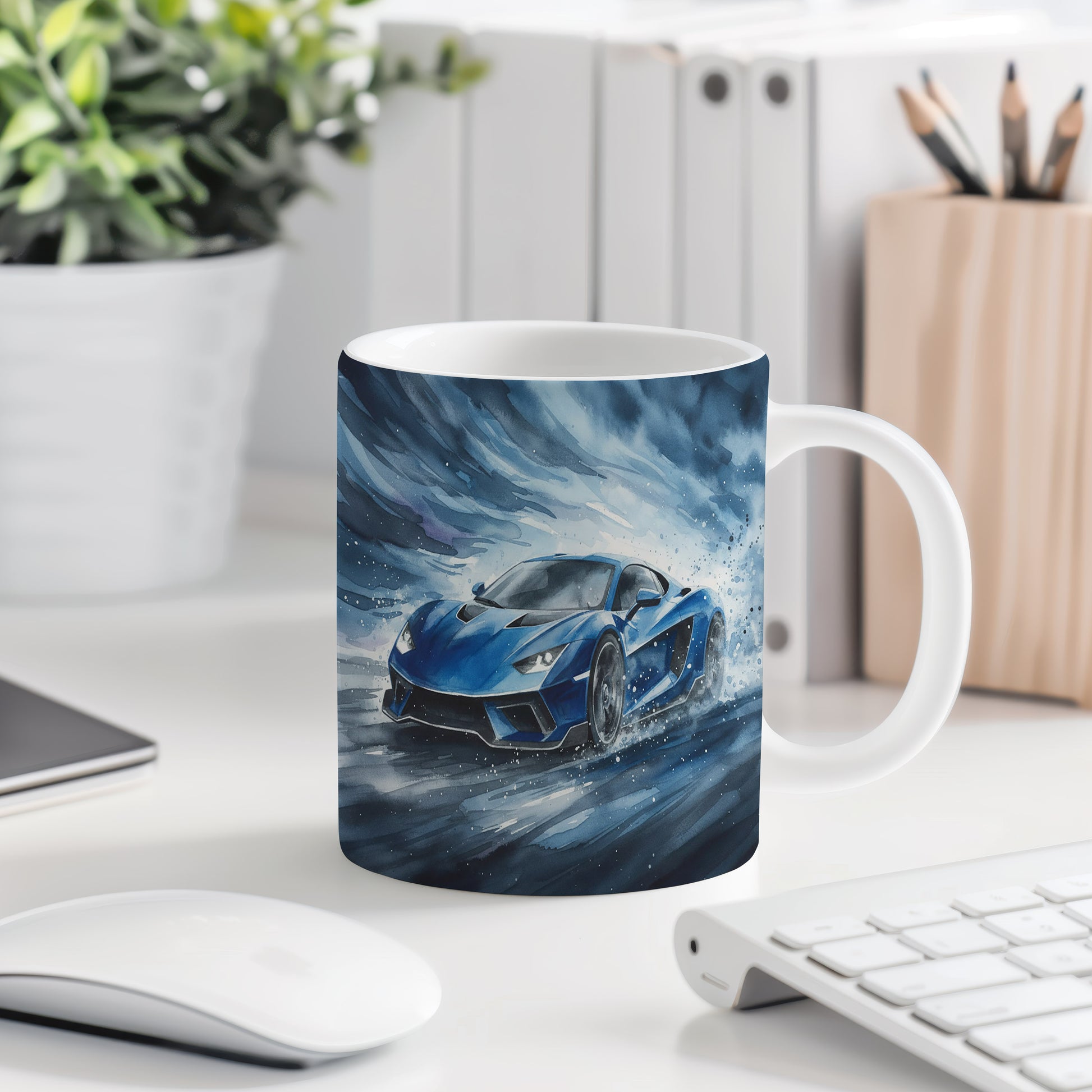 Elegantní modrý sporťák projíždí dramatickou bouří na tomto akvarelovém hrnku. Ideální pro milovníky rychlosti a stylu. Hrnek 330 ml – vhodný do myčky i mikrovlnky.