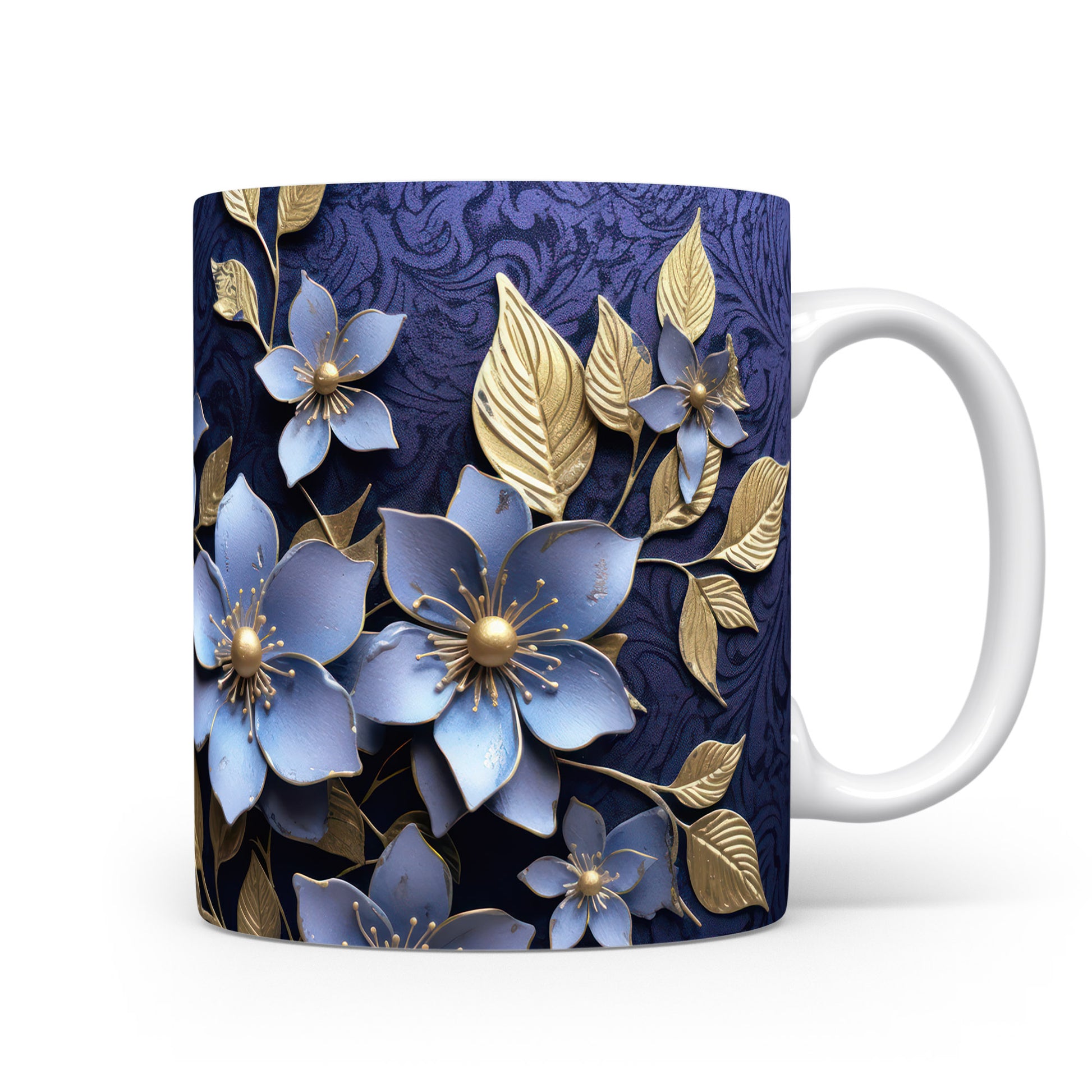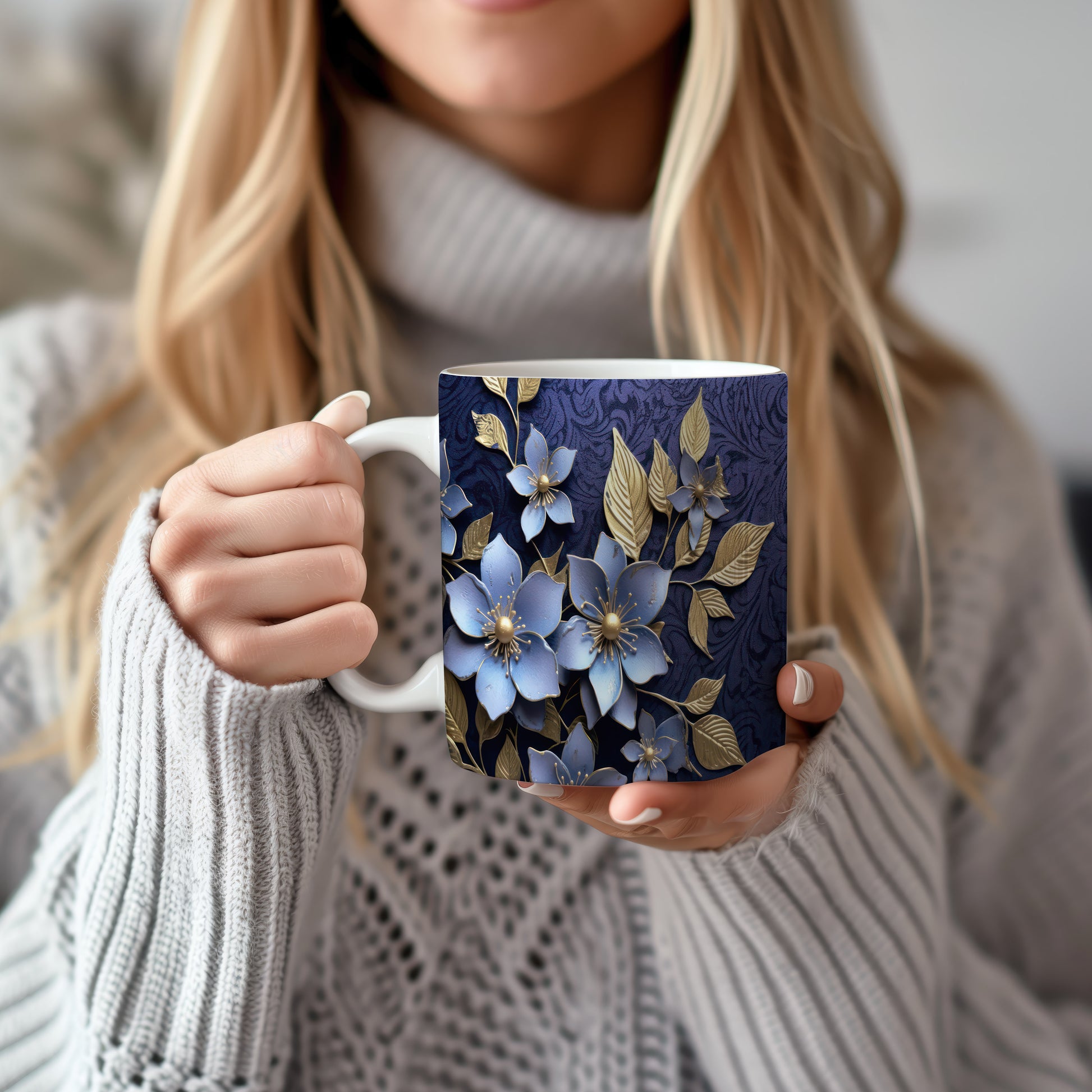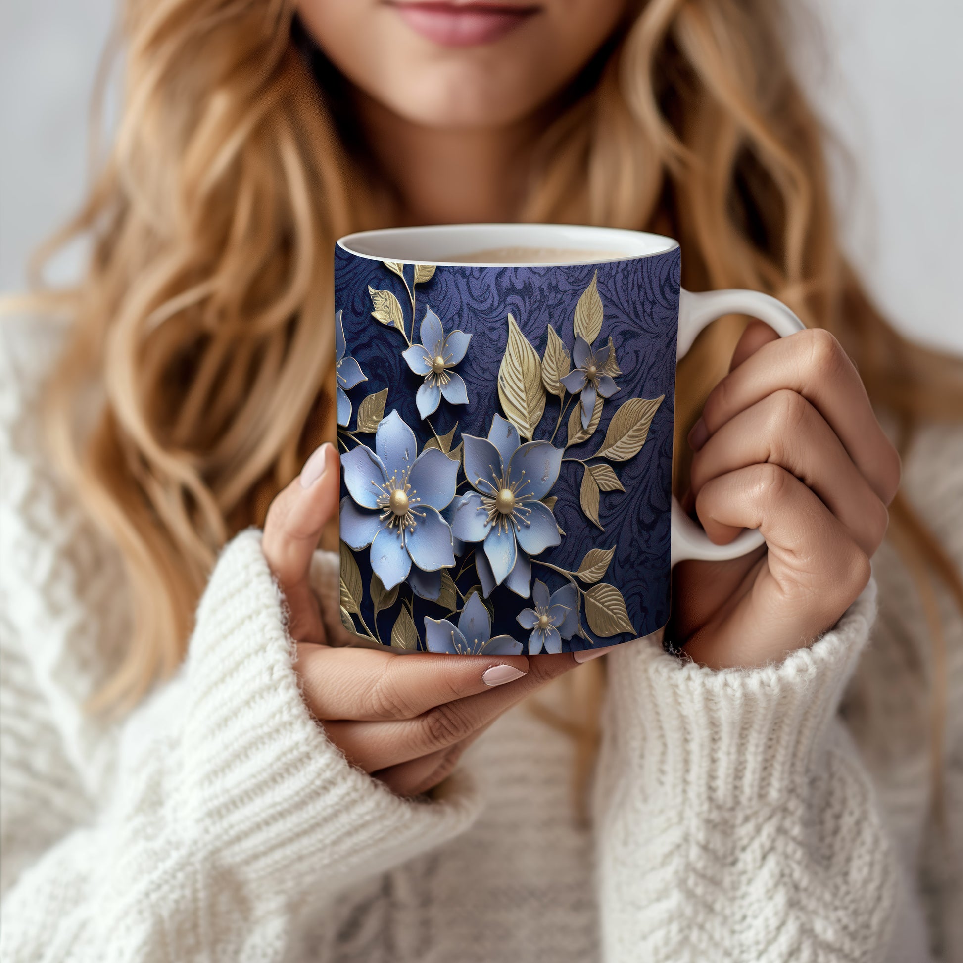 Tento keramický hrnek s motivem modrých květin a zlatých listů je skvělým doplňkem pro každého milovníka přírody. Je ideální jako dárek pro přátele nebo rodinu, kteří ocení elegantní design. Materiál: keramika. Objem: 330 ml. Vhodné do myčky i mikrovlnky. Používání tohoto hrnku přináší radost z každého doušku.